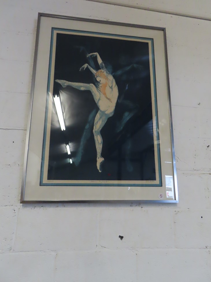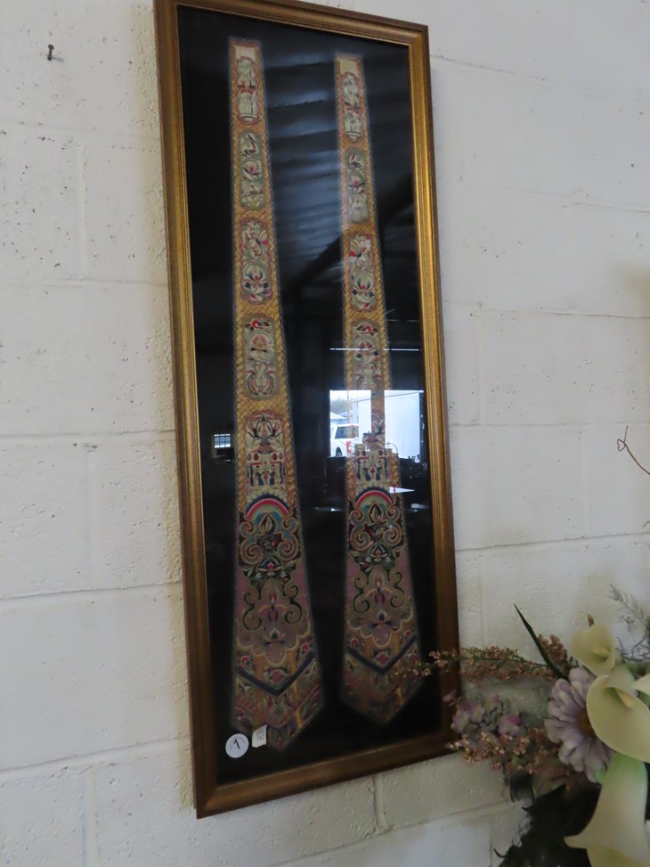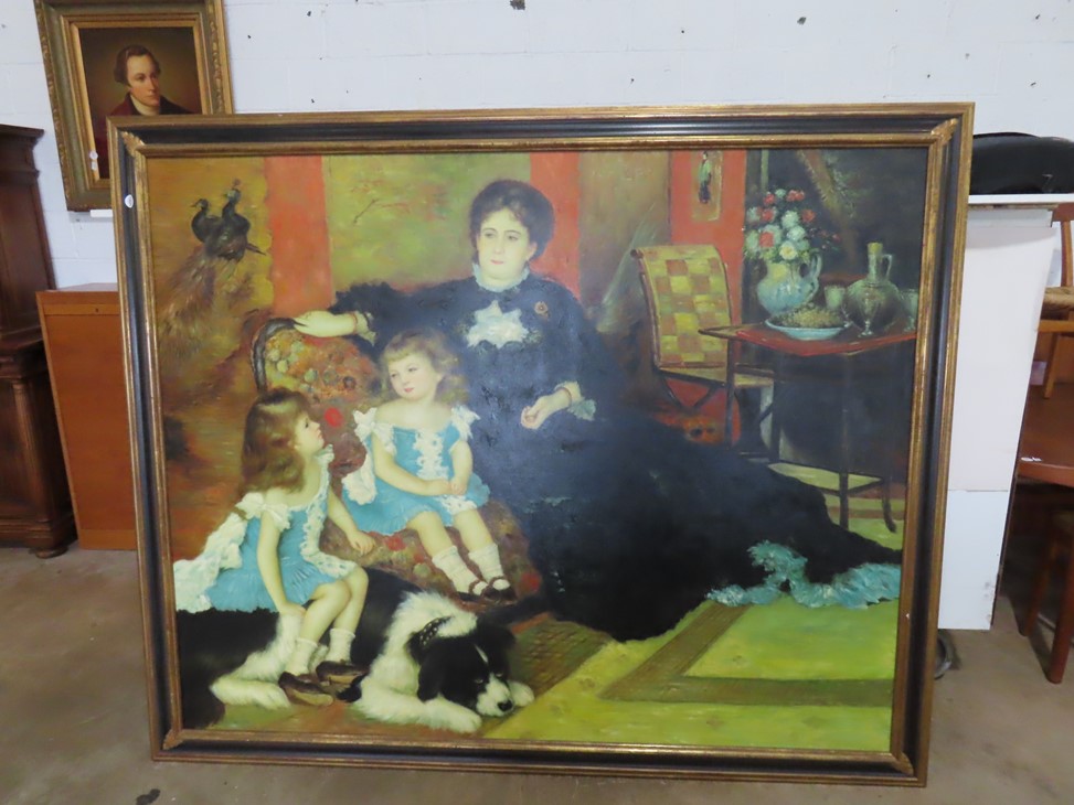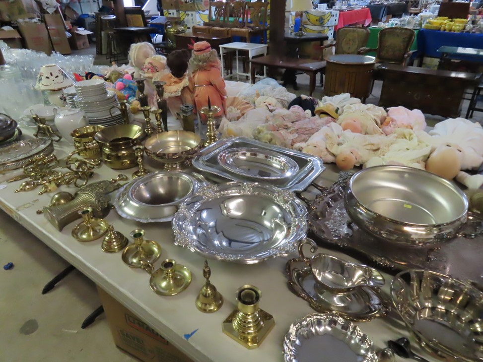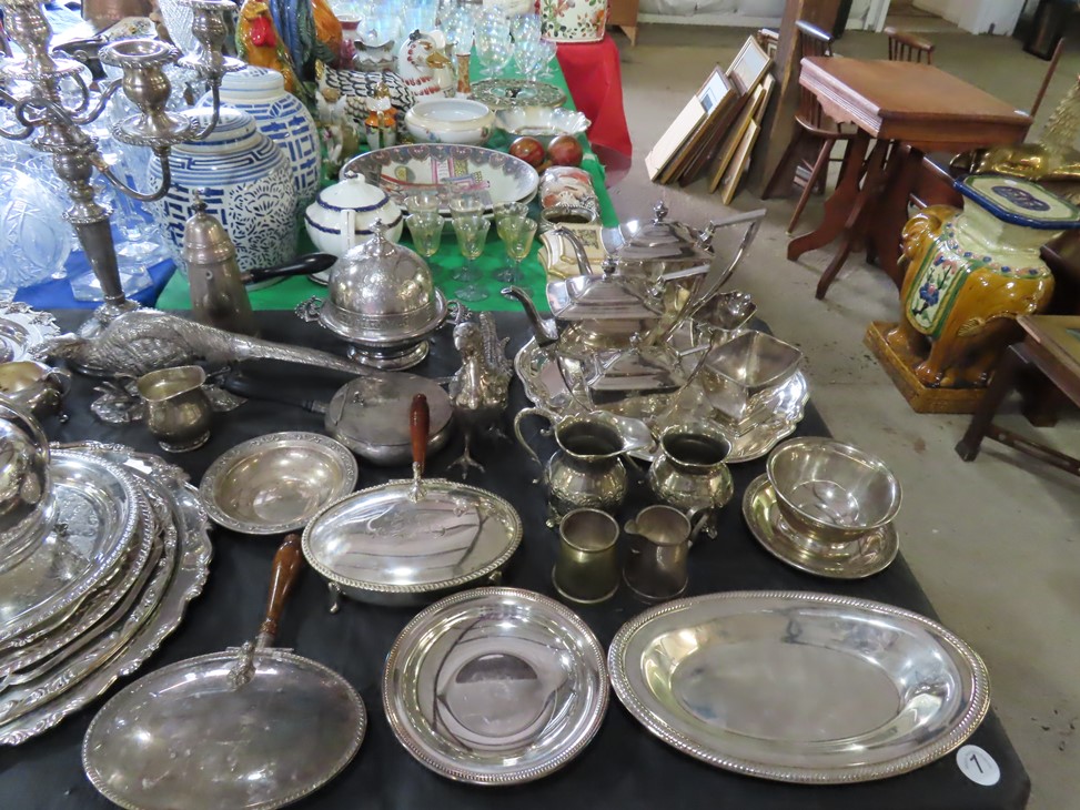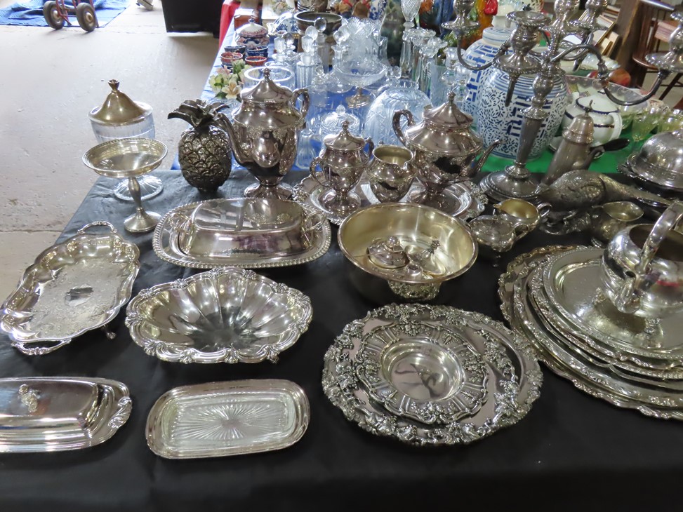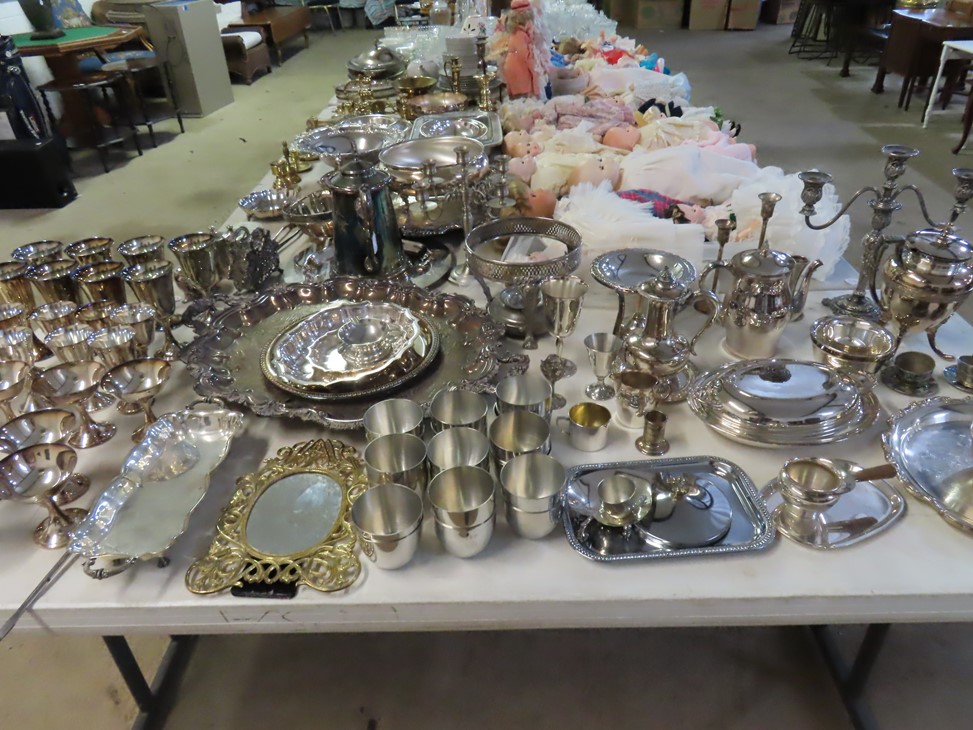SILVER & ART: Sterling & Silver-plate: Reed & Barton sterling; Serving pieces; Butter dishes; Bowls; Candelabra; Creamer & sugar sets; Trays; Coffee & tea services on trays; Pheasant; Compote; Lidded jar; More trays; Flatware; Pierced tea spoon; Tumblers; Lots more silver!; Stained glass military eagle; Framed embroidered Oriental textiles; Ancestor original art portraits; Dancer print; Silhouettes; Watercolor sailboats in the moonlight; Wife and children family portrait; Colorful head of Buddha; Oriental figures; Large gold antelope floor statues; Pieta’ and much more!