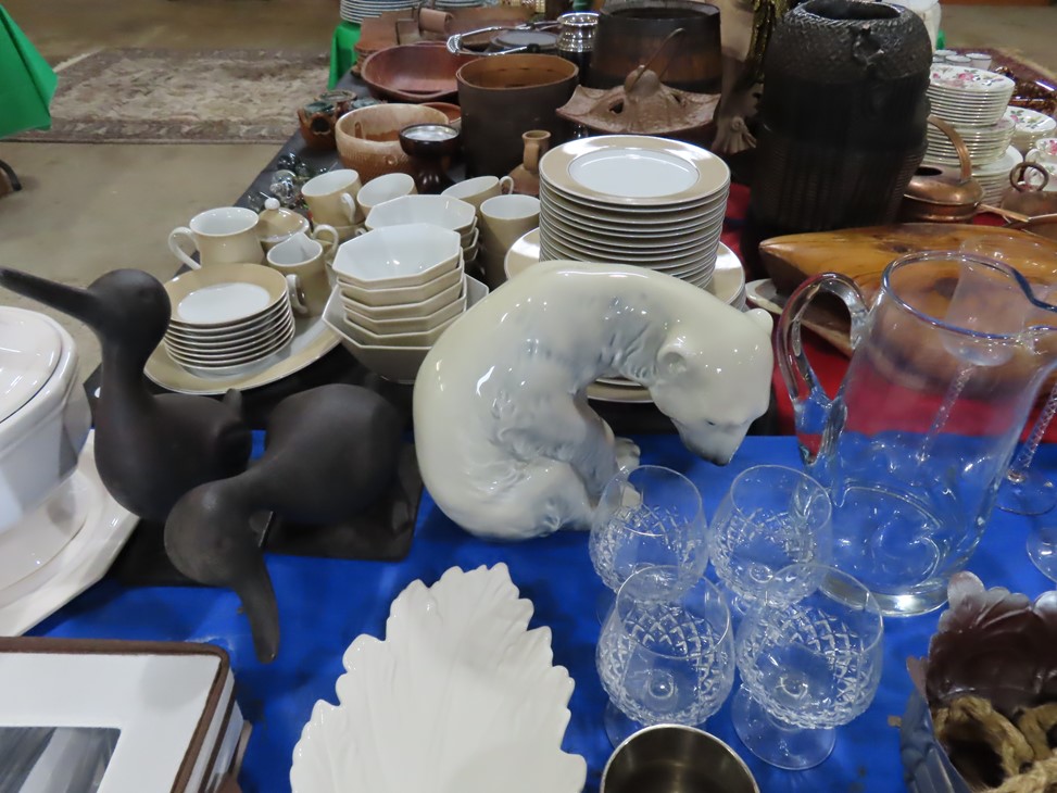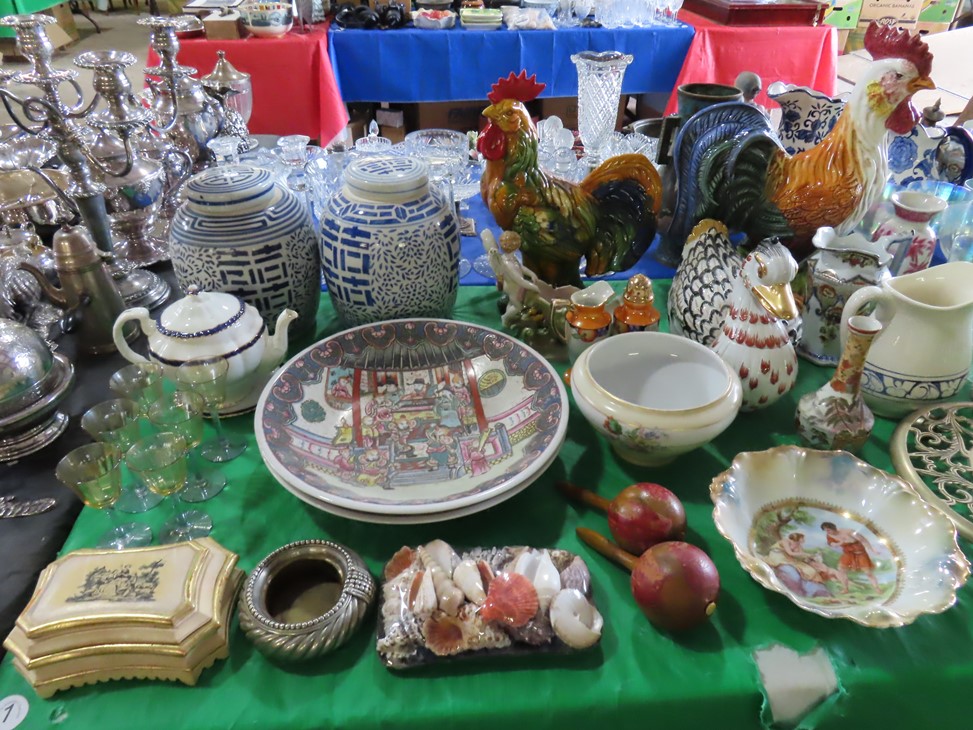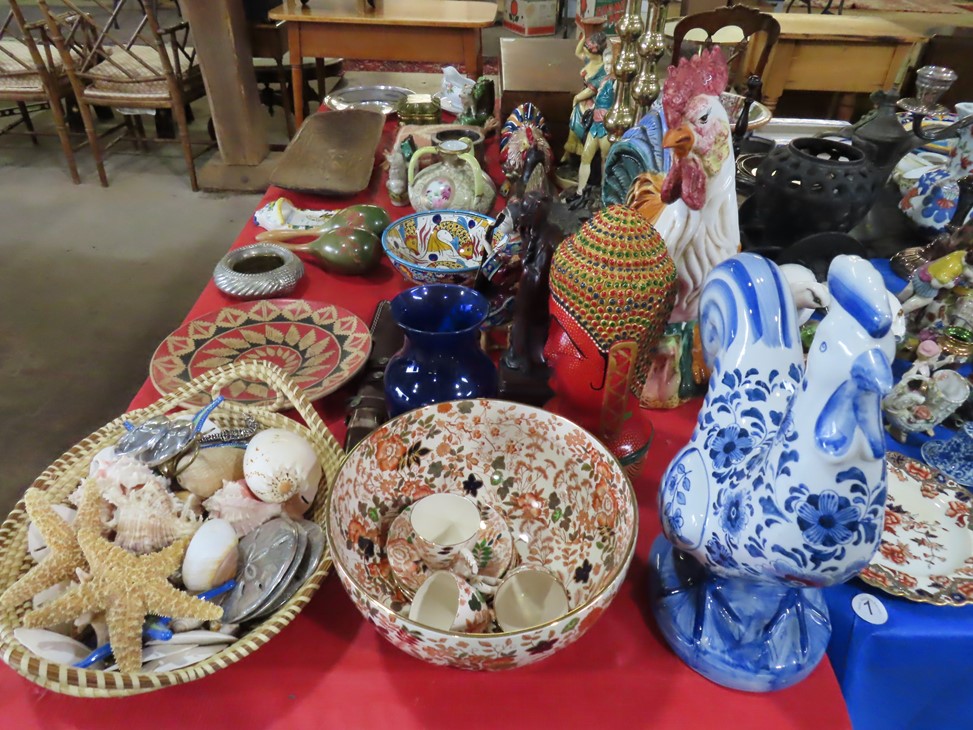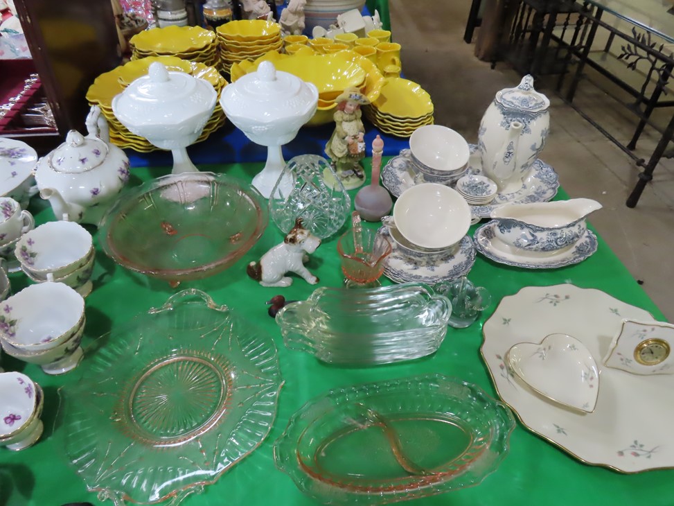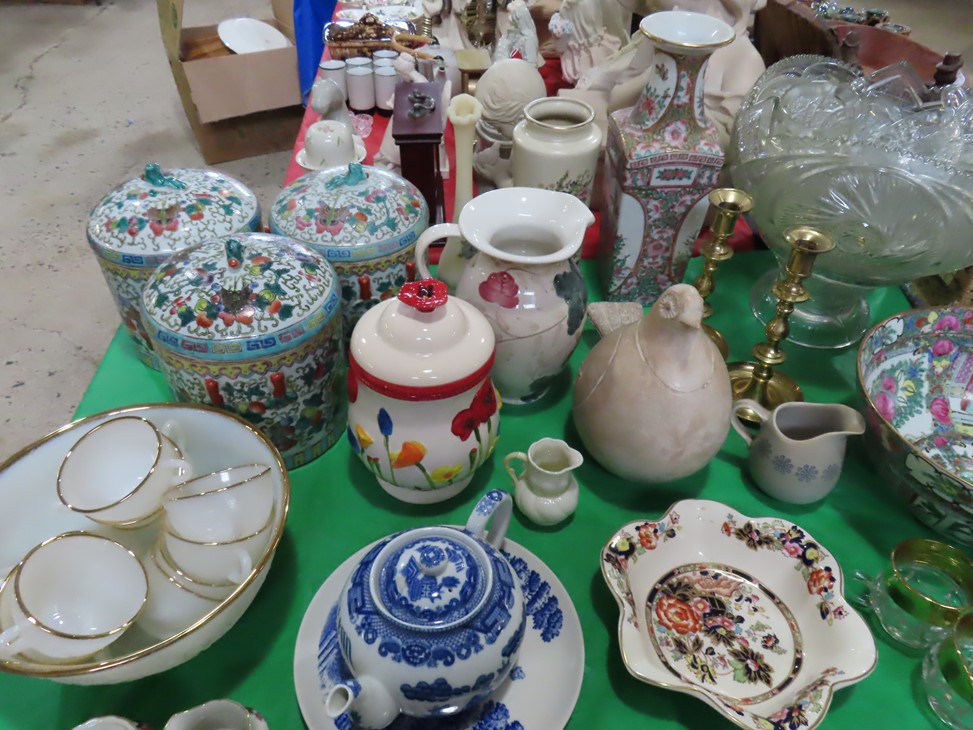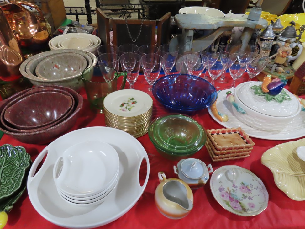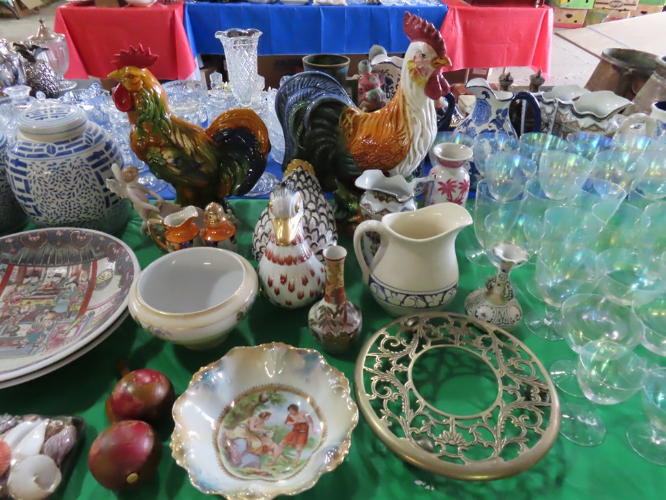 CHINA & GLASS: Large Oriental rose bowl; 3 tier wall planter; Occupied Japan “Spring Violets” dinnerware set by Rossetti; Elephant garden seat; Bone dishes; Collectible teacups & saucers; Doll head; Blue & white lidded ginger jars; Roosters; Hand-painted bowl; Teapot; Pitchers; Lusterware; Figurines; Vases; Bowls; Quimper; Gravy boat with underplate; Small tea set; Colorful plates; Washbasin; Multi-hole flower vase; More large chicken statues; Demi-tasse set; Beautiful blue & white china set; Lemon plates; Large serving tray; Fox head; Fish saucers; Biscotti jar; Gold rimmed plates; Clocks; Dedham rabbit pitcher; Polychrome ginger jars; Blue Willow; Lots & lots of ceramic figurines; Flow blue shaker; Limoges plates; Blue Onion dinnerware; Bisque figures; Mixing bowls; Lladro’ Christmas bell; Colored cut to clear decanter & goblet set; Pink Depression glass; Milk glass lidded compotes; Red & clear striped vase pair; Small hen on nest; Cobalt vase; Paperweights; Small glass animals; Crystal bowls; Rose Medallion bowl; Gold rim milk glass punch bowl & cups; Salts; Crystal wine glasses; Pitcher & glasses set; Green Depression glass; Yellow Jamestown glasses; Crystal tumblers & goblets and More!