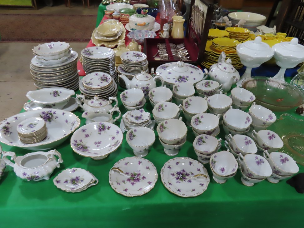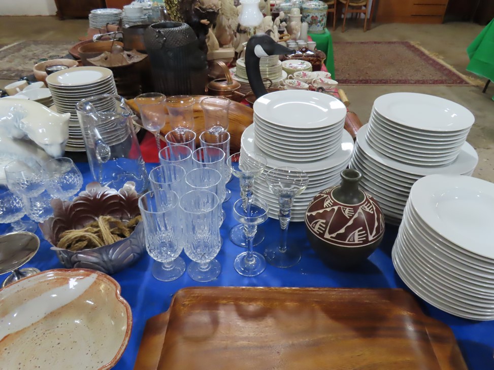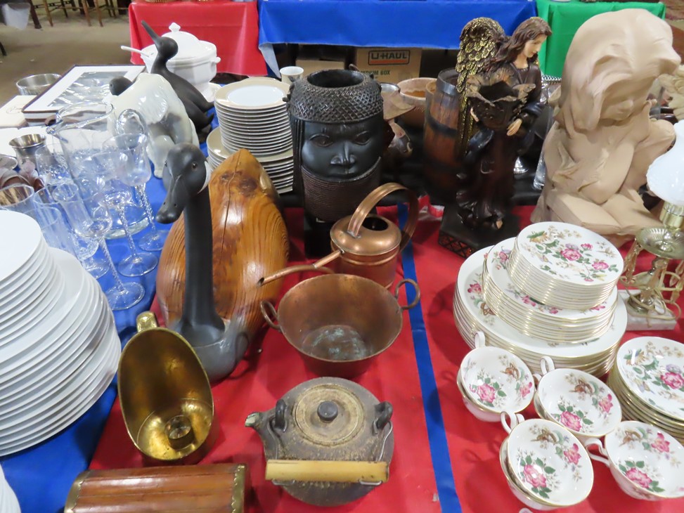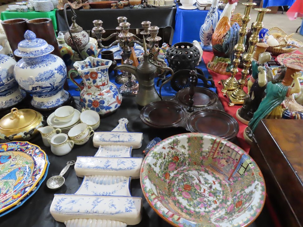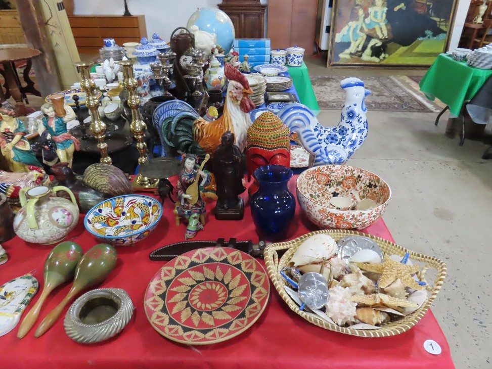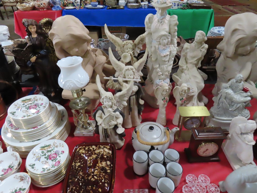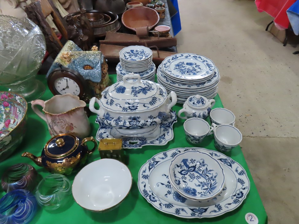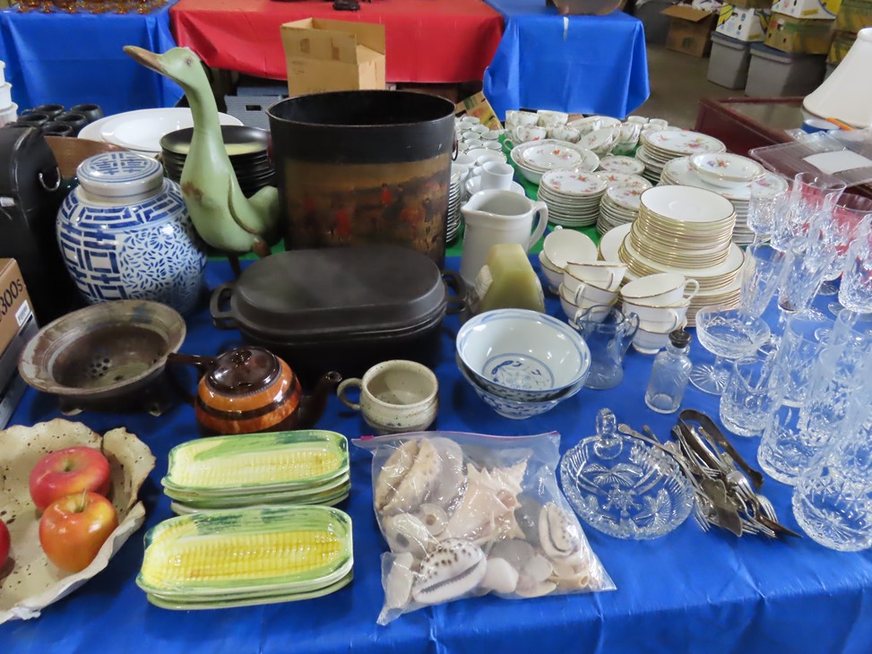 CHINA & GLASS: Large Oriental rose bowl; 3 tier wall planter; Occupied Japan “Spring Violets” dinnerware set by Rossetti; Elephant garden seat; Bone dishes; Collectible teacups & saucers; Doll head; Blue & white lidded ginger jars; Roosters; Hand-painted bowl; Teapot; Pitchers; Lusterware; Figurines; Vases; Bowls; Quimper; Gravy boat with underplate; Small tea set; Colorful plates; Washbasin; Multi-hole flower vase; More large chicken statues; Demi-tasse set; Beautiful blue & white china set; Lemon plates; Large serving tray; Fox head; Fish saucers; Biscotti jar; Gold rimmed plates; Clocks; Dedham rabbit pitcher; Polychrome ginger jars; Blue Willow; Lots & lots of ceramic figurines; Flow blue shaker; Limoges plates; Blue Onion dinnerware; Bisque figures; Mixing bowls; Lladro’ Christmas bell; Colored cut to clear decanter & goblet set; Pink Depression glass; Milk glass lidded compotes; Red & clear striped vase pair; Small hen on nest; Cobalt vase; Paperweights; Small glass animals; Crystal bowls; Rose Medallion bowl; Gold rim milk glass punch bowl & cups; Salts; Crystal wine glasses; Pitcher & glasses set; Green Depression glass; Yellow Jamestown glasses; Crystal tumblers & goblets and More!