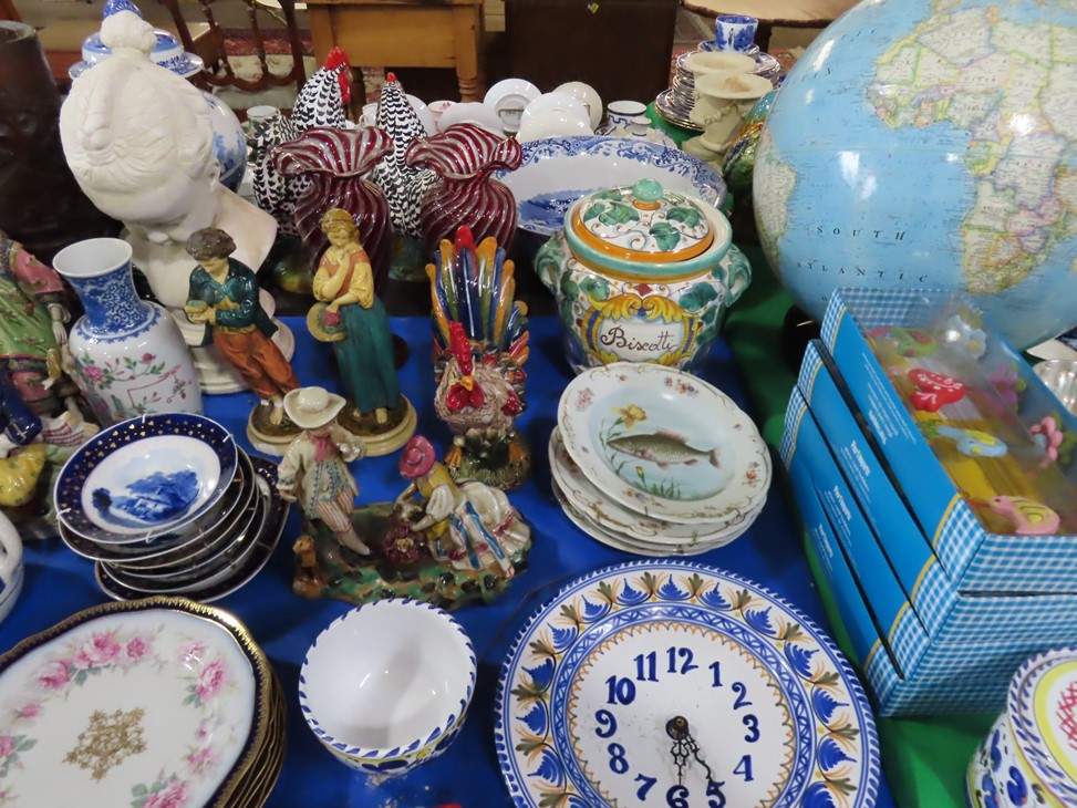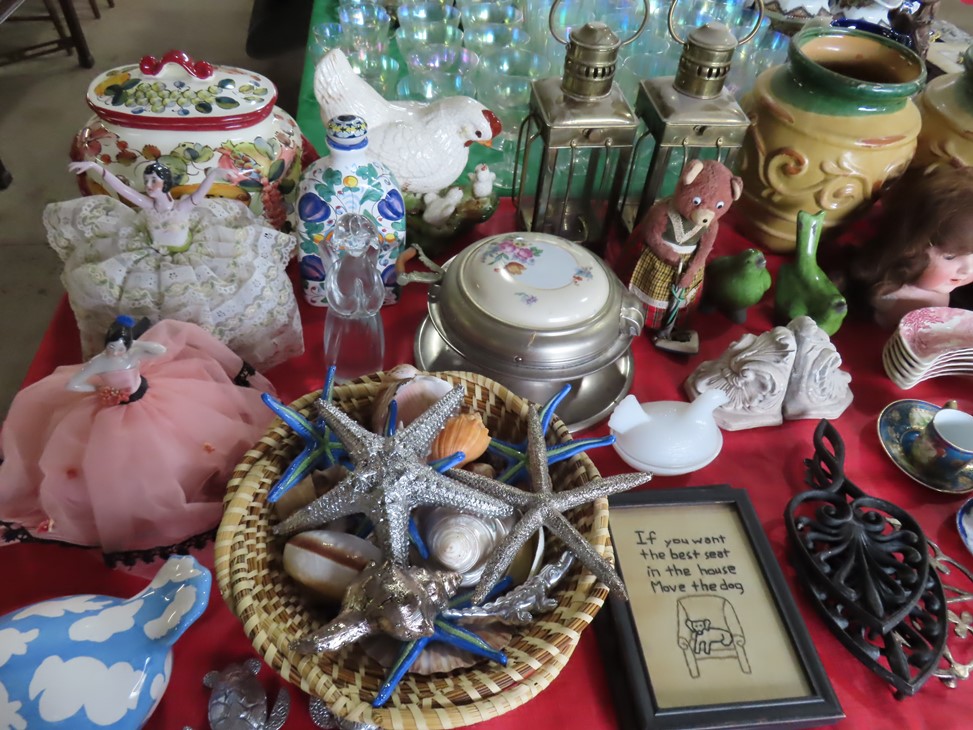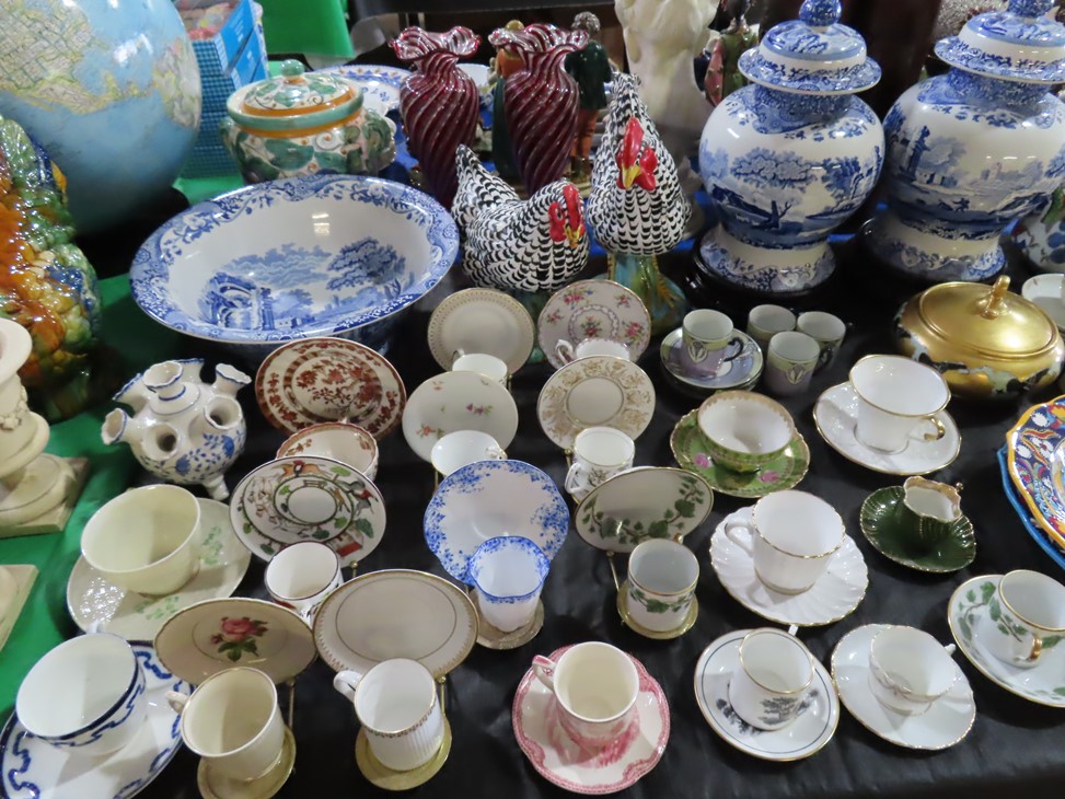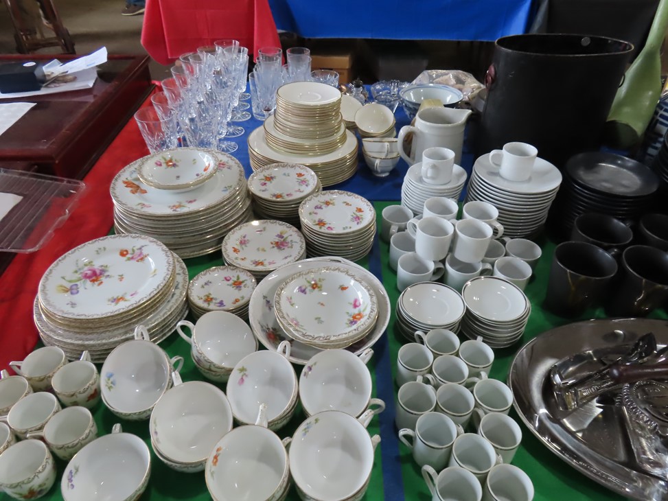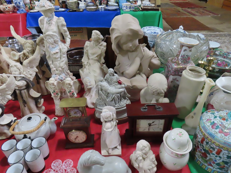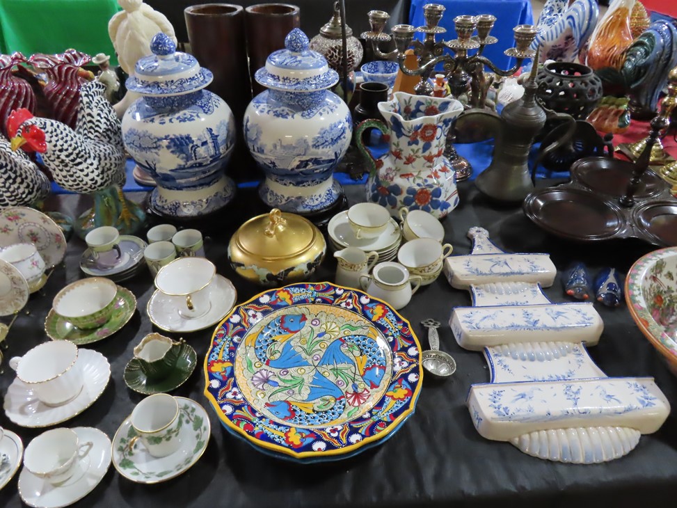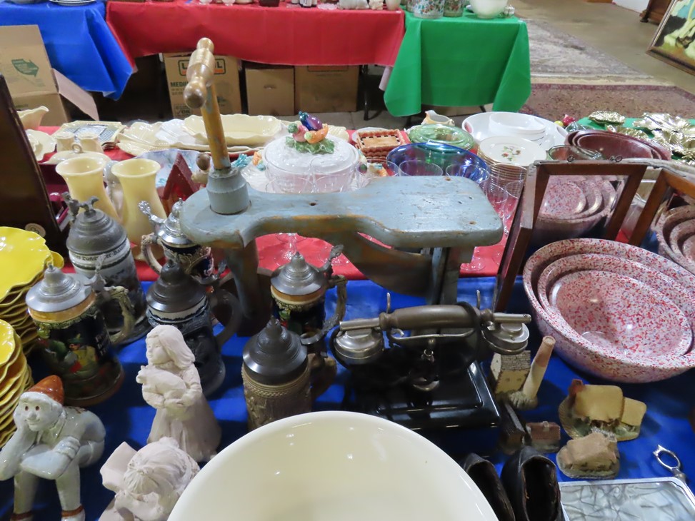 CHINA & GLASS: Large Oriental rose bowl; 3 tier wall planter; Occupied Japan “Spring Violets” dinnerware set by Rossetti; Elephant garden seat; Bone dishes; Collectible teacups & saucers; Doll head; Blue & white lidded ginger jars; Roosters; Hand-painted bowl; Teapot; Pitchers; Lusterware; Figurines; Vases; Bowls; Quimper; Gravy boat with underplate; Small tea set; Colorful plates; Washbasin; Multi-hole flower vase; More large chicken statues; Demi-tasse set; Beautiful blue & white china set; Lemon plates; Large serving tray; Fox head; Fish saucers; Biscotti jar; Gold rimmed plates; Clocks; Dedham rabbit pitcher; Polychrome ginger jars; Blue Willow; Lots & lots of ceramic figurines; Flow blue shaker; Limoges plates; Blue Onion dinnerware; Bisque figures; Mixing bowls; Lladro’ Christmas bell; Colored cut to clear decanter & goblet set; Pink Depression glass; Milk glass lidded compotes; Red & clear striped vase pair; Small hen on nest; Cobalt vase; Paperweights; Small glass animals; Crystal bowls; Rose Medallion bowl; Gold rim milk glass punch bowl & cups; Salts; Crystal wine glasses; Pitcher & glasses set; Green Depression glass; Yellow Jamestown glasses; Crystal tumblers & goblets and More!