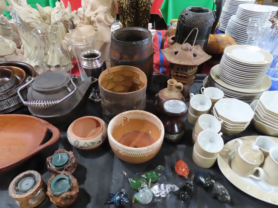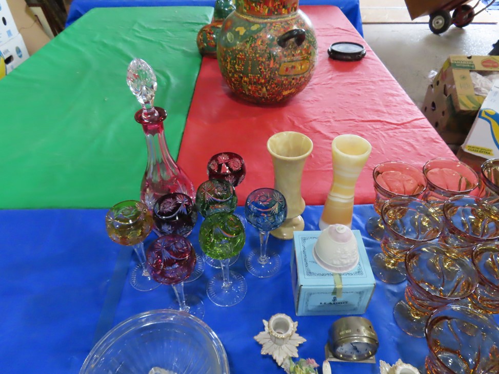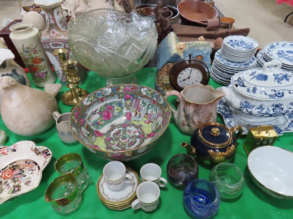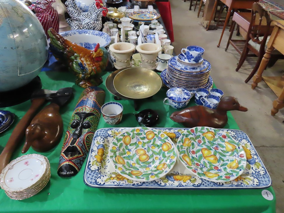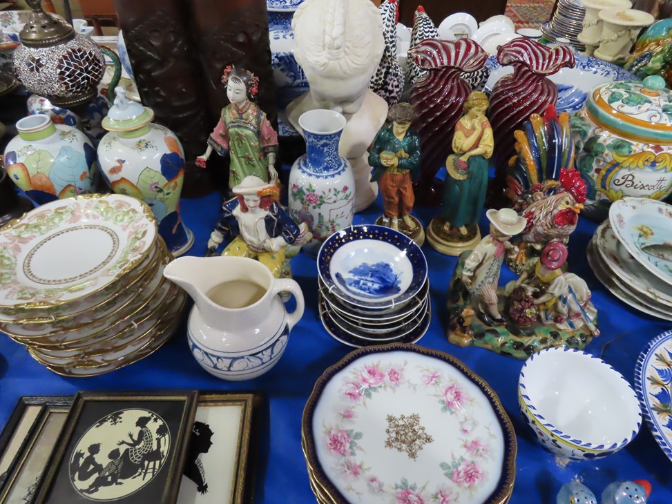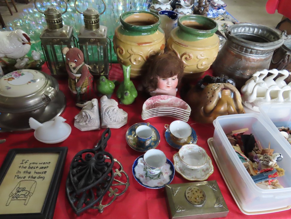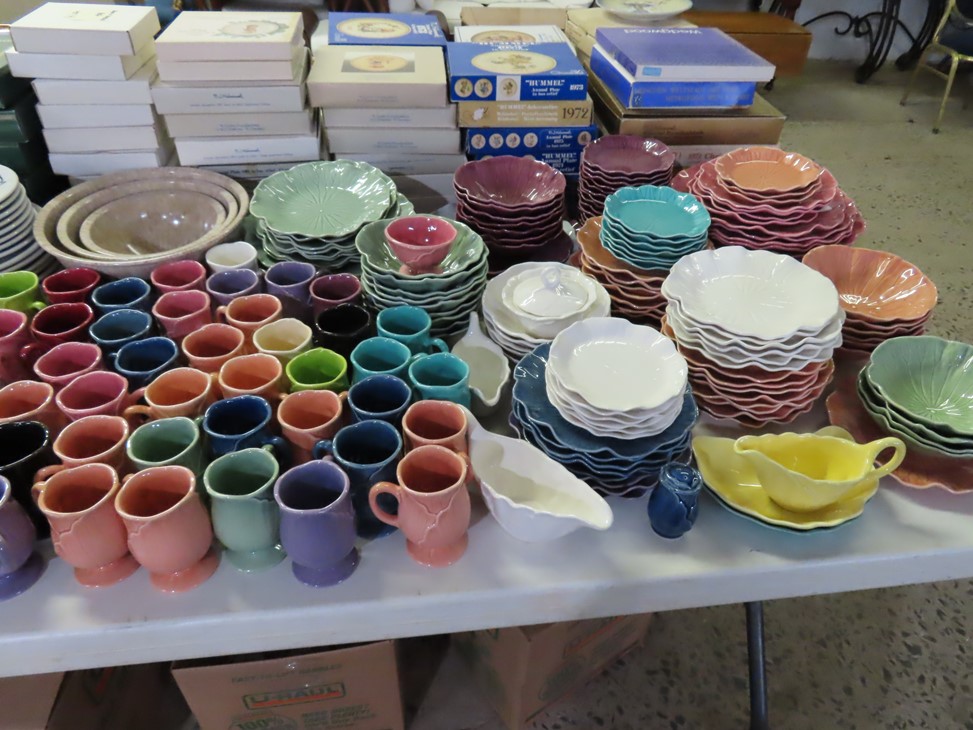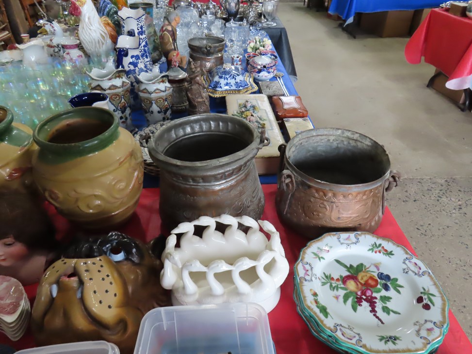 CHINA & GLASS: Large Oriental rose bowl; 3 tier wall planter; Occupied Japan “Spring Violets” dinnerware set by Rossetti; Elephant garden seat; Bone dishes; Collectible teacups & saucers; Doll head; Blue & white lidded ginger jars; Roosters; Hand-painted bowl; Teapot; Pitchers; Lusterware; Figurines; Vases; Bowls; Quimper; Gravy boat with underplate; Small tea set; Colorful plates; Washbasin; Multi-hole flower vase; More large chicken statues; Demi-tasse set; Beautiful blue & white china set; Lemon plates; Large serving tray; Fox head; Fish saucers; Biscotti jar; Gold rimmed plates; Clocks; Dedham rabbit pitcher; Polychrome ginger jars; Blue Willow; Lots & lots of ceramic figurines; Flow blue shaker; Limoges plates; Blue Onion dinnerware; Bisque figures; Mixing bowls; Lladro’ Christmas bell; Colored cut to clear decanter & goblet set; Pink Depression glass; Milk glass lidded compotes; Red & clear striped vase pair; Small hen on nest; Cobalt vase; Paperweights; Small glass animals; Crystal bowls; Rose Medallion bowl; Gold rim milk glass punch bowl & cups; Salts; Crystal wine glasses; Pitcher & glasses set; Green Depression glass; Yellow Jamestown glasses; Crystal tumblers & goblets and More!