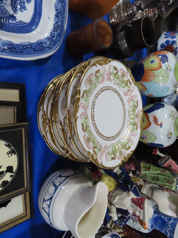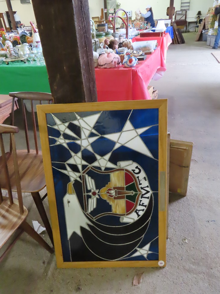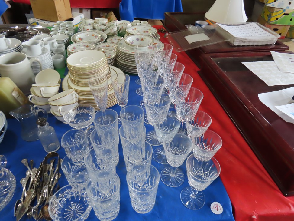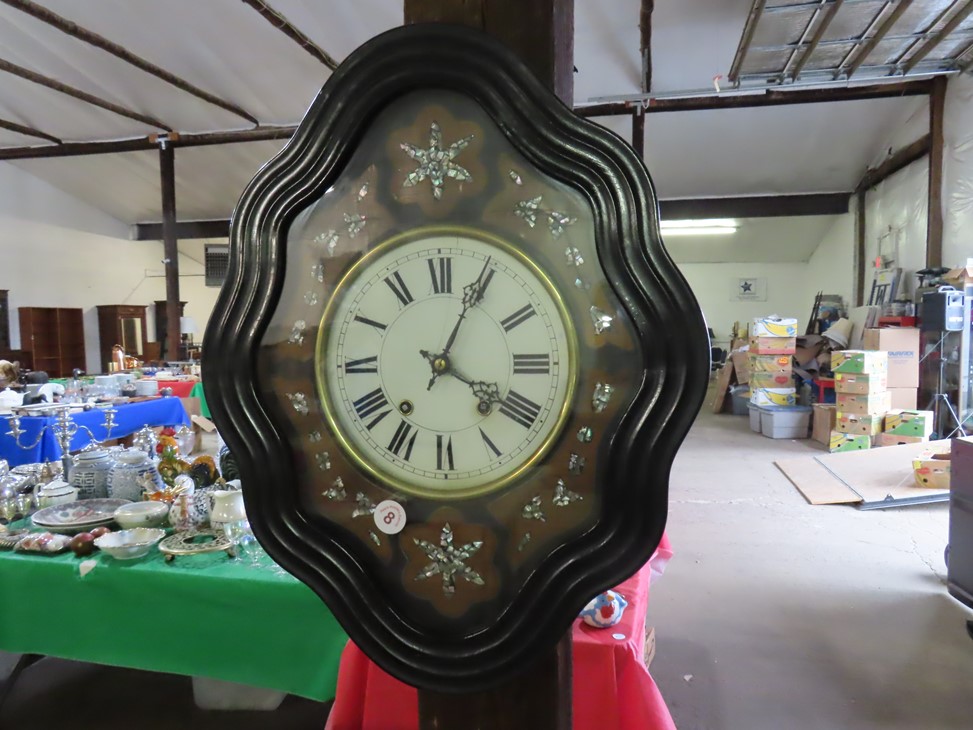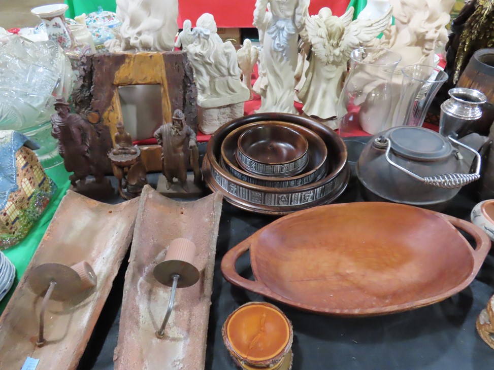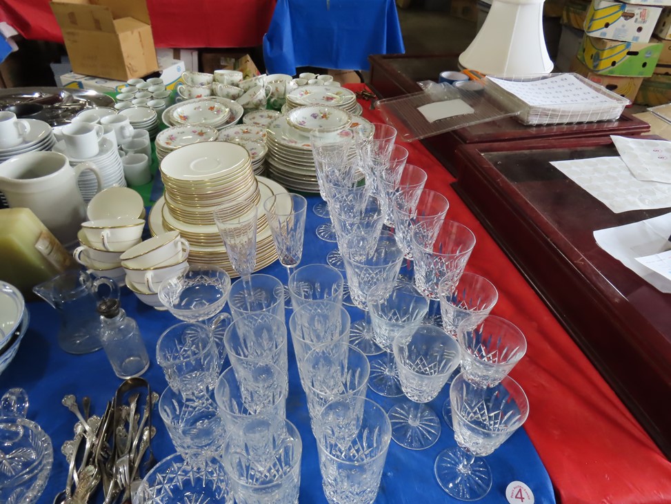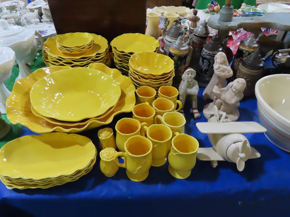 CHINA & GLASS: Large Oriental rose bowl; 3 tier wall planter; Occupied Japan “Spring Violets” dinnerware set by Rossetti; Elephant garden seat; Bone dishes; Collectible teacups & saucers; Doll head; Blue & white lidded ginger jars; Roosters; Hand-painted bowl; Teapot; Pitchers; Lusterware; Figurines; Vases; Bowls; Quimper; Gravy boat with underplate; Small tea set; Colorful plates; Washbasin; Multi-hole flower vase; More large chicken statues; Demi-tasse set; Beautiful blue & white china set; Lemon plates; Large serving tray; Fox head; Fish saucers; Biscotti jar; Gold rimmed plates; Clocks; Dedham rabbit pitcher; Polychrome ginger jars; Blue Willow; Lots & lots of ceramic figurines; Flow blue shaker; Limoges plates; Blue Onion dinnerware; Bisque figures; Mixing bowls; Lladro’ Christmas bell; Colored cut to clear decanter & goblet set; Pink Depression glass; Milk glass lidded compotes; Red & clear striped vase pair; Small hen on nest; Cobalt vase; Paperweights; Small glass animals; Crystal bowls; Rose Medallion bowl; Gold rim milk glass punch bowl & cups; Salts; Crystal wine glasses; Pitcher & glasses set; Green Depression glass; Yellow Jamestown glasses; Crystal tumblers & goblets and More!