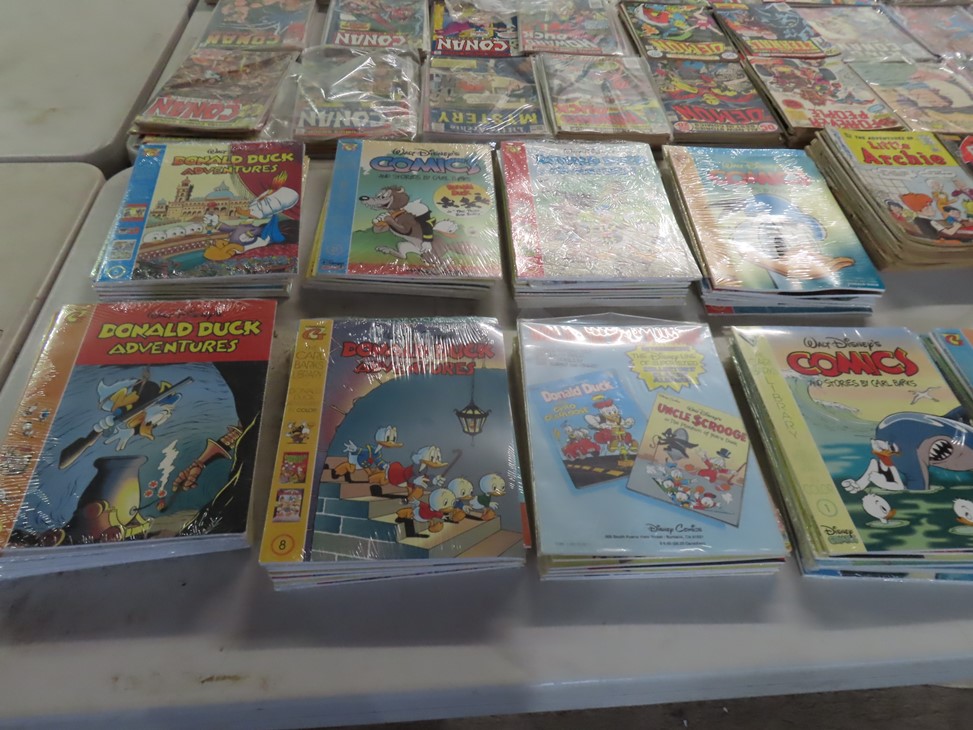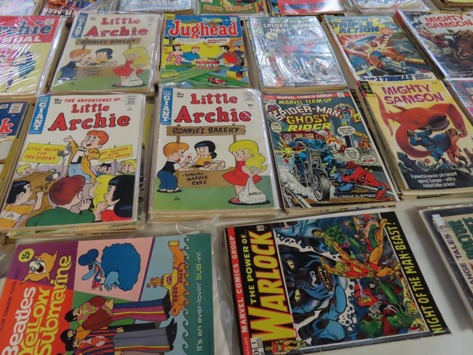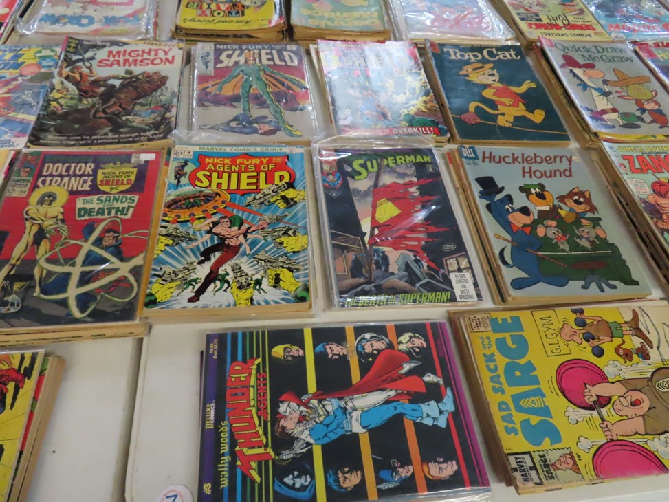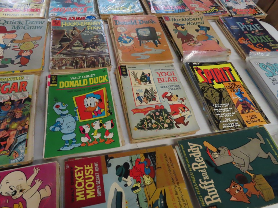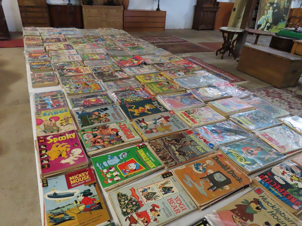 MORE: New in boxes LG dryer & Front load washer; Fender amp; Metronome; Bookends; Table trivets; Trinket boxes; Lanterns; China ballet dolls; Starfish collection; Seashells; Maracas; Sweetgrass basket; Cast iron kettle with fish fryer top; Large copper kettle; More copper & brass kettles; Copper watering can; Dough tray; Wooden butter churn; Elephant & hippo plaques; Knife in sheath; Brass candlesticks; Ewer; Masks; Wooden duck figures; World globe; Cast iron tea kettle; Sconces; Steins; Mixing bowls; Old child’s scooter; Old telephone; Tri-fold vanity mirror; Food grinder; Masher; Pounder; Box of old cookie cutters; More old Kitchenware; Thread dispenser; Nikon camera & lenses; Headphones; Nikon D300s; Brass leaf dishes; Old Wooden wall pone; Brass keys; Brass bucket; Copper bucket; Copper pitcher; Stoneware vases; Homak chest on chest rolling toolboxes; Lathe; Patio sets; Snow shovel; Lounge chairs; Outdoor tables; Hummel plates in boxes; Stacks & stacks of old comic books in protective sleeves! First edition comic books! Plan to spend hours searching the dozens of stacks for elusive treasures! Archie, Superman; Superboy; DC Comics; Marvel; Disney; Green Lantern; Dennis the Menace; Tom & Jerry; Top Cat; Shield; Thunder Agents; Mighty Samson; Spiderman; Giggle Comics; Betty Page comics; Mickey & Donald; Uncle Scrooge; Amora; Beatles Yellow Submarine; Warlock; Little Archie; Doctor Strange; Huckleberry Hound; Agents of Shield; Sad Sack Sarge; Quick Draw McGraw; Yogi Bear; Pixie & Dixie; Caspar; Conan; Howard the Duck; Detective Comics; Batman and hundred’s more!
