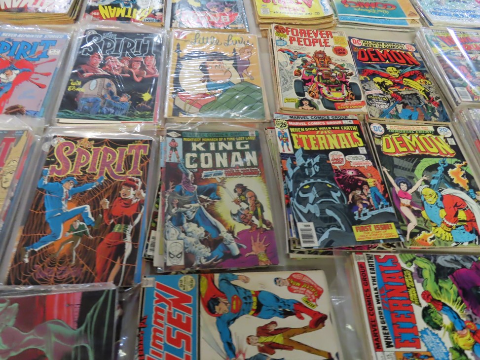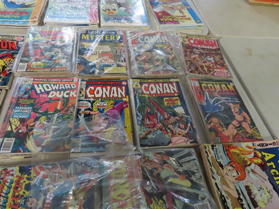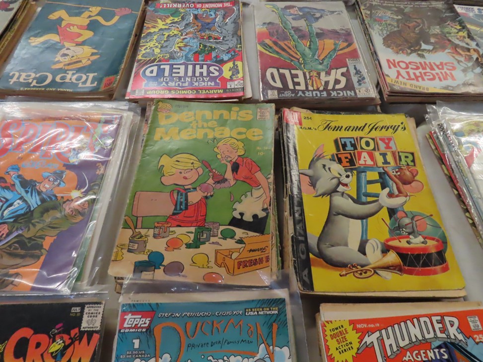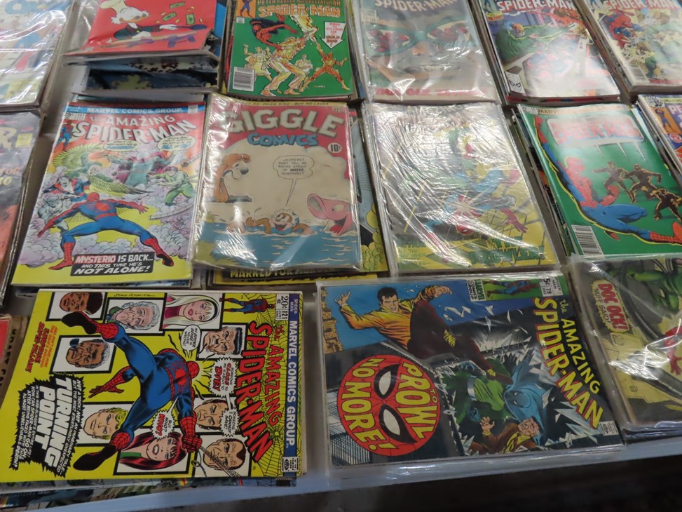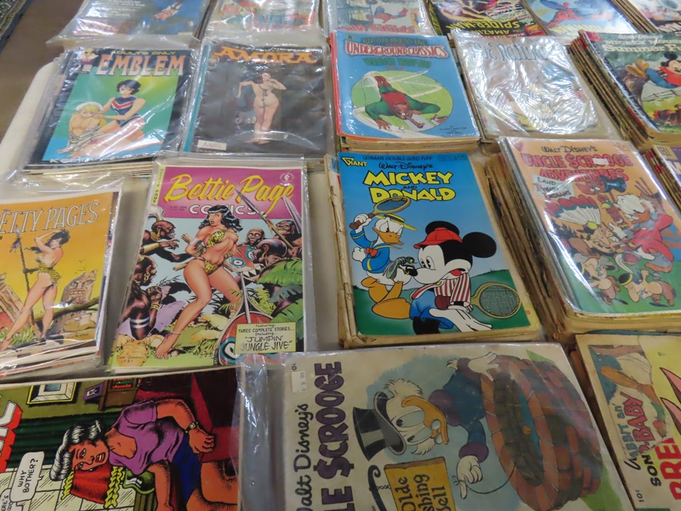 MORE: New in boxes LG dryer & Front load washer; Fender amp; Metronome; Bookends; Table trivets; Trinket boxes; Lanterns; China ballet dolls; Starfish collection; Seashells; Maracas; Sweetgrass basket; Cast iron kettle with fish fryer top; Large copper kettle; More copper & brass kettles; Copper watering can; Dough tray; Wooden butter churn; Elephant & hippo plaques; Knife in sheath; Brass candlesticks; Ewer; Masks; Wooden duck figures; World globe; Cast iron tea kettle; Sconces; Steins; Mixing bowls; Old child’s scooter; Old telephone; Tri-fold vanity mirror; Food grinder; Masher; Pounder; Box of old cookie cutters; More old Kitchenware; Thread dispenser; Nikon camera & lenses; Headphones; Nikon D300s; Brass leaf dishes; Old Wooden wall pone; Brass keys; Brass bucket; Copper bucket; Copper pitcher; Stoneware vases; Homak chest on chest rolling toolboxes; Lathe; Patio sets; Snow shovel; Lounge chairs; Outdoor tables; Hummel plates in boxes; Stacks & stacks of old comic books in protective sleeves! First edition comic books! Plan to spend hours searching the dozens of stacks for elusive treasures! Archie, Superman; Superboy; DC Comics; Marvel; Disney; Green Lantern; Dennis the Menace; Tom & Jerry; Top Cat; Shield; Thunder Agents; Mighty Samson; Spiderman; Giggle Comics; Betty Page comics; Mickey & Donald; Uncle Scrooge; Amora; Beatles Yellow Submarine; Warlock; Little Archie; Doctor Strange; Huckleberry Hound; Agents of Shield; Sad Sack Sarge; Quick Draw McGraw; Yogi Bear; Pixie & Dixie; Caspar; Conan; Howard the Duck; Detective Comics; Batman and hundred’s more!