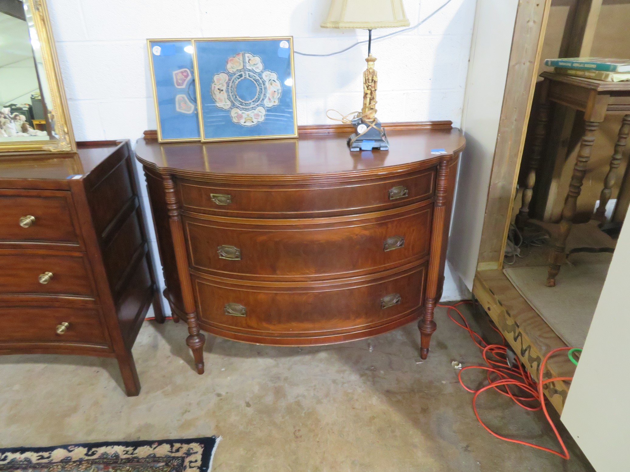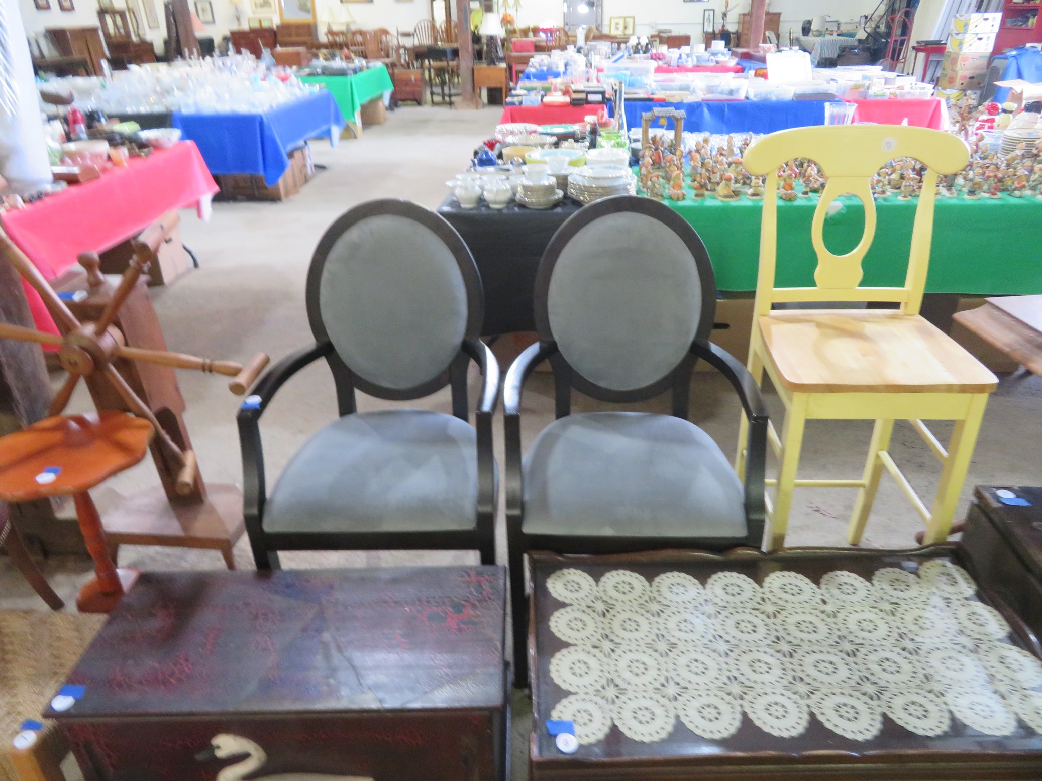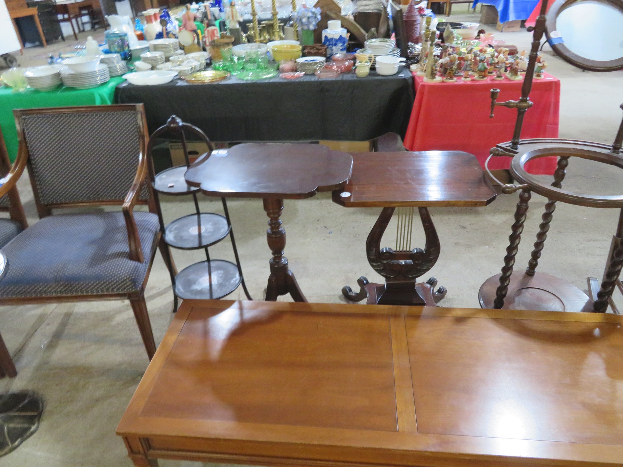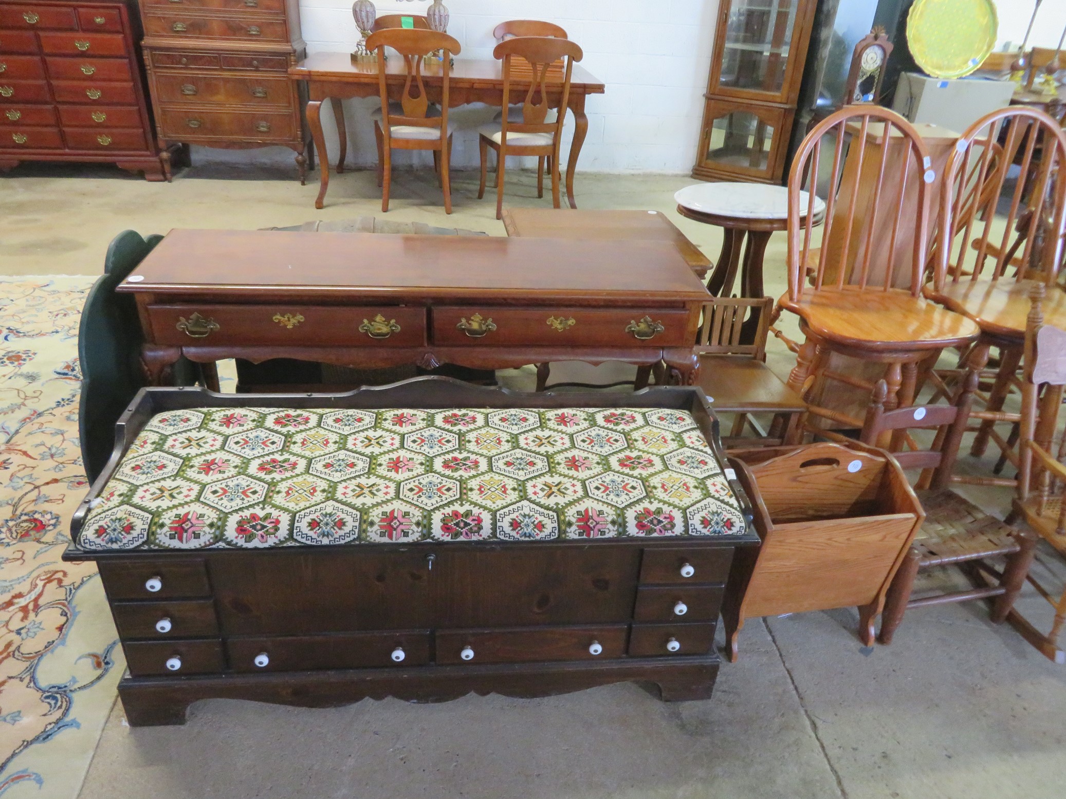 FURNISHINGS: Really nice MCM desk with 5 drawers; MCM chair and table; Kittinger server; 4 section stacking bookcase with base & topper; Oak card catalog on oak table; Good old jelly cupboard; Server with mirrored back; Sunroom glass top table with 4 wicker chairs & cushions; Nice chest of drawers; Contemporary bowfront chest; Contemporary concave front chest; Pressed oak bowfront china cabinet; Two tone Empire dresser; Very nice Golden Oak storage bench; diminutive serpentine front oak washstand with towel bar; Server with band inlay; Golden oak corner cabinet; Etagere; Glass side tables with brass leaf bases & accent birds; Nice armchair pair; Lamp table with brass accents; Marble top washstand; Black corner table with Oriental scenes; Floor lamp; Display shelf with bamboo look supports & paw feet; Black half-round cabinet with Oriental accents; Four drawer contemporary chest; Whitewash painted hallway cabinet; Half width china cabinet with broken arch pediment & filigree detailing; Oriental chests with brass accents; Dinette table with 2 leaves & 4 chairs; Open hutch; Curio cabinet styled like a china cabinet with broken arch; Washbasin stand with mirror and twist legs; Leather chair with nail-head accents; Lyre base table; 3 tier display; Beautiful pair of ribbed melon ceramic lamps on metal bases; Clocks; Fireplace tools & screens; Sumter rice carved four poster bed and dresser, Small server; End table pair; Dresser with mirror; Small library table; Martha Washington sewing table; Marble top side table; Stick lamps with tole shades; Pair of marble top plant stands; Bed steps; Two level coffee table; Pedestal; Bar seat; Coffee table with doily display; Pair of accent chairs; Ladder back chair; Footstools; Another nice coffee table; Magazine caddy; Hope chest; Child’s rocker; Bar stools; Antique child’s bouncy chair; More old children’s chairs& rockers; Sewing machine table; Oak table with leaf and chairs; Oak washstand; Contemporary dining table & chairs; Stone top hall table; Waterfall blanket box; Flat top trunk; Floor vase made of split bamboo stems; Nesting tables; Hall tables; Ottoman; Victorian table with glass ball in talon feet; Round glass table with brass base; Server with brass railing; Crystal ball stem lamp; Gold framed wall mirror; Chinese man statue lamp; Mirror with detailed frame; Blue & white ceramic lamp pair; Brown & white table lamp; Really nice room size Oriental carpets; Nice rugs and runners and much, much more!