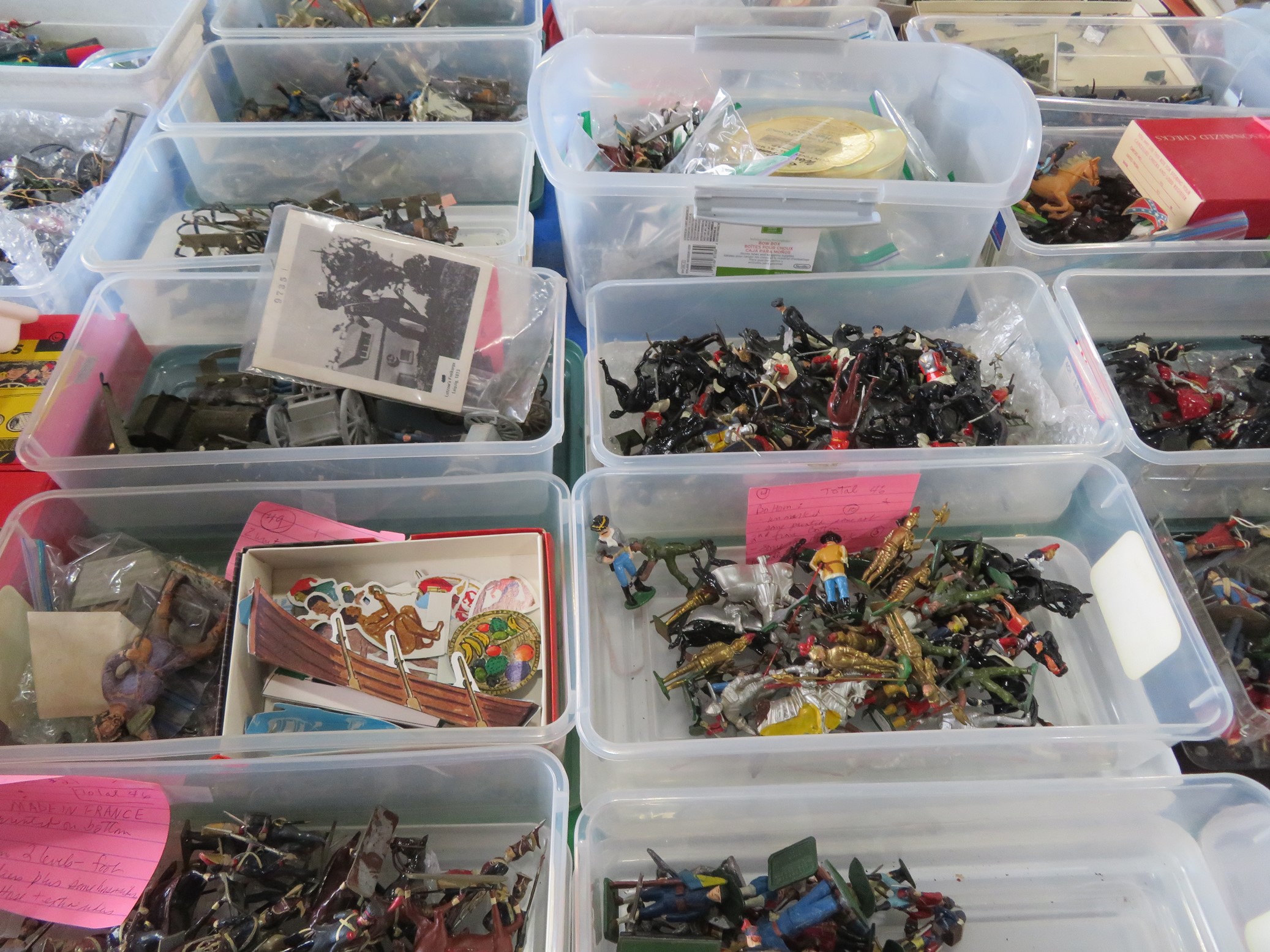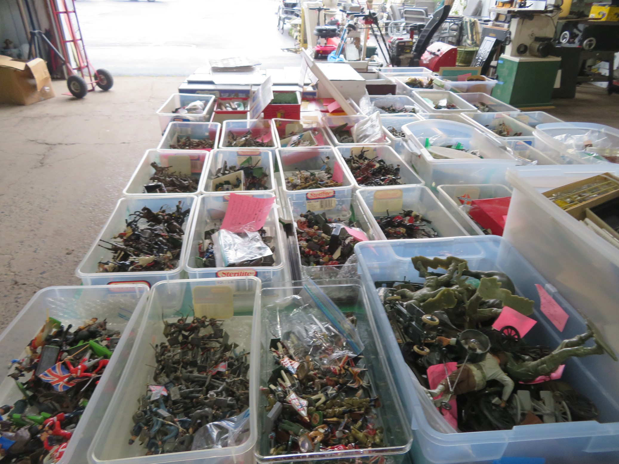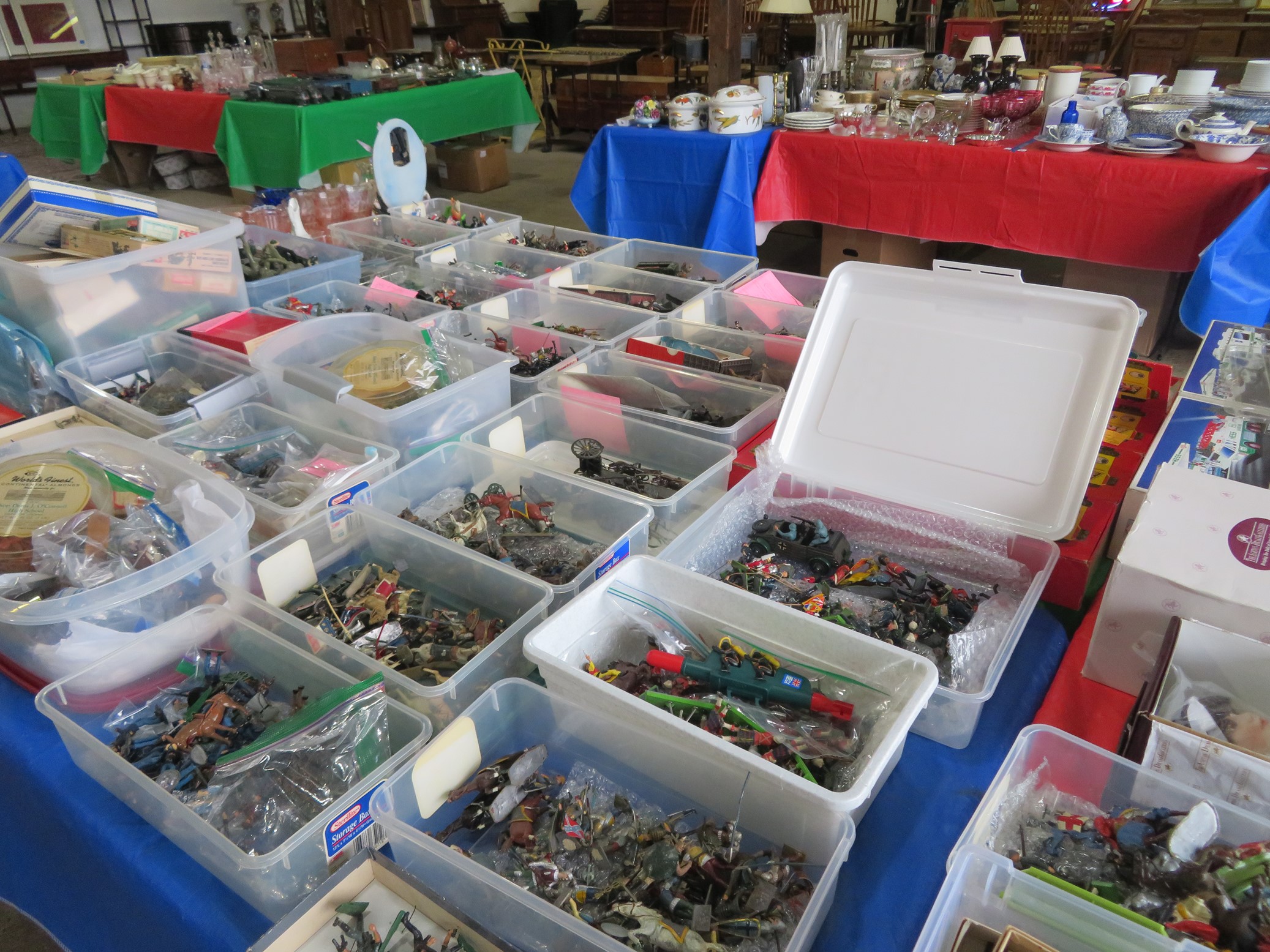 MORE: Neon ‘Coca-Cola’ sign; Neon ‘Open’ sign; Small two shelf counter display cabinet; Scales; Milk can with lid; Golf clubs; Cast iron bear bookend; Glass insulator; Brass car? Horn; Stoneware mixing bowls; Lantern; Stoneware crock; Brass weathervane directional; Pierced tin lantern; Opera glasses; Binoculars; Nice baskets; Old camera; Cuckoo clock; Mantel clock; Figural decanters; Pocket knives; Britain’s toy soldiers; Box after box of toy soldiers, mostly metal but some plastic; Tin soldiers in original boxes; Old cigar boxes with toys; Carriages; Cannons; Horses; Have your very own war! Old Hess trucks; Toy train sets; Baby carriage; Sewing baskets; Yarn winder; Unusual nutcracker figure; Brassware: duck paperweight, candlesticks, bell, hammer, owl family, small bowls & more; Wooden bowl with fruit; Decorative mask; Madame Alexander doll in box; Flour sifter; Carving set; Band saw; Table saw; Craftsman snow blower; Painted saw; Rikon planer; Goodyear Inflator; Lots & lots of Patio furniture for Spring! Planters; Wrought iron; Patio umbrellas; Concrete garden statues & planters on pedestals; Bird bath; Wagon; Dolly; Spreader; Porch swings; Garden bench; Folding chairs; Ferris Wheel plant holder; Fire pit; Traps; Propane tank; Chain saw; Shop vac & more!