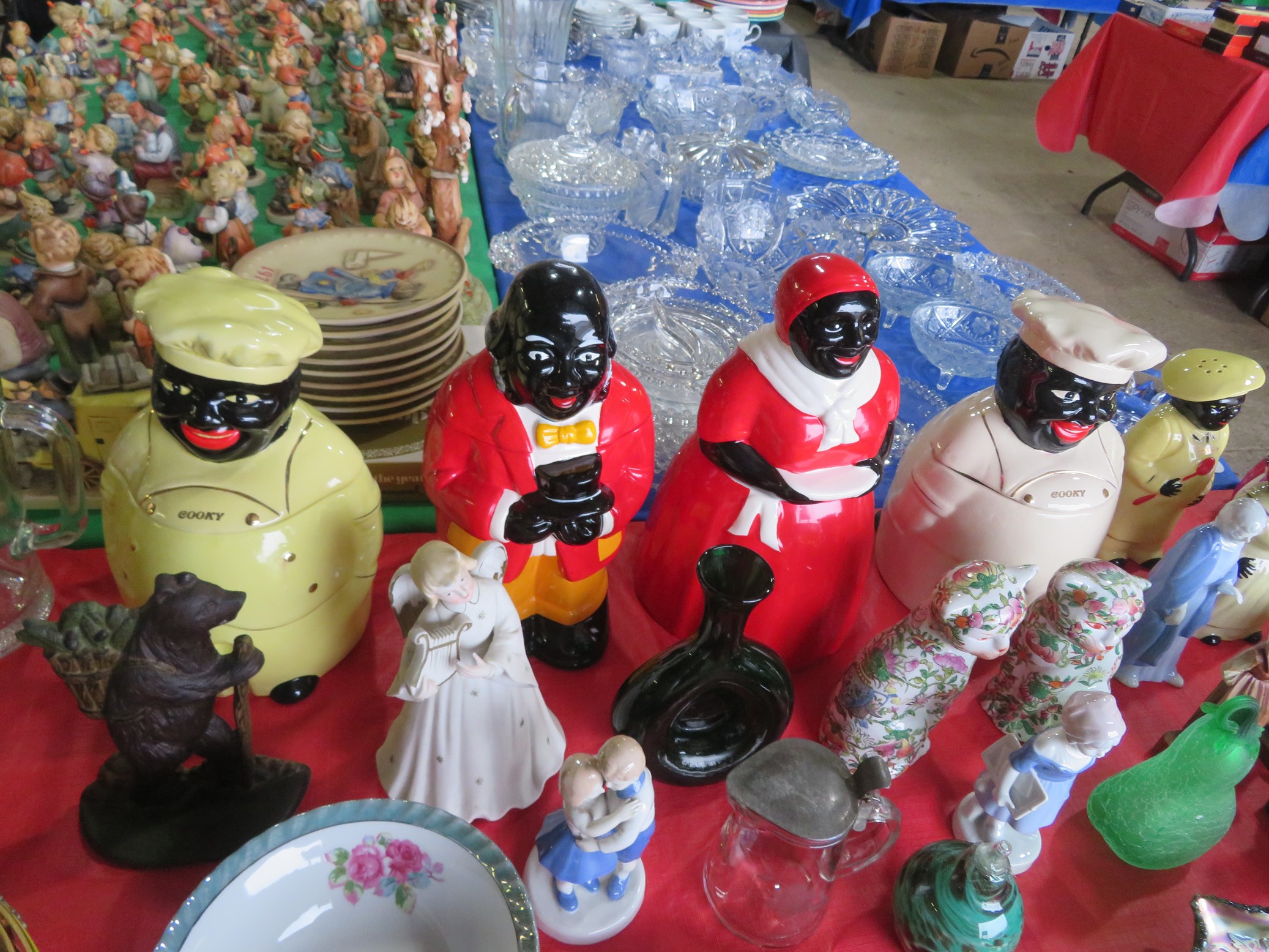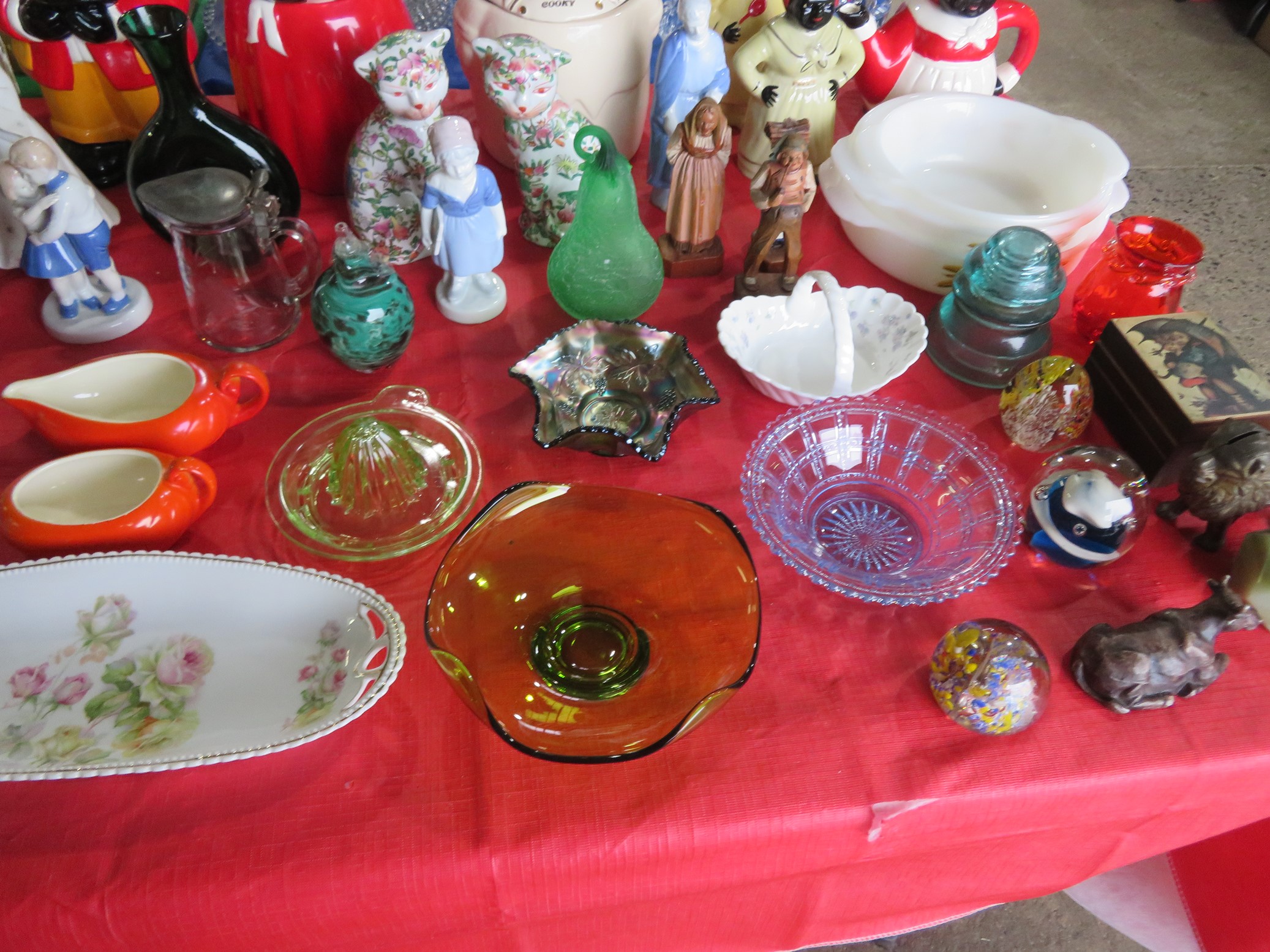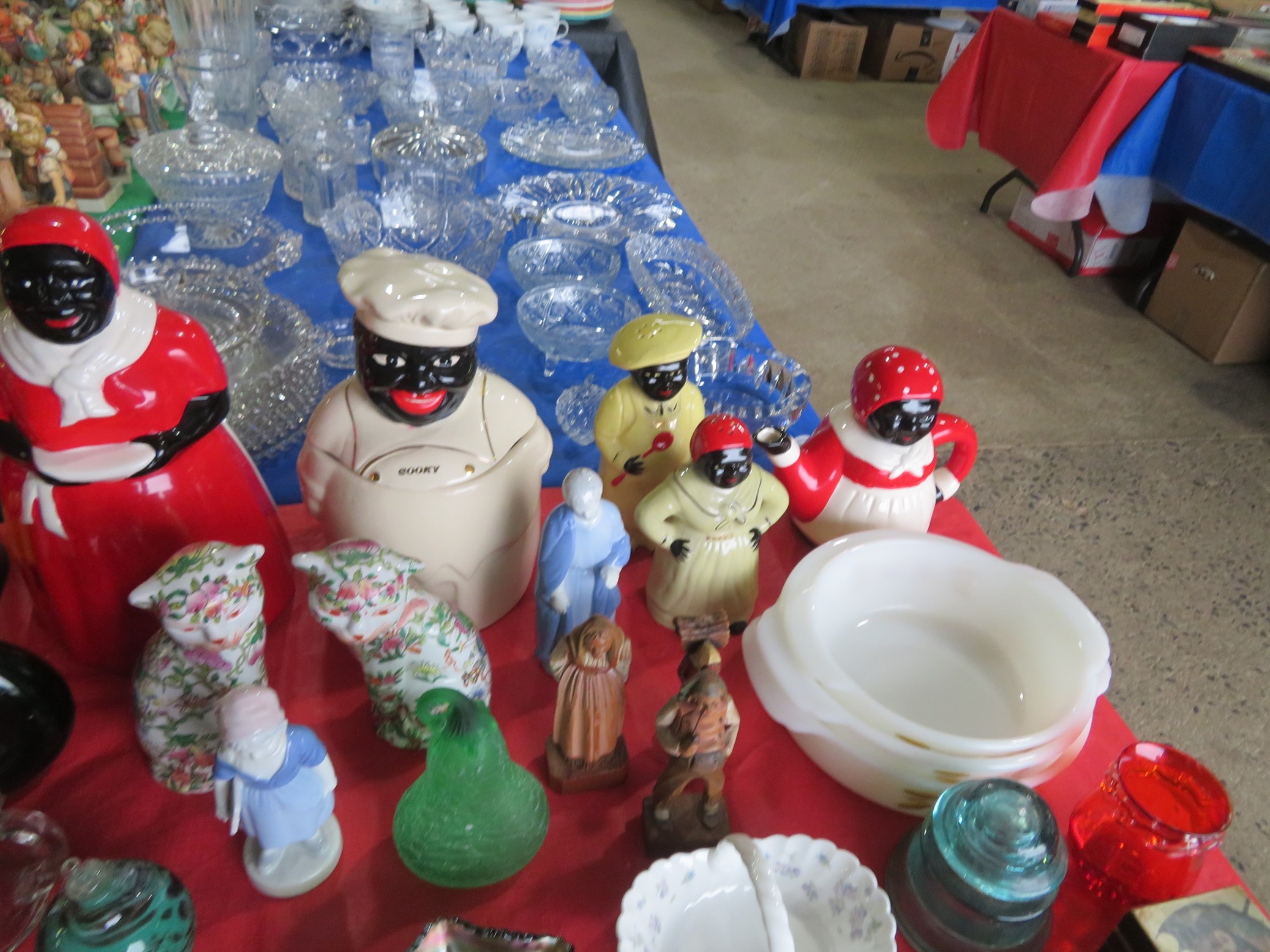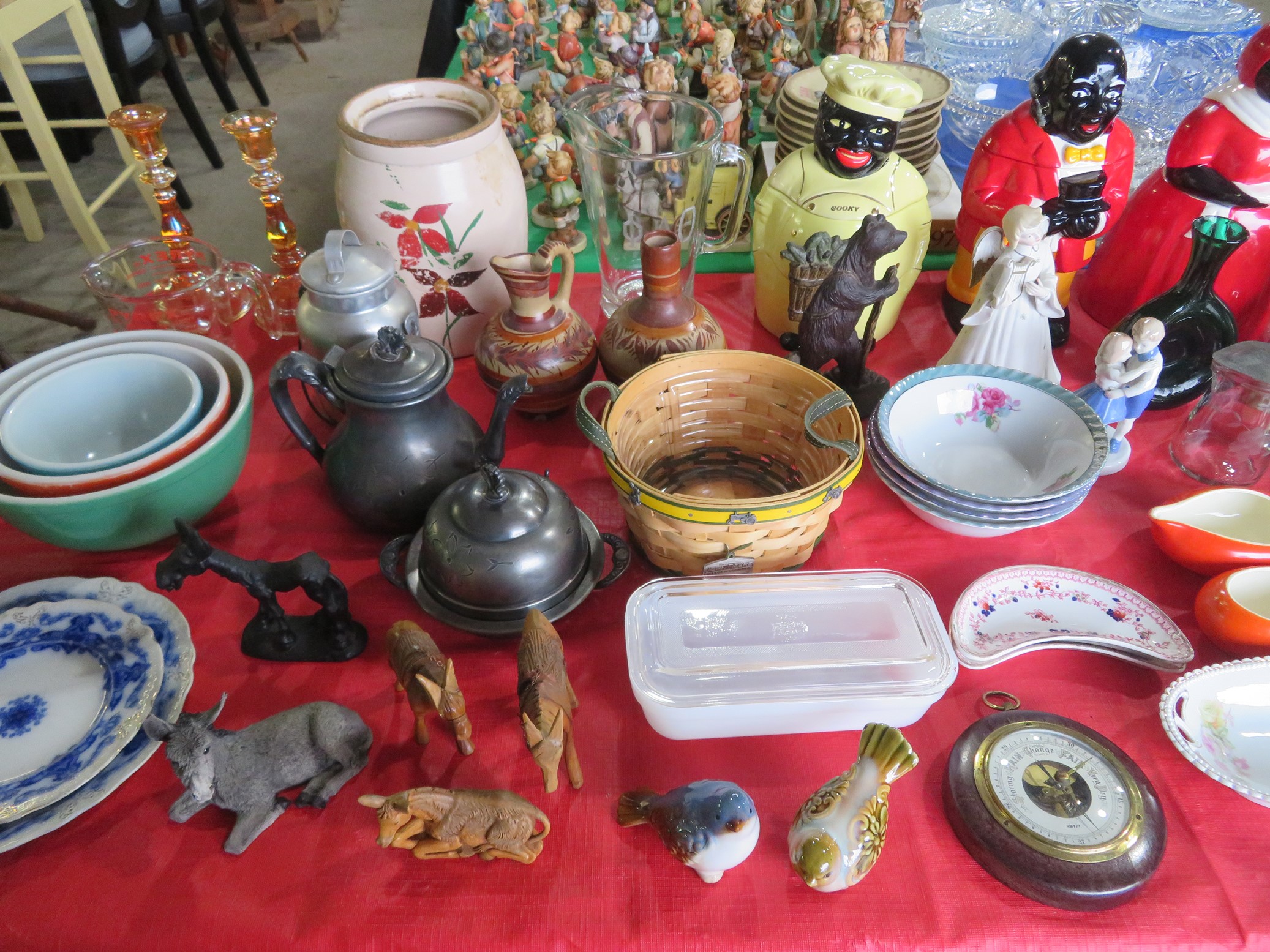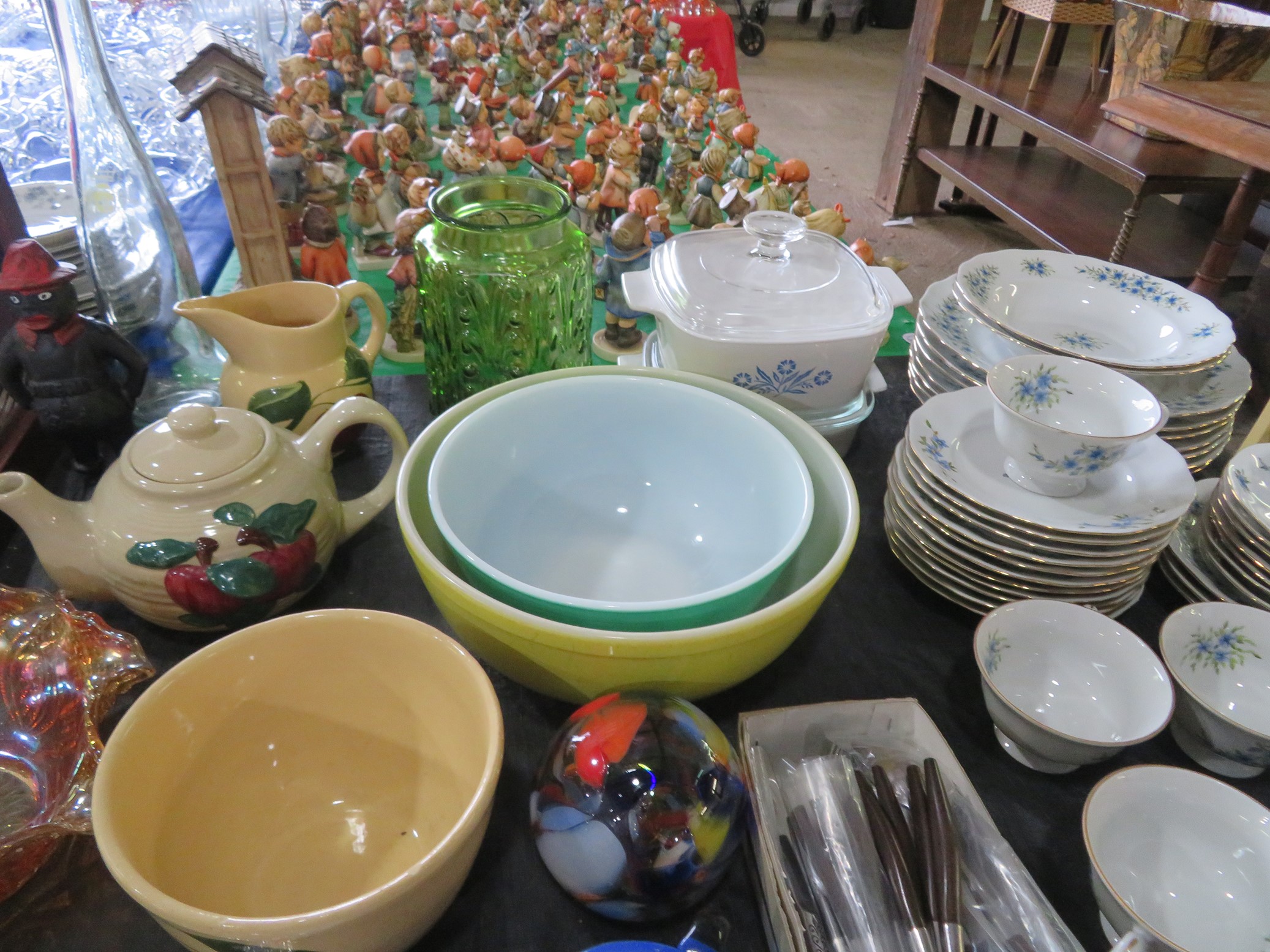 CHINA & GLASS: Royal Crown Derby “Brittany” china set; Quimper; Large Rosenthal dinnerware set; Evesham casseroles; Lenox; Corning ware casseroles; Fiesta dishes; Apple war teapot & pitcher; Blue Ridge plate; Belleek; Hand-painted bowl; Hummels after Hummels after Hummels! Hummel plates; Hummel lamps; Aunt Jemima & Cooky cookie jars & shakers; Figurines; Sets of fine china; Chip & dip; Stoneware mixing bowls; Pitchers; Nice porcelain flower arrangement; Wash basin & pitcher; S&P shakers; Wedgwood; Creamer & sugar; Flow Blue; Stein; Elvis; Hair receiver; Flowers; Egg coddlers; Trays; Flower pots; Canister set; Blue Willow; Spongeware mixing bowl set; Oriental vases; Collectible teacups & saucers; Pyrex mixing bowl sets; Carnival glass ruffled edge bowl; Cobalt cut to clear decanter & glasses; Paperweights; Ruby glass bowl; Pyrex measure cup; Candlesticks; Glass fruit; Glas-bake casseroles; Green depression reamer; Candlewick plates, bowls & more; Nice crystal selection; Candy dish with lid; Bowls; Vases; Celery dish; Butter tray with lid; Refrigerator dishes; Cruet; Pitcher; More green depression; Pink depression; Yellow depression; Carnival hen on nest; Goofus glass Last Supper tray; Moon & stars lidded candy dish; Marmalade jar; Cobalt bottle; Glass animals; Colored glass; Opalescent hobnail glass; Lace edge; Milk glass cake stand; Epergne centerpiece; Egg plate; Basket; Candlesticks and More!
