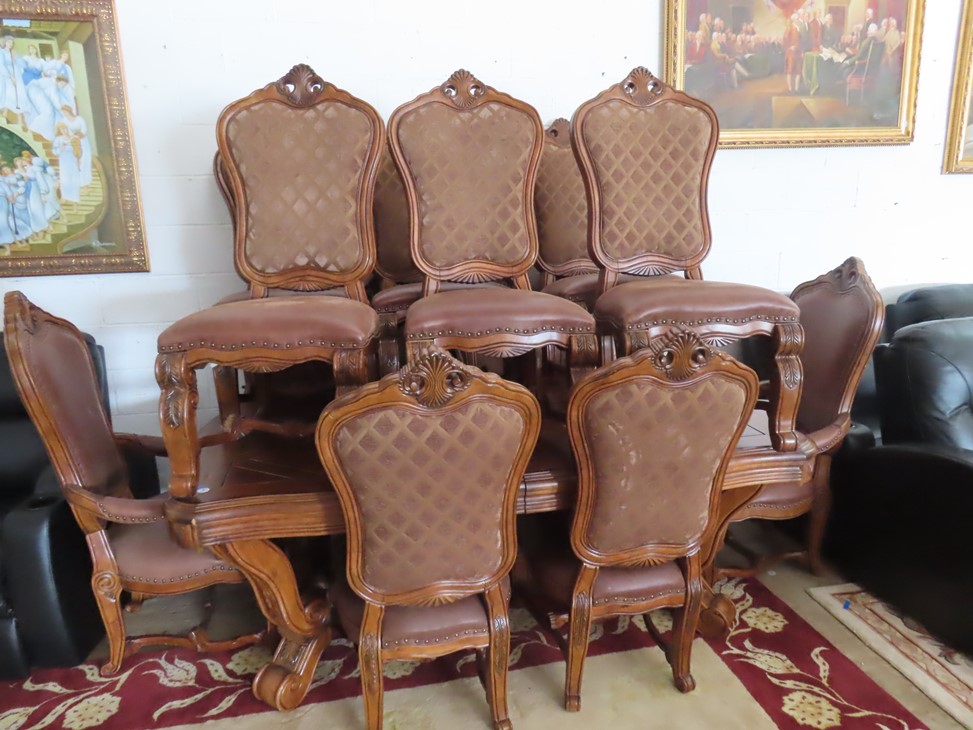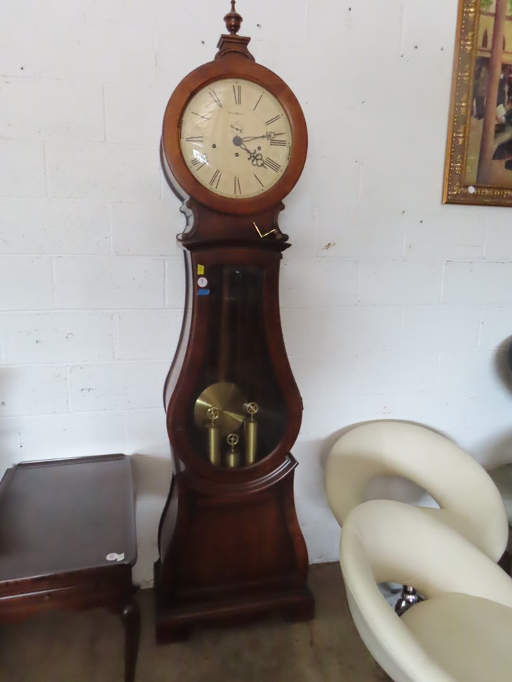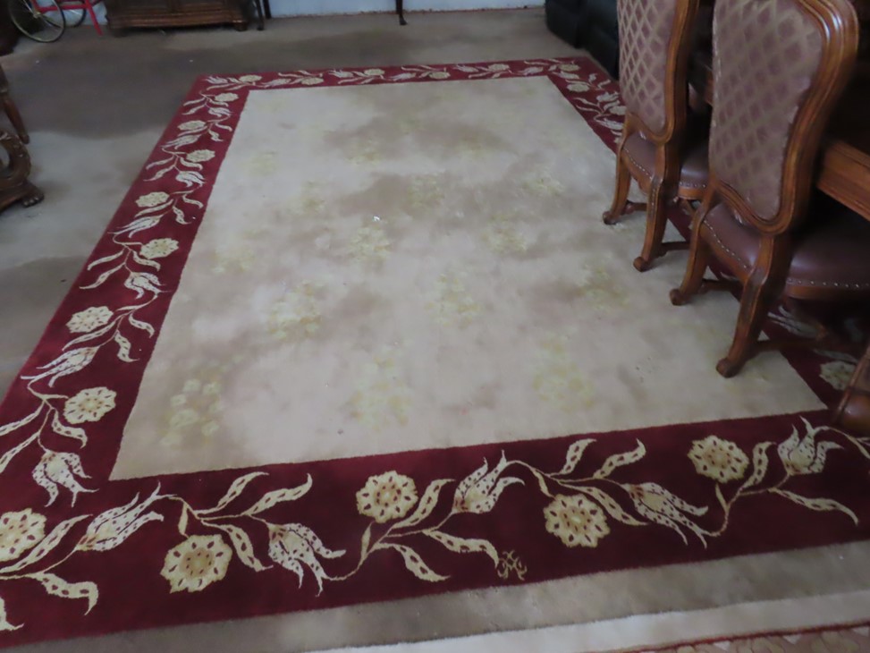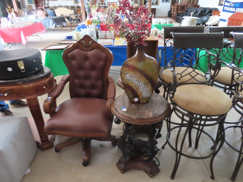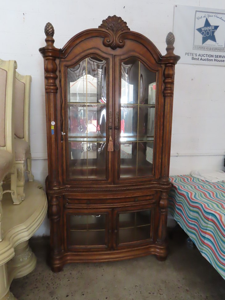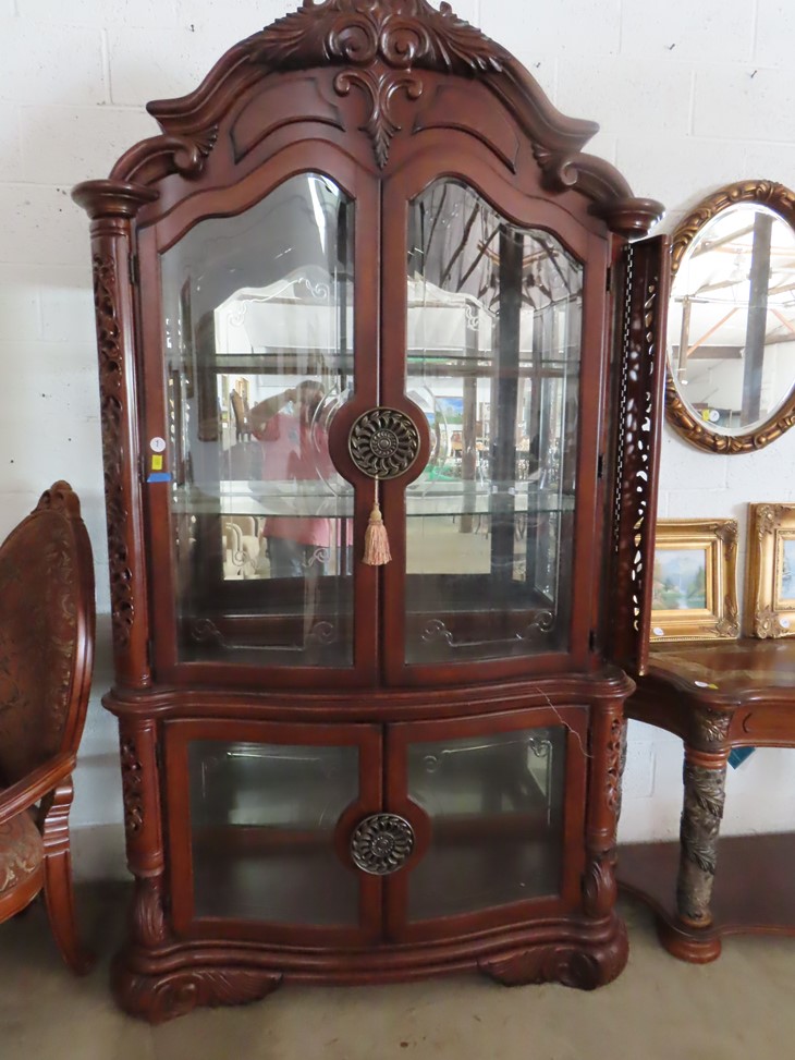 FURNISHINGS: Round Glass table with 5 wonderful, upholstered chairs; 9 Home theater leather seats-sold in groups of 3; Seating nook modern design chrome pedestal chair pair and drink table sets – 1 set with white chairs, 1 set with black chairs; Elaborate bookcase; Glass top chrome pedestal display tables; Modern design floor lamp pair with 3 ball lights; Nicely upholstered armchair; Cream velvet sofa with tufting & tassels; Pair of slipper chairs; Howard Miller Grandfather clock; 6 Club chairs with leather sides; Another super buffet; Library table with marble inserts on legs; Another stupendous china cabinet; Hall table with marble insert top and legs; Dining table with 12 chairs; Henkel Harris Jamestown Colony Corner cabinet; Henkel Harris Jamestown Colony buffet; Leather topped executive desk; Executive rolling desk chair; Wonderful sofa with tulip upholstery; Round glass table with wood pedestal and 5 armchairs; Imposing china cabinet; Dining table with multiple chairs; Another great dining table with 8 chairs; Buffet; End table with pull out candlestand; Executive conference table with rolling leather chairs; Oval Henkel Harris dining table with leaf and 8 chairs; Rolling leather desk chair; Side table with etched glass top; Matching end table pair and coffee table; 4 barstool set; Glass top dinette set with chair pair; More Modern design chairs; Brushed steel & glass coffee table; Another tremendous china cabinet; Another leather top desk with executive chair; Another great china cabinet; Sets of iron bar seats; Washstand with towel bar sides; Pair of drop side end tables; Impressive coffee table; Large marble & glass top oval hall table; Another great leather office chair; Pair of marble end tables; Armless velvet sofa; Empire chest; Nightstands with 1 drawer set; Drop front secretary; Four poster bed; Cannonball bed; Empire dresser with glove boxes; Ottoman; Single chairs; Hanging tulip lights; Floor vase with faux arrangement; More floral arrangements; Round burgundy rug with fleur-de-lis; Cream fleur-de-lis rug; Large rug with burgundy floral border; Lots more Great Oriental rugs; Clear cube stemmed table lamps; Lots of decorator accessories and much, much more!
