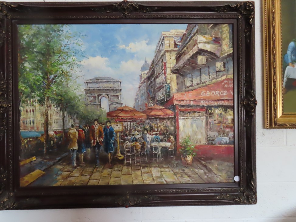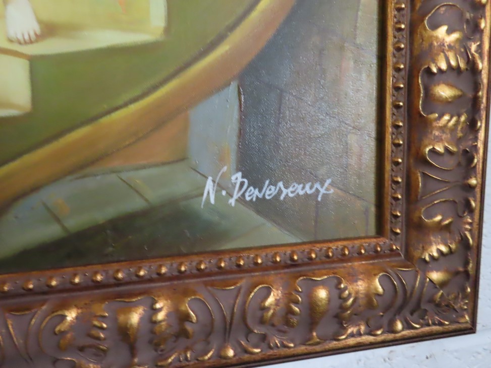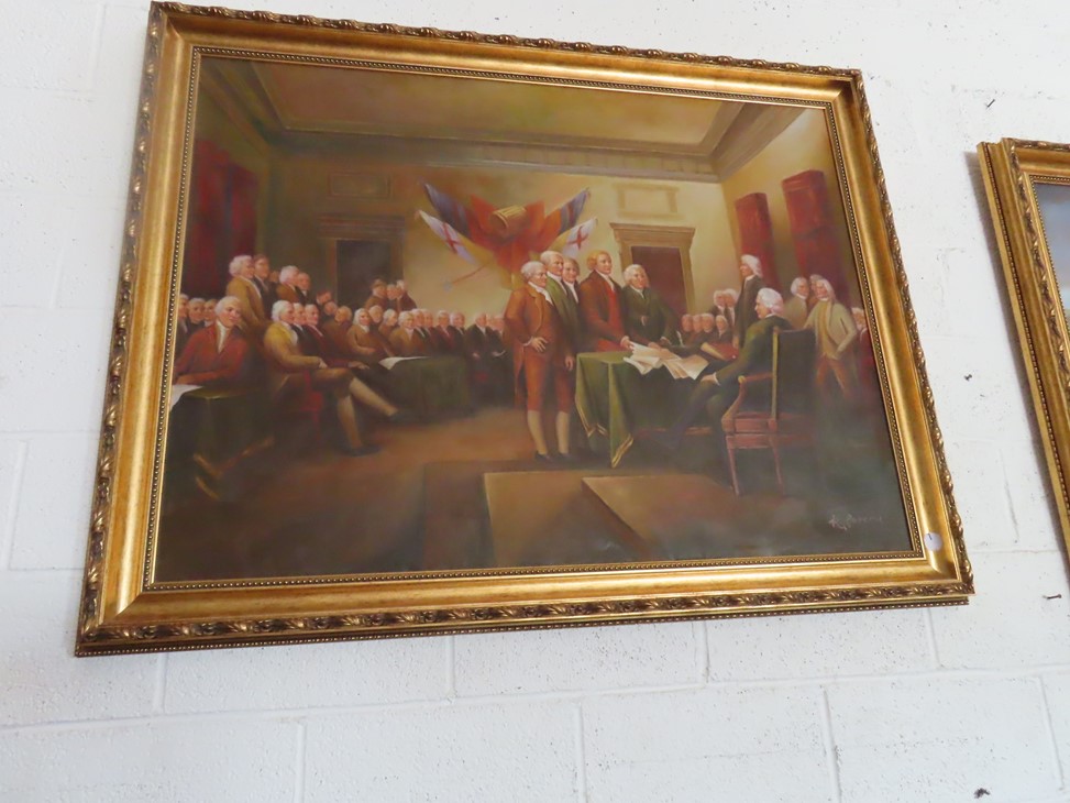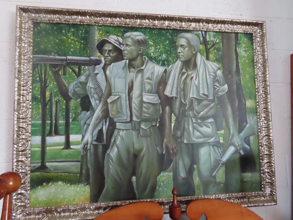 ART & SILVER: Top quality artworks! Many signed. Ballerinas; Forest waterfall; Floral arrangement; Virgin Mary & angels; US Capitol; Eastern serving girl with tray; Renoir Boating Party copy; Superb Lincoln statue painting; Medieval musicians descending steps by N. Devereux; Congressional Congress; Napolean on horseback; Paris street scene; Last Supper copy; Vietnam Soldiers statue paintings; Sailing ships in harbor; Fishing ships at rest; Middle Eastern art; Seurat & Monet style paintings; Washington Crossing the Delaware; Lion in snow; Lady with harp; Pooch portrait; Child’s mug; Spoons, Ladle & much, much more!