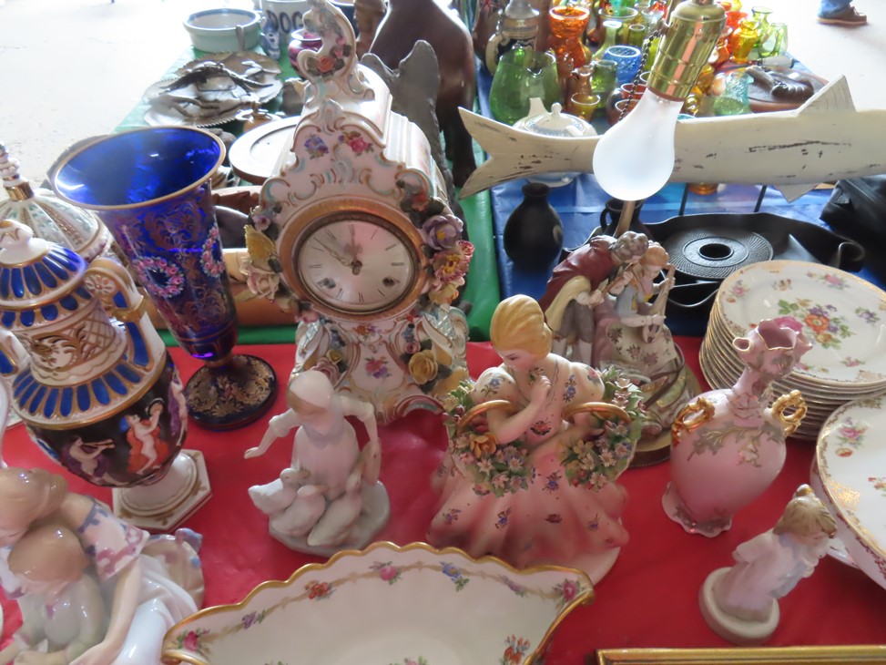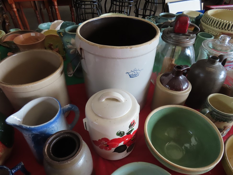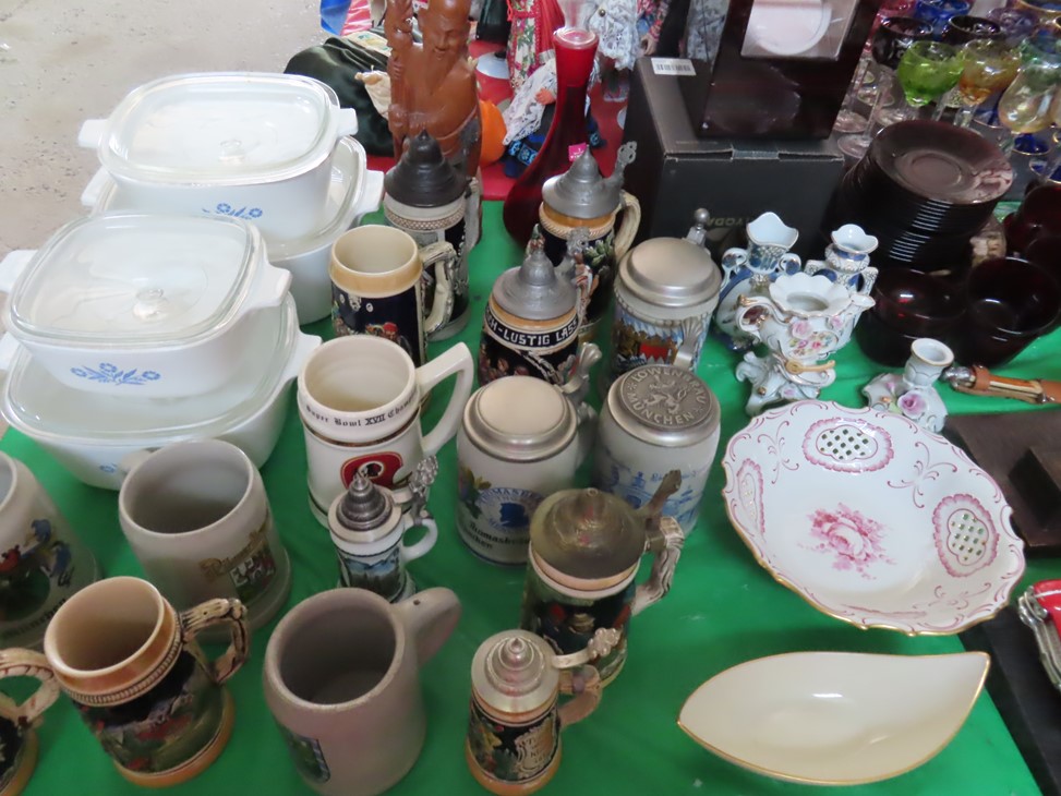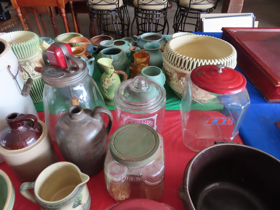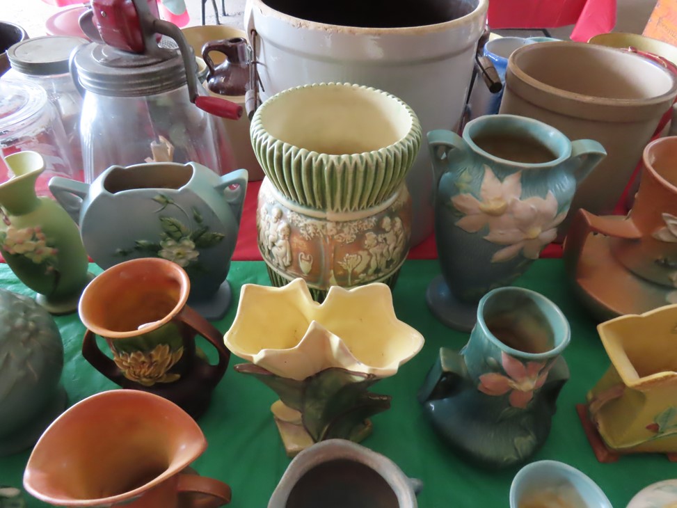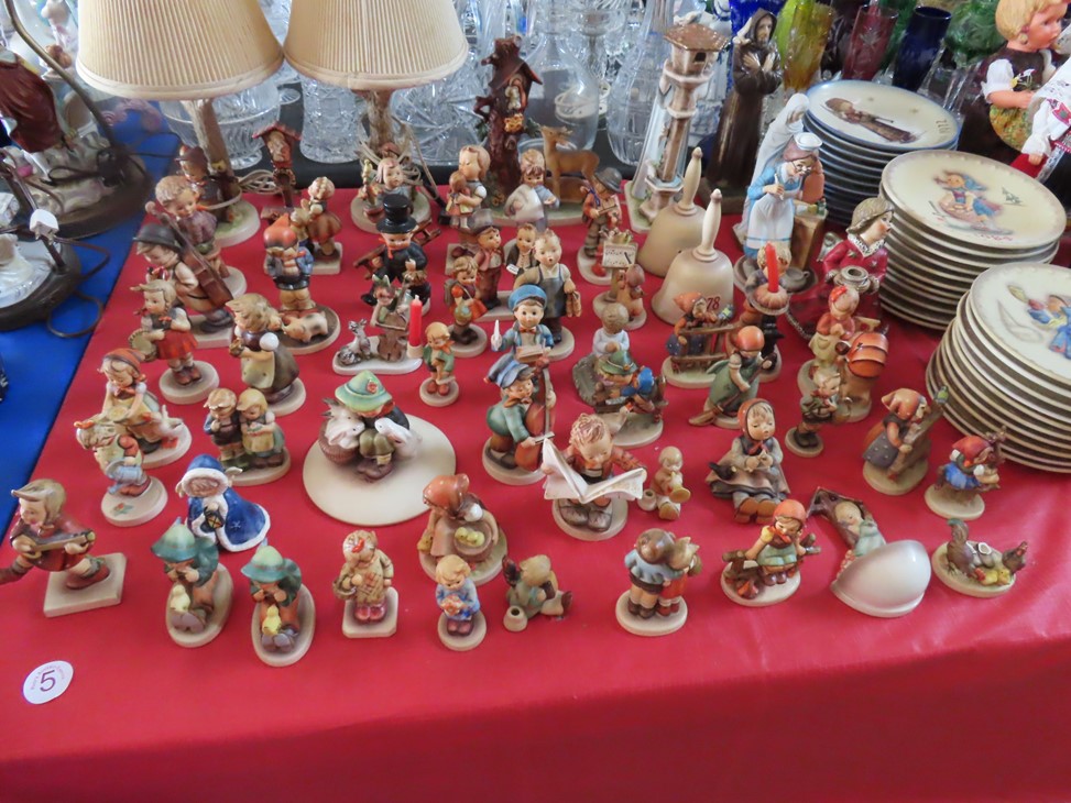 CHINA & GLASS: Wonderful Roseville collection! Vases, Planters, Candleholders; Pitcher; Jardinières; Console planters; Compote, Flower frog & more; The fanciest ceramic figural candleholders; Great figurines; Lladro’; Compotes; Fine porcelains for every room of the home; Sconce; Mixing bowls; Pitchers; Planter; Cookie jar; Apple cookie jar; Royal Doulton Foxhunting pitcher and plate; Steins; Teapot; Biscuit jar; Figurines; Flow blue plates & bowl; Beatrix Potter bowl; Tray with farm animals border; Large Spode Christmas tree collection including plates, canisters, casseroles, cheese knife, bowls, butter dish, sieve, S&P, pitchers & much more; Royal Doulton figurines; Cream pitchers; Hummels by the dozen; Hummel lamps, bells & plates; Noritake “Sheila” dinnerware set; Figural clocks & lamps; Another nice set of ceramic candelabras; Whimsical dinnerware set including dog bowls; Trinket boxes; Cobalt glasses with gold edges; Jadite swirl mixing bowl; Colored cut to clear champagne goblets, flutes & sherbets-multiple sets; Corning ware casseroles with lids; Ruby glass dinnerware set; Stemware with ruby glass bowls; Ruby glass tumblers; Red goblets with enameling; Colored cut to clear vases; Crystal decanters; Crystal lamp; Candlesticks; Vases; Candy dishes; Serving tray; Etched stein; Cruets; More good crystal; Cobalt glassware; Purple swirl art glass vase; Colored crackle glass collection and much, much more!
