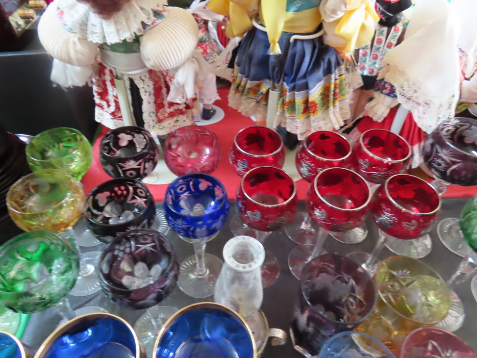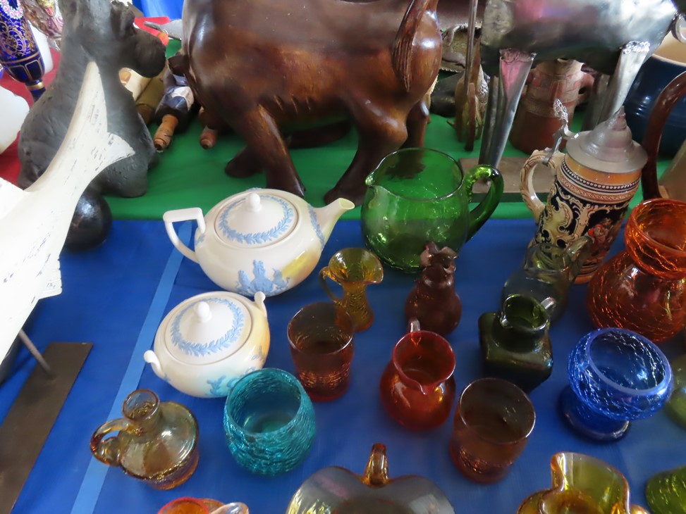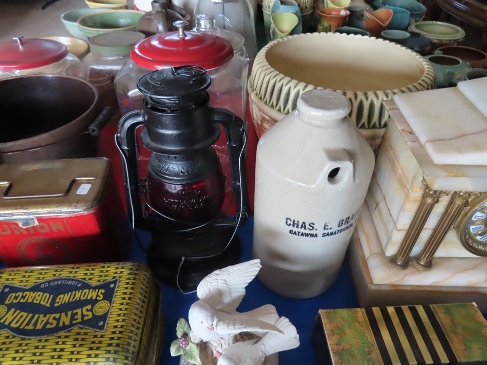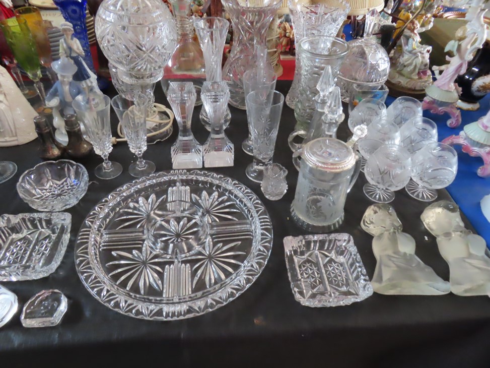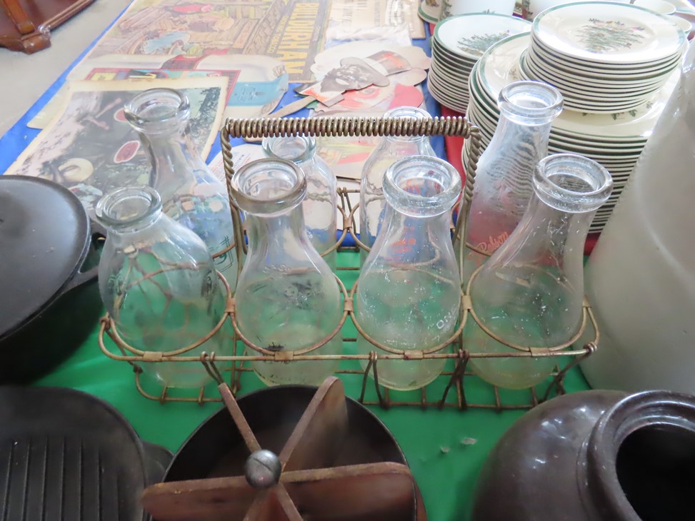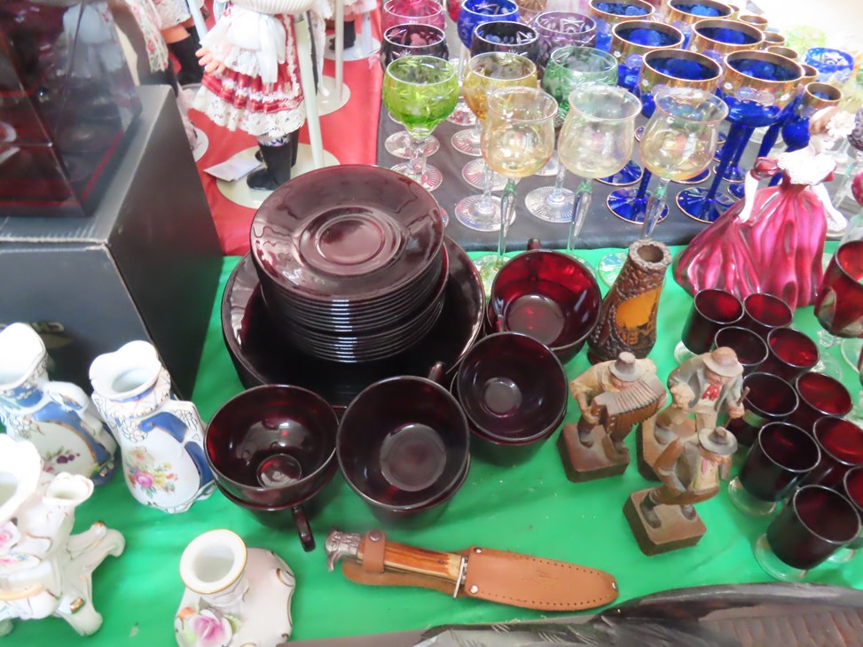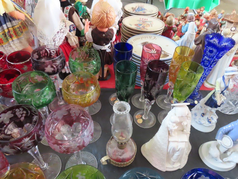 CHINA & GLASS: Wonderful Roseville collection! Vases, Planters, Candleholders; Pitcher; Jardinières; Console planters; Compote, Flower frog & more; The fanciest ceramic figural candleholders; Great figurines; Lladro’; Compotes; Fine porcelains for every room of the home; Sconce; Mixing bowls; Pitchers; Planter; Cookie jar; Apple cookie jar; Royal Doulton Foxhunting pitcher and plate; Steins; Teapot; Biscuit jar; Figurines; Flow blue plates & bowl; Beatrix Potter bowl; Tray with farm animals border; Large Spode Christmas tree collection including plates, canisters, casseroles, cheese knife, bowls, butter dish, sieve, S&P, pitchers & much more; Royal Doulton figurines; Cream pitchers; Hummels by the dozen; Hummel lamps, bells & plates; Noritake “Sheila” dinnerware set; Figural clocks & lamps; Another nice set of ceramic candelabras; Whimsical dinnerware set including dog bowls; Trinket boxes; Cobalt glasses with gold edges; Jadite swirl mixing bowl; Colored cut to clear champagne goblets, flutes & sherbets-multiple sets; Corning ware casseroles with lids; Ruby glass dinnerware set; Stemware with ruby glass bowls; Ruby glass tumblers; Red goblets with enameling; Colored cut to clear vases; Crystal decanters; Crystal lamp; Candlesticks; Vases; Candy dishes; Serving tray; Etched stein; Cruets; More good crystal; Cobalt glassware; Purple swirl art glass vase; Colored crackle glass collection and much, much more!