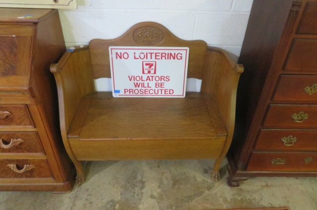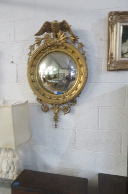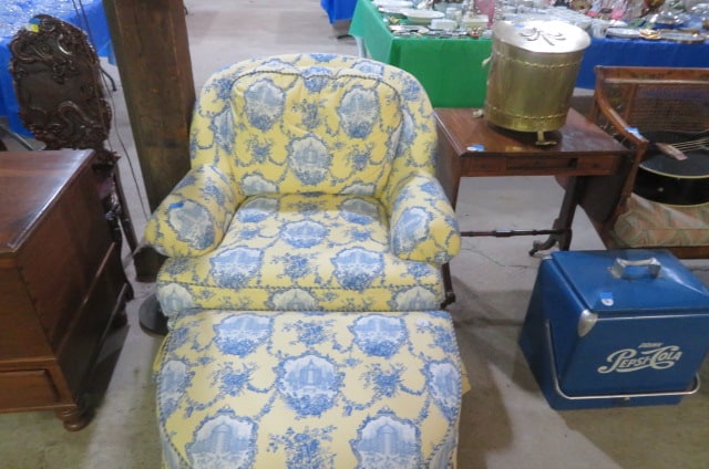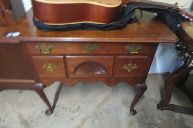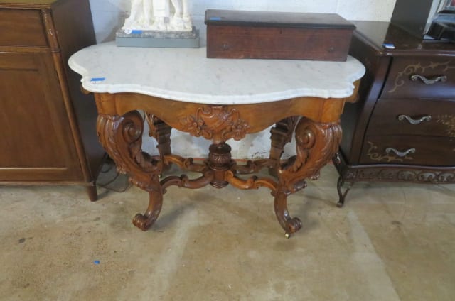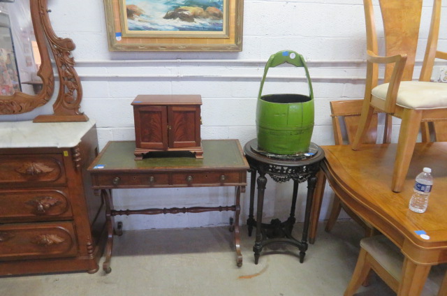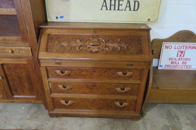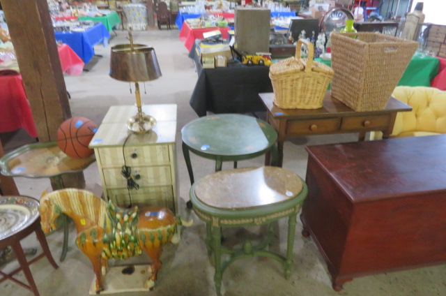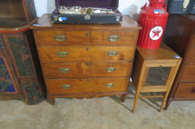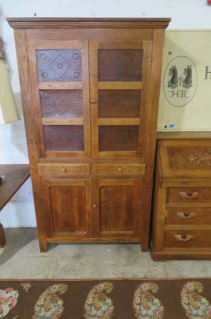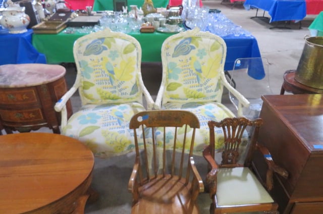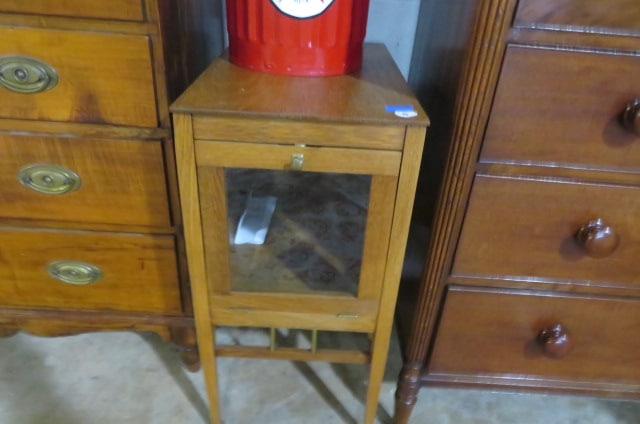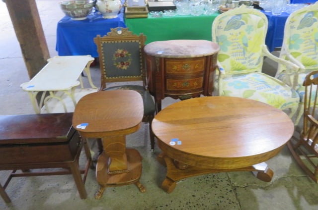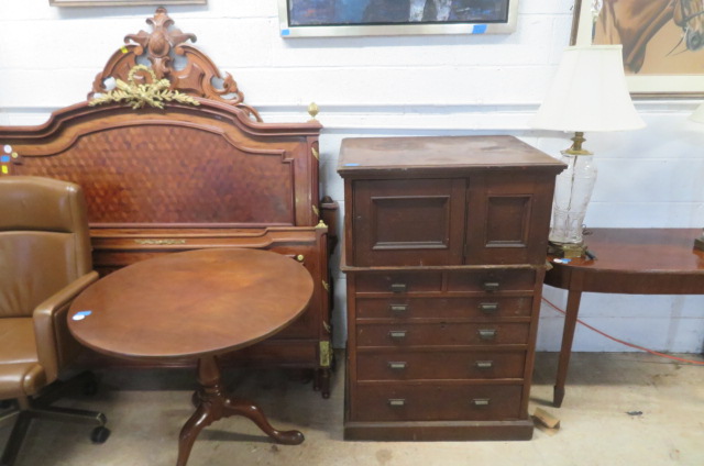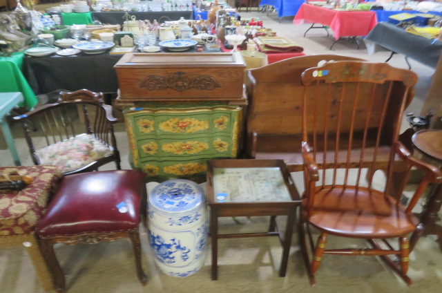 FURNISHINGS: Open step-back hutch with plate rails and grand folk art painting; Another super nice step-back cupboard; Corner cabinet with old green interior paint; Unusual tall floor clock with visible pendulum; Large oval tilt top dining table; Pair of Widdicomb green bombe’ chest with gold accents; Display table with shaped marble top; Nice 2 over 3 drawer chest with columnar edges; Small icebox; Another nice blanket box; Oak display cabinet; Super Victorian dresser with marble top and mirror in ornate frame; Pie safe with screen doors; MCM leather sofa; Glass front display cabinet; 2 drawer Clarks Spool cabinet; J.& P. Coats 2 drawer spool cabinet; Superb step-back open hutch; Impressive cupboard with pierced tins top, 2 drawers with carvings and 2 blind doors; 3 drawer bombe chest with painted accents; Small desk; Good old 4 drawer chest; Small oak glass front cabinet; Tilt-top table/bench combo; Excellent drop front secretary with lots of carvings and beautiful veneering; Unusual writing desk/display table; Fine wing-back chair; Good blanket box; Loveseat; Plant stands; Corner chair; Cabinets; Painted cabinet; Rocking chair; Tea cart; Victorian tables; Marble top stand; Dining table and chairs; Golden oak lift seat storage bench with paw feet; Tall chest of drawers; Dining table with banded edge, leaf and chairs; Tall case Grandfather clock; Round table with marble insert and lots of carving and inlay; Small server with fan carving; Triple compartment storage unit; Nice occasional table; Golden oak washstand with backsplash and chip carvings; Step-back cupboard with glass doors; High-top table with stool pair; Early low table; Marble top side table with 2 drawers; Oak coffee table; Oak side table; Pair of nicely upholstered chairs; Chair with needlepoint seat; Child’s rocker; Child’s armchair; MCM style Lucite chair; Blanket box with initials and date; Overstuffed chair and ottoman; Drop side occasional table; Floor lamps; Bench with padded seat; Crank music player; Fine Oriental rugs and runners; Tufted chair pair; Coffee table with old red paint; Leather top desk; Finely decorated four panel, full height room screen; Fancy bed; Leather office chair; Old office cabinet; Crystal lamps; Super metal figural lamp with floral glass shades; Figurine grouping lamp; Celadon urn lamp; Banjo clock; Ornate wall clocks; Ornate Venetian style glass mirror; Stunning Bullseye mirror with eagle topper; Wall clock with reverse painting; Oval mirror with gold frame & top bow; Wall mirror with fancy metal frame; Table lamps; Coal hod; Brass kindling bucket; Fireplace tools sets; Nice pair of blue & white ceramic lamps; Painted well bucket; Lots of occasional tables; Fine clock and much, much more!