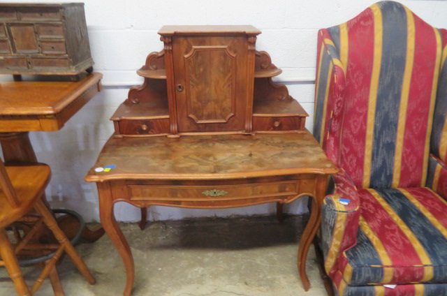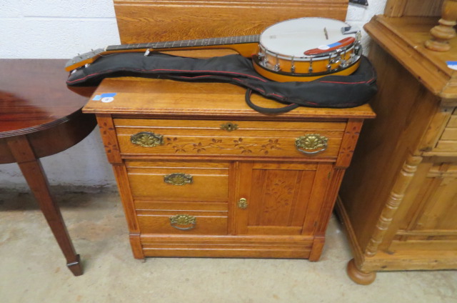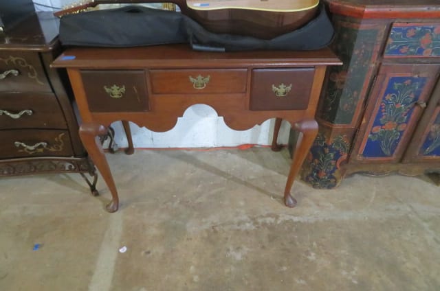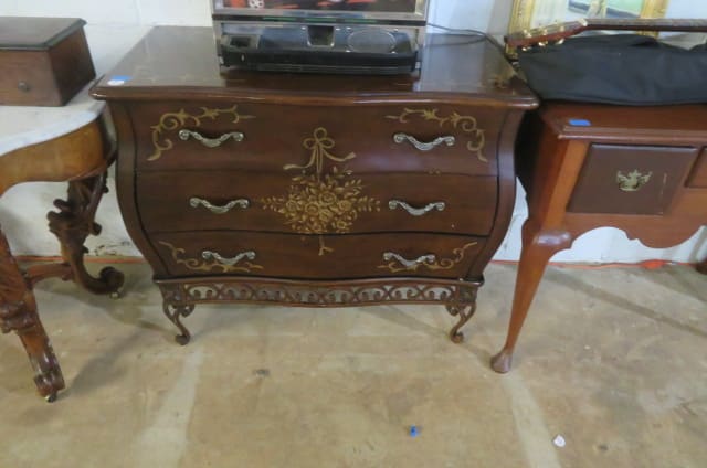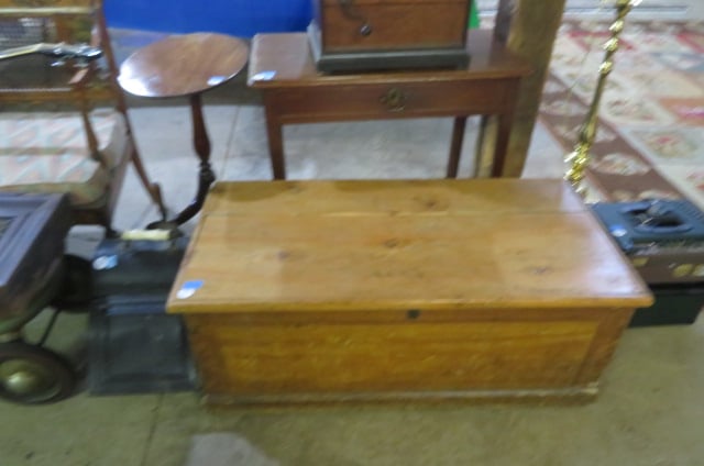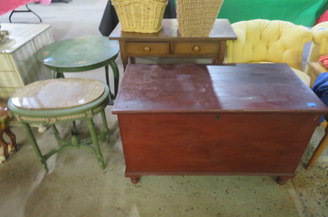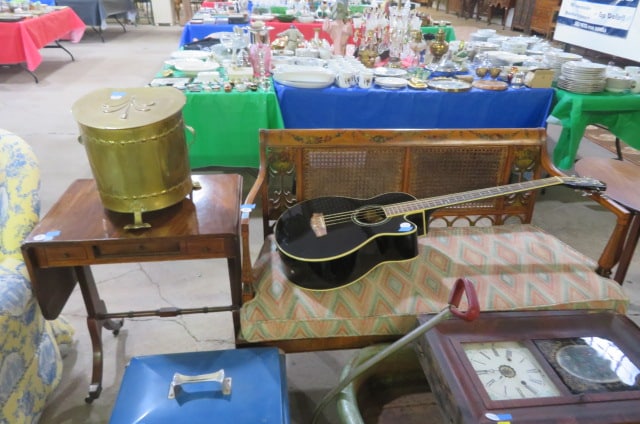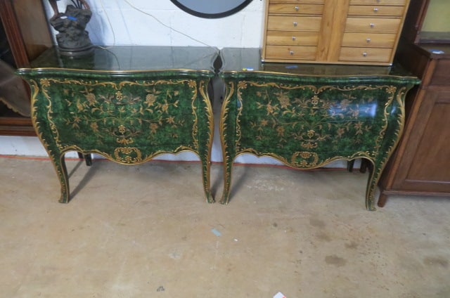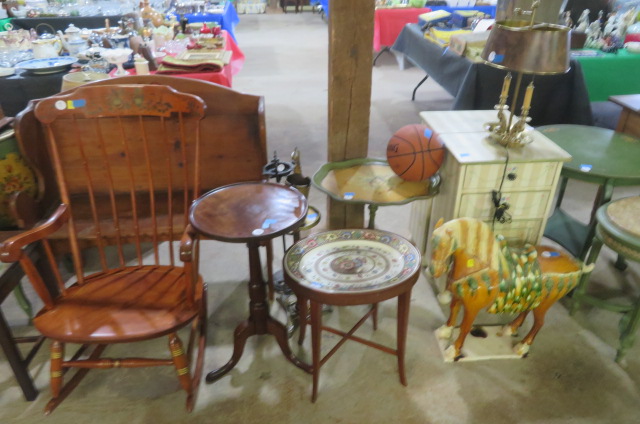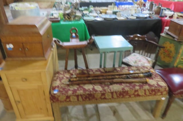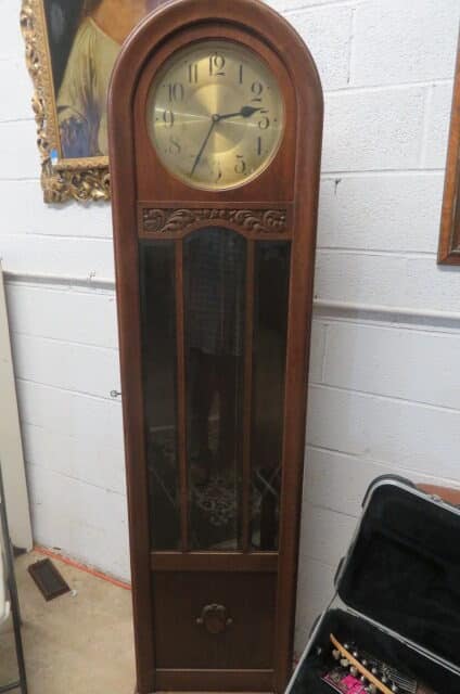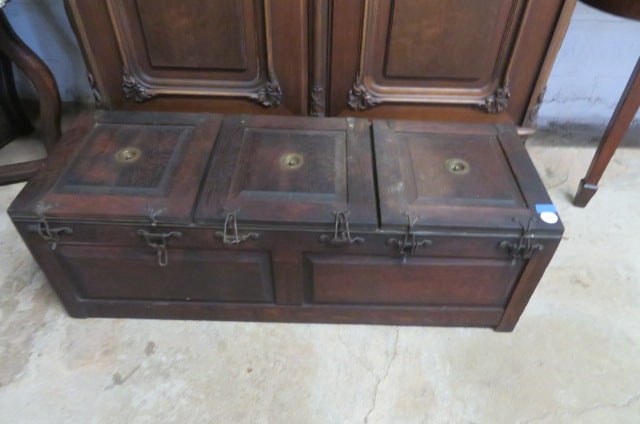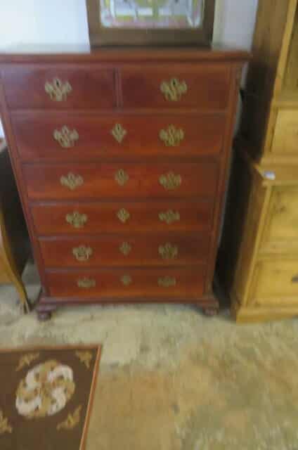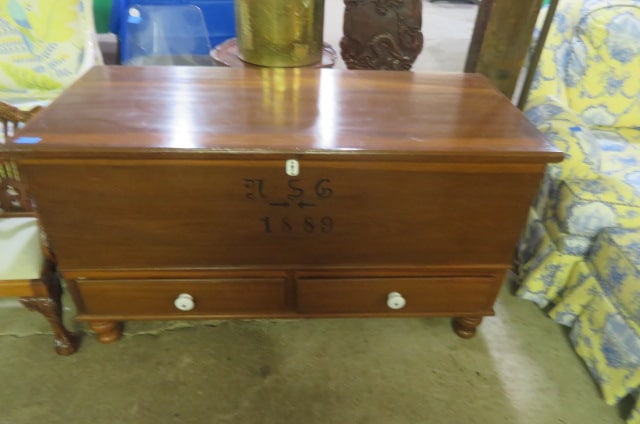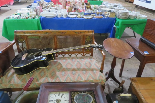 FURNISHINGS: Open step-back hutch with plate rails and grand folk art painting; Another super nice step-back cupboard; Corner cabinet with old green interior paint; Unusual tall floor clock with visible pendulum; Large oval tilt top dining table; Pair of Widdicomb green bombe’ chest with gold accents; Display table with shaped marble top; Nice 2 over 3 drawer chest with columnar edges; Small icebox; Another nice blanket box; Oak display cabinet; Super Victorian dresser with marble top and mirror in ornate frame; Pie safe with screen doors; MCM leather sofa; Glass front display cabinet; 2 drawer Clarks Spool cabinet; J.& P. Coats 2 drawer spool cabinet; Superb step-back open hutch; Impressive cupboard with pierced tins top, 2 drawers with carvings and 2 blind doors; 3 drawer bombe chest with painted accents; Small desk; Good old 4 drawer chest; Small oak glass front cabinet; Tilt-top table/bench combo; Excellent drop front secretary with lots of carvings and beautiful veneering; Unusual writing desk/display table; Fine wing-back chair; Good blanket box; Loveseat; Plant stands; Corner chair; Cabinets; Painted cabinet; Rocking chair; Tea cart; Victorian tables; Marble top stand; Dining table and chairs; Golden oak lift seat storage bench with paw feet; Tall chest of drawers; Dining table with banded edge, leaf and chairs; Tall case Grandfather clock; Round table with marble insert and lots of carving and inlay; Small server with fan carving; Triple compartment storage unit; Nice occasional table; Golden oak washstand with backsplash and chip carvings; Step-back cupboard with glass doors; High-top table with stool pair; Early low table; Marble top side table with 2 drawers; Oak coffee table; Oak side table; Pair of nicely upholstered chairs; Chair with needlepoint seat; Child’s rocker; Child’s armchair; MCM style Lucite chair; Blanket box with initials and date; Overstuffed chair and ottoman; Drop side occasional table; Floor lamps; Bench with padded seat; Crank music player; Fine Oriental rugs and runners; Tufted chair pair; Coffee table with old red paint; Leather top desk; Finely decorated four panel, full height room screen; Fancy bed; Leather office chair; Old office cabinet; Crystal lamps; Super metal figural lamp with floral glass shades; Figurine grouping lamp; Celadon urn lamp; Banjo clock; Ornate wall clocks; Ornate Venetian style glass mirror; Stunning Bullseye mirror with eagle topper; Wall clock with reverse painting; Oval mirror with gold frame & top bow; Wall mirror with fancy metal frame; Table lamps; Coal hod; Brass kindling bucket; Fireplace tools sets; Nice pair of blue & white ceramic lamps; Painted well bucket; Lots of occasional tables; Fine clock and much, much more!