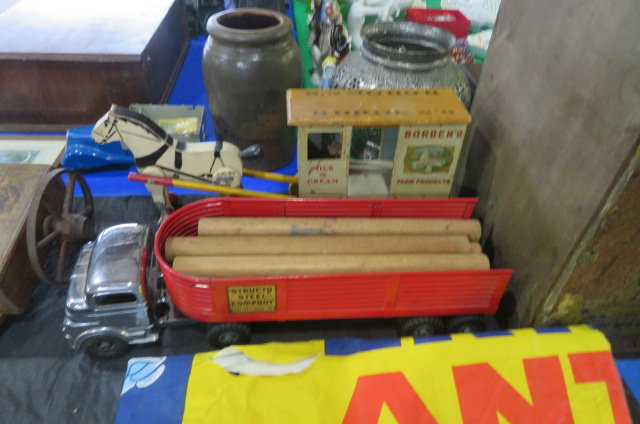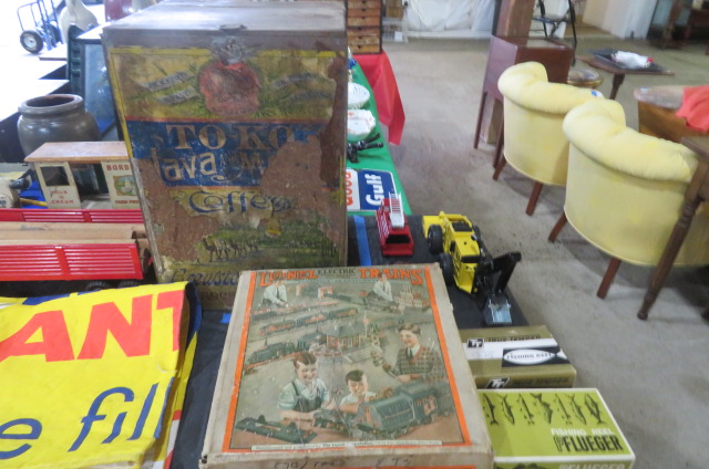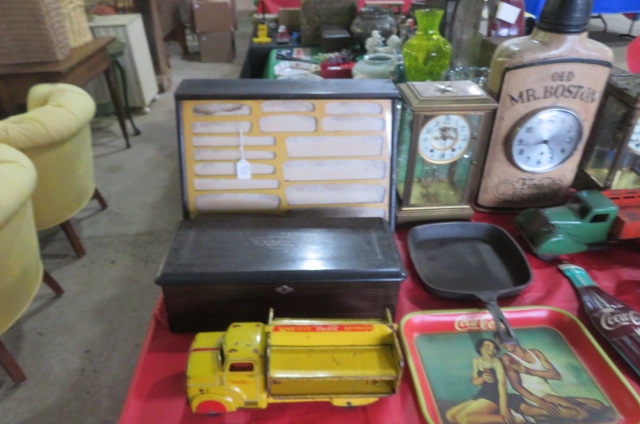 MORE INCL SIGNS & ADVERTISING! Camel cigarettes thermometer; Blue Pepsi-Cola portable cooler; 7-11 No Loitering sign; Royal Crown Cola thermometers; RR Crossing sign; Texaco metal 5 gallon can; Prestone Anti-freeze thermometer; Top Value stamps sign; Briggs & Stratton metal sign; Pepsi-thermometer; OK Chevrolet Used Cars Authorized Dealer sign; Westclox display cabinet; Pflueger Lures box; Ace Combs display; Old Mr. Boston Fine Liquors clock bottle; Coca-cola tray; Wild Turkey pitcher; Good Gulf sign; Lots of good old toys; Toys truck; Military jeep conveyer loader; Matchbox Collector’s cases with cars; Structo Steel Company log hauler; Borden’s Farm Products horse drawn wagon; Early Lionel Trains box; Marbles; Old toy trucks; Chess set; Dolls; Military jeeps; Pocket Watches; Coins & Currency; Silver dollars; Fine jewelry; Medals; Shark teeth; A.P. Donagho stoneware crock; Stoneware jug; Sleigh bells; Square cast iron frying pan; Brass fox doorknocker; Tea caddy; Buddha; Linens; Stereo-viewer; Stone grapes; Bootjack; Old saxophone in case; Acoustic guitars; Electric guitars; Really nice music boxes; Opera glasses; Bell pull; Bookends; Old books; Metal lampshade; Slot machine; Child’s pull wagon; Baskets; Machinist’s chest; Silk flag; Oriental doll; Smoking memorabilia! Collectible lighters! Zippos; Figural; Ronson; MCM; Evans; Art Deco Cigarette holder/lighter combos; Ceramic; Metal; Glass; Pistol shaped; Novelty; Knight; Old electric lighters & more! Collectible ashtrays! Advertising; Hotel & motel; Beer; Glass; Ceramic; Metal; Figural; Depression glass; MCM; Smokeless; Stone & more! Cigar boxes (some contents); Art deco table cigarette box; Prince Albert boxes; Old cigarette packs; Matches; Vintage dispensers; Pipe rests & more!