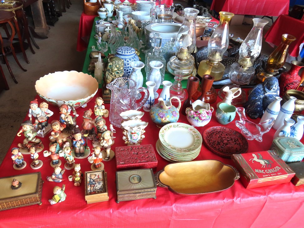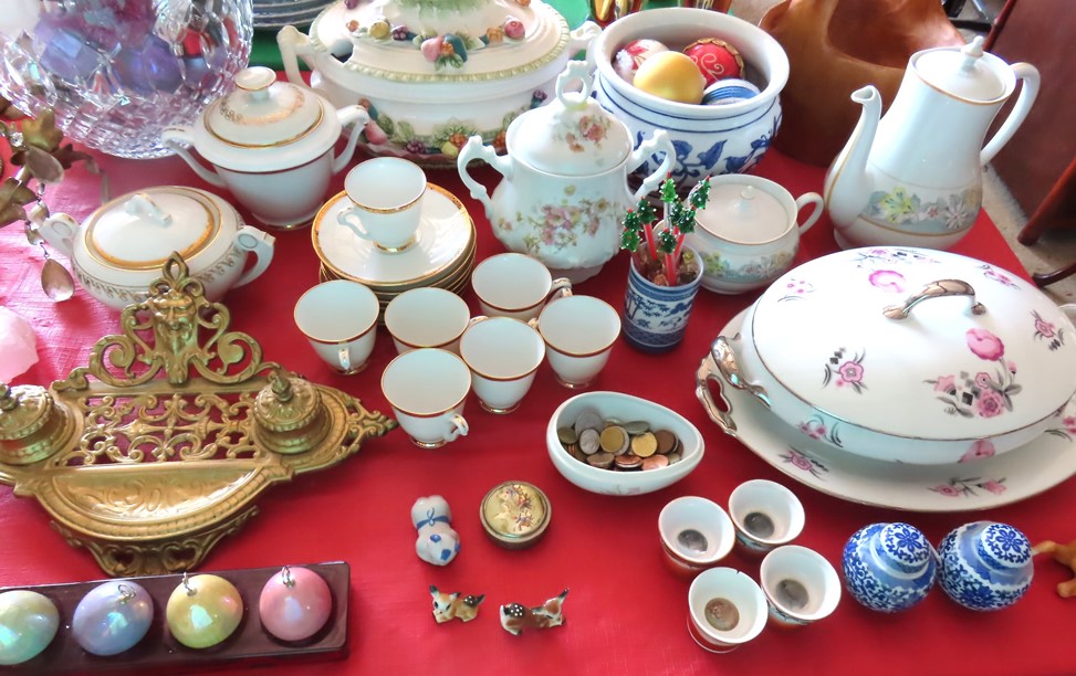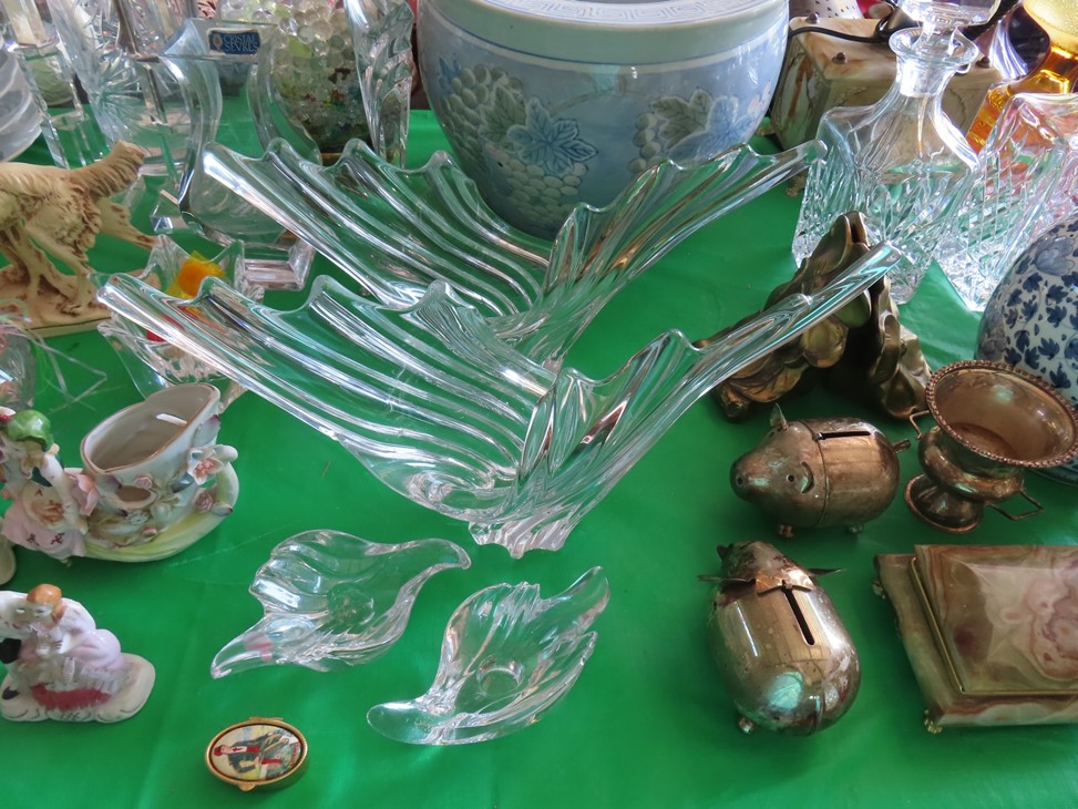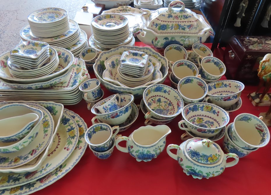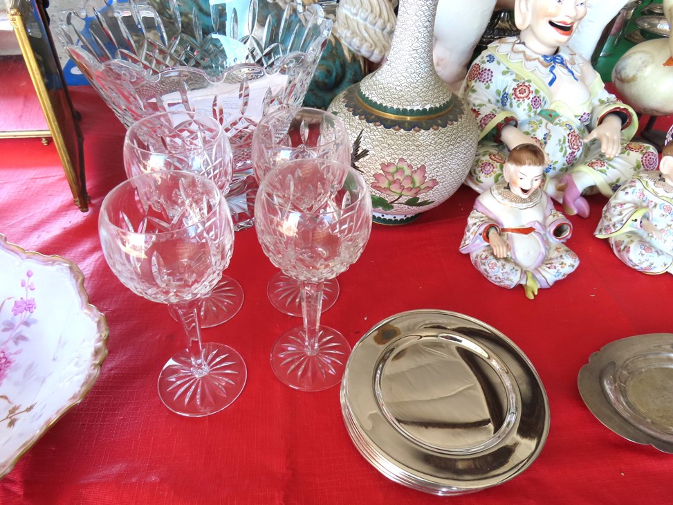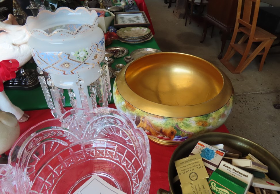 CHINA & GLASS: Large hand-painted Limoges platter with old repair; Large Foo dog; Wonderful pair of Oriental vases with dragons; Tremendous set of Spode Christmas Tree with accessory pieces; Plates set; Coffeepots; Wedgwood box; Staffordshire spaniel; Barrel pitcher & mug; Mason’s Patent Ironstone China “Regency” pattern dinnerware set; More fine china dinnerware; Platters; Tureens; Coffee & tea set; Galerie de France Limoges dinnerware set; Art Deco coffee & tea set; Blue & white umbrella holder; Rose Medallion planter; Trinket box; S&P shakers; Pitcher; Teapots; Blue & white ginger jars; Large blue & white vases; Bowls; Elephant plant stands; Ceramic shoes planters; Fishbowl planter; Hummels; Waterford footed bowls; Waterford goblets; Signed fantasy vase set; Luster; Penguin; Art glass flower bowl; Candlewick candlesticks; Egg box; Paperweights; Tall vase; Decanter set; Pyrex children’s mug; Old bottles; Car candy container; Glass whale; Condiment set in glass holder; Oil lamps; Art glass vases; Cristal Sevres vase; Candlesticks; Flower frog; Decanters; Crystal pitcher; Milk glass ship; Pyrex measuring cup; Goblets; Bowls and more!