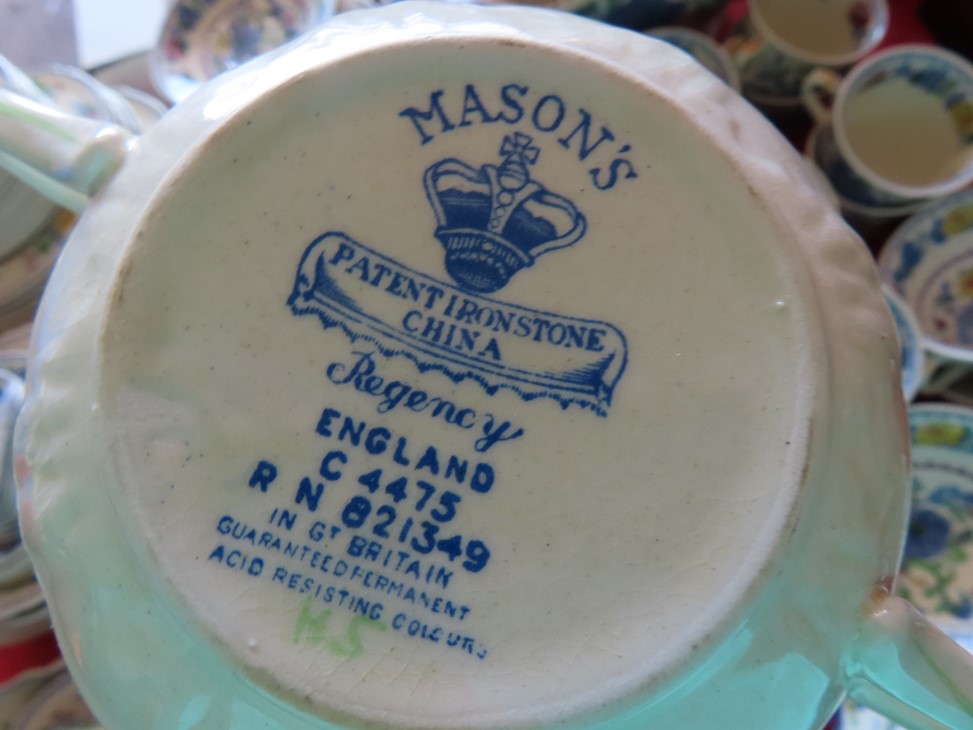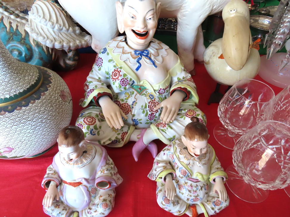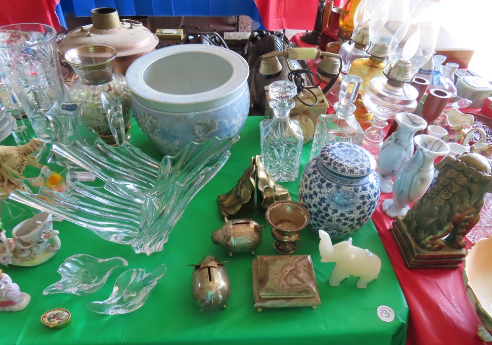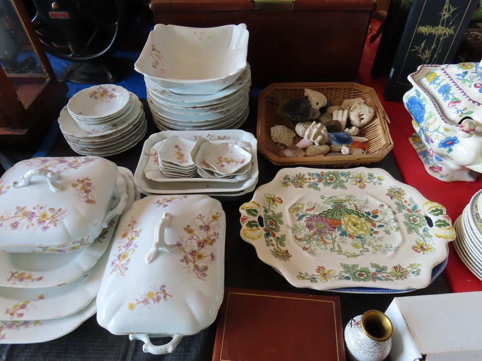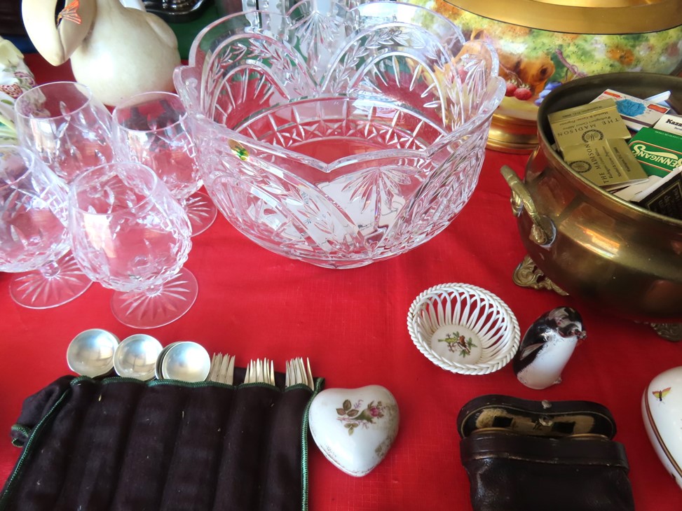 CHINA & GLASS: Large hand-painted Limoges platter with old repair; Large Foo dog; Wonderful pair of Oriental vases with dragons; Tremendous set of Spode Christmas Tree with accessory pieces; Plates set; Coffeepots; Wedgwood box; Staffordshire spaniel; Barrel pitcher & mug; Mason’s Patent Ironstone China “Regency” pattern dinnerware set; More fine china dinnerware; Platters; Tureens; Coffee & tea set; Galerie de France Limoges dinnerware set; Art Deco coffee & tea set; Blue & white umbrella holder; Rose Medallion planter; Trinket box; S&P shakers; Pitcher; Teapots; Blue & white ginger jars; Large blue & white vases; Bowls; Elephant plant stands; Ceramic shoes planters; Fishbowl planter; Hummels; Waterford footed bowls; Waterford goblets; Signed fantasy vase set; Luster; Penguin; Art glass flower bowl; Candlewick candlesticks; Egg box; Paperweights; Tall vase; Decanter set; Pyrex children’s mug; Old bottles; Car candy container; Glass whale; Condiment set in glass holder; Oil lamps; Art glass vases; Cristal Sevres vase; Candlesticks; Flower frog; Decanters; Crystal pitcher; Milk glass ship; Pyrex measuring cup; Goblets; Bowls and more!