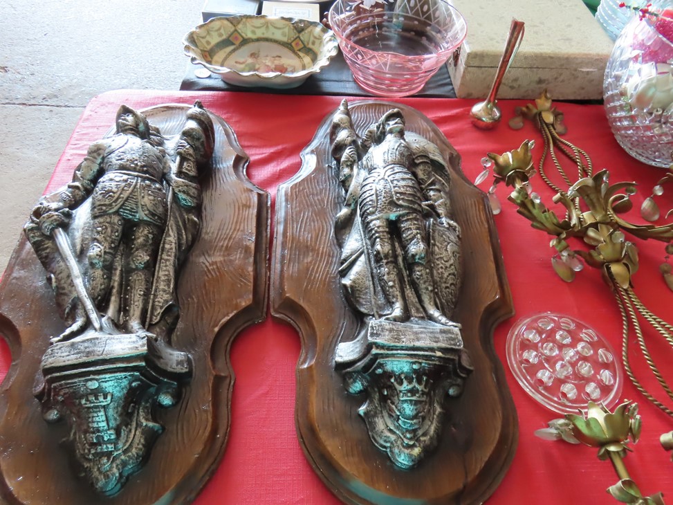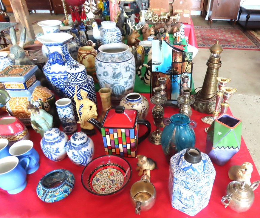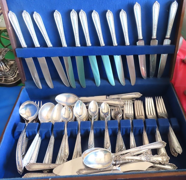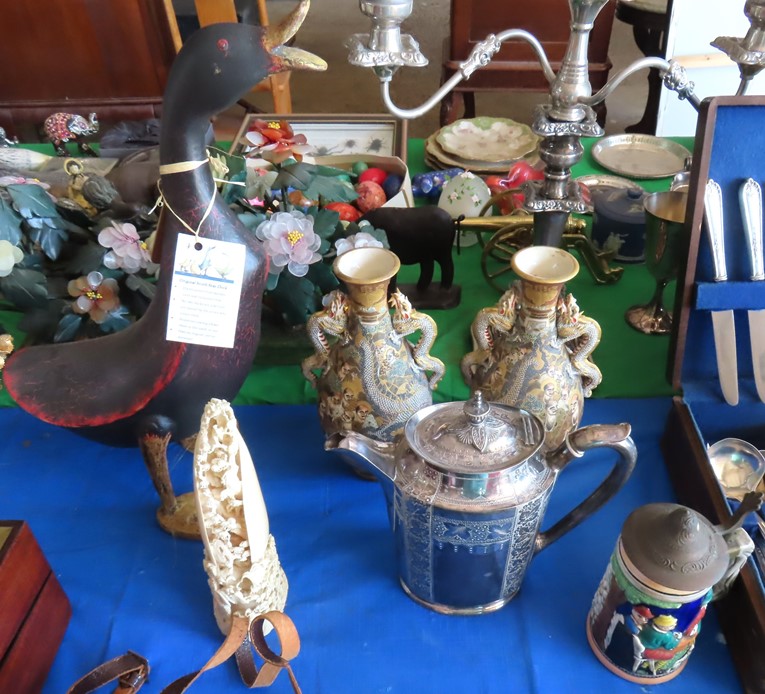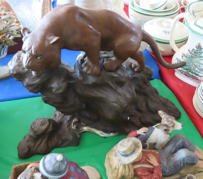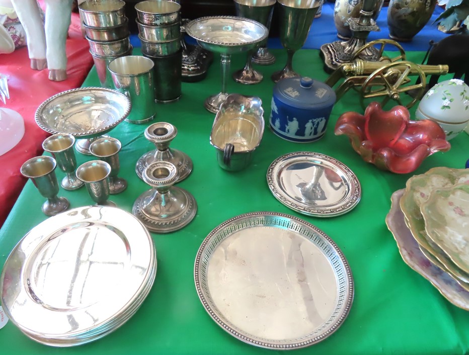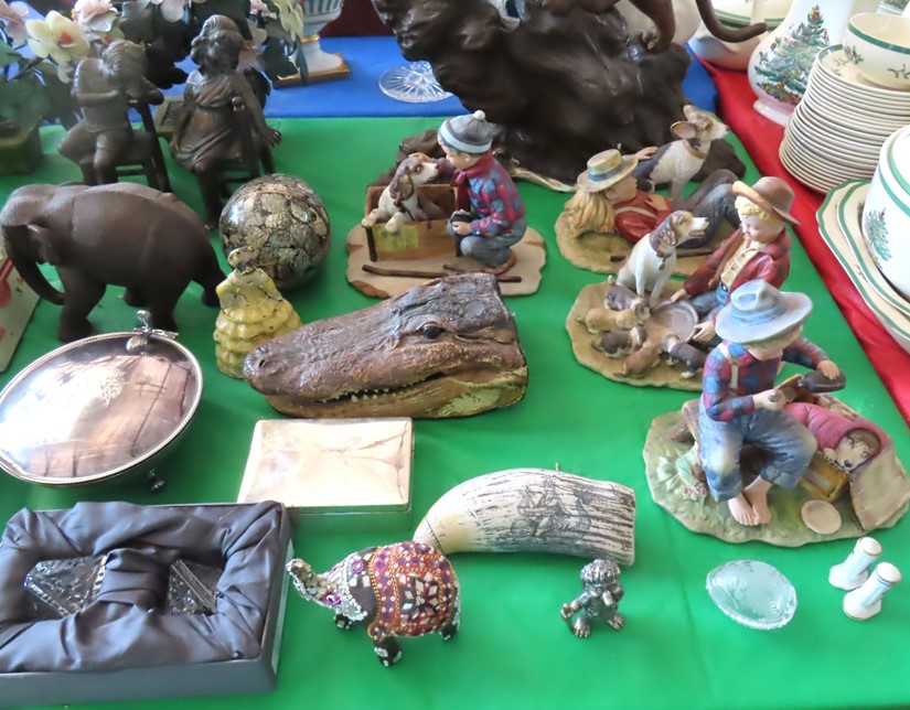 ART & SILVER: Lots of great art! Fine original painting of seaside town; Carved dolphin school wall hanging; Unusual old painting with 3D clock and waterwheel; Impressionist seaside castle; Impressionist scene of women & cattle working a field; Framed glass with Insane Asylum label; Seascape; Leaded glass panel; Still-life; Hunt Print; Floral in oval frame; Forest waterfall; 1984 Los Angeles Olympics Coca-Cola Falg Pins in frame; Stained glass panel of daffodils; Wicker dog statue; Tall Oriental carving; Foo dog; Oriental figurines with waving hands; Wacky pelican figurine; Jade flower arrangements; Metal pig figure; Pair of children on chairs figurines; Marble eggs; Elephant; Papua New Guinea framed insects; More pig figurines; Tragedy/Comedy wall masks; Panther on mountain statue; Tigers statue; Oriental carvings; Terra cotta warrior; Country lad & his dog figurines; Scrimshaw look tooth; Jeweled elephant; Intricately carved mountain scene; Original South Seas Duck statue; Buddhas; Rabbit; Sterling & silver-plate! Sterling flatware sets; Sterling bowls; Sterling Plates; Sterling utensils; Tall Vase; Candelabra pair; Goblet sets; Small vase; Cups; Compote; Candlesticks; Tray; Gravy boat; Crumb catcher; Box; Coffee pot; egg sups in holders; Letter opener; Fancy candlesticks; Sugar & creamer set; Tabletop crumb roller brush; Pig banks; More sterling & silver-plate!
