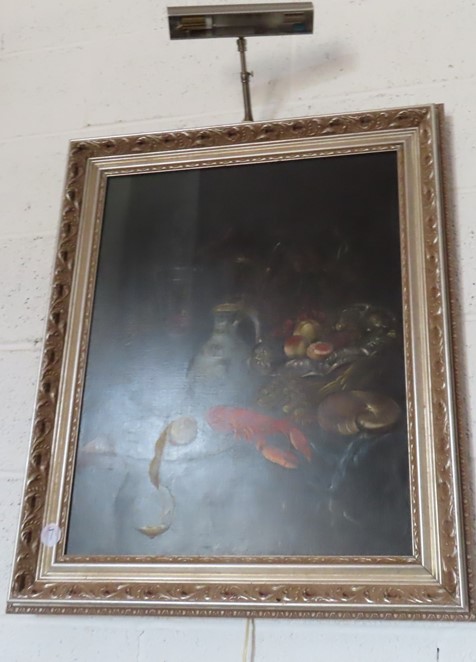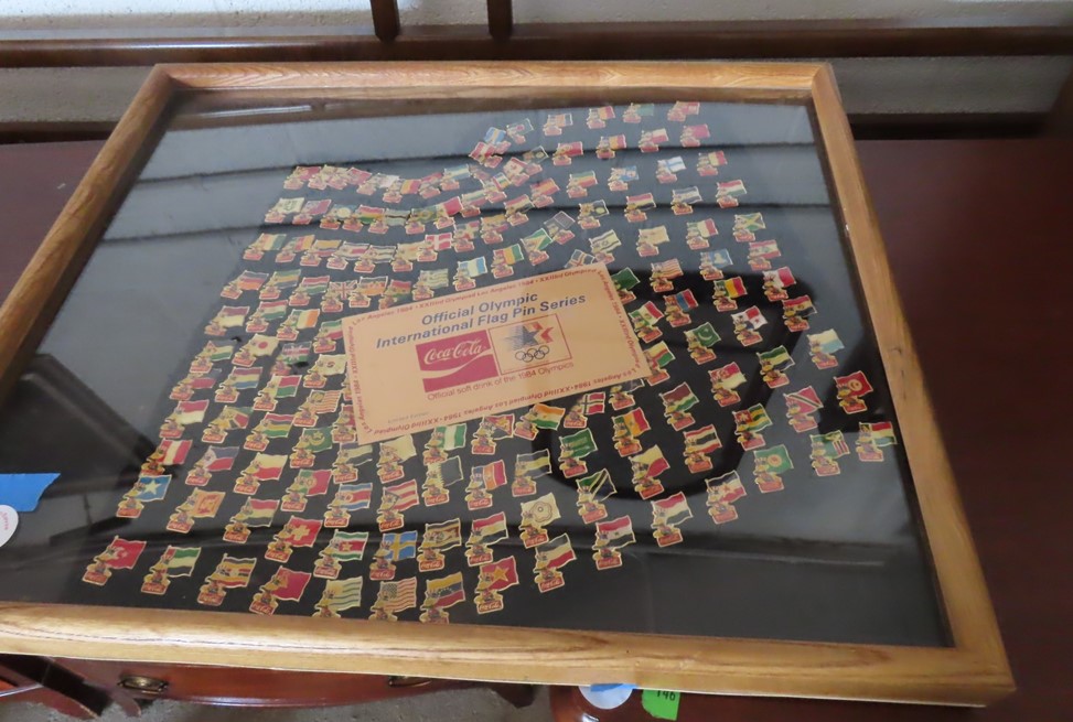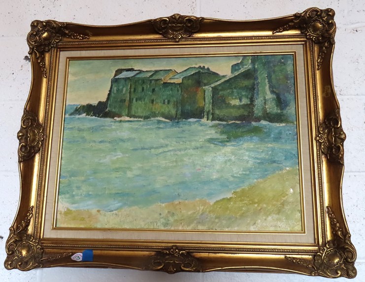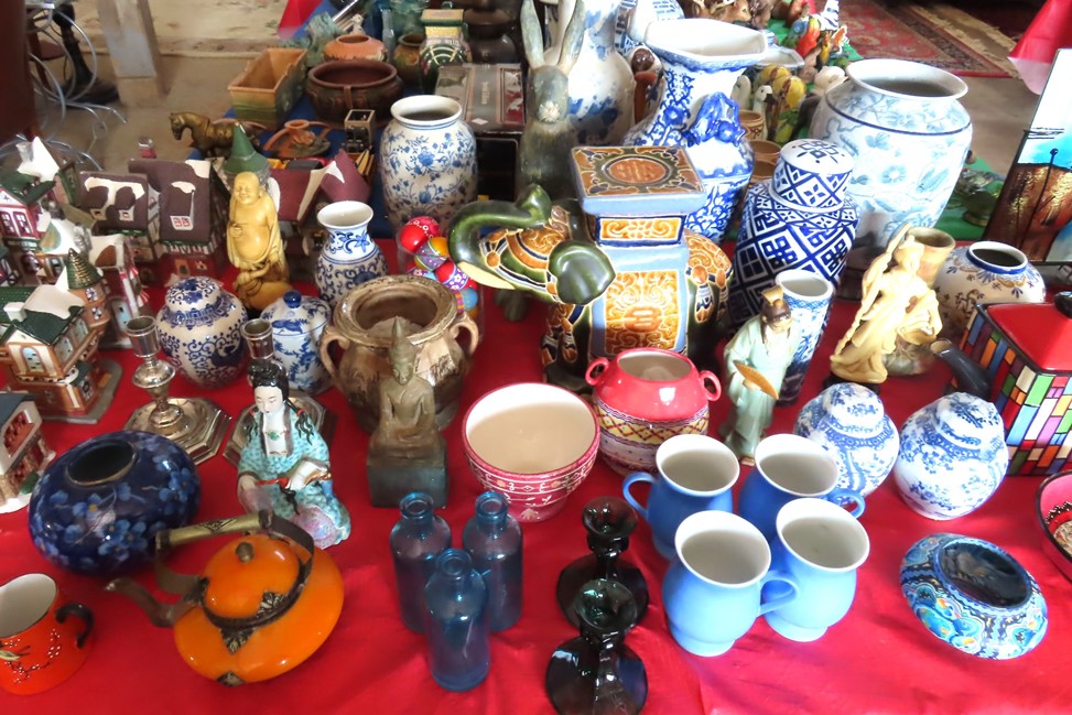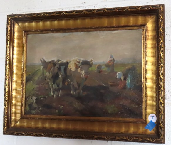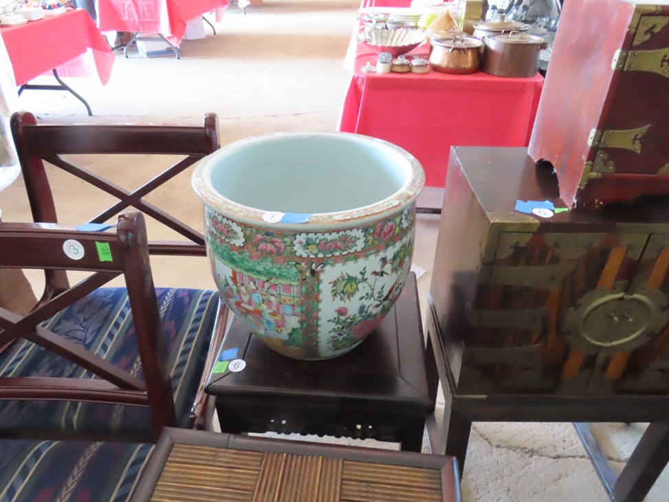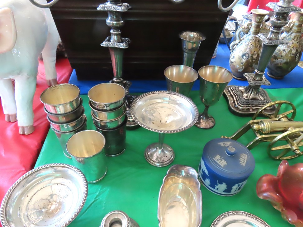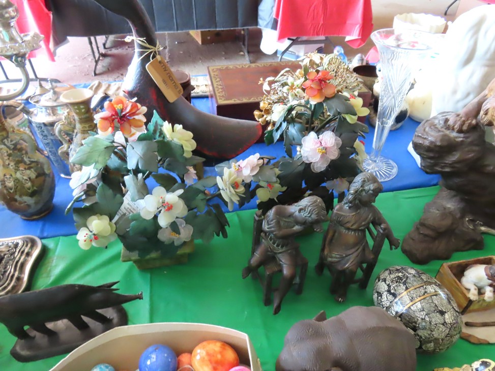 ART & SILVER: Lots of great art! Fine original painting of seaside town; Carved dolphin school wall hanging; Unusual old painting with 3D clock and waterwheel; Impressionist seaside castle; Impressionist scene of women & cattle working a field; Framed glass with Insane Asylum label; Seascape; Leaded glass panel; Still-life; Hunt Print; Floral in oval frame; Forest waterfall; 1984 Los Angeles Olympics Coca-Cola Falg Pins in frame; Stained glass panel of daffodils; Wicker dog statue; Tall Oriental carving; Foo dog; Oriental figurines with waving hands; Wacky pelican figurine; Jade flower arrangements; Metal pig figure; Pair of children on chairs figurines; Marble eggs; Elephant; Papua New Guinea framed insects; More pig figurines; Tragedy/Comedy wall masks; Panther on mountain statue; Tigers statue; Oriental carvings; Terra cotta warrior; Country lad & his dog figurines; Scrimshaw look tooth; Jeweled elephant; Intricately carved mountain scene; Original South Seas Duck statue; Buddhas; Rabbit; Sterling & silver-plate! Sterling flatware sets; Sterling bowls; Sterling Plates; Sterling utensils; Tall Vase; Candelabra pair; Goblet sets; Small vase; Cups; Compote; Candlesticks; Tray; Gravy boat; Crumb catcher; Box; Coffee pot; egg sups in holders; Letter opener; Fancy candlesticks; Sugar & creamer set; Tabletop crumb roller brush; Pig banks; More sterling & silver-plate!