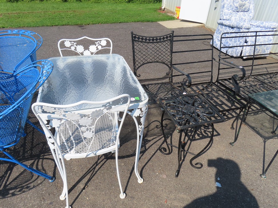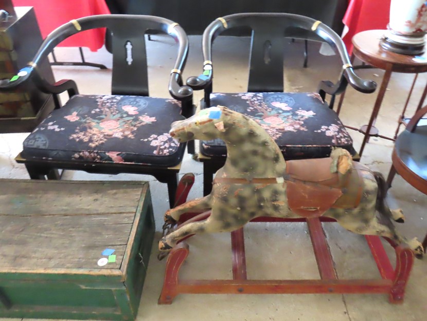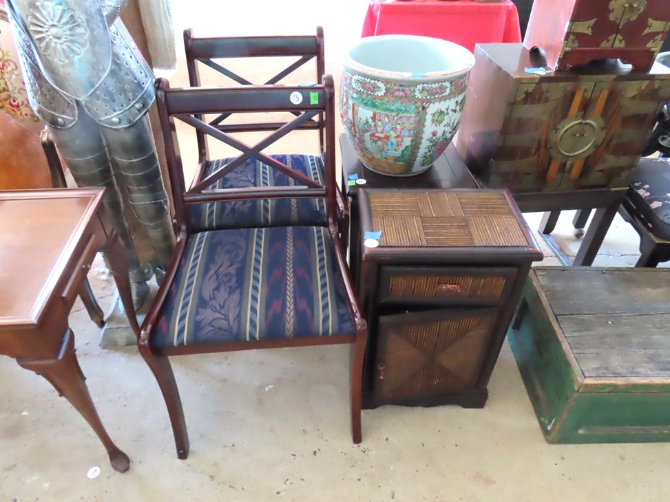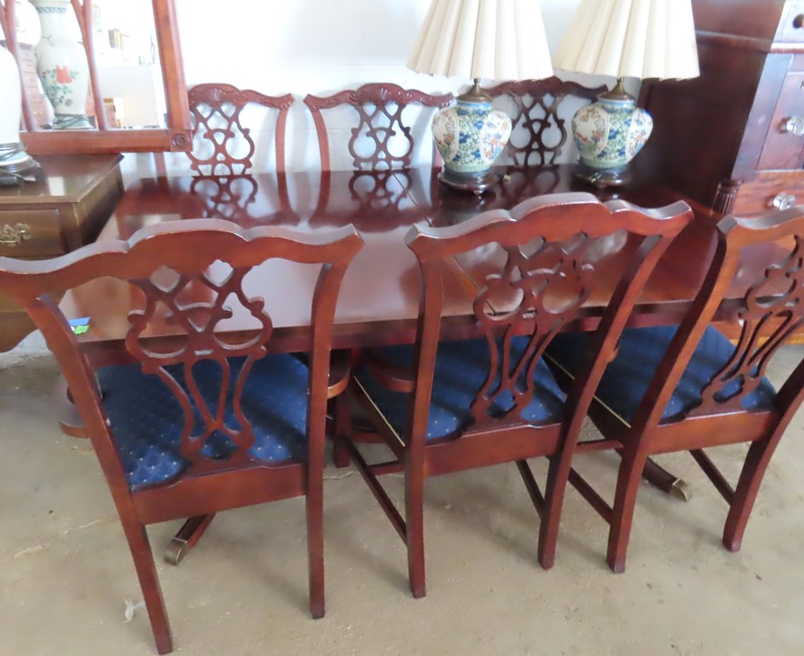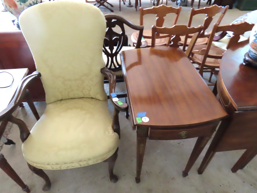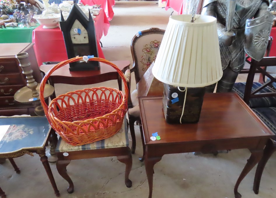 FURNISHINGS: Phenomenal large size stained glass panel; Ornate clock and candelabra set with faun figurines; Henkel Harris serpentine front buffet with string inlay; Henkel Harris mahogany table and 8 chairs; Stunning marble top hall table with scenic medallions and lots of decorative accents; Oriental style sofa table; Set of 6 Baker chairs; Tremendous old secretary with glass door bookcase top; Step-back buffet; Leather chair with shaped ottoman; Wonderful round side table with brass detailing and medallions; Wonderful MCM credenza; Mid-century Modern chest of drawers (pair); Great old step-back open hutch with old paint; Vanity; Empire hall table with mirror back shelf; 4 drawer chest; Ethan Allen sideboard; Corner etagere’; Step-back Oriental motif china cabinet; Nice pair of leather chairs with nail-head trim and footstools; Kidney desk; Circular desk with gateleg extensions; Carved trunk; Old wooden bench; Drop side sewing table; Glass display case with top opening; Bullseye mirror with eagle topper; Aaron Willard, Boston Grandfather clock; Good old chest of drawers with glove boxes; Marble top dresser with carved pulls; Butcher block; Chest on chest by Century Furniture; Decorative stepstool/plant stand; Dining table with 6 chairs; Armchair; Drop-side end table with Belleflower inlay; Marble top table; Footstool; Small chest; Needlepoint chair; Queen Anne footstool and end table; Wooden box with old green paint; Pair of Oriental chairs; Sconce pairs; Two tier table; Inlaid stands; Old 3 drawer chest; Headboard; Nightstands; Lowboy with ball & claw feet; Nice pair of tan leather club chairs with nail-head trim; Metal floor lamps; Old wooden folding seat set; End table; Oval banded edge coffee table; Fern stand; Corner chairs; Blanket box; Ceramic umbrella holder; Silver chest; two tier table with beaded edge; Small cabinets; Small table with brass railing; Rotating display cabinet; Gaming table; Child’s chair with needlepoint seat; Tile top nesting side tables; Children’s seat; Small table with pie crust edge; Gilt framed oval mirror with floral detail; Arched mirror; Nice pair of Oriental ceramic table lamps; Oriental vase lamp; Stand ashtrays; Umbrella holder; Room screen; Library chair/stepstool; Table with needlepoint top under glass; Trunk; Coffee table; Clocks; Small tables; Basket; Decorative suit of armor; Dining chair pair; Oriental cabinets with brass; Floor lamps; Old medical sterilizer cabinet; Stained glass panels; Floor globe; Good Oriental rugs and carpets; Fine round mirror with eagle topper; Gold framed wall mirror; Apothecary chest; Triple section brass framed wall mirror; Leaded glass shade palm tree lamp; Mirror in old window frame; More nice mirrors; Ginger jar lamp; Lots more nice lamps; Mantel clock; brass ribbon sconces; Cherub wall candleholder; Decorator accents; Old wall lantern pair; Outdoor furniture and much more!