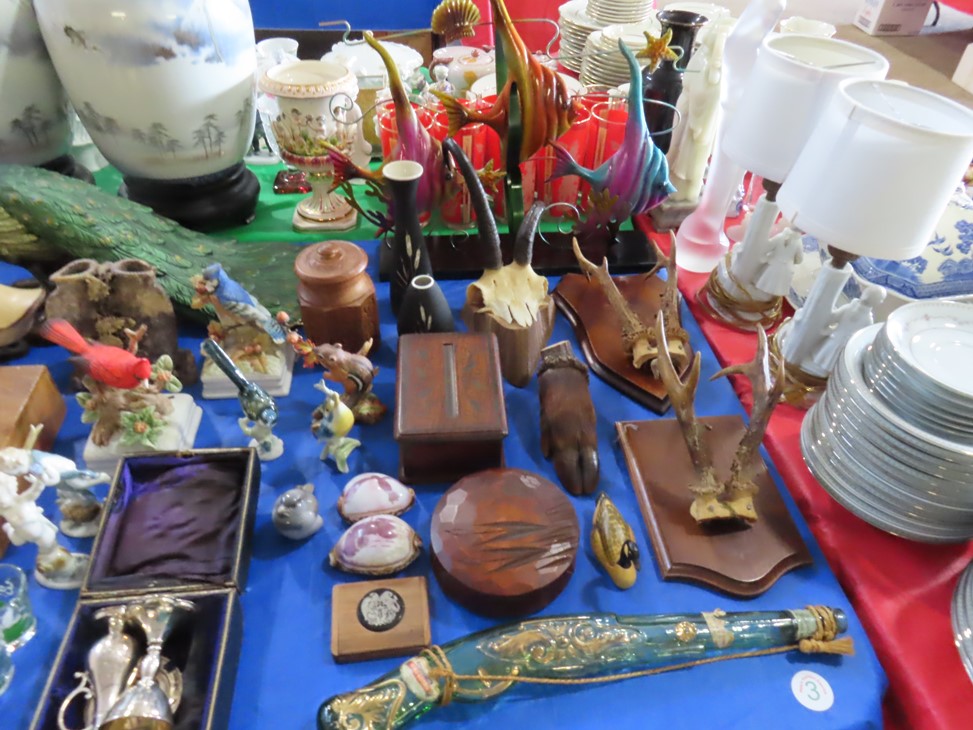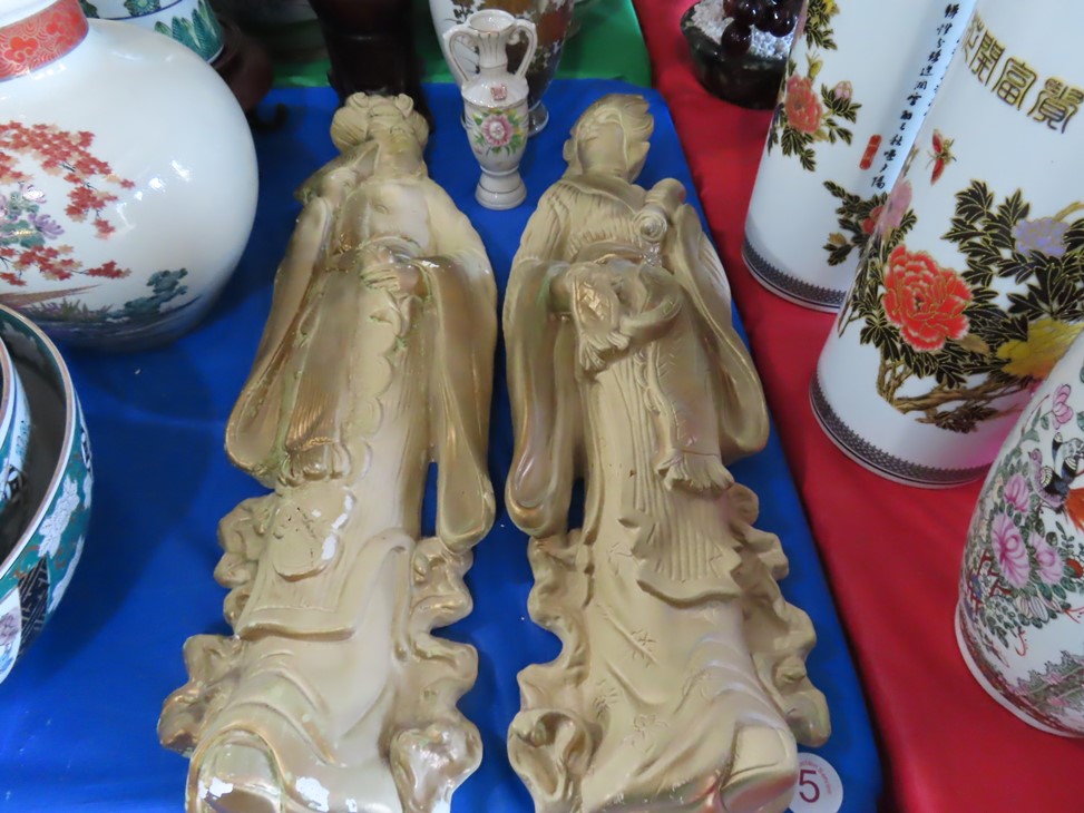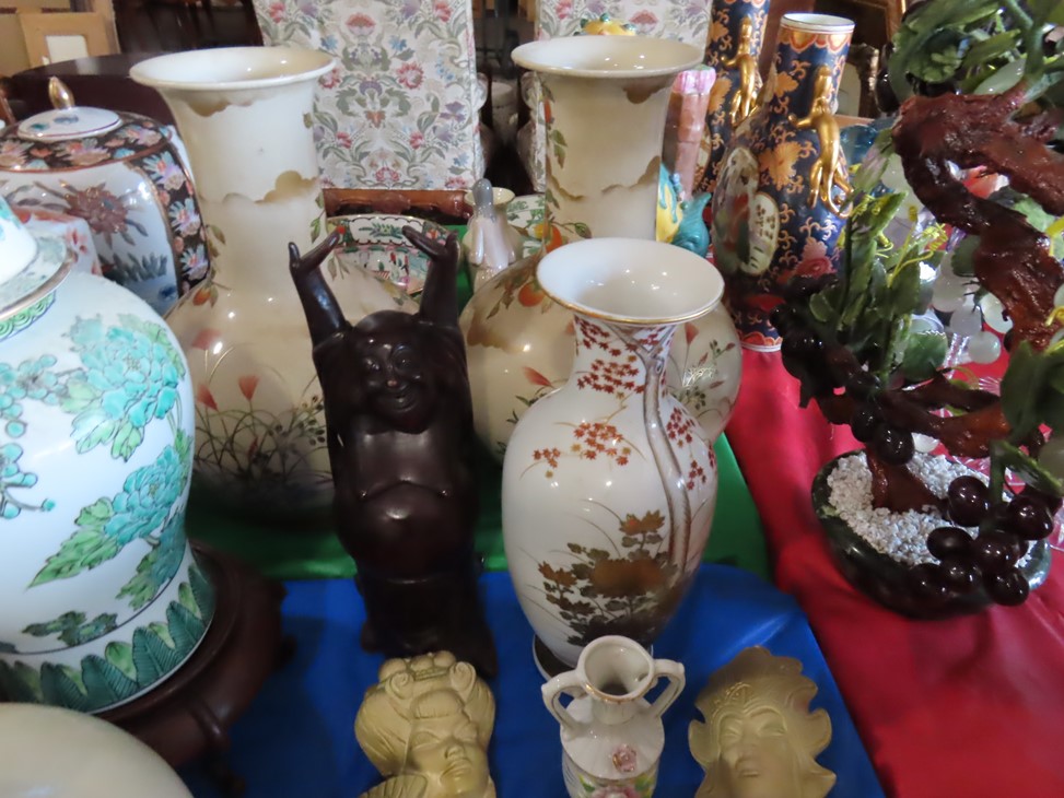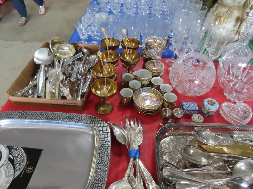 ART & SILVER: Lots of great art! Porcelain medallion plaque with large central medallion; Floral still-life; Fine landscapes; Woman in flower field; Still-life with fruit; Still-life with oranges; Nicely done cottage & river crossing painting; Large pair of Oriental man & woman wall plaques; Buddhas; Water buffalo carving; Tabletop size kneeling goddess; Horse figure; Oriental statues; Fighting cocks; Peacock set; Ducks; set; Bird figurines; Angel fish sculpture; Lots of white figurine sets; Stained glass panel; Painting of Venice; More fine original art-Could be sleepers here!; Sterling & silver-plate! Flatware; Silver rim coasters; Trays; Dresser set; Teapot; Serving dishes; Shakers; Spoons; Letter holder; Candlesticks; Butter knife set; Serving platter with dolphin; Goblets; Ice bucket; Serving utensil set and much more!