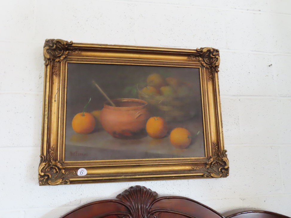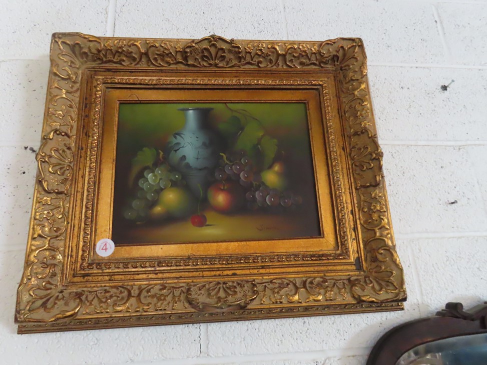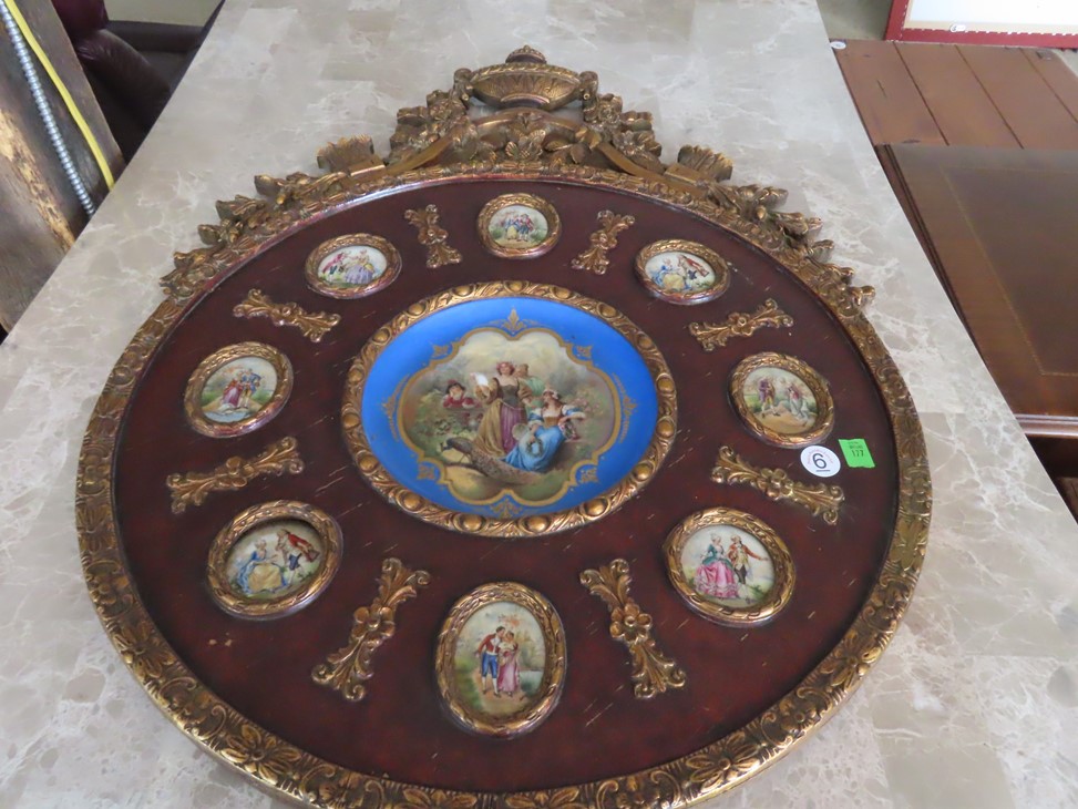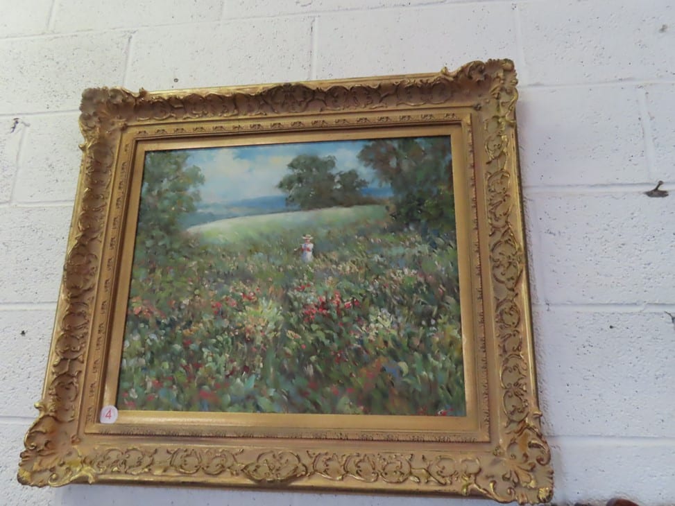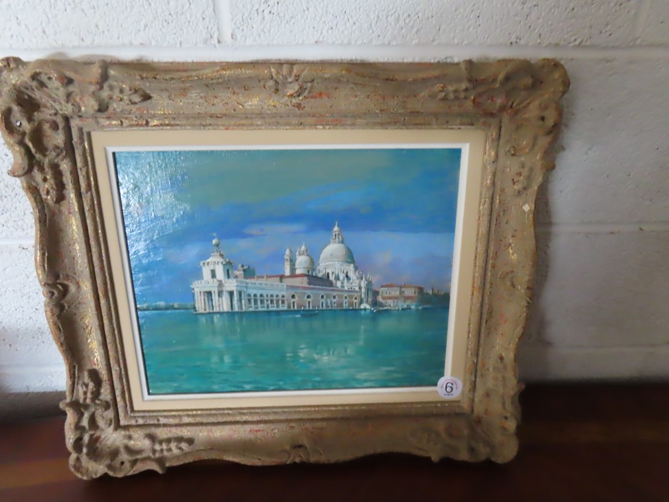 ART & SILVER: Lots of great art! Porcelain medallion plaque with large central medallion; Floral still-life; Fine landscapes; Woman in flower field; Still-life with fruit; Still-life with oranges; Nicely done cottage & river crossing painting; Large pair of Oriental man & woman wall plaques; Buddhas; Water buffalo carving; Tabletop size kneeling goddess; Horse figure; Oriental statues; Fighting cocks; Peacock set; Ducks; set; Bird figurines; Angel fish sculpture; Lots of white figurine sets; Stained glass panel; Painting of Venice; More fine original art-Could be sleepers here!; Sterling & silver-plate! Flatware; Silver rim coasters; Trays; Dresser set; Teapot; Serving dishes; Shakers; Spoons; Letter holder; Candlesticks; Butter knife set; Serving platter with dolphin; Goblets; Ice bucket; Serving utensil set and much more!