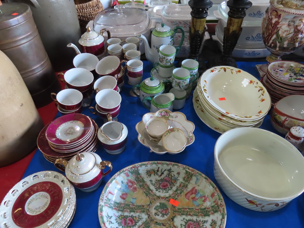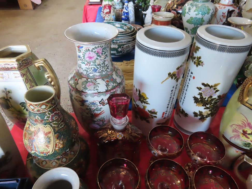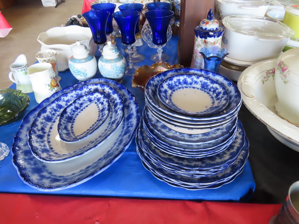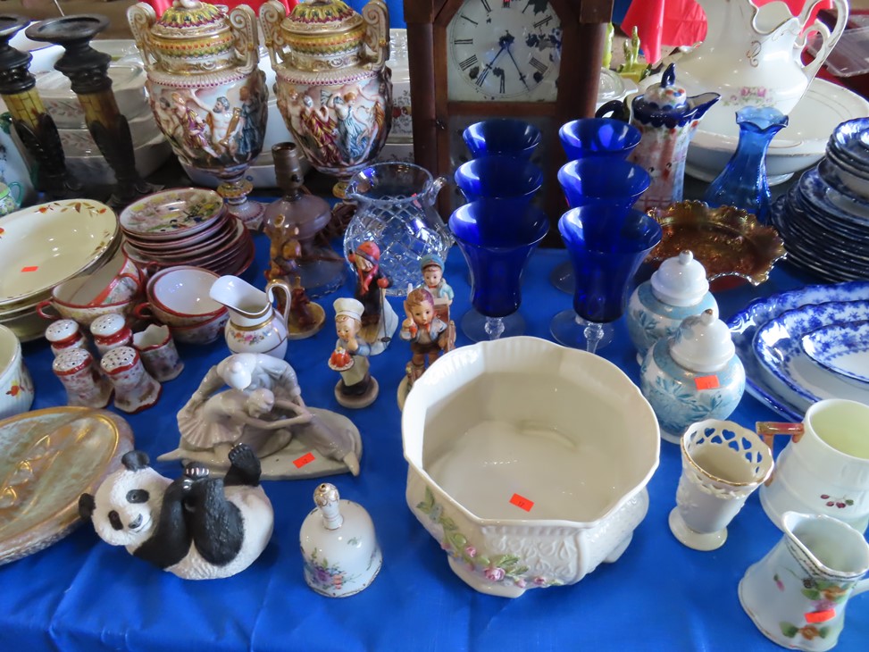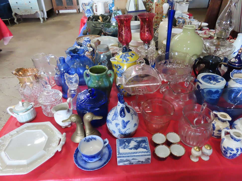 CHINA & GLASS: Flow blue dinnerware & platters; Blue & white planter; Lidded jars with loops decorations; Fishbowl planter; Chinese medallion large vase; Blanc de chine figures; Lladró figurines; Pair of Chinese motif vases; Japanese luster ware china; Teapots; Rose Medallion plate; Vases in boxes; Lots & lots of Oriental vases; Moriage vases; Butterfly decorated saucers; Lidded ginger jars; Oriental figurines; Biscuit jar; Tea set; Set of bowls; Rose medallion lidded jar; Bennington glaze pitcher; Hull swan set; Washbowl & pitcher (7 piece set); Chocolate pot; Hummels; Pair of urns; Lenox; Tea & Coffee sets; Hall Autumn leaf bowls; Nut bowl set; Cream pitchers; Geisha girl tea set & shakers; MCM ashtray; Sugar & creamer; Leaf dish; Ceramic lamps; Candlesticks; Lots of blue & white pieces; Carpet balls; Lots of pitchers; Fine dinnerware sets; Howdy Doody cookie jar; Trinket boxes; Napkin rings; Garden seats; Tureens; Cups & saucers; Blue Willow; Toby mugs; Royal Doulton; Egg cups; Wall pocket; Colored cut to clear goblet set; Carnival glass footed bowl; Carnival glass candy jar, Carnival glass bowl; More carnival glass; Etched glass vase; Ruffled opalescent edge bowl; Art glass bowl; Enameled ruby flashed goblets & decanter; Glass flower arrangement; Corning ware casseroles; Pyrex casseroles & refrigerator dishes; Pyrex mixing bowl sets; Cobalt glass; Blue goblets on clear stems; Crystal vase; Green depression glass; Ice bucket; Glass pitchers; Footed bowl; Candy dish; Candlesticks; Lustres; Crystal locomotive; Crystal animals; Crystal stemware sets; Blue goblets; Footed square cake stand; Candy dishes; Bowls; Butter dish with lid; Marmalade jar; Rose bowls; Vases; Candlewick; Heart shaped dishes; Shakers; MCM glasses; Decanters; New jadeite; Condiment set in holder; Egg dish and more!