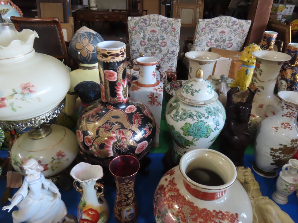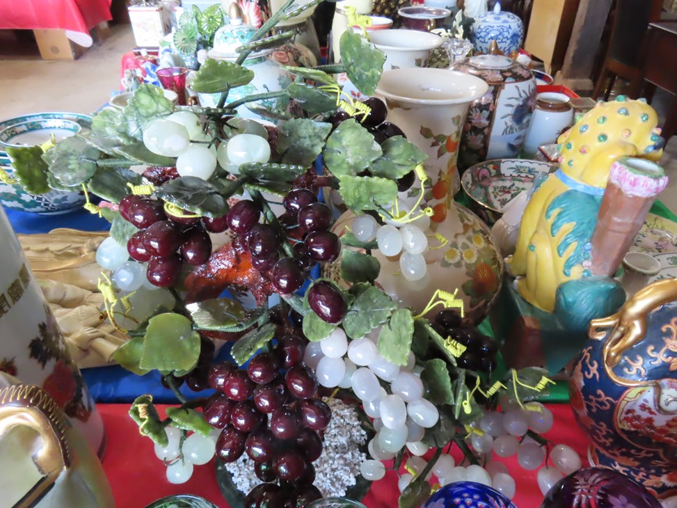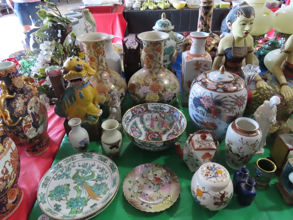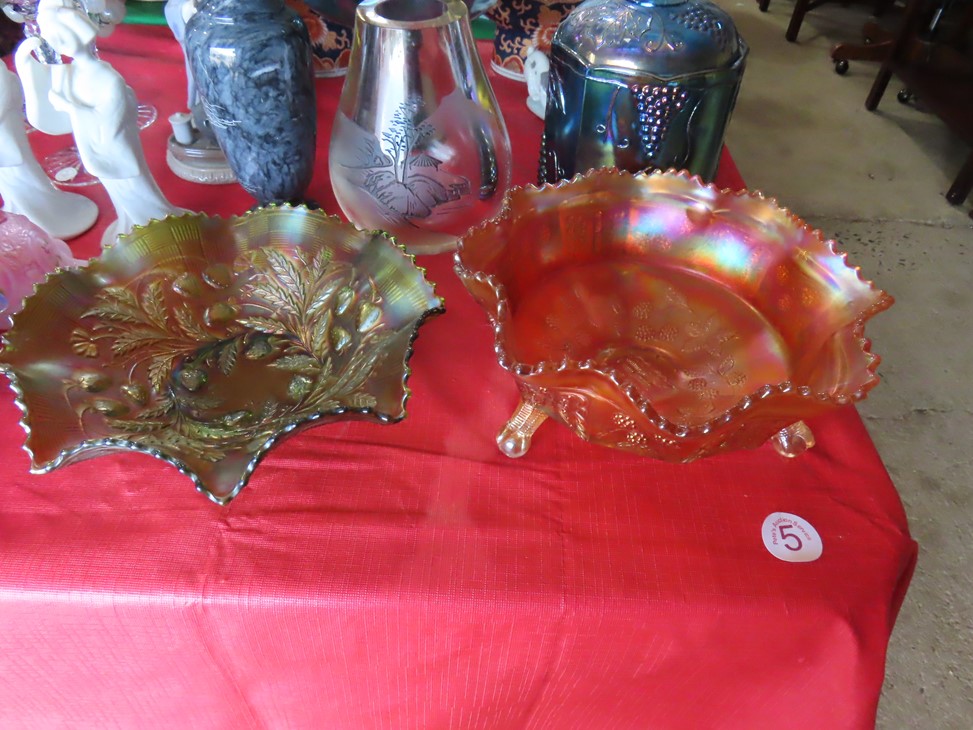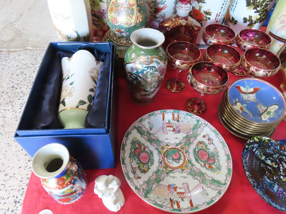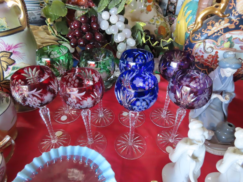 CHINA & GLASS: Flow blue dinnerware & platters; Blue & white planter; Lidded jars with loops decorations; Fishbowl planter; Chinese medallion large vase; Blanc de chine figures; Lladró figurines; Pair of Chinese motif vases; Japanese luster ware china; Teapots; Rose Medallion plate; Vases in boxes; Lots & lots of Oriental vases; Moriage vases; Butterfly decorated saucers; Lidded ginger jars; Oriental figurines; Biscuit jar; Tea set; Set of bowls; Rose medallion lidded jar; Bennington glaze pitcher; Hull swan set; Washbowl & pitcher (7 piece set); Chocolate pot; Hummels; Pair of urns; Lenox; Tea & Coffee sets; Hall Autumn leaf bowls; Nut bowl set; Cream pitchers; Geisha girl tea set & shakers; MCM ashtray; Sugar & creamer; Leaf dish; Ceramic lamps; Candlesticks; Lots of blue & white pieces; Carpet balls; Lots of pitchers; Fine dinnerware sets; Howdy Doody cookie jar; Trinket boxes; Napkin rings; Garden seats; Tureens; Cups & saucers; Blue Willow; Toby mugs; Royal Doulton; Egg cups; Wall pocket; Colored cut to clear goblet set; Carnival glass footed bowl; Carnival glass candy jar, Carnival glass bowl; More carnival glass; Etched glass vase; Ruffled opalescent edge bowl; Art glass bowl; Enameled ruby flashed goblets & decanter; Glass flower arrangement; Corning ware casseroles; Pyrex casseroles & refrigerator dishes; Pyrex mixing bowl sets; Cobalt glass; Blue goblets on clear stems; Crystal vase; Green depression glass; Ice bucket; Glass pitchers; Footed bowl; Candy dish; Candlesticks; Lustres; Crystal locomotive; Crystal animals; Crystal stemware sets; Blue goblets; Footed square cake stand; Candy dishes; Bowls; Butter dish with lid; Marmalade jar; Rose bowls; Vases; Candlewick; Heart shaped dishes; Shakers; MCM glasses; Decanters; New jadeite; Condiment set in holder; Egg dish and more!