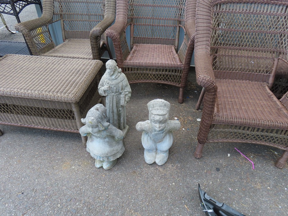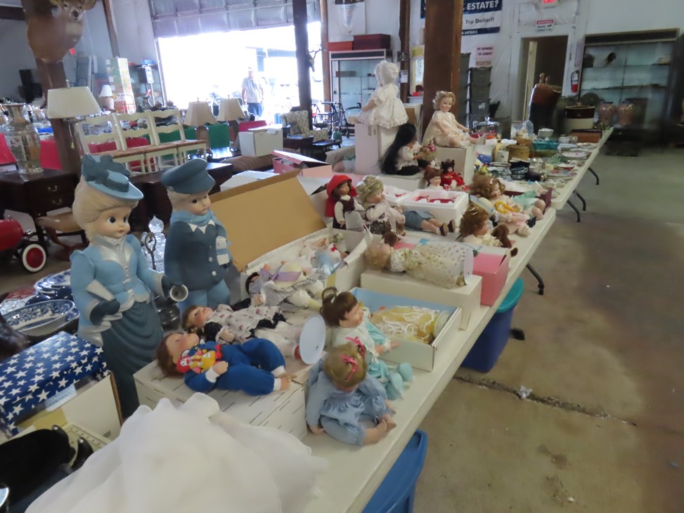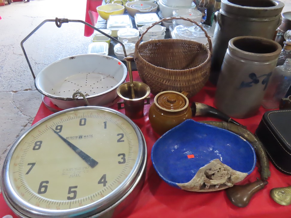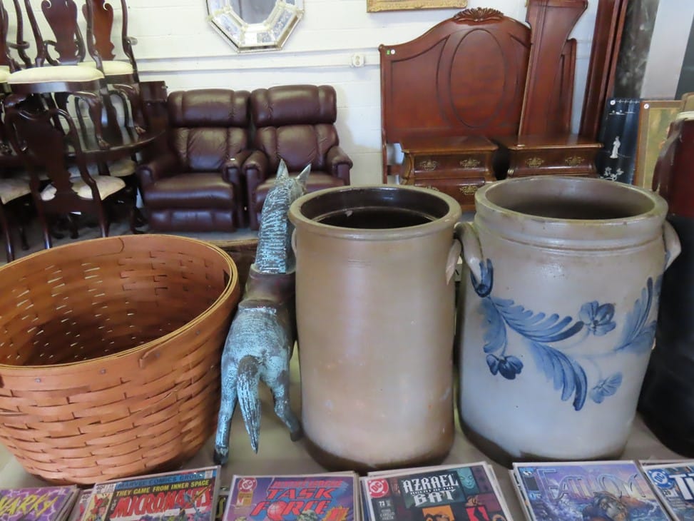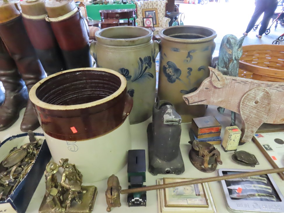 MORE: Old pedal car; Ship model; Child’s dog pull sulky; Sword; Whitetail skull mounts; Whitetail head mount; More mounts; Comic books (X-men, Titans, Brotherhood, Robin II, Azarel & more); Sets of Riding boots; Horse weathervane topper; Wooden pig cut-out (jointed); Door knocker; Pocket knives; Belt buckles; Bookends; Still banks; Brass rocking horse; Old child’s push toy; Nesting dolls; Toy cars & trucks; Collectible dolls; Barbie dolls; Pincushion head doll; Large copper kettle with handles; Copper ham boiler; Cast iron skillets; Cast iron frying pan with lid; Wooden churns; Stone grapes statue; Fine old basket; Brass mortar & pestle sets; Old scales with enamelware pan; Lots of Corning ware & Pyrex; Longaberger baskets; Marble rolling pin; Flatware sets; More old frying pans; Marble cheese plate; Pickle jars; Kitchen-Aid bowl lift mixer; Stoneware crock with blue flower; Larger crock; Crock with ‘2’; Handled crock with blue; More crocks; Old bottles; Shaped bottles; Powder horn; Powder flask; Milk bottle; Glass bank with metal lid; Glass owl bank; More glass banks; Foo dogs; Seashells; Old cameras & accessories; Wood boxes; Glass & brass inkwell; Fine & costume jewelry; Old coins & currency; Old Royal Crown Cola bottle; Wood & metal delivery crate; Washtub; Teak patio table & chairs; Car ramps; Dachshund boot scrapers; Garden statues; Poolside seating sets; St Francis statue; Outdoor grill; Cast iron garden seats; Metal garden bench with grapes; Patio table & chairs; John Deere LX172 riding mower; Set of wheels; Kayaks & canoe; Push mower; Spreader; Bicycles; Radio flyer red wagon with wooden sides; Cooler; Saw horses; Rolling tool chest with contents; Landworks chipper; Drain snake; Wilderness kayak & much More!