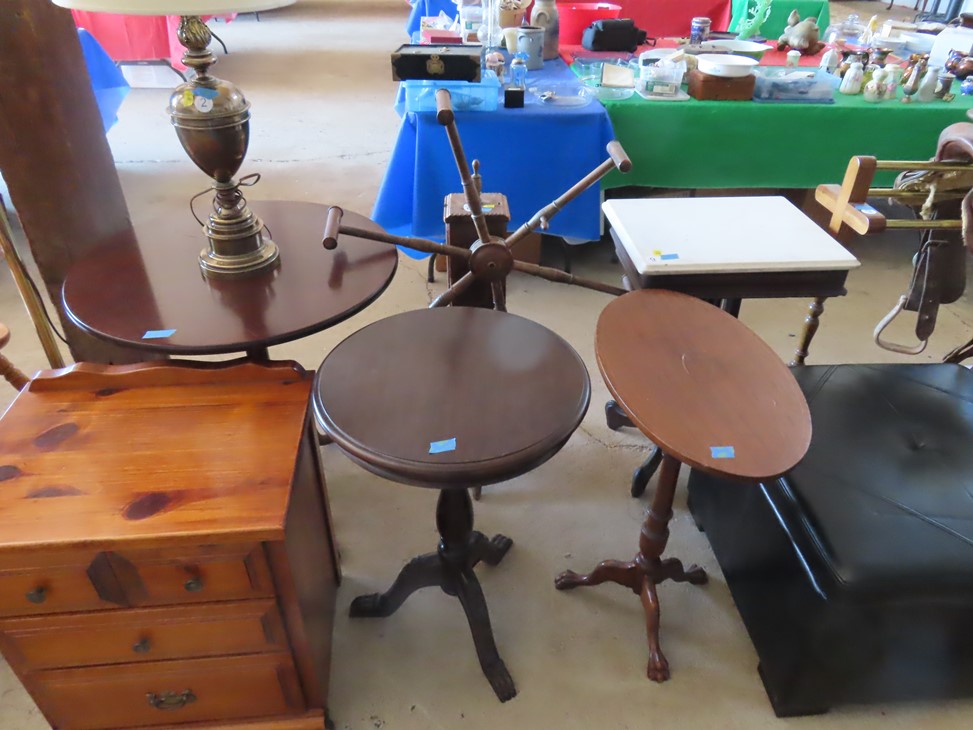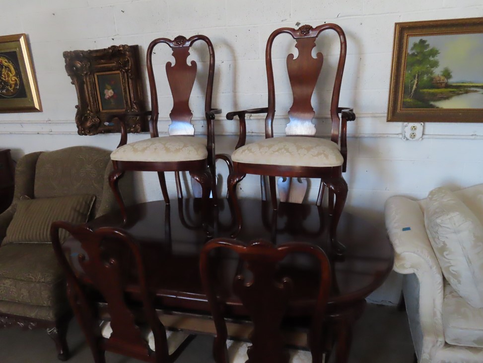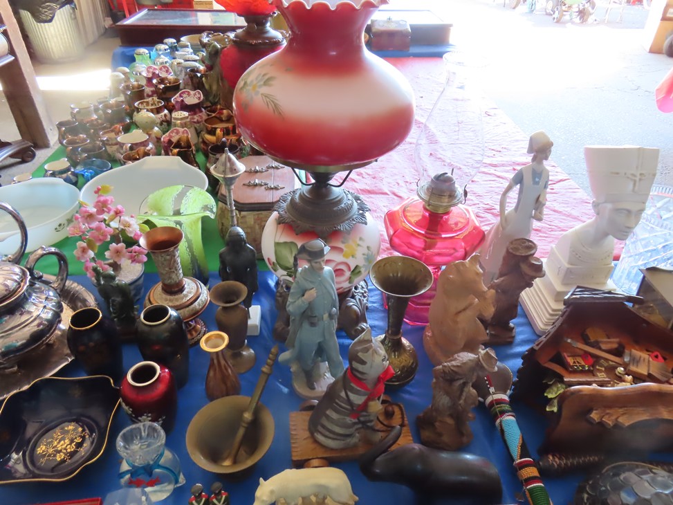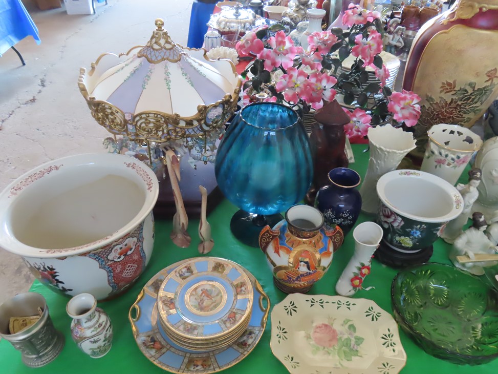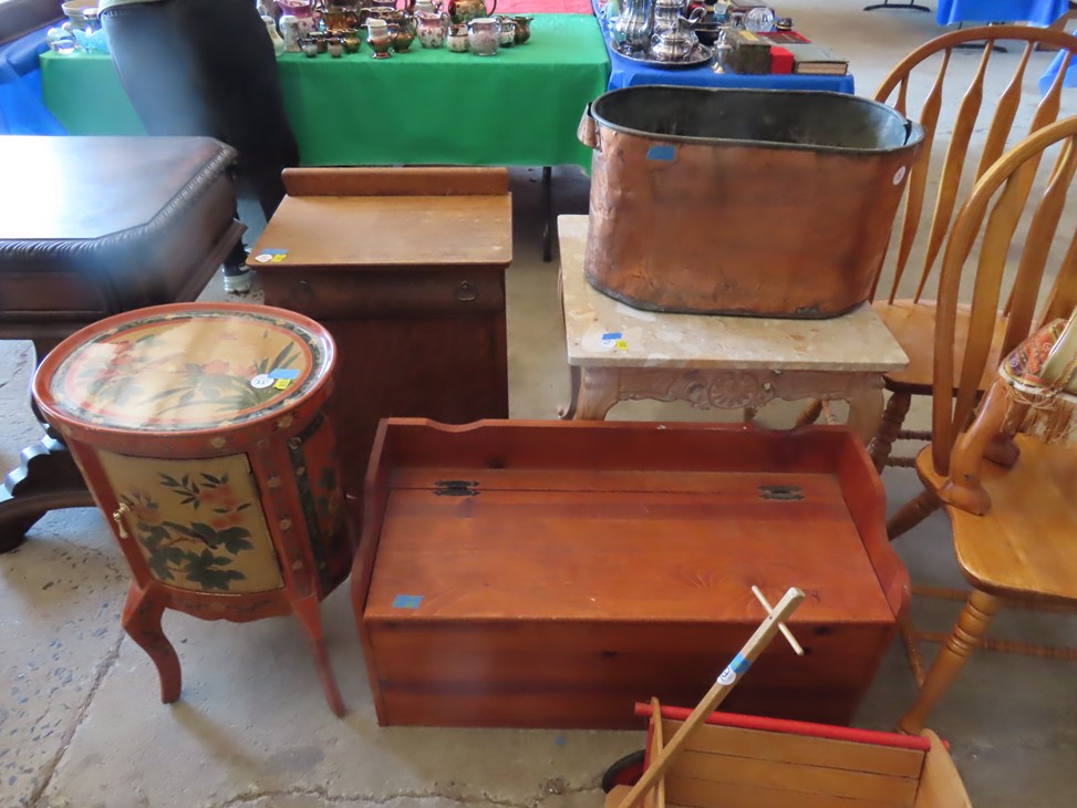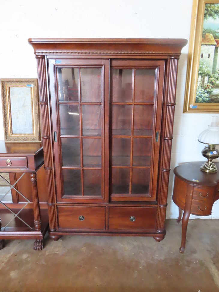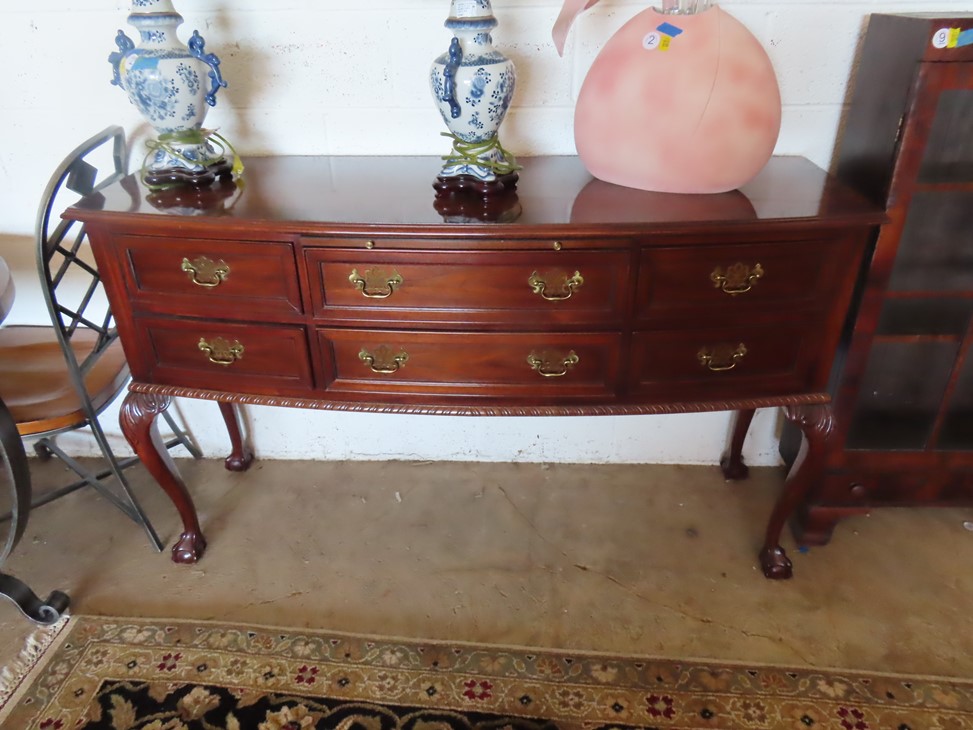 FURNISHINGS: Wonderful 8 pane sliding glass door bookcase with bun feet, broken reeded columns & more details; Striking hall table with paw feet, mirror back lower shelf and metal embellishments; Fine old 6 pane glass door bookcase; Bowfront 6 drawer buffet with cabriole legs; Modern dinette set with metal, wood and tile top table, 4 chairs; Industrial design high top table and 2 stools; Broken arch high boy with final; Good old lift top desk; Flip top table/settee; Another nice corner display cabinet; Serpentine front 8 drawer dresser; Double leg dining table with bench and chairs; Oak cabinet; MCM armchairs with red upholstery; 3 drawer chest with wooden leaf pulls & double glove boxes; Grandfather clock with visible pendulums; Large dining table with leaves and 8 chairs; Server with distressed paint finish; Corner curio cabinet with broken arch & filigree details; Dining table with 6 chairs; Glass shelf curio cabinet; Chest on chest tall dresser; 9 drawer chest; Corner cabinet with leather look panels; Oval dining table with 6 chairs; Fireside cabinet; Large wall mirror; Marble top coffee table with distressed paint base; Oriental trunk; Firkin on stand; Rush seat bench; Marble & metal side tables; Child’s rocking chair; Plant stand with marble top; Display cabinet; Good old small trunk; Pair of nightstands; Crystal & brass table lamps; Dresser with mirror; Parlor lamp; Turtle lamp; Leather sofa and chair with carved wooden frames; Nice pair of pedestal end tables with leather tops; Pair of white distressed surface nightstands; Lingerie chest; Toy chest; Small washstand; decorated oval cabinet; Camel statue with saddle; Set of 4 dining chairs; Floor lamps; Pedestal side table; Pair of bar seats; Hope chest; Pair of stools; Flower shaped table; Room screen; Red leather love seat; Lots of really nice table lamps; Quilt rack; Oval side table; Small chest; Marble top table; Leatherlike ottoman; Blanket box; Half round table; Several nice single chairs; Fine Oriental rugs and carpets; Pair of marble base lamps; Decorative flower arrangement in pink vase; Blue & white Chinoiserie table lamp pair; Brass table lamps; Camel saddle; Cane back office chair; Apothecary tabletop cabinet; Statue with clock; Several nice patio furniture sets and more!