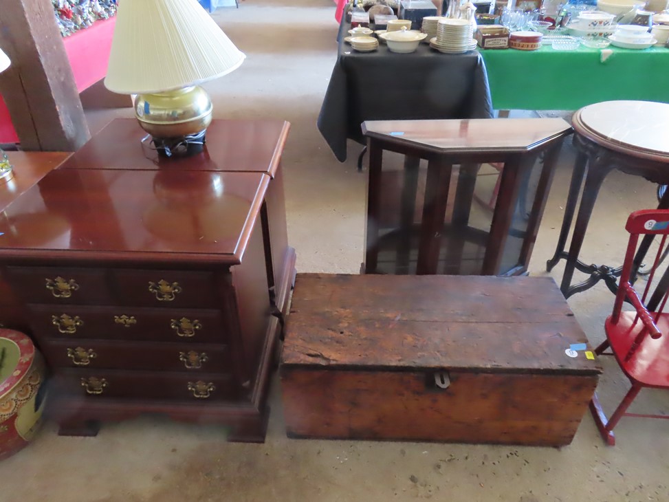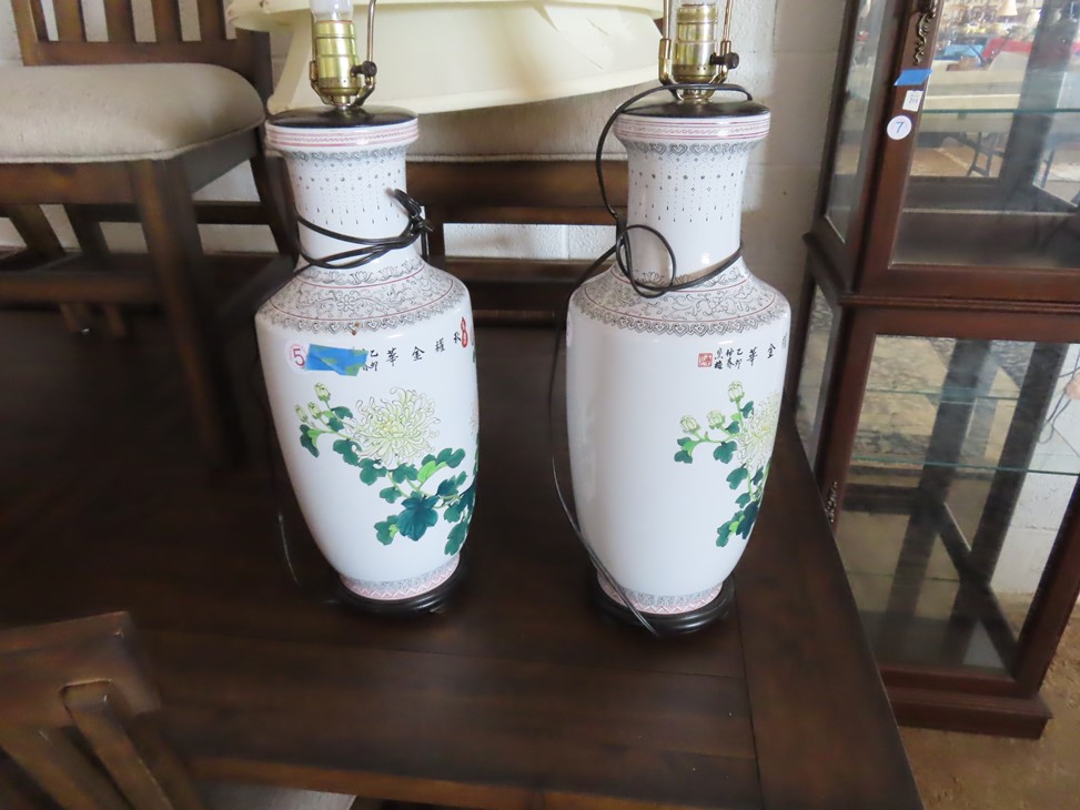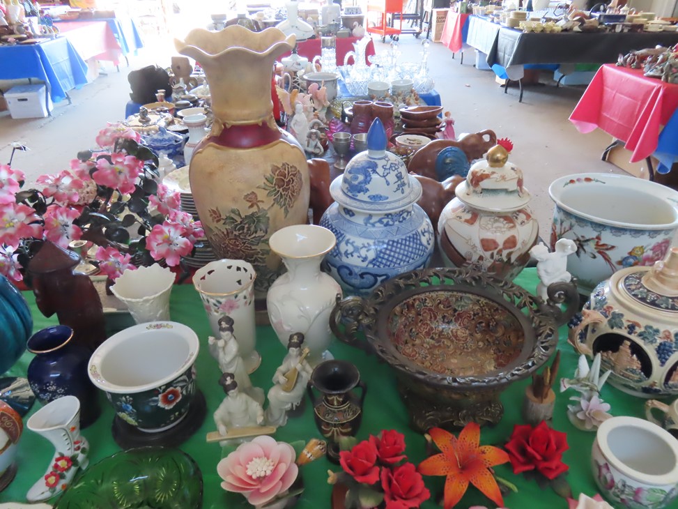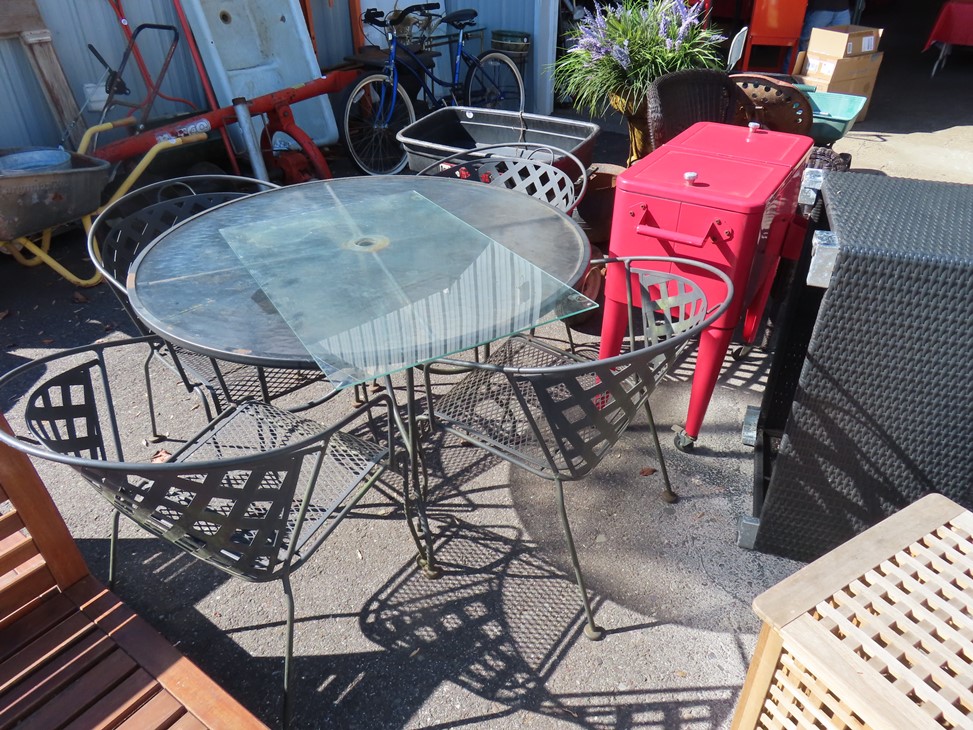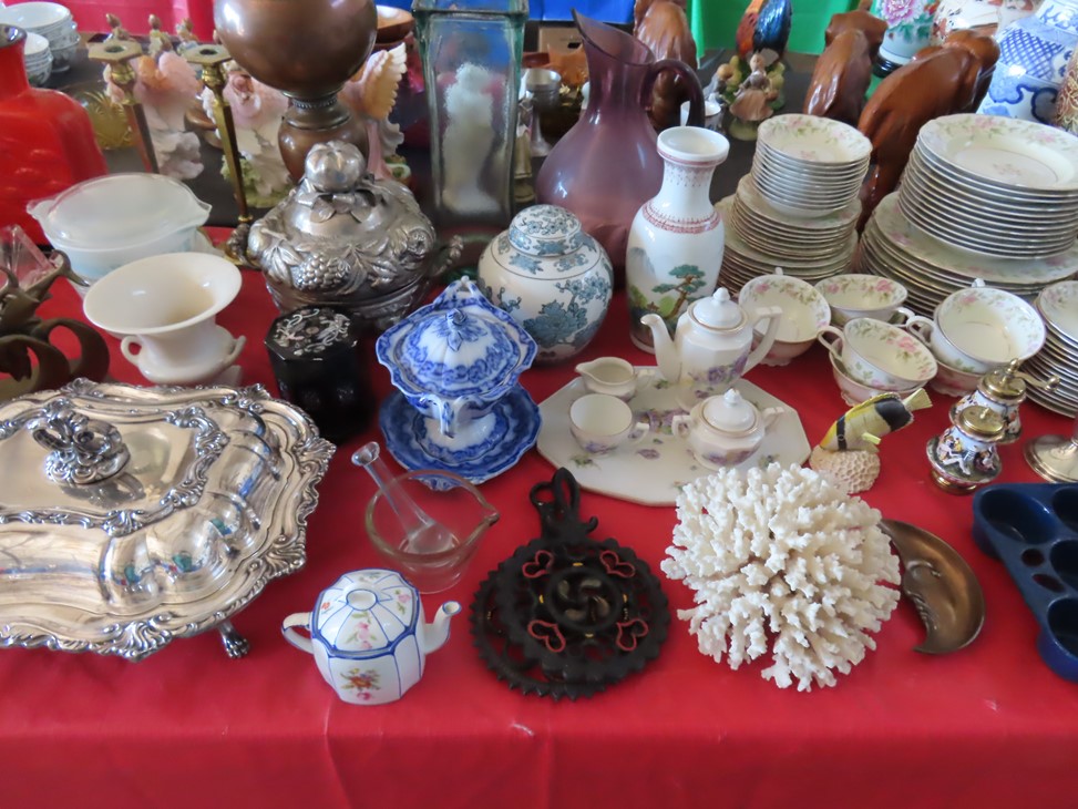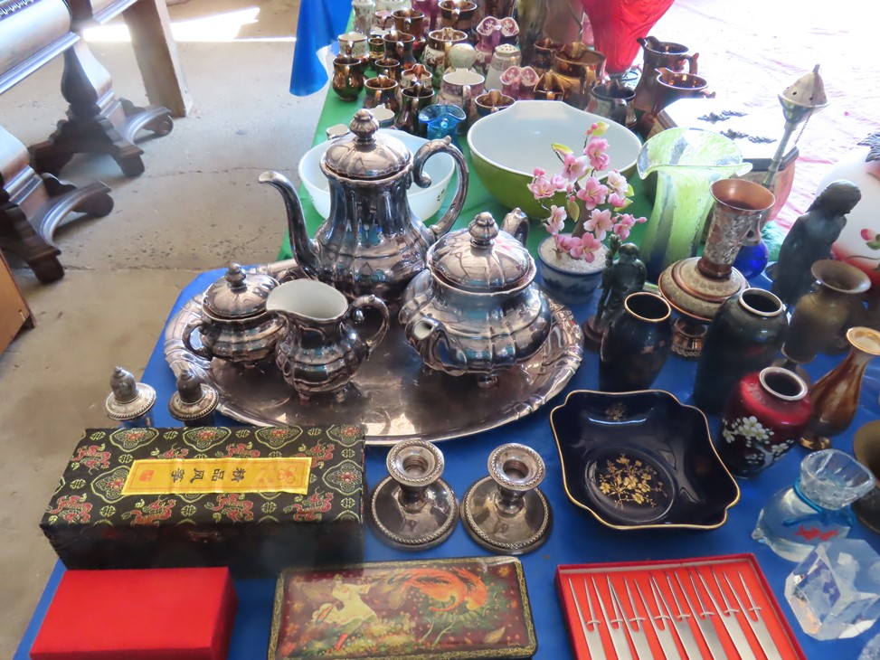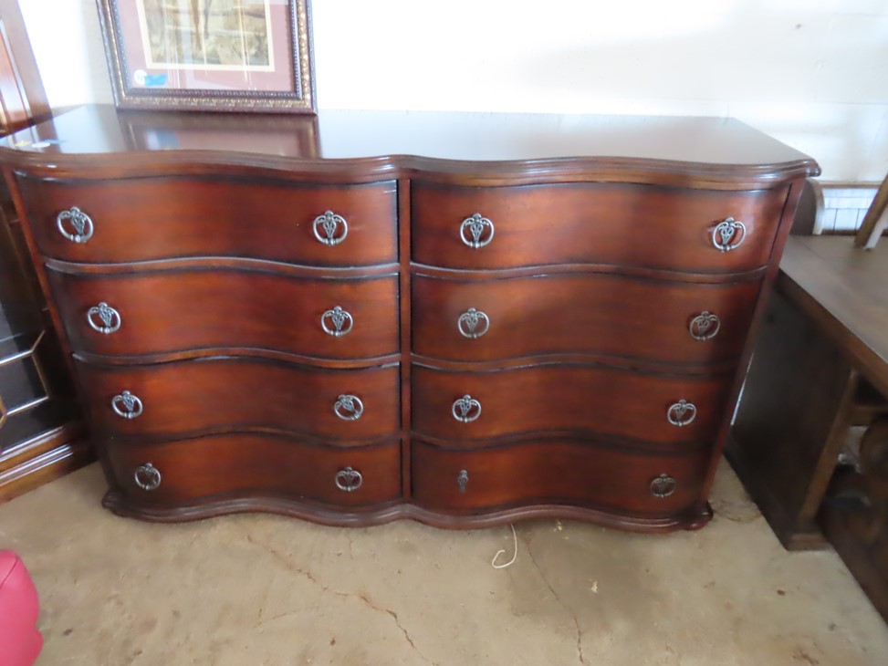 FURNISHINGS: Wonderful 8 pane sliding glass door bookcase with bun feet, broken reeded columns & more details; Striking hall table with paw feet, mirror back lower shelf and metal embellishments; Fine old 6 pane glass door bookcase; Bowfront 6 drawer buffet with cabriole legs; Modern dinette set with metal, wood and tile top table, 4 chairs; Industrial design high top table and 2 stools; Broken arch high boy with final; Good old lift top desk; Flip top table/settee; Another nice corner display cabinet; Serpentine front 8 drawer dresser; Double leg dining table with bench and chairs; Oak cabinet; MCM armchairs with red upholstery; 3 drawer chest with wooden leaf pulls & double glove boxes; Grandfather clock with visible pendulums; Large dining table with leaves and 8 chairs; Server with distressed paint finish; Corner curio cabinet with broken arch & filigree details; Dining table with 6 chairs; Glass shelf curio cabinet; Chest on chest tall dresser; 9 drawer chest; Corner cabinet with leather look panels; Oval dining table with 6 chairs; Fireside cabinet; Large wall mirror; Marble top coffee table with distressed paint base; Oriental trunk; Firkin on stand; Rush seat bench; Marble & metal side tables; Child’s rocking chair; Plant stand with marble top; Display cabinet; Good old small trunk; Pair of nightstands; Crystal & brass table lamps; Dresser with mirror; Parlor lamp; Turtle lamp; Leather sofa and chair with carved wooden frames; Nice pair of pedestal end tables with leather tops; Pair of white distressed surface nightstands; Lingerie chest; Toy chest; Small washstand; decorated oval cabinet; Camel statue with saddle; Set of 4 dining chairs; Floor lamps; Pedestal side table; Pair of bar seats; Hope chest; Pair of stools; Flower shaped table; Room screen; Red leather love seat; Lots of really nice table lamps; Quilt rack; Oval side table; Small chest; Marble top table; Leatherlike ottoman; Blanket box; Half round table; Several nice single chairs; Fine Oriental rugs and carpets; Pair of marble base lamps; Decorative flower arrangement in pink vase; Blue & white Chinoiserie table lamp pair; Brass table lamps; Camel saddle; Cane back office chair; Apothecary tabletop cabinet; Statue with clock; Several nice patio furniture sets and more!