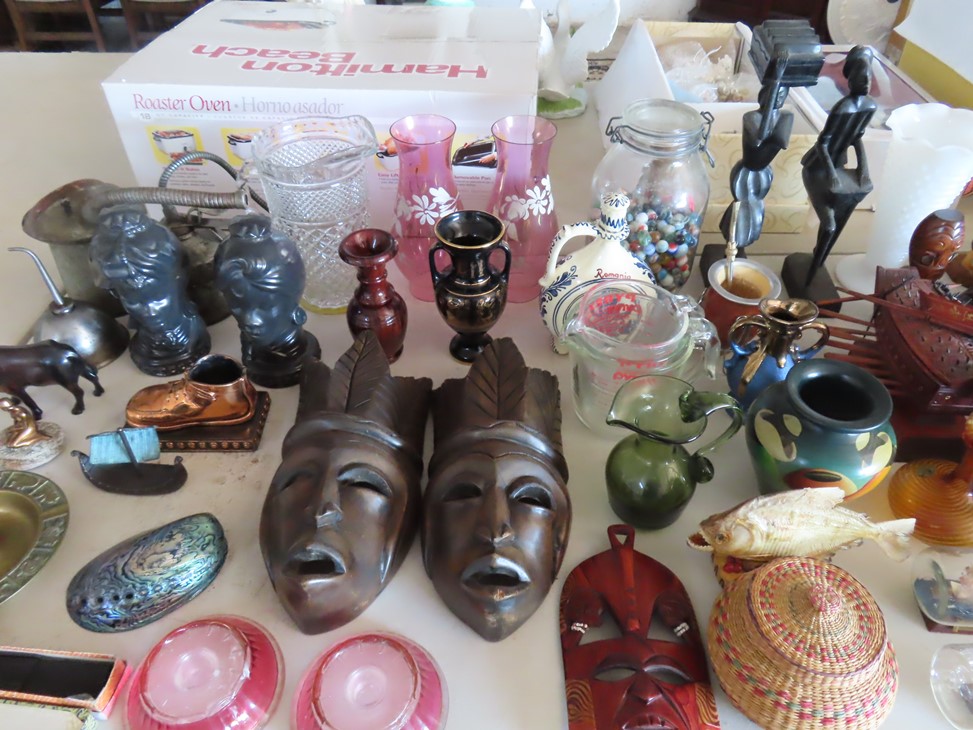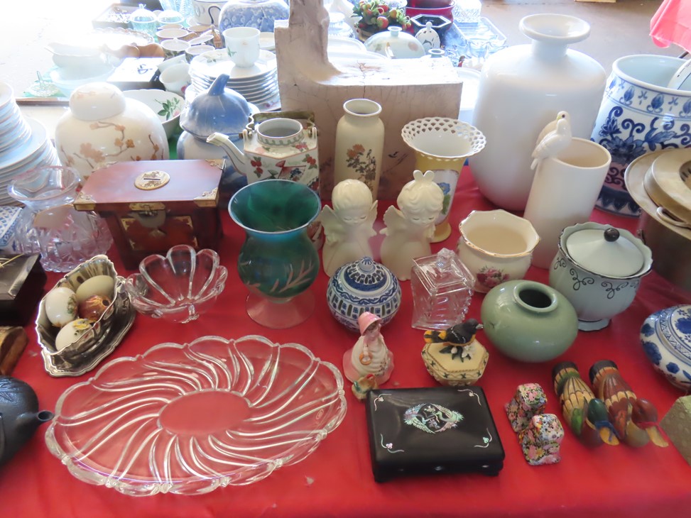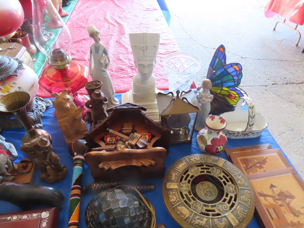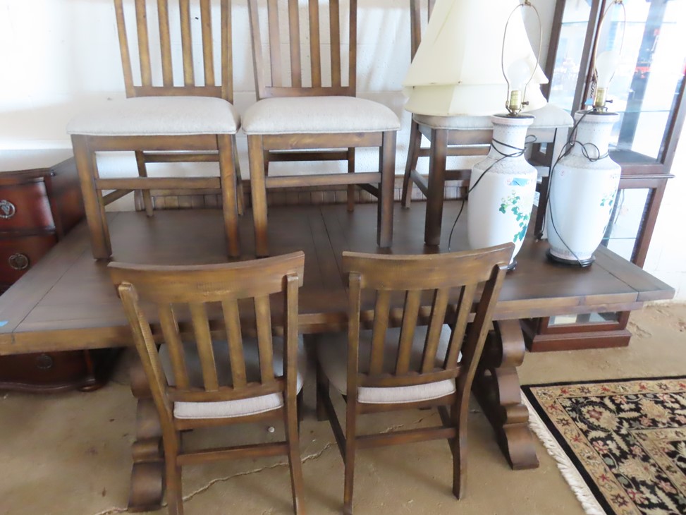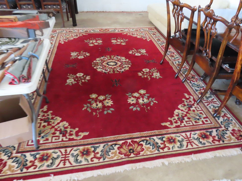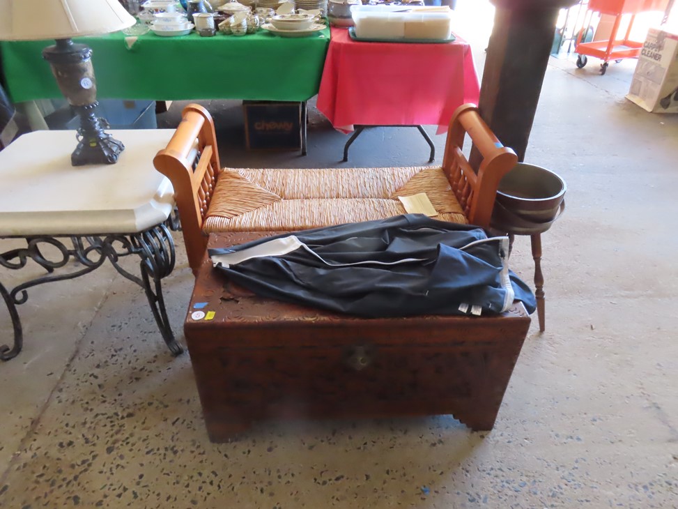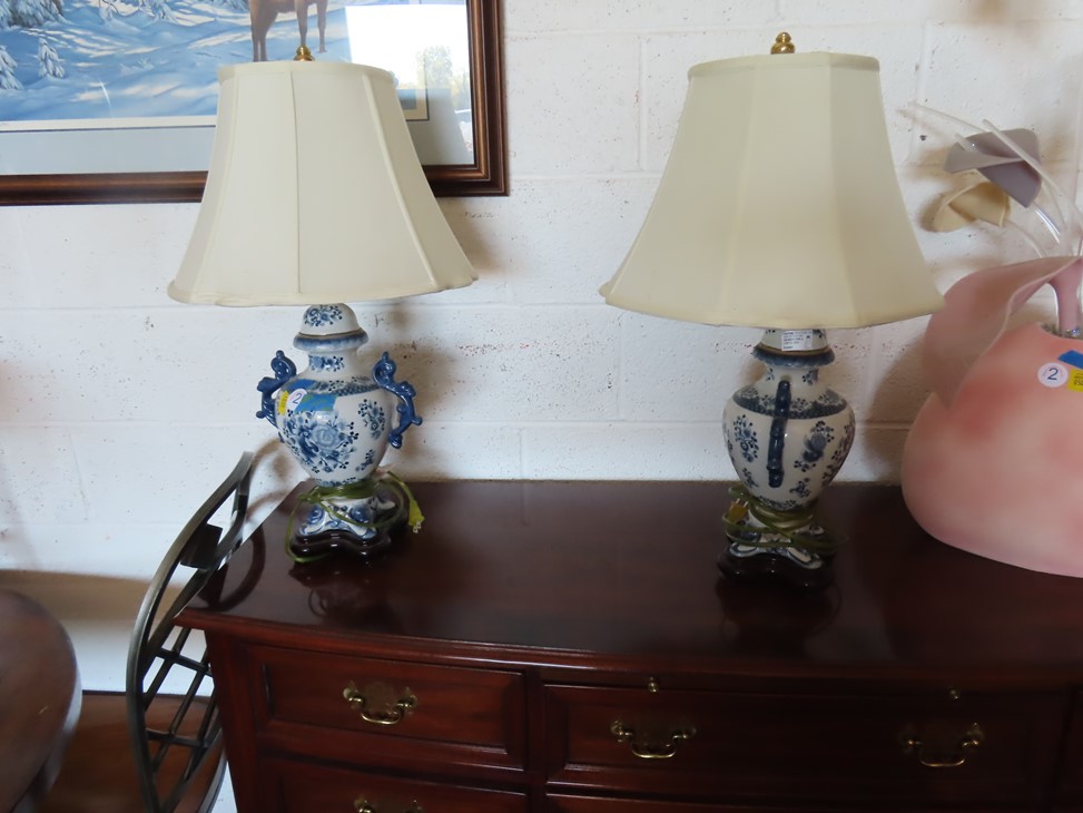 FURNISHINGS: Wonderful 8 pane sliding glass door bookcase with bun feet, broken reeded columns & more details; Striking hall table with paw feet, mirror back lower shelf and metal embellishments; Fine old 6 pane glass door bookcase; Bowfront 6 drawer buffet with cabriole legs; Modern dinette set with metal, wood and tile top table, 4 chairs; Industrial design high top table and 2 stools; Broken arch high boy with final; Good old lift top desk; Flip top table/settee; Another nice corner display cabinet; Serpentine front 8 drawer dresser; Double leg dining table with bench and chairs; Oak cabinet; MCM armchairs with red upholstery; 3 drawer chest with wooden leaf pulls & double glove boxes; Grandfather clock with visible pendulums; Large dining table with leaves and 8 chairs; Server with distressed paint finish; Corner curio cabinet with broken arch & filigree details; Dining table with 6 chairs; Glass shelf curio cabinet; Chest on chest tall dresser; 9 drawer chest; Corner cabinet with leather look panels; Oval dining table with 6 chairs; Fireside cabinet; Large wall mirror; Marble top coffee table with distressed paint base; Oriental trunk; Firkin on stand; Rush seat bench; Marble & metal side tables; Child’s rocking chair; Plant stand with marble top; Display cabinet; Good old small trunk; Pair of nightstands; Crystal & brass table lamps; Dresser with mirror; Parlor lamp; Turtle lamp; Leather sofa and chair with carved wooden frames; Nice pair of pedestal end tables with leather tops; Pair of white distressed surface nightstands; Lingerie chest; Toy chest; Small washstand; decorated oval cabinet; Camel statue with saddle; Set of 4 dining chairs; Floor lamps; Pedestal side table; Pair of bar seats; Hope chest; Pair of stools; Flower shaped table; Room screen; Red leather love seat; Lots of really nice table lamps; Quilt rack; Oval side table; Small chest; Marble top table; Leatherlike ottoman; Blanket box; Half round table; Several nice single chairs; Fine Oriental rugs and carpets; Pair of marble base lamps; Decorative flower arrangement in pink vase; Blue & white Chinoiserie table lamp pair; Brass table lamps; Camel saddle; Cane back office chair; Apothecary tabletop cabinet; Statue with clock; Several nice patio furniture sets and more!