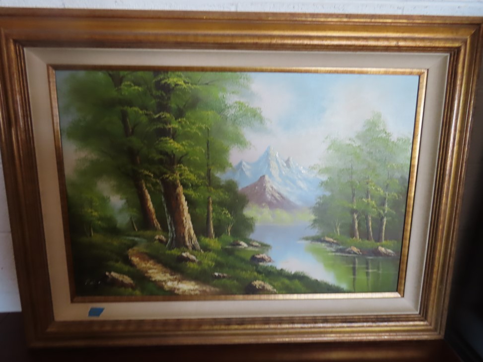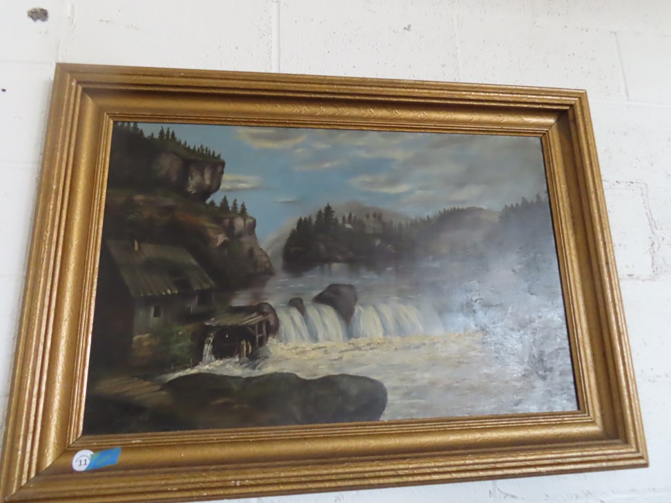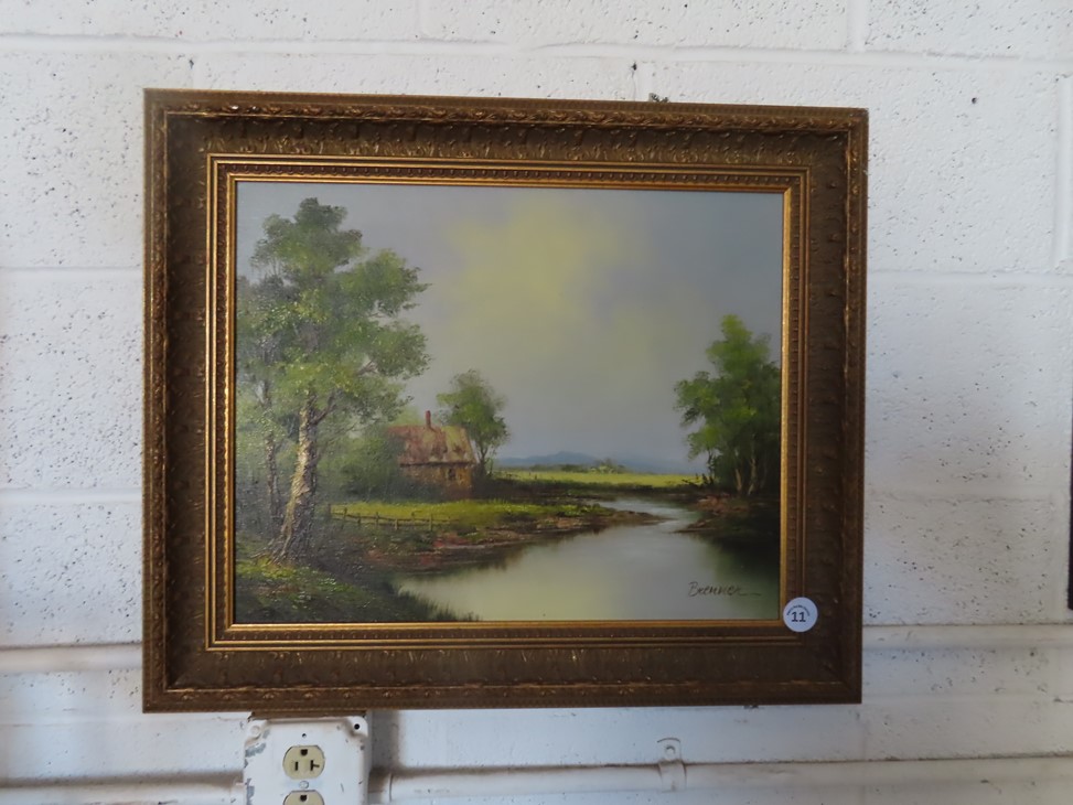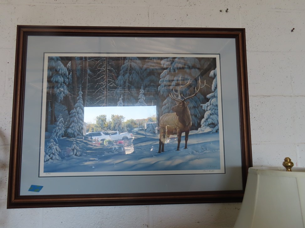 ART & SILVER: Classical tabletop sculpture; Hunt prints; Small floral painting in massive frame; Riverside cottage painting, signed; Wonderful fish & fowl foodstuffs art; Old mill at waterfall painting; Another nice river & mountain painting, signed Bailey; Elk stag print; Another nice river & cottage artwork; Vase of yellow flowers art; River & cottages at the stone bridge artwork; Pheasant artwork; Carvings; Nefertiti head; Folk carvings; Elephants; Sterling & silver-plate; Coffee and tea set on tray; Candlesticks; S&P shakers; Cream pitcher; Covered serving dish; Flatware and much more!
