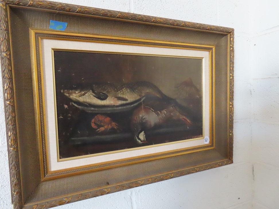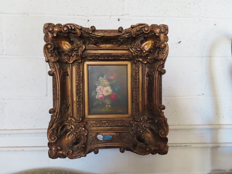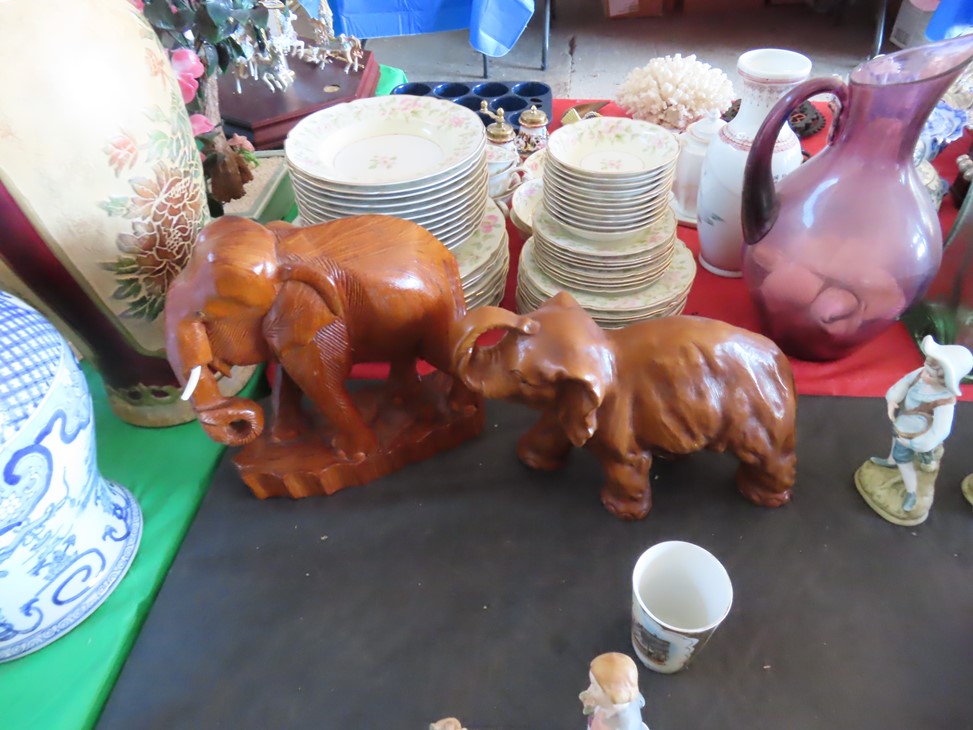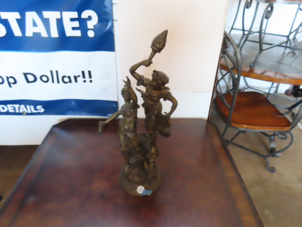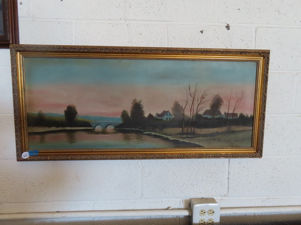 ART & SILVER: Classical tabletop sculpture; Hunt prints; Small floral painting in massive frame; Riverside cottage painting, signed; Wonderful fish & fowl foodstuffs art; Old mill at waterfall painting; Another nice river & mountain painting, signed Bailey; Elk stag print; Another nice river & cottage artwork; Vase of yellow flowers art; River & cottages at the stone bridge artwork; Pheasant artwork; Carvings; Nefertiti head; Folk carvings; Elephants; Sterling & silver-plate; Coffee and tea set on tray; Candlesticks; S&P shakers; Cream pitcher; Covered serving dish; Flatware and much more!