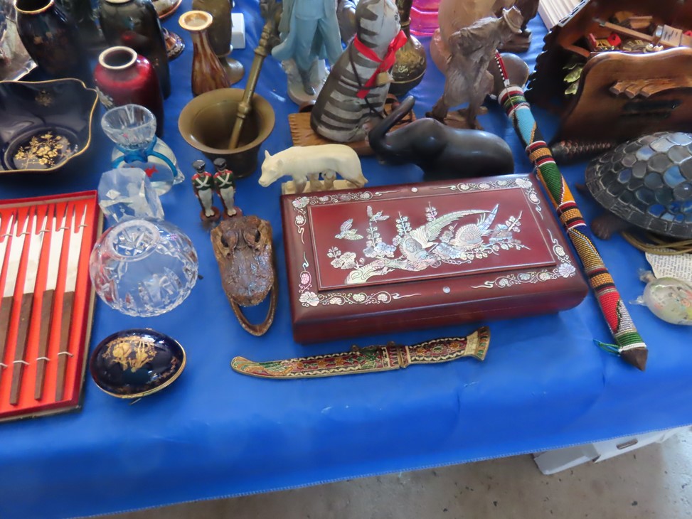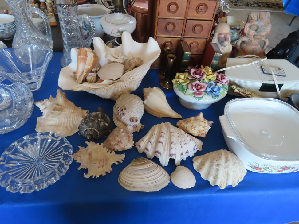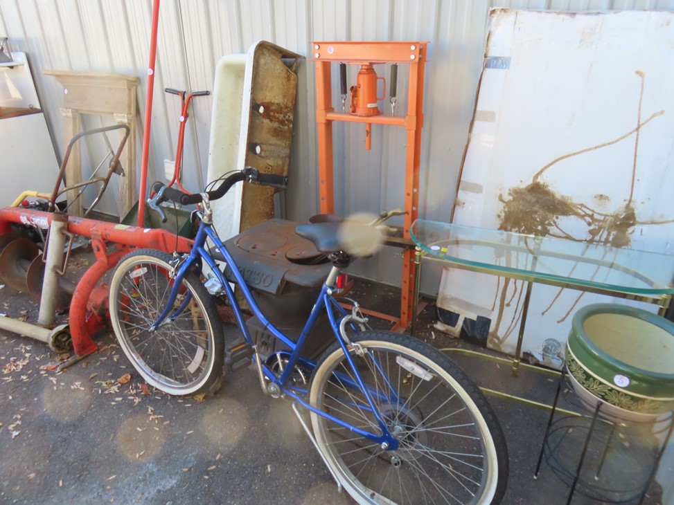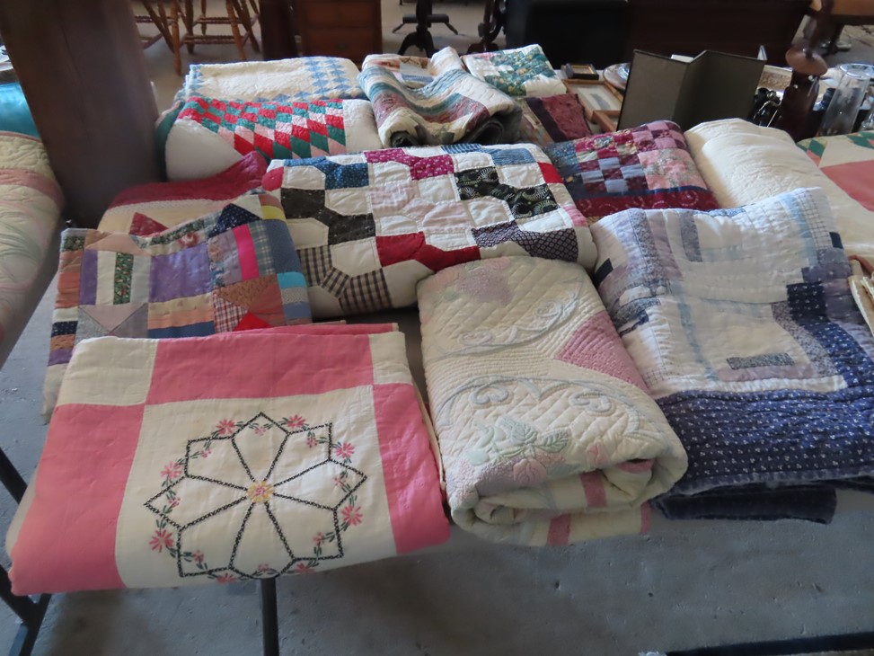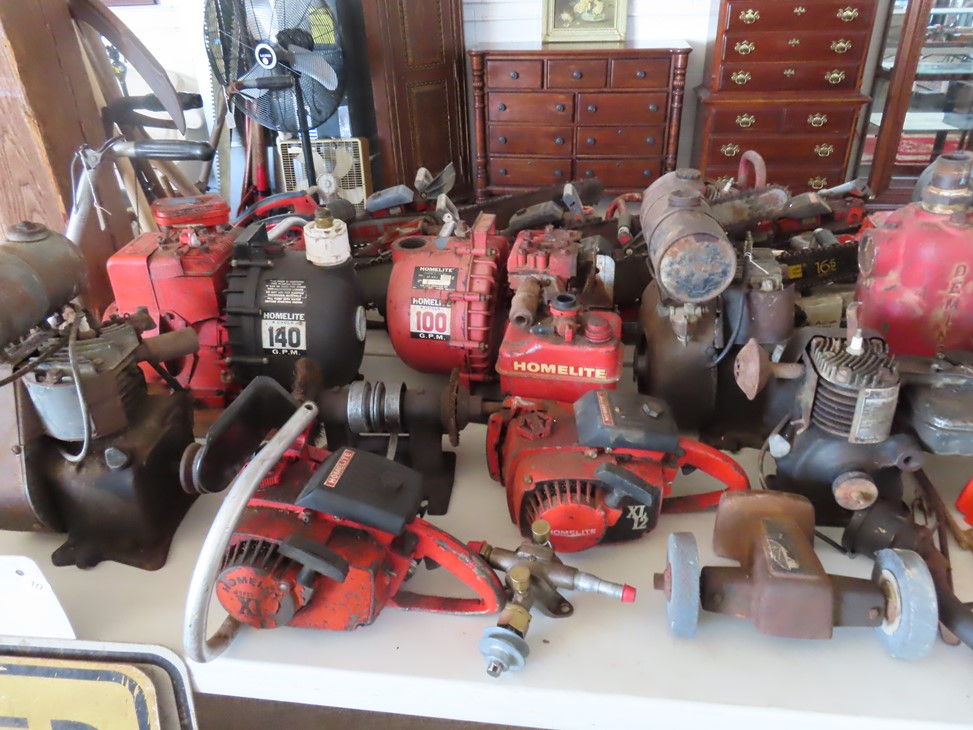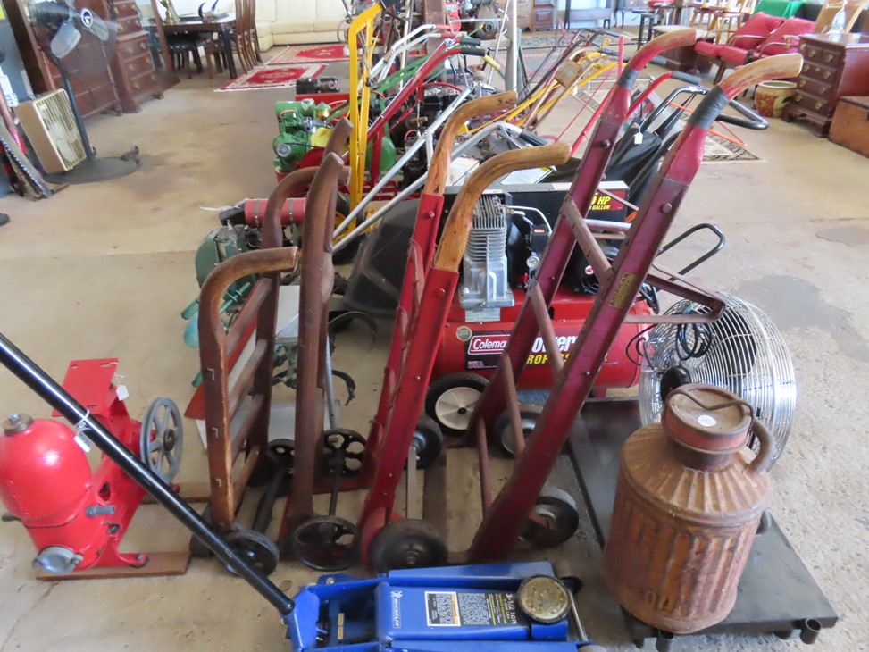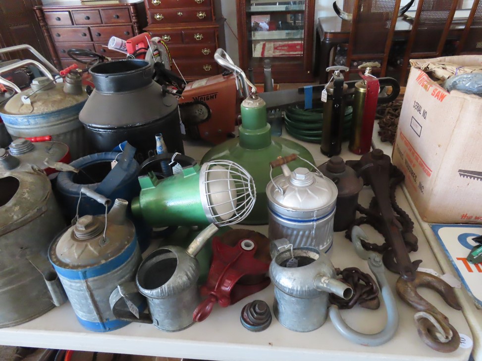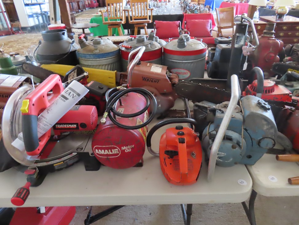 MORE: Lots of Great Old equipment. Seldom seen pieces; Old Wright saw; Old engines; Old Ironsides & more galvanized metal fuel cans; Old dollies; Old hatchets; Hammers; Corn replanters; Atlas headlamps in boxes; Edelman Freez-D-Tector in box; Mason jar oil can; Hoses; Torches; Hand scythes; Chains; Small air compressor; Homlite chain saw; Shop press; Pot belly stove; Cast iron enamel farm sink; Post hole digger; Lawn spreader; Wheelbarrows; Live trap; Galvanized pail; Old chainsaws; US General rolling tool chest; Craftsman table saw; Craftsman bench grinder; Kerosene heater; Coleman Powermate air compressor; Old fuel cans; Shop lift; John Deere 110 riding mower; Echo Lawn vacuum; Reel mower; Pull behind mounted tractor seat; Kitchen chair with steps; Tradesman saw; Hitch knobs; Welding hose pair; Old fuel dispense nozzle; Plumb hatchet; Firestone Supreme hatchet; Advertising thermometers; Old fire extinguishers; Hooks; Old lights; New hose; Jacks; Old farm toys; Baby doll in box; Bicycles; Really nice indoor/outdoor sofas & ottomans set; More patio & outdoor furniture; Teak lounge seats; Drink cooler; Planters; Barbell; Old coins & currency; Gold coins; Silver ingots; Fine & costume jewelry; Graded & slabbed silver dollars; Duck decoys; Taxidermized fish mounts; Mounted steer horns; Driftwood; Old box fan; Acoustic guitar in case; Child’s wooden pull wagon; Western saddle; Seashells & coral; Bose radio; Bookends; Brass candlesticks; Canon Powershot camera; More cameras; Statue with clock; Enamelwork vase; Oriental items; Mother of Pearl inlaid box; Lead soldiers; Turtle & butterfly leaded glass shade lamps; Brass censer; Stone floral trees; Tabletop carousel with horses; A dozen+ nice old hand-made quilts; Yellow ware mixing bowls; Copper ham boiler; Brass mortar & pestle; Hamilton Beach roaster oven in box; Muffin tin; Blue canning jars; Old soda bottles; Fondue fork set; Wooden butter churn; Wool winder; Birdhouse; Old mantel; Mealmaster stove; Cuckoo clocks; Paperweights; Oil lamp; Anniversary clock; Copper canisters; Trivets; Glass mortar & pestle; Box of buttons; Mantel clock; Baseball in display case; Rocks; Rowboat half display shelf; Lacquerware set; Keepsake boxes; Glass cigarette box; Brass animals; Lots of knick-knacks; Russian spoon and egg; Oriental bell on stand; Gong; Tabletop totem pole; Boomerang on stand; Ships in bottles; Maracas; Masks; Marbles; Abalone shell; Sweetgrass basket and much much more!