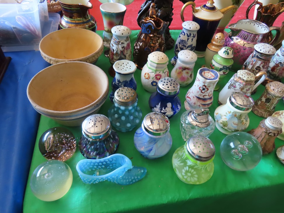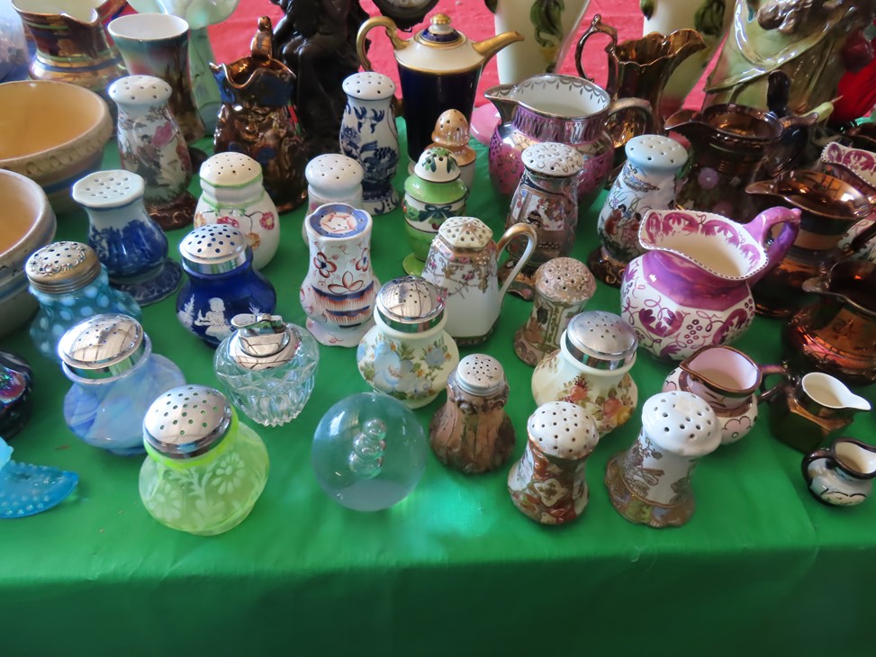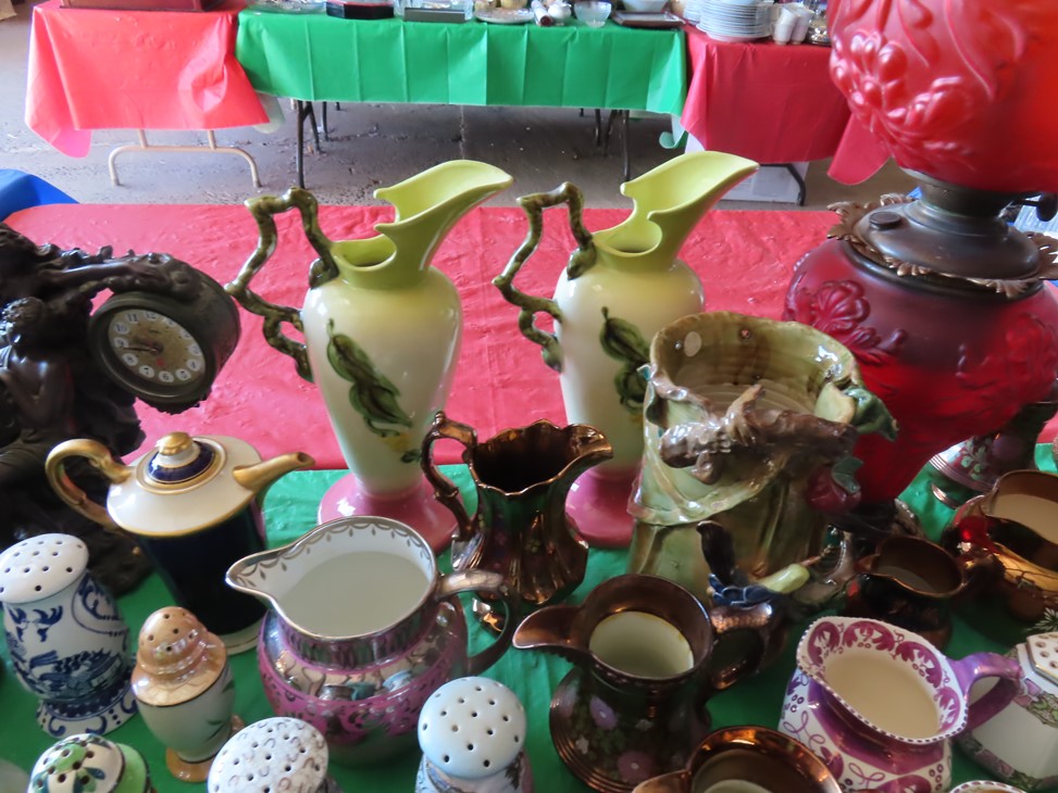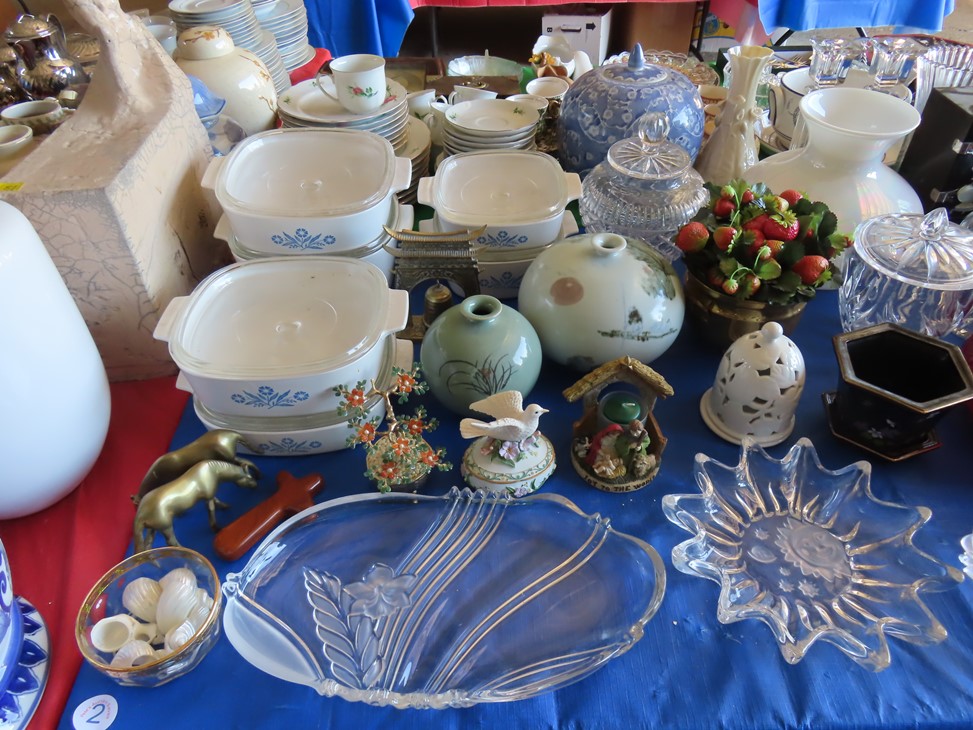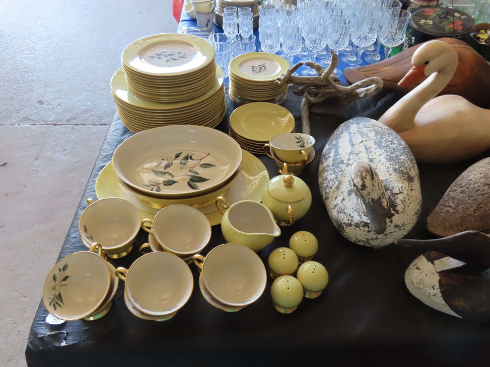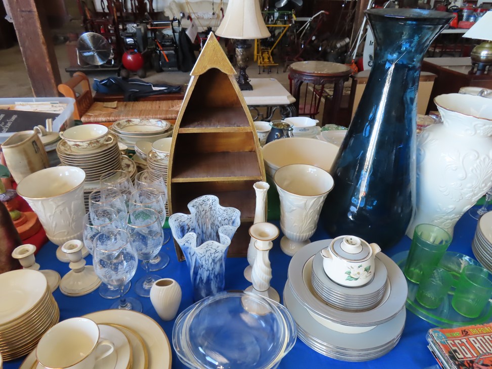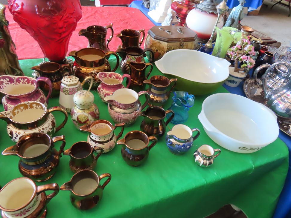 CHINA & GLASS: Copper luster pitchers; Majolica pitchers; Teapots; Coffeepot; Large ewer pair; Hatpin holders; Yellow ware mixing bowls; Shakers; Lladro nurse statue; More Lladro; Basket; Steins; Lidded tureen; Gravy boat with underplate; Candelabras; Diminutive tea& coffee set; Vases; Blue & white tureen with lid on plate; Lenox salt shaker & pepper grinder; Several fine china dinnerware sets; Ginger jar with lid; Nice assortment of studio pottery; Planters; Lenox vases & more Lenox; Figurines; Capo-di-monte flowers; German punch set with cups; Native American pots; MCM pottery; Evesham casserole; Opalescent glass shakers; Mary Gregory decorated shaker; Hobnail glass shoe; Paperweights; Crystal glassware in boxes; Cut glass; Decanters; Crystal bowls; Cruets; Relish dish; Crystal pitchers; Jack in the pulpit vase; Glass ashtray; Corning casseroles with tops; Pyrex mixing bowl; Crystal vases; Candlewick glasses, compote, mayonnaise bowl and divided tray; Fostoria American dish; Art glass; Large blue vase; Green depression glass; Goblets; Cigarette box; Punch bowl; Crystal candlesticks; Pyrex measures; Holiday glassware; Amber butterfly party set in original box and much more!