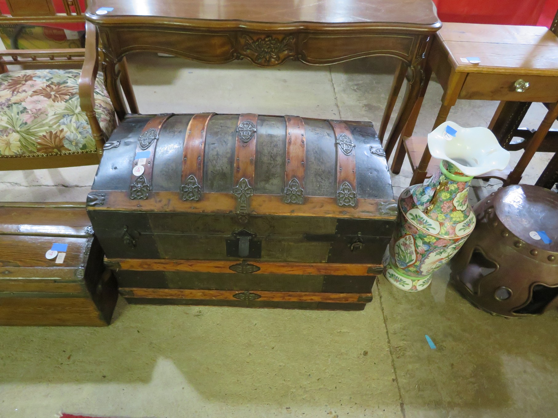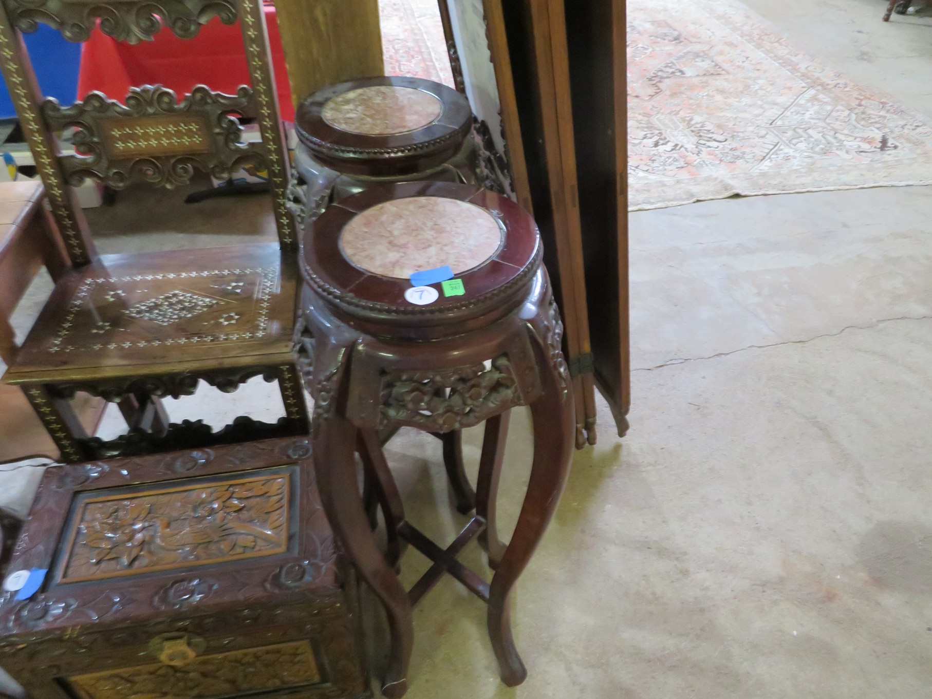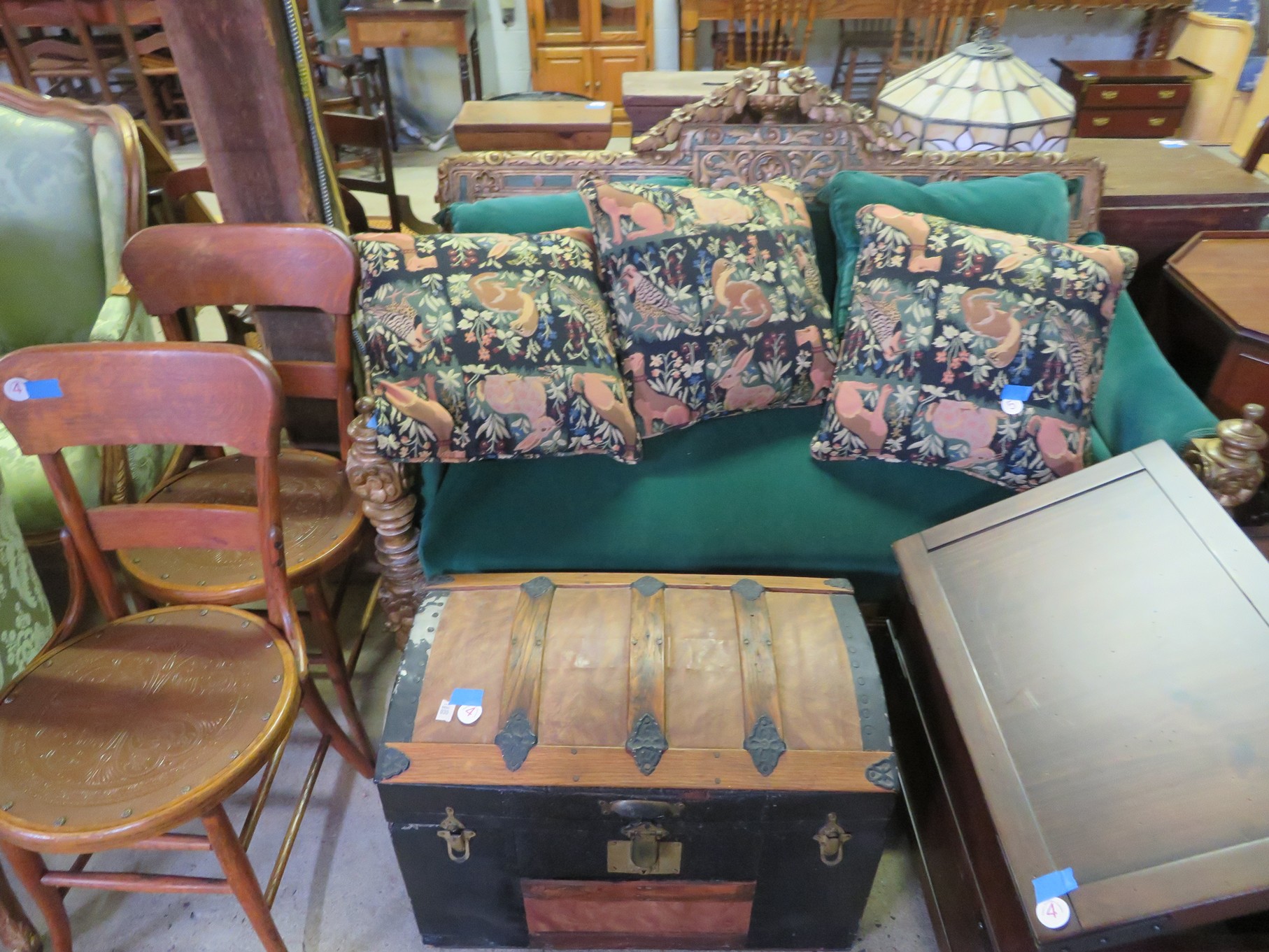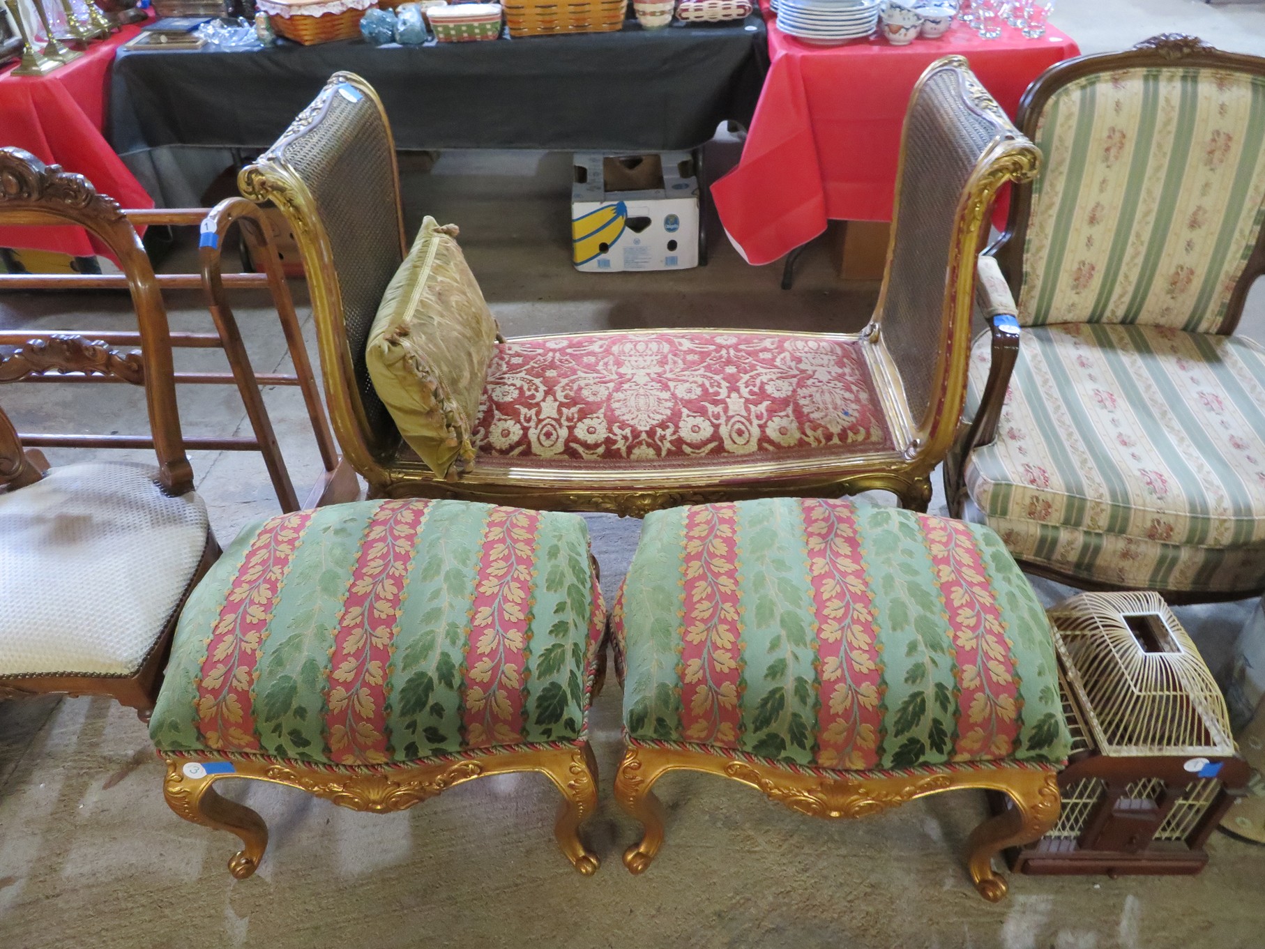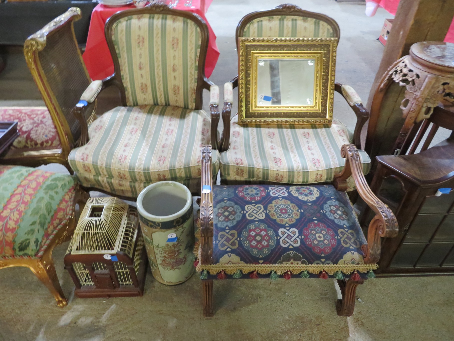 FURNISHINGS: Wonderful curved buffet with nice detailing; Great marble top 3 drawer bowfront chest; Fantastic bird cages on stands; Early chest of drawers; Baker end tables; Harden 4 drawer hall table; Henkel Harris end table; Really nice oak china cabinet; Harden lingerie chest; Fancy vitrine; Oriental inspired buffet; Painted blanket box with Greek mythological scenes; Outstanding dresser with carved busts; Oak ice box; Baker Furniture dining chairs; Marble top bombé front buffet; Really nice Victorian dresser & mirror with marble tops; Golden oak serpentine front dresser with cradle mirror; Large 2 door painted Oriental cabinet; Heavily carved chair; Nice porcelain lamp with medallions; Splendid 7 panel Oriental table screen; Marvelous hanging clock; More fabulous clocks; Tremendous table lamps; La-Z-Boy Leather sofa; Banded edge dining table with 8 chairs & table leaf; Harden bedroom set (4 poster bed, dresser with mirror, nightstand pair); Leather love seat; Oval dining table with 6 chairs; Library table with lots of carving; Nice display cabinet with band decoration; Flip top server; Open bookcase with top drawer; Pair of upholstered armless chairs; Side table with raised top edge; Pair of small footstools; Pair of padded footstools with gold base; Bench with high sides; Quilt rack; Carved blanket box; Room screen; Oak farm table with pressed back chairs; Rolling kitchen cart; Pagoda table lights; Display steps; Stick lamps; Ornately framed mirror; Tea cart; Footstools; Metal lamp with leaded glass shade; Ornate pair of tall plant stands with embellishments; Empire Butler’s chest; Fancy lamp with old fashioned look glass shade; Metal base lamp; Another nice bird cage; Marble pedestal; Umbrella holder; Sofa table; Blue & white table lamp; Marble top low side table; Great pair of white & gold elephant garden seats; Multiple Oriental floor vases; Small stepstool; Wooden plant stand; Small table with drop sides; Set of nesting tables; Hanging display case; Small bird cage; Pair of upholstered armchairs; Padded one seat bench with armrests; Carved plant stand; Marble top plant stand pair; Another nice room screen; Small tables; Fireplace fan; Metal cherub lamp; Hall tree with shelf; Tall dresser; Farm table with woven seat bottom chairs; Gold edge mirror; Some really great table lamps; Display table with twist legs; Small Oriental 2 drawer chest; Florida room 3 piece set with cushions; Dome top trunks; Plank bottom chair pair; Love seat with heavily carved frame; Rattan side armchair set; Another nice pair of upholstered armchairs; Carved box; End table with pull-out; Another nice garden seat; Oriental display cabinet; Lots of great armchairs; Small cabinet with brass railing; Unusual rug with Eastern figures; Nice room size Oriental carpets & rugs; Geometric pattern rug; Runners; Outdoor furniture (Spring is coming!) and much more!