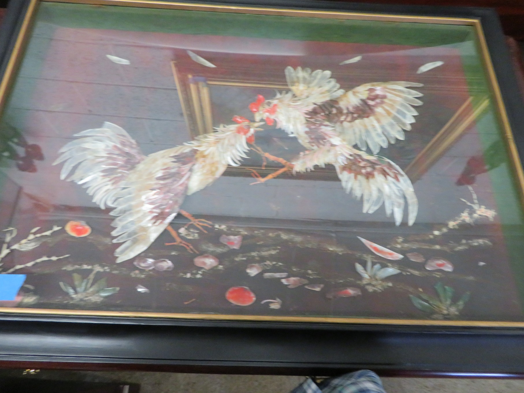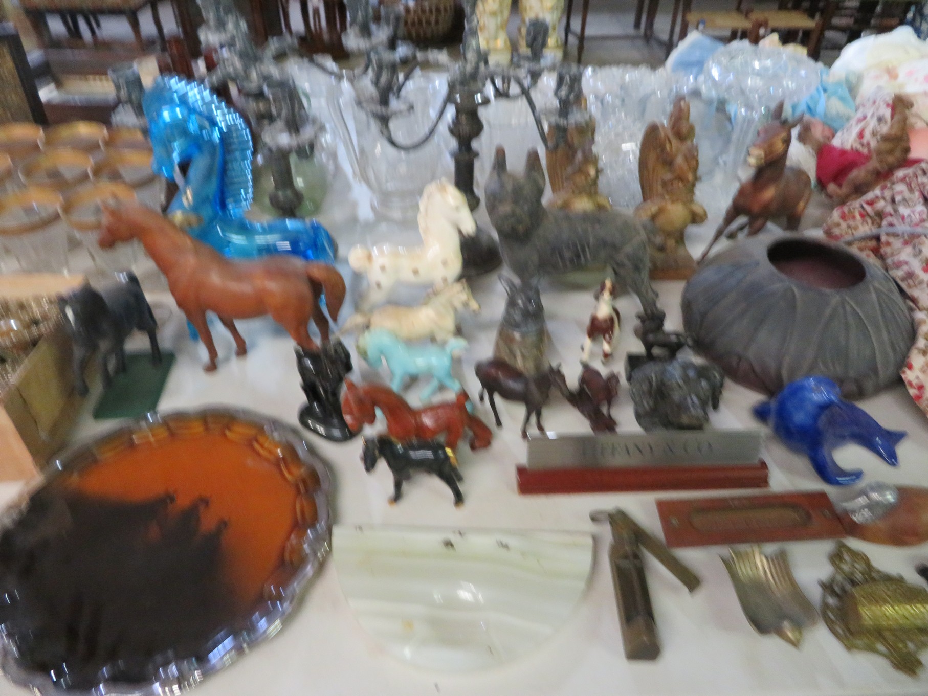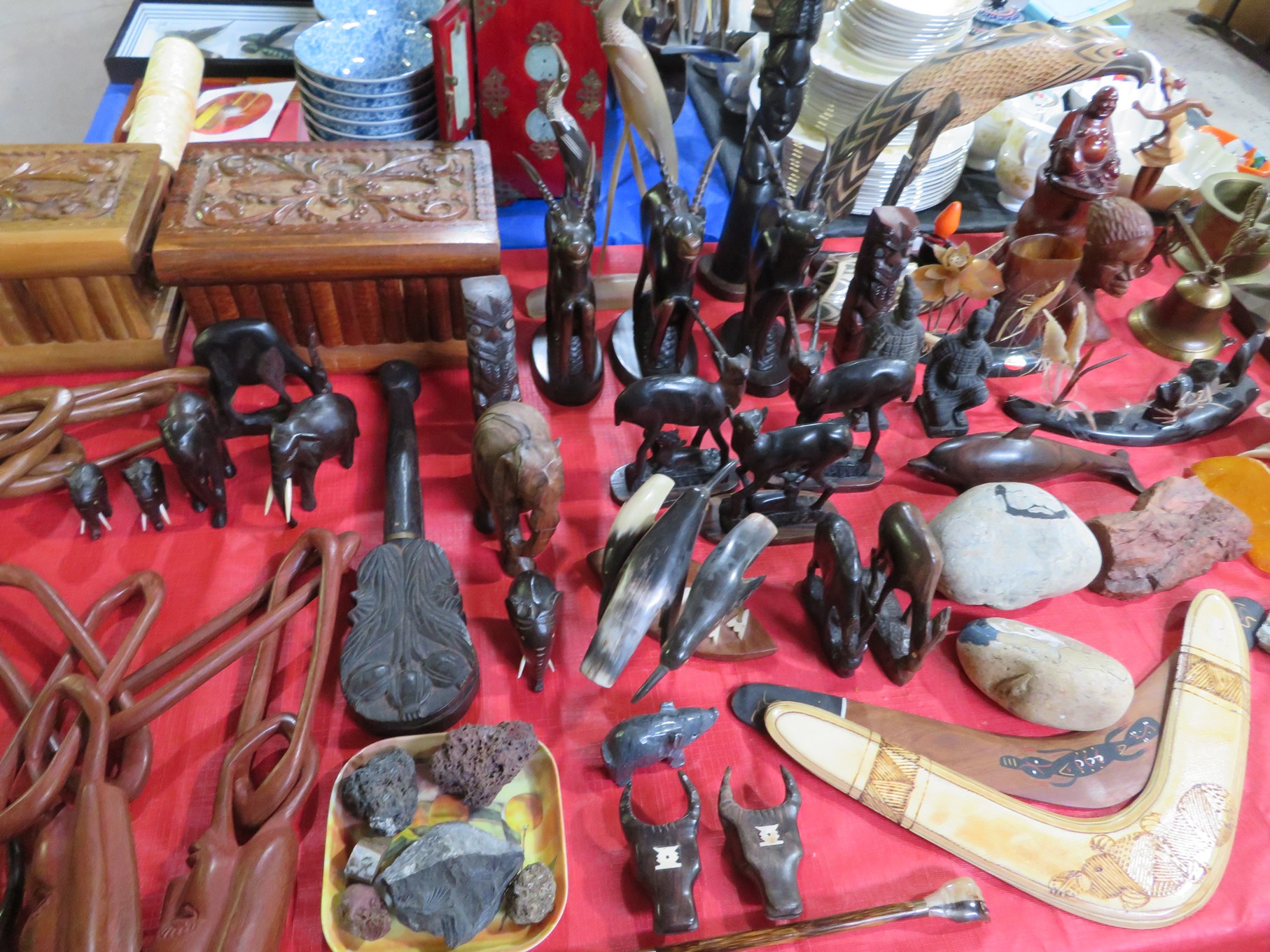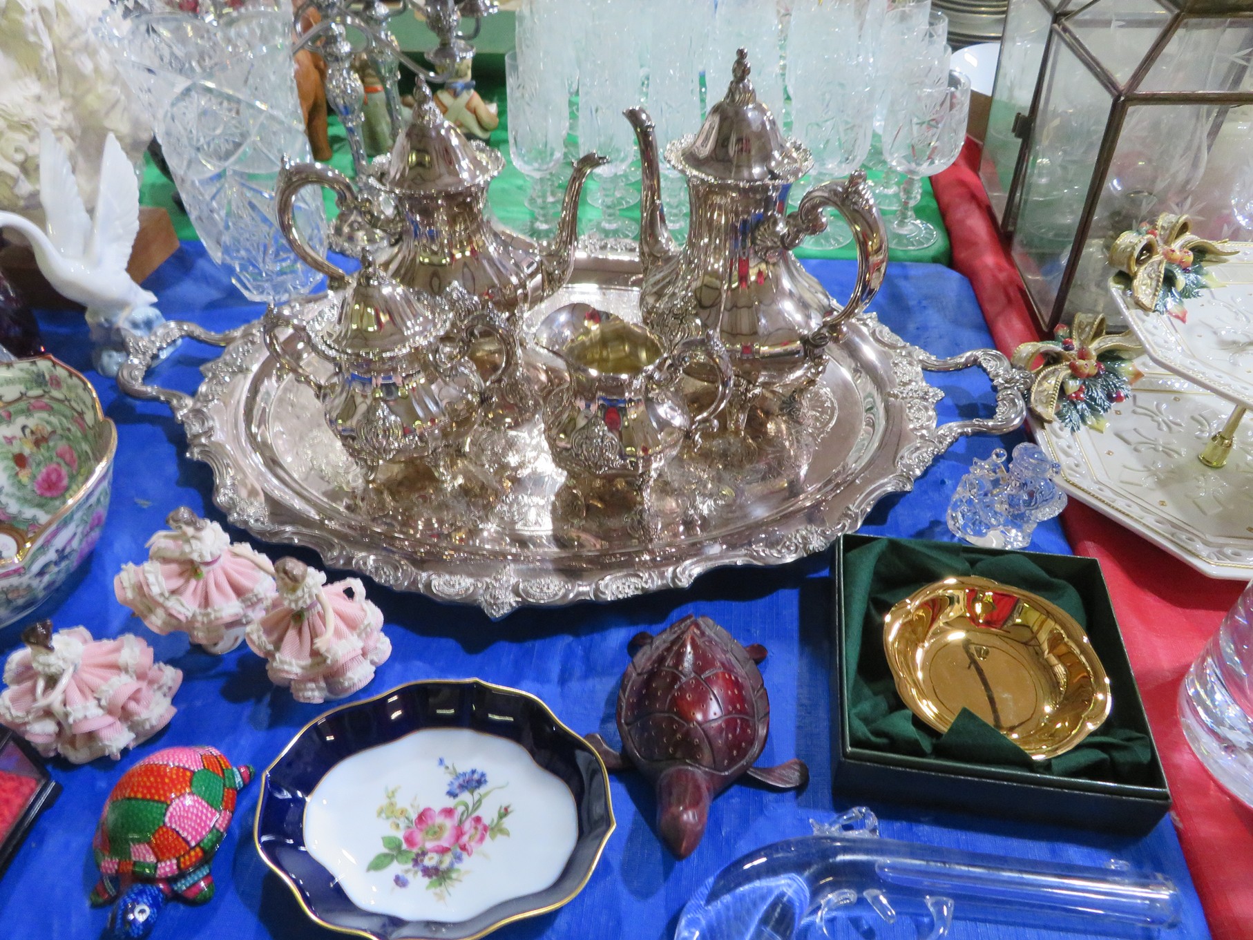 ART & SILVER: Wonderful artwork of courtyard scene; Oriental panels; Ship models; Angel artwork; Set of 4 Oriental plaques; Floral display painted on glass; Nice stained glass panel pair; Country thatched cottage scene; Ship a-sail on ocean; Garden oasis; Fighting chickens art; Pensive can-can dancer picture; Gold embroidered dragons art; Snowy cottage art; Framed porcelain plates; Matched pair of foo dog statues; Rocking horse; Pair of Dutch scenes; Linda Le Kinff signed prints; Sea life artwork; Lost lamb & shepherd print; Harbor scene; Multiple Lladro figurines; Nude statues; Large Hummels; Stone tree; Agate head of Nefertiti; Giraffe & foal figurines; Display egg with stand; Elephant; Russian lacquer box; Turtles; Bust; Buddhas; Lion; Horses; Icon style pictures; Sleeping Buddha; Fighting pheasants; Carved bear with fish; Carved crocodile pair; Masks; Framed Malaysian butterflies & insects; Scrolls; Carved horn; Lots of carved animals; Sterling & silver-plate! Sterling flatware set; Tea & coffee service on tray; Magnificent candelabra pair; Photo frame; Another nice pair of candelabras; Fox cup; Another candelabra & more!