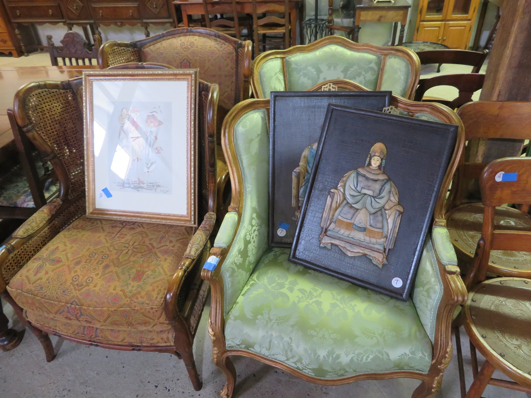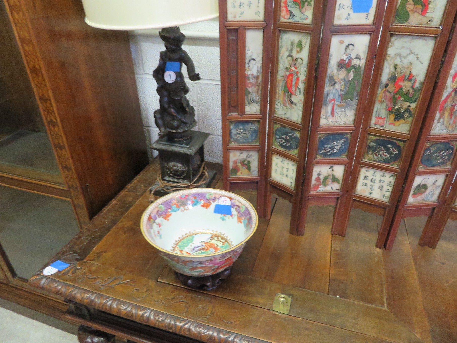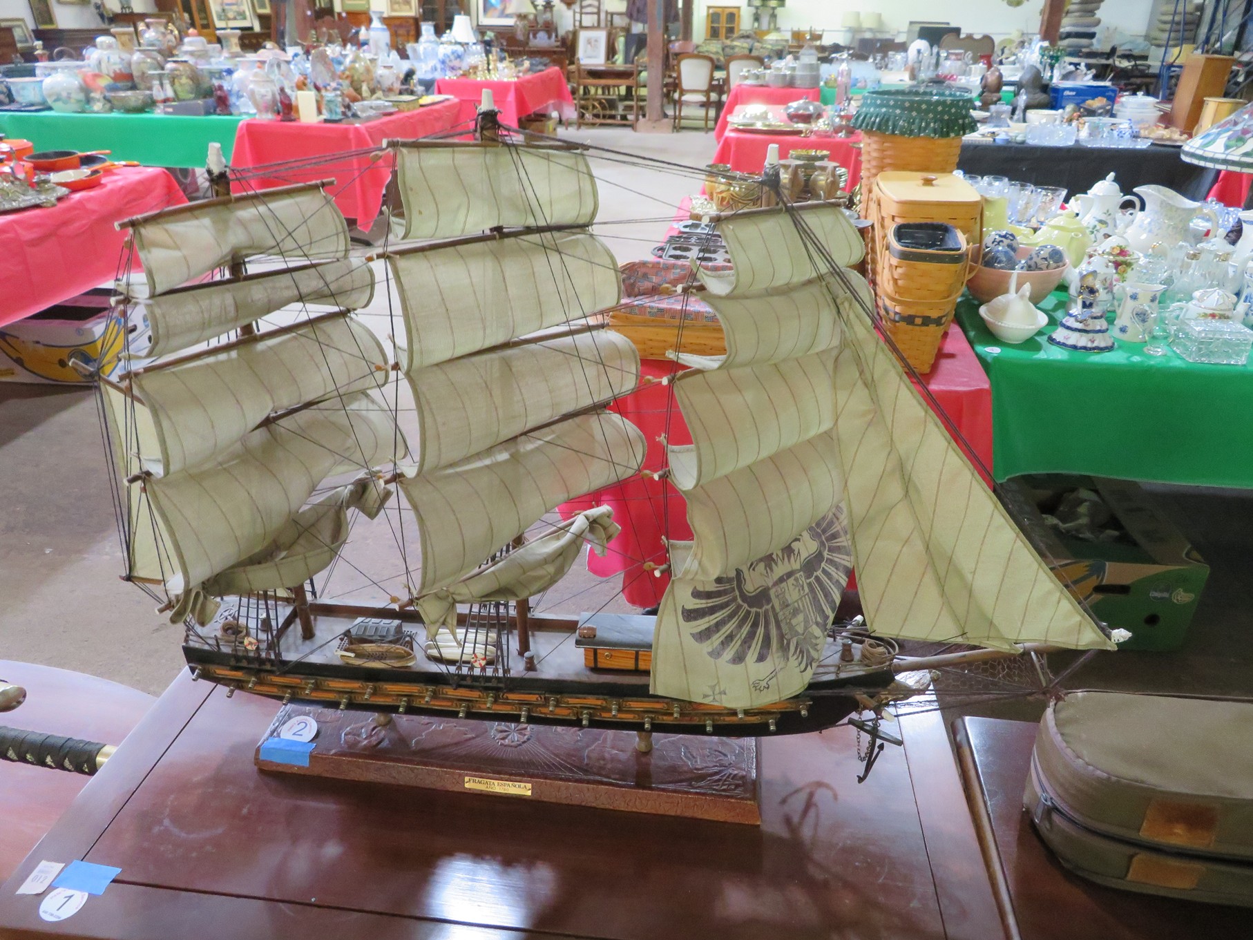 ART & SILVER: Wonderful artwork of courtyard scene; Oriental panels; Ship models; Angel artwork; Set of 4 Oriental plaques; Floral display painted on glass; Nice stained glass panel pair; Country thatched cottage scene; Ship a-sail on ocean; Garden oasis; Fighting chickens art; Pensive can-can dancer picture; Gold embroidered dragons art; Snowy cottage art; Framed porcelain plates; Matched pair of foo dog statues; Rocking horse; Pair of Dutch scenes; Linda Le Kinff signed prints; Sea life artwork; Lost lamb & shepherd print; Harbor scene; Multiple Lladro figurines; Nude statues; Large Hummels; Stone tree; Agate head of Nefertiti; Giraffe & foal figurines; Display egg with stand; Elephant; Russian lacquer box; Turtles; Bust; Buddhas; Lion; Horses; Icon style pictures; Sleeping Buddha; Fighting pheasants; Carved bear with fish; Carved crocodile pair; Masks; Framed Malaysian butterflies & insects; Scrolls; Carved horn; Lots of carved animals; Sterling & silver-plate! Sterling flatware set; Tea & coffee service on tray; Magnificent candelabra pair; Photo frame; Another nice pair of candelabras; Fox cup; Another candelabra & more!