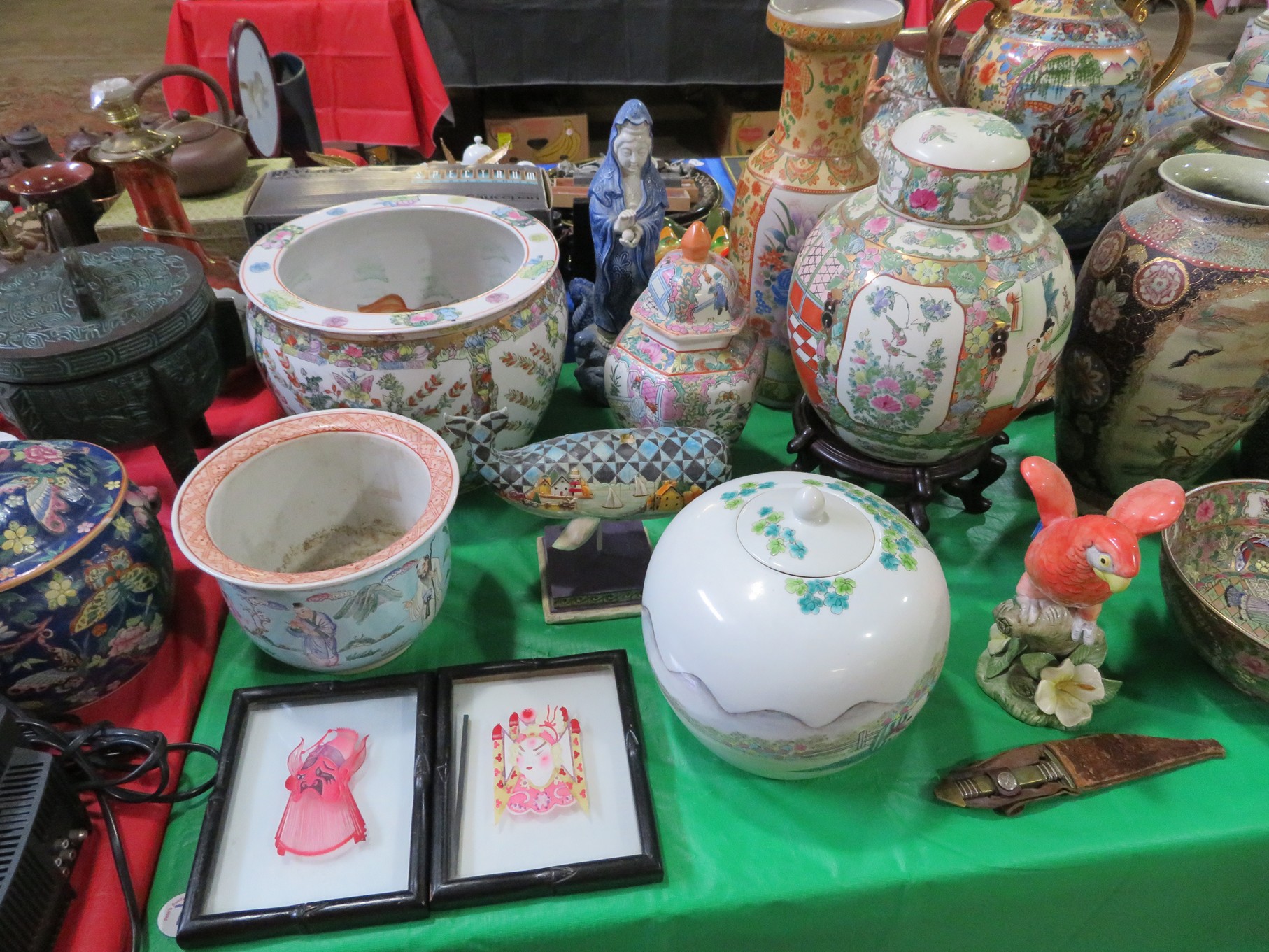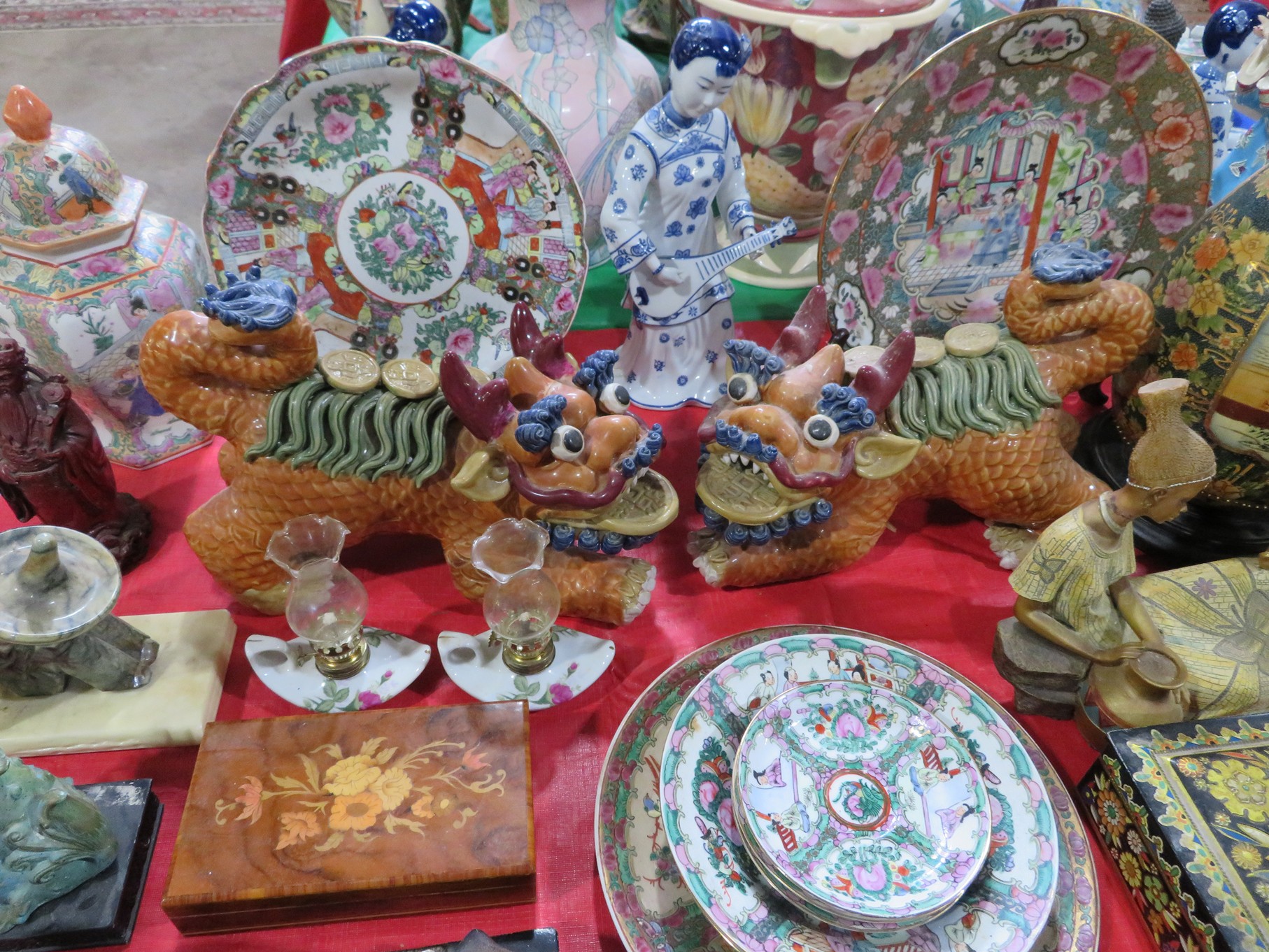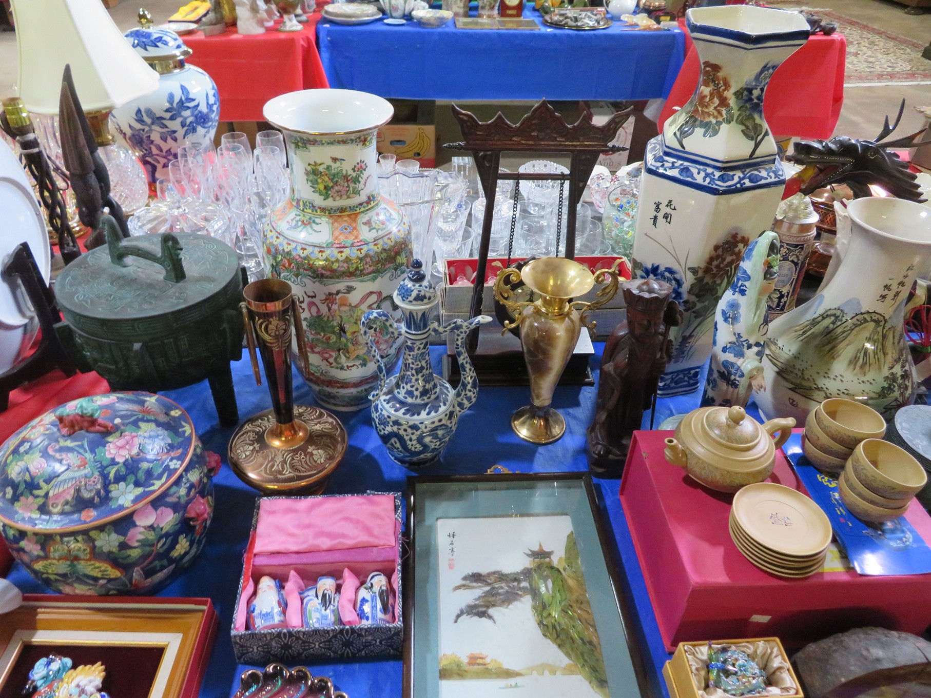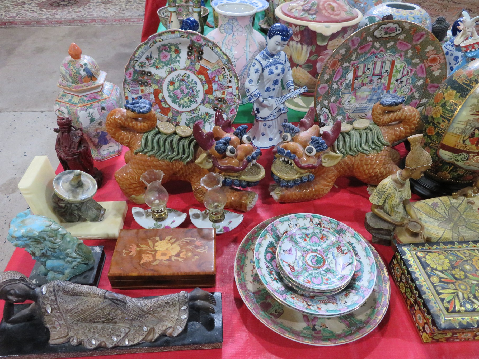 CHINA & GLASS: Lots of excellent Oriental ceramics! Dragon figurine pair; Rose Medallion; Earthenware Oriental teapots; Ginger jars; Blue & white umbrella holder; Oriental floor vases; Wall pockets; Fishbowl planters; Blue & white cake stand; Candlesticks; Decorated egg shape; Lots &lots of vases & planters; Nicely decorated bowl on stand; Rice bowls & much much more!; Teapots; Great pair of elephant garden seats; Floral decorated handled vase pair; Large Hummels; Greek design set; Rabbit; Collectible teacups & saucers; Dresser tray; Hummel ashtray; Fine dinnerware sets; Capodimonte style floral candleholders; Wedgwood; Covered casserole; Tidbit server; Floral name plate holder set; Stein; Trays; Dresden figures; Vases of all types; Lenox; Pitcher; S&P shakers; Equine decorated mug set; Gaping mouth fish planter pair; Transferware bowls; Holly leaf mixing bowl; Green lustres with gold accents; Perfume bottle; Crystal lamp; Paperweight; Waterford tumblers; Green cut to clear candy bowl; Fine crystal jar with lid; Art glass bowls; Crystal decanters; Glass candies; Crystal box with lid; Art glass snail; Swan server; Cordials; Art glass pistol; Lots of vases; S&P shakers; Ruby cut to clear decanter; Art glass vase; Ruby cut to clear pitcher & glasses; Shaving mug & brush; Blue glass horse; Crystal candlesticks; Basket; Tall cruet; Marmalade jar; Divided dish; Biscuit jars; Crystal bowls; Sugar & creamer; Pyrex measure and more!