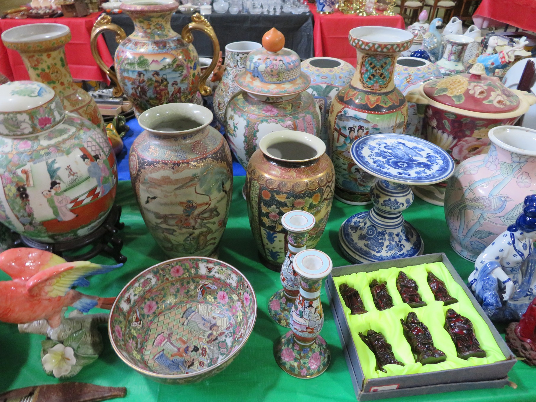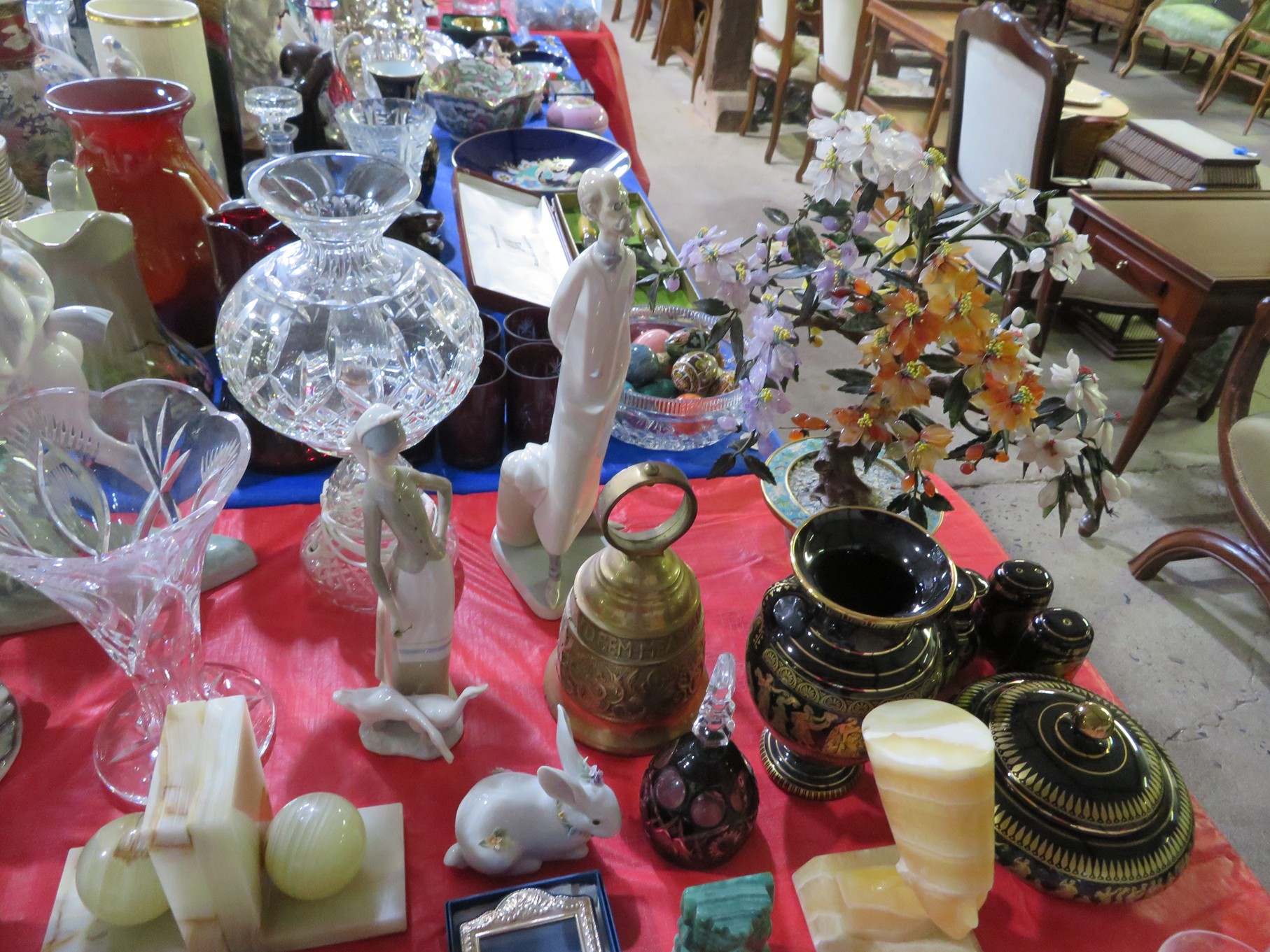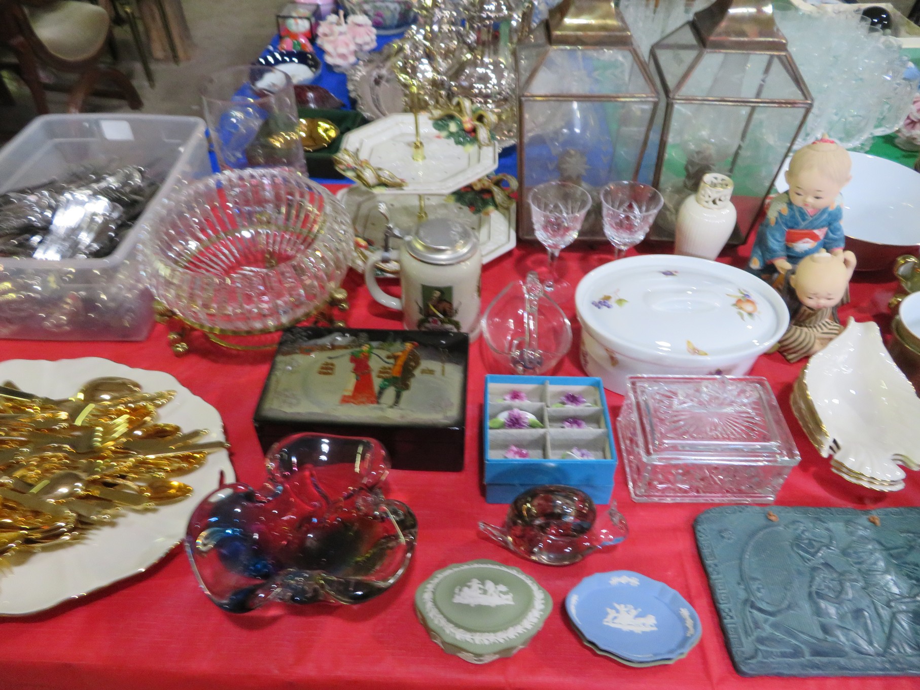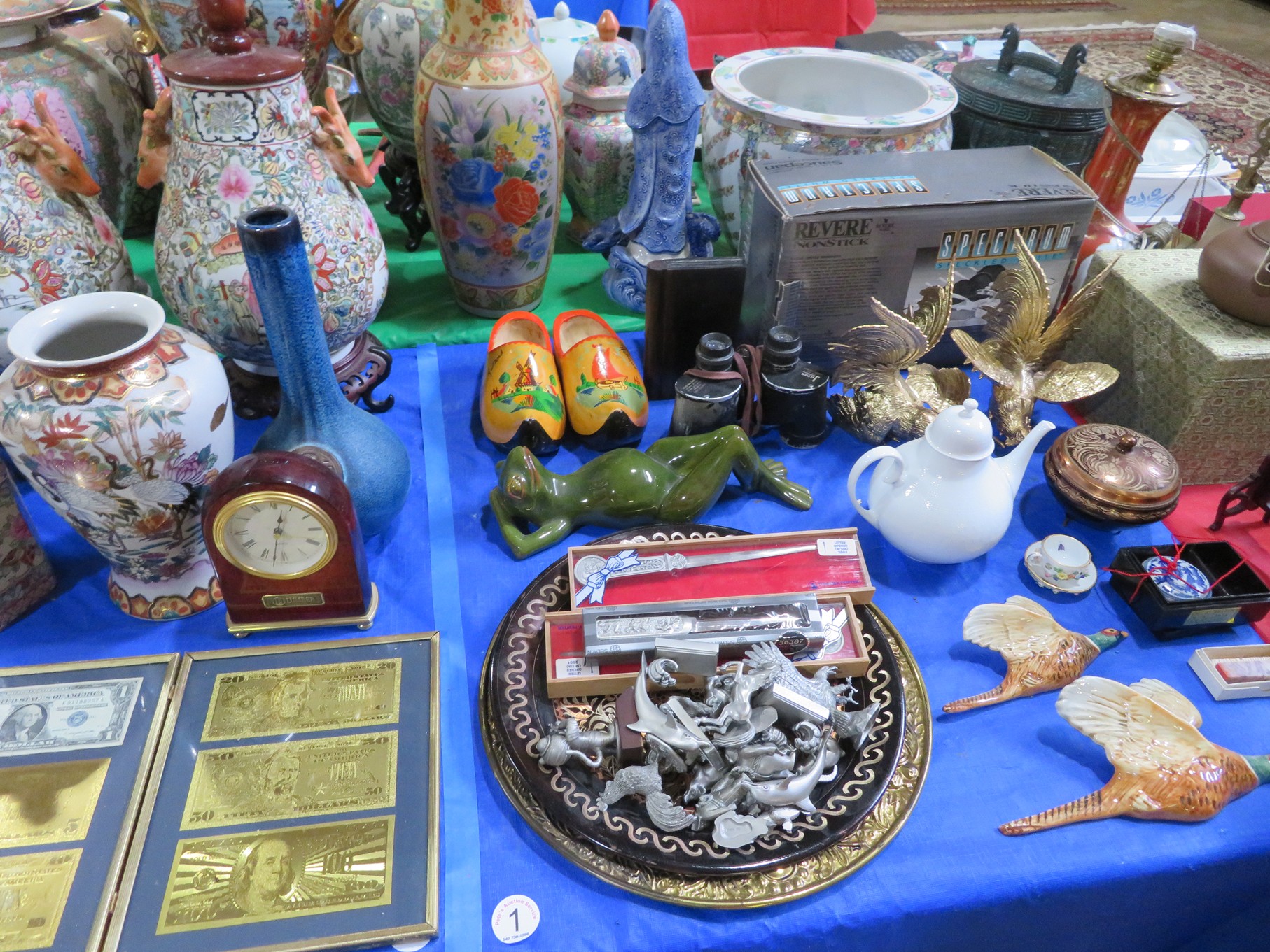 CHINA & GLASS: Lots of excellent Oriental ceramics! Dragon figurine pair; Rose Medallion; Earthenware Oriental teapots; Ginger jars; Blue & white umbrella holder; Oriental floor vases; Wall pockets; Fishbowl planters; Blue & white cake stand; Candlesticks; Decorated egg shape; Lots &lots of vases & planters; Nicely decorated bowl on stand; Rice bowls & much much more!; Teapots; Great pair of elephant garden seats; Floral decorated handled vase pair; Large Hummels; Greek design set; Rabbit; Collectible teacups & saucers; Dresser tray; Hummel ashtray; Fine dinnerware sets; Capodimonte style floral candleholders; Wedgwood; Covered casserole; Tidbit server; Floral name plate holder set; Stein; Trays; Dresden figures; Vases of all types; Lenox; Pitcher; S&P shakers; Equine decorated mug set; Gaping mouth fish planter pair; Transferware bowls; Holly leaf mixing bowl; Green lustres with gold accents; Perfume bottle; Crystal lamp; Paperweight; Waterford tumblers; Green cut to clear candy bowl; Fine crystal jar with lid; Art glass bowls; Crystal decanters; Glass candies; Crystal box with lid; Art glass snail; Swan server; Cordials; Art glass pistol; Lots of vases; S&P shakers; Ruby cut to clear decanter; Art glass vase; Ruby cut to clear pitcher & glasses; Shaving mug & brush; Blue glass horse; Crystal candlesticks; Basket; Tall cruet; Marmalade jar; Divided dish; Biscuit jars; Crystal bowls; Sugar & creamer; Pyrex measure and more!