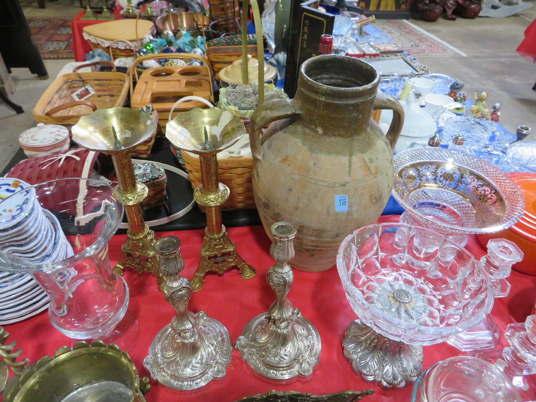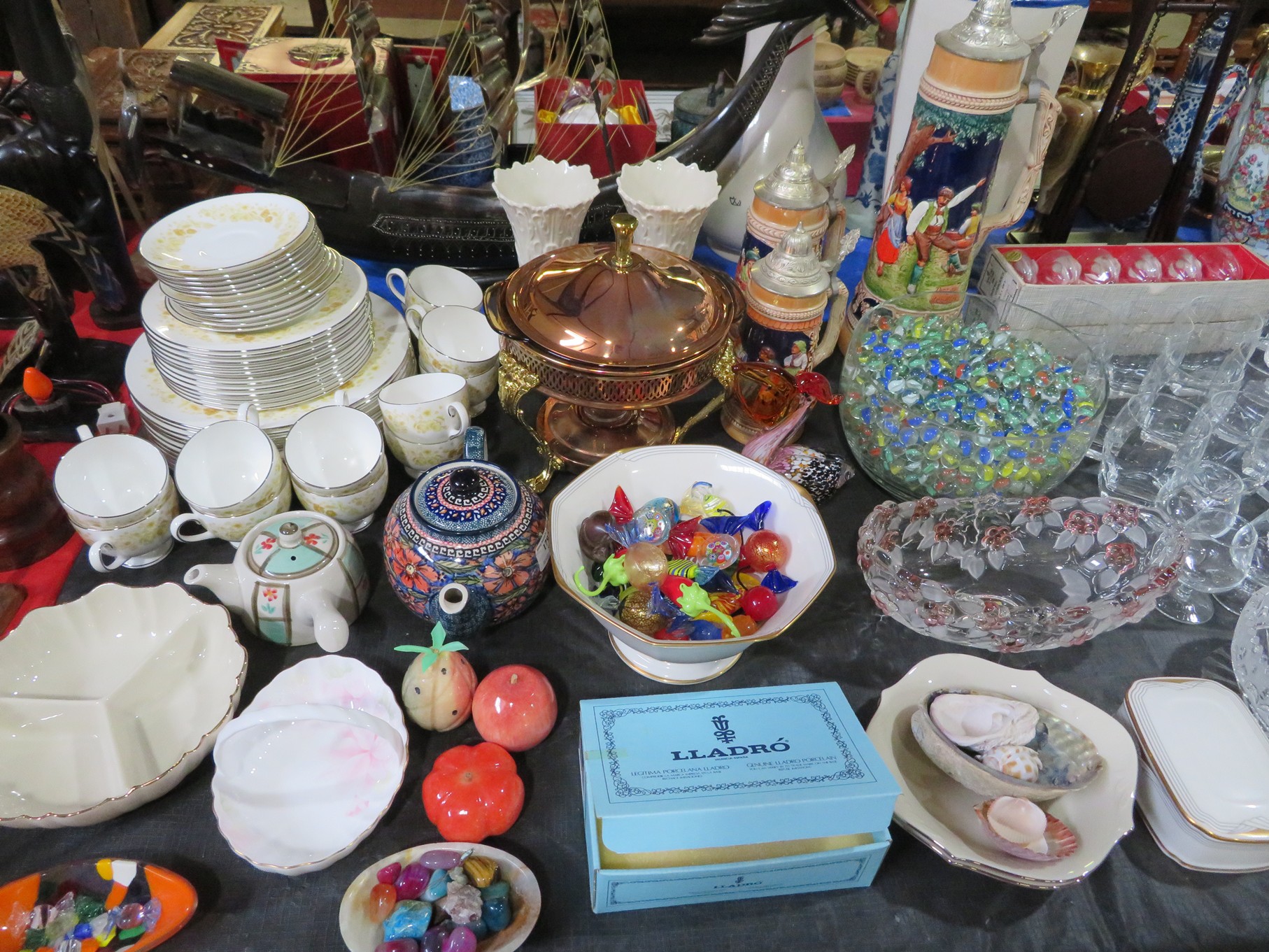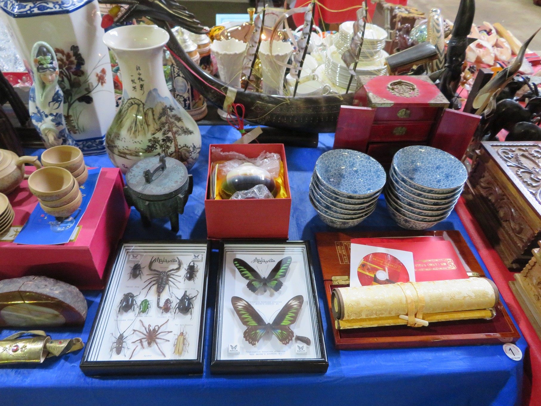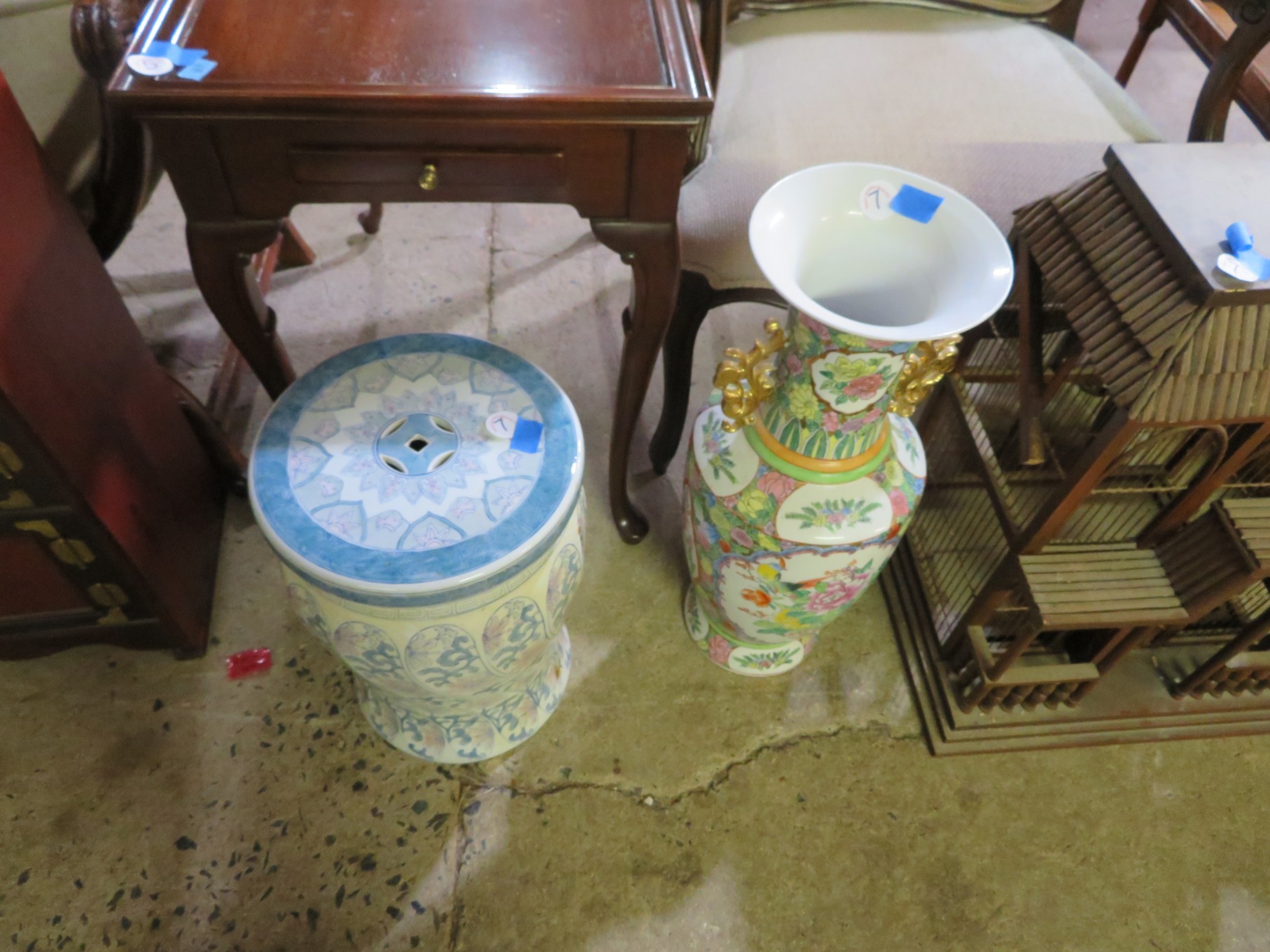 CHINA & GLASS: Lots of excellent Oriental ceramics! Dragon figurine pair; Rose Medallion; Earthenware Oriental teapots; Ginger jars; Blue & white umbrella holder; Oriental floor vases; Wall pockets; Fishbowl planters; Blue & white cake stand; Candlesticks; Decorated egg shape; Lots &lots of vases & planters; Nicely decorated bowl on stand; Rice bowls & much much more!; Teapots; Great pair of elephant garden seats; Floral decorated handled vase pair; Large Hummels; Greek design set; Rabbit; Collectible teacups & saucers; Dresser tray; Hummel ashtray; Fine dinnerware sets; Capodimonte style floral candleholders; Wedgwood; Covered casserole; Tidbit server; Floral name plate holder set; Stein; Trays; Dresden figures; Vases of all types; Lenox; Pitcher; S&P shakers; Equine decorated mug set; Gaping mouth fish planter pair; Transferware bowls; Holly leaf mixing bowl; Green lustres with gold accents; Perfume bottle; Crystal lamp; Paperweight; Waterford tumblers; Green cut to clear candy bowl; Fine crystal jar with lid; Art glass bowls; Crystal decanters; Glass candies; Crystal box with lid; Art glass snail; Swan server; Cordials; Art glass pistol; Lots of vases; S&P shakers; Ruby cut to clear decanter; Art glass vase; Ruby cut to clear pitcher & glasses; Shaving mug & brush; Blue glass horse; Crystal candlesticks; Basket; Tall cruet; Marmalade jar; Divided dish; Biscuit jars; Crystal bowls; Sugar & creamer; Pyrex measure and more!