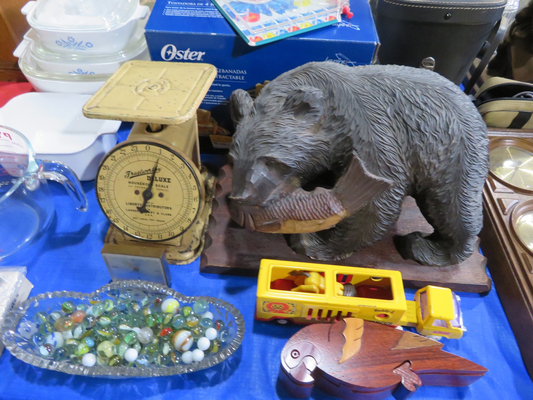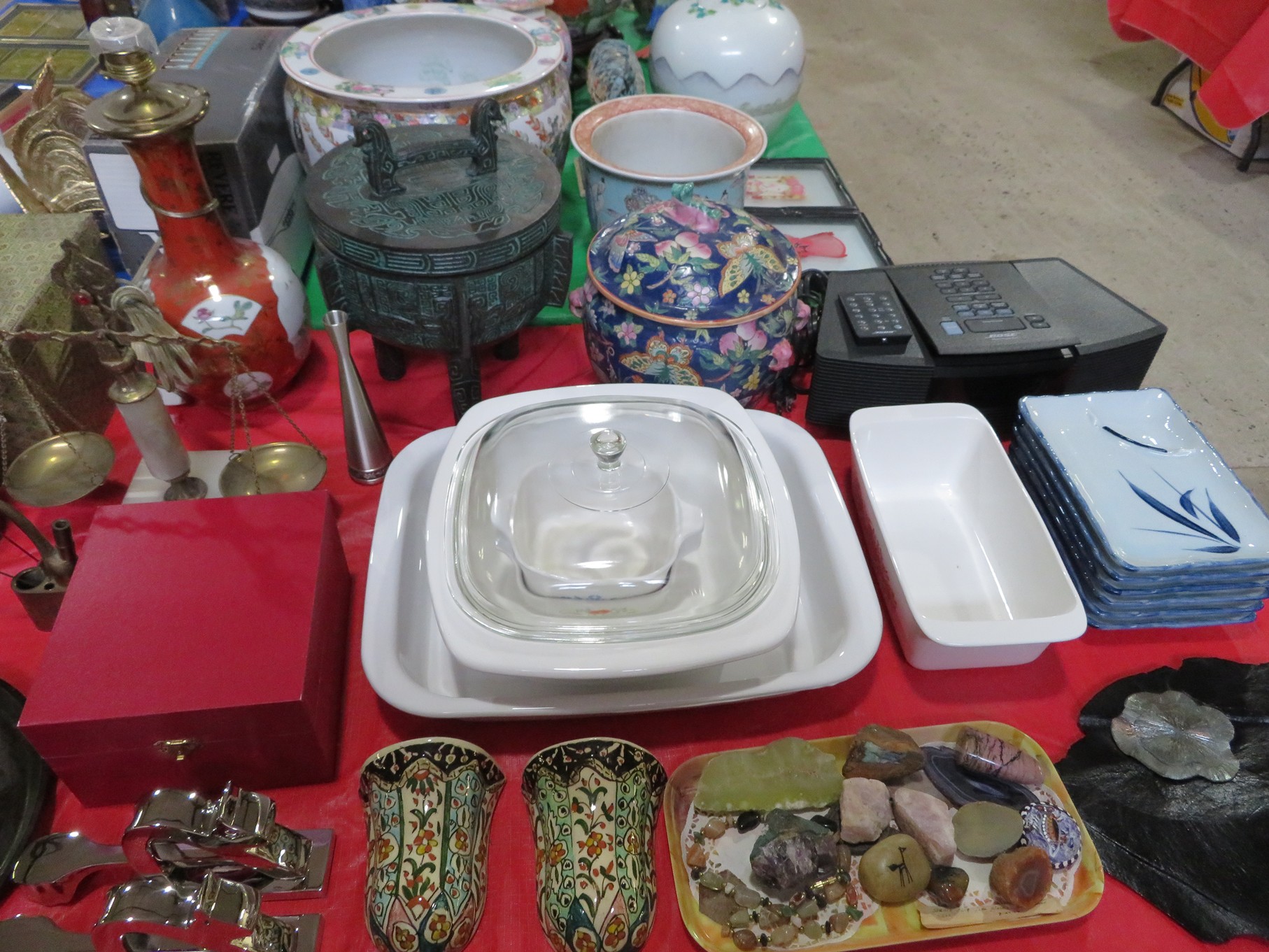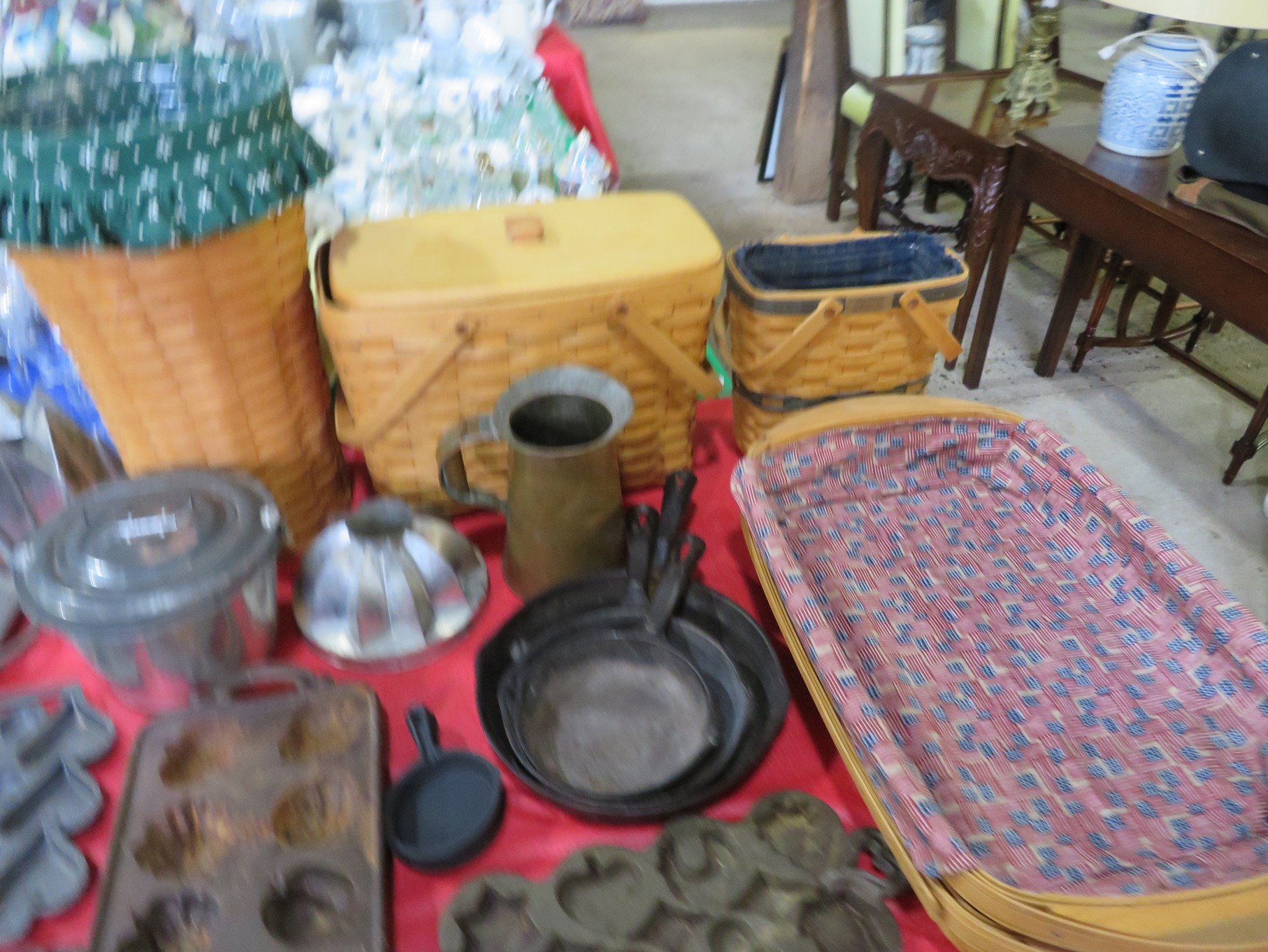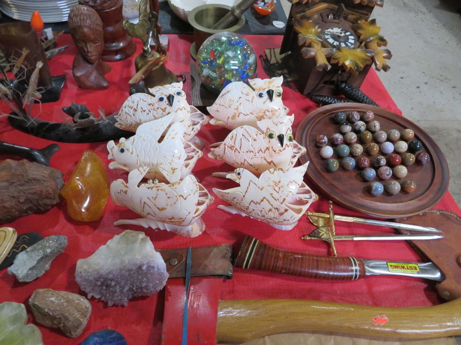 MORE: Smoking pipe collection including meerschaum & carved faces; Pipe rests; Acoustic guitar; Violins; Oriental swords on display; Milk can; Agate bookends; Large metal bell; Carving set in box; Decorated eggs; Brass candlesticks; Cameras & accessories; Horse figurines; Beaded moccasins & pipe; Fairy lamps; Foo dogs; Dagger; Knife; Framed currency; Wooden shoes; Bose; Polished stones; Napkin rings; Parrot shape wooden locking box puzzle; Brass mortar & pestle; Cast iron bulldog doorstop; Cast iron skillets & griddle; Miniature frying pan; Molds; Bookends; Brass match holder; Jewelry boxes; Desk blotter set; Pen rest; Brass candleholders; Cigar box; Wooden canister; Miniature cannon; Old keys; Brass spittoons; Large brass pail; Old jar full of matchbooks; Hand-painted checkerboard; Hand saw; Binoculars; Letter openers; Pewter miniatures; Embroidery on silk; Balance scales; Carved jade; Opium pipe; Masks; Stone grapes; Stone vase; Tetsubin; Corning casseroles with lids; Depression spice shaker set (8); Granite ware lunch tote; Granite ware basin; Large granite ware coffee pot; More granite ware; LeCreuset cookware set; Revere Spectrum in box; Old metal mug; Large assortment of white with blue trim enameled cookware-funnel, pots with lids, teapots, coffeepot, measure, cream cans, double boiler & more; Measuring cup set; Copper chafing dish; Longaberger baskets; Copper bowl; Scales; Cloisonne vases; Stone fruit; Fine & costume jewelry; Cigarette case; Jewelry boxes; Wonderful large mouth crock with blue; Pottery milk holders; Stoneware jugs; Crocks, some with lids; Inlaid stone trinket boxes; Miniature glass vases on stands; Weather station; Books of postage stamps & Golden Replicas of United States Stamps; Cash register bank; Toy cookstove; Marbles; Buddy L Circus truck with animal; Boomerangs; Estwing hatchet; Another hatchet; Geodes & mineral specimens; Cuckoo clock; Fantastic wall clocks; Seashells carved into sea life; Outdoor furniture! Polywood table & umbrella with rotating chairs; Porch rockers; Side tables; Lounge chairs; Cast iron garden seats, bench & table; Small garden bench; Tile top table & chair; Another fine patio set; Garden frogs; Wrought iron patio set; Wrought iron tea cart; Wire furniture; Baker’s rack; Tool chest with contents; Coolers; Toolbox & much much more!