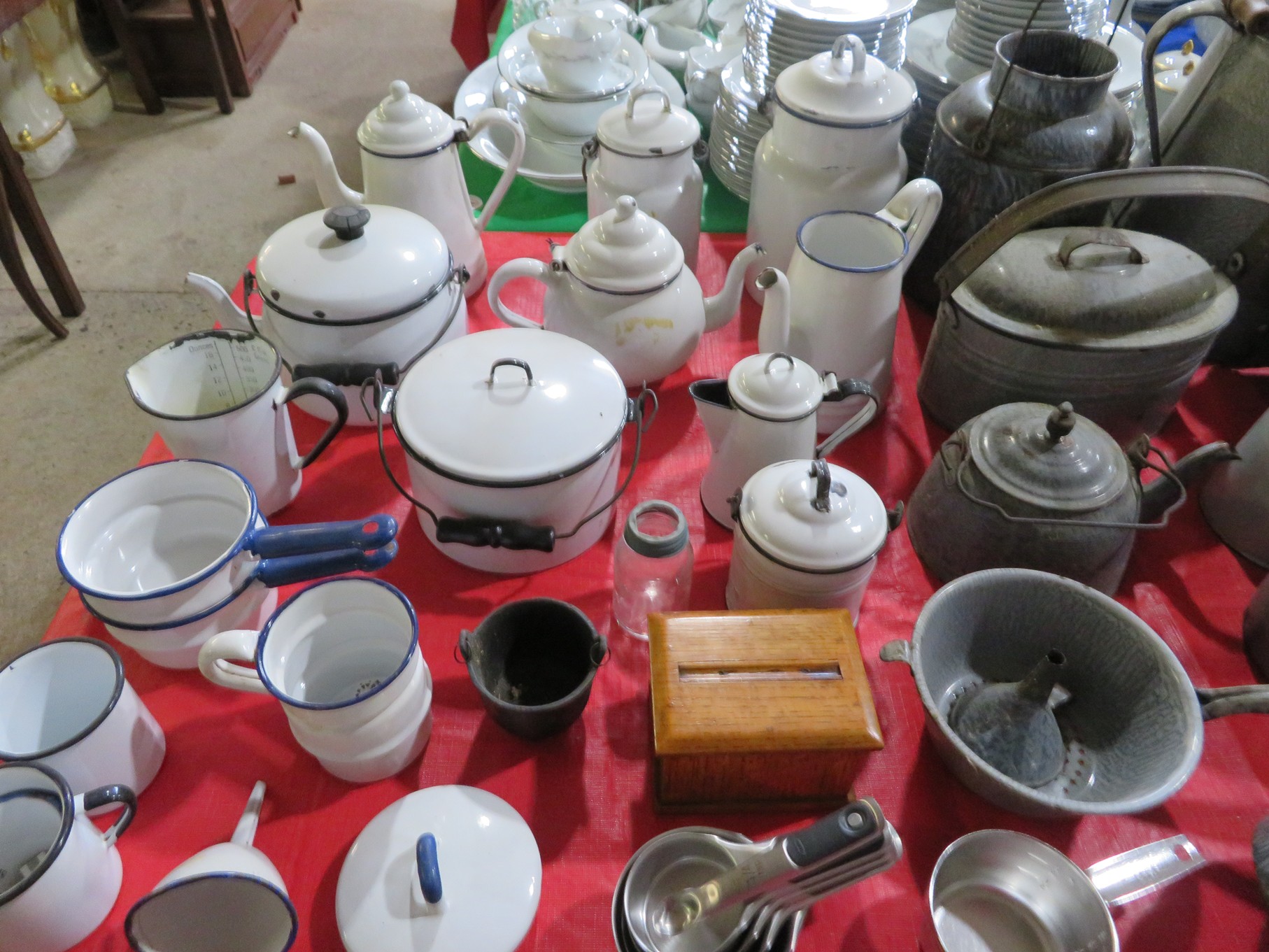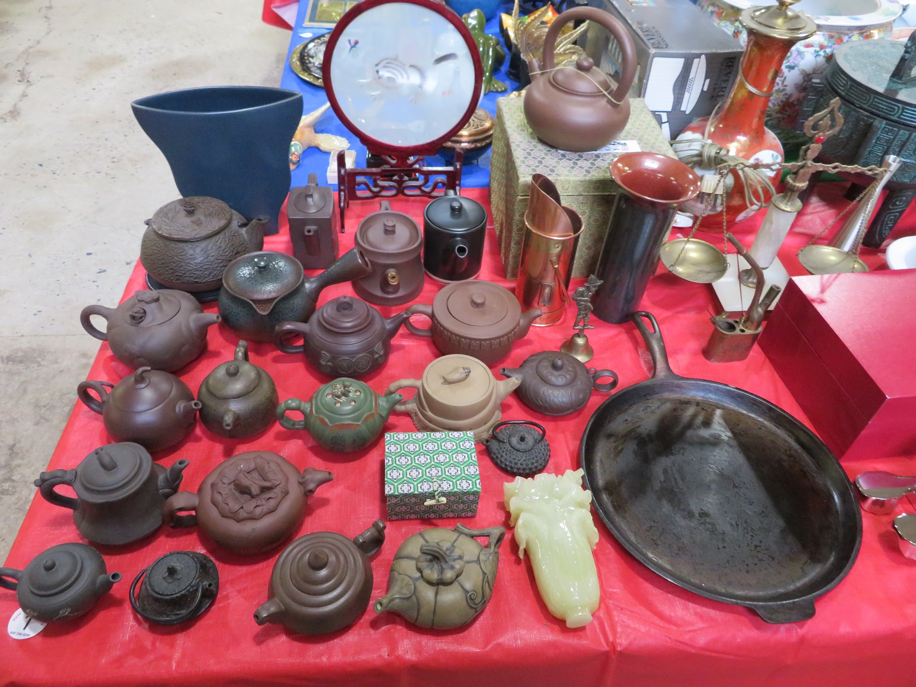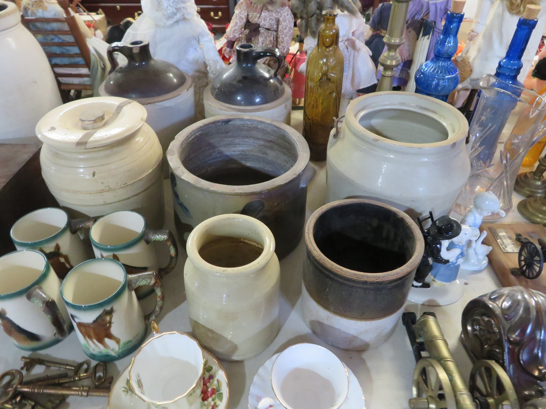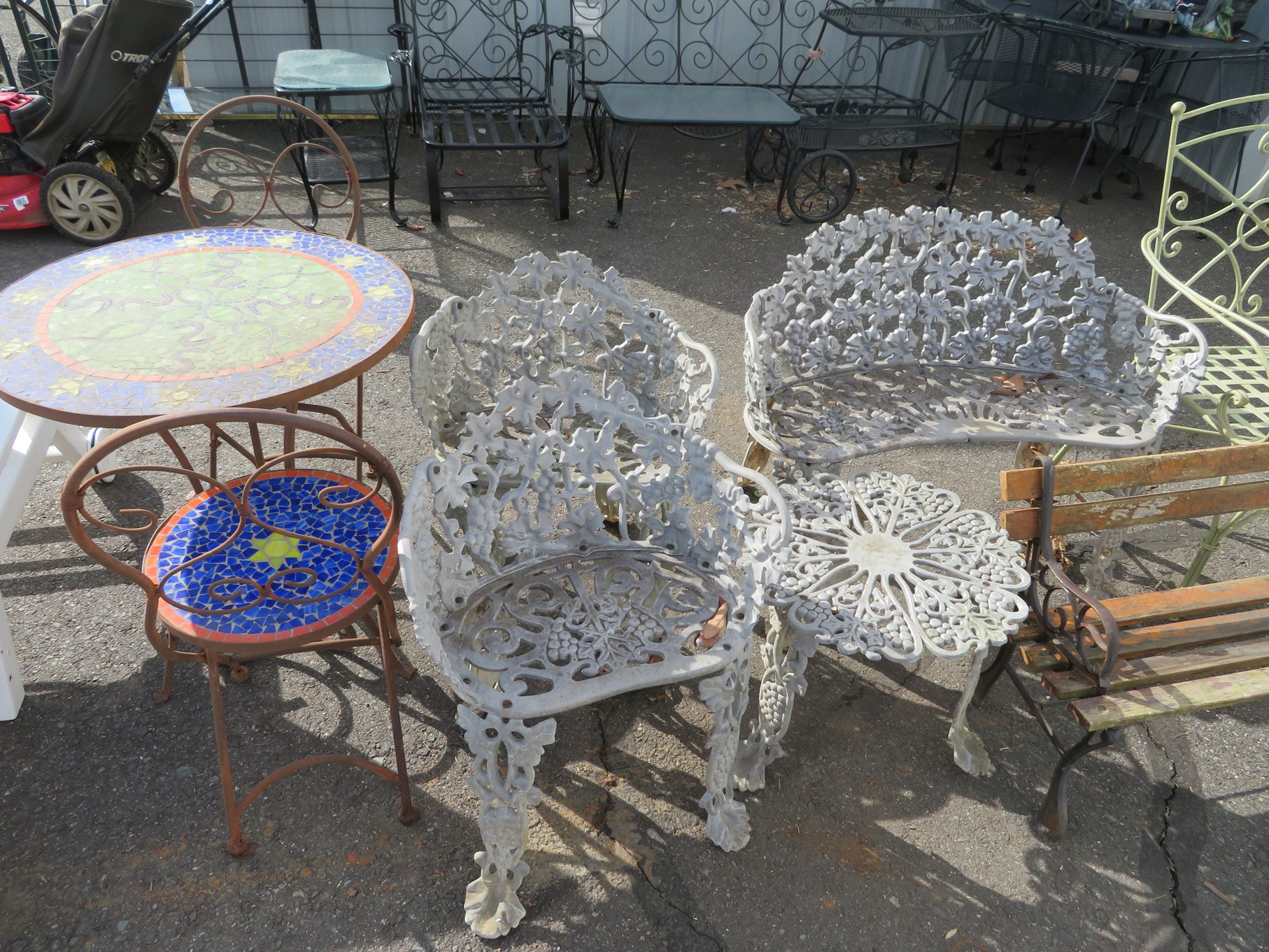 MORE: Smoking pipe collection including meerschaum & carved faces; Pipe rests; Acoustic guitar; Violins; Oriental swords on display; Milk can; Agate bookends; Large metal bell; Carving set in box; Decorated eggs; Brass candlesticks; Cameras & accessories; Horse figurines; Beaded moccasins & pipe; Fairy lamps; Foo dogs; Dagger; Knife; Framed currency; Wooden shoes; Bose; Polished stones; Napkin rings; Parrot shape wooden locking box puzzle; Brass mortar & pestle; Cast iron bulldog doorstop; Cast iron skillets & griddle; Miniature frying pan; Molds; Bookends; Brass match holder; Jewelry boxes; Desk blotter set; Pen rest; Brass candleholders; Cigar box; Wooden canister; Miniature cannon; Old keys; Brass spittoons; Large brass pail; Old jar full of matchbooks; Hand-painted checkerboard; Hand saw; Binoculars; Letter openers; Pewter miniatures; Embroidery on silk; Balance scales; Carved jade; Opium pipe; Masks; Stone grapes; Stone vase; Tetsubin; Corning casseroles with lids; Depression spice shaker set (8); Granite ware lunch tote; Granite ware basin; Large granite ware coffee pot; More granite ware; LeCreuset cookware set; Revere Spectrum in box; Old metal mug; Large assortment of white with blue trim enameled cookware-funnel, pots with lids, teapots, coffeepot, measure, cream cans, double boiler & more; Measuring cup set; Copper chafing dish; Longaberger baskets; Copper bowl; Scales; Cloisonne vases; Stone fruit; Fine & costume jewelry; Cigarette case; Jewelry boxes; Wonderful large mouth crock with blue; Pottery milk holders; Stoneware jugs; Crocks, some with lids; Inlaid stone trinket boxes; Miniature glass vases on stands; Weather station; Books of postage stamps & Golden Replicas of United States Stamps; Cash register bank; Toy cookstove; Marbles; Buddy L Circus truck with animal; Boomerangs; Estwing hatchet; Another hatchet; Geodes & mineral specimens; Cuckoo clock; Fantastic wall clocks; Seashells carved into sea life; Outdoor furniture! Polywood table & umbrella with rotating chairs; Porch rockers; Side tables; Lounge chairs; Cast iron garden seats, bench & table; Small garden bench; Tile top table & chair; Another fine patio set; Garden frogs; Wrought iron patio set; Wrought iron tea cart; Wire furniture; Baker’s rack; Tool chest with contents; Coolers; Toolbox & much much more!