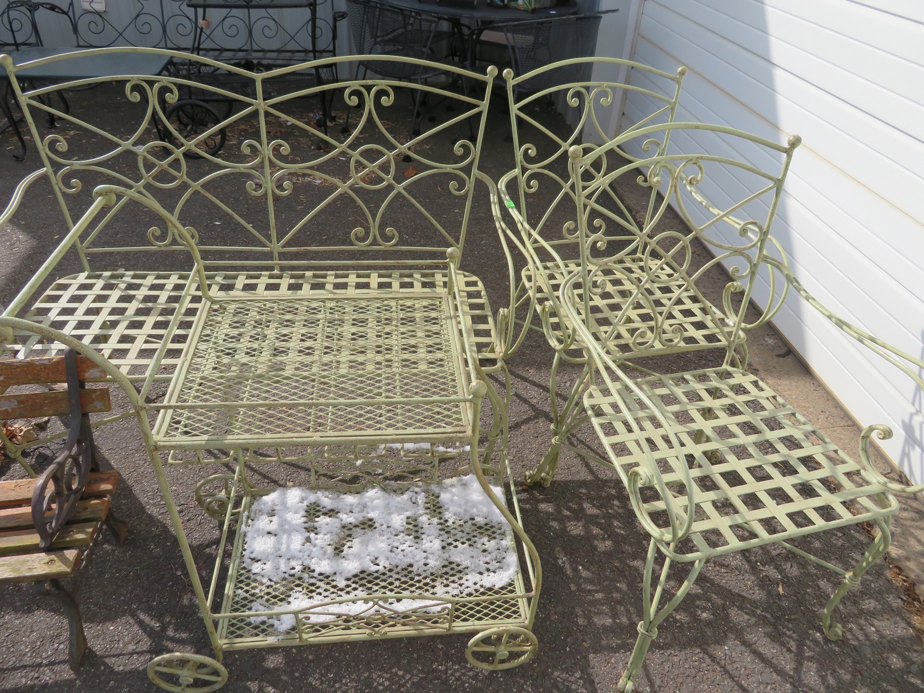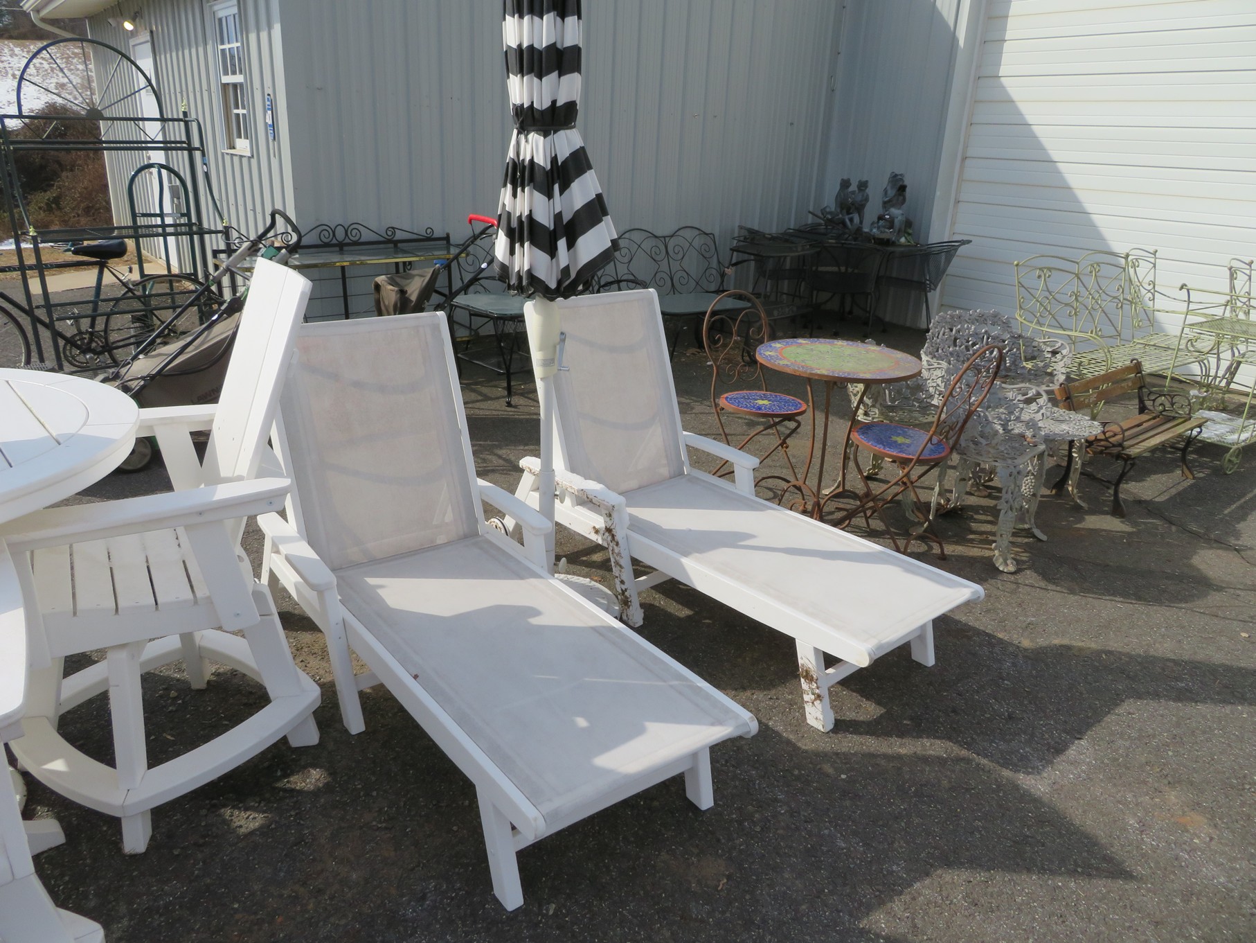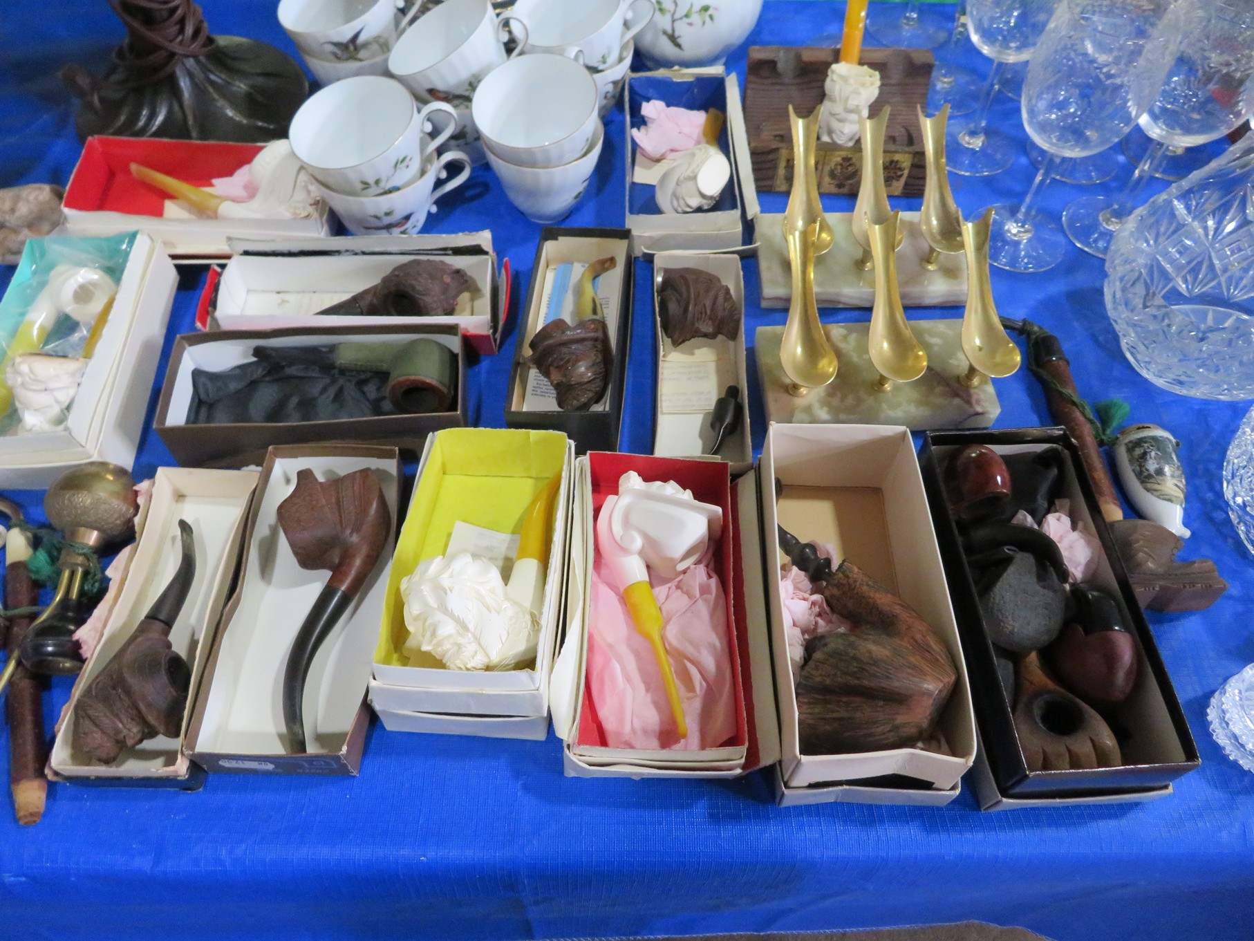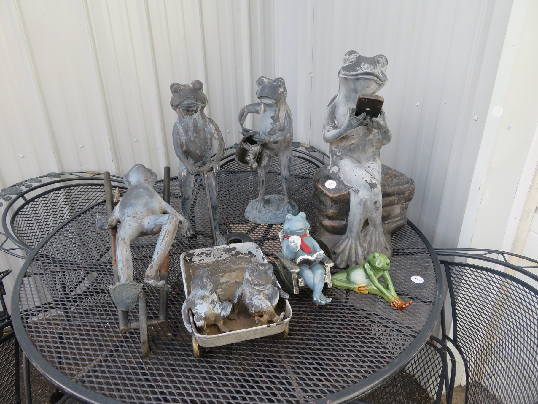 MORE: Smoking pipe collection including meerschaum & carved faces; Pipe rests; Acoustic guitar; Violins; Oriental swords on display; Milk can; Agate bookends; Large metal bell; Carving set in box; Decorated eggs; Brass candlesticks; Cameras & accessories; Horse figurines; Beaded moccasins & pipe; Fairy lamps; Foo dogs; Dagger; Knife; Framed currency; Wooden shoes; Bose; Polished stones; Napkin rings; Parrot shape wooden locking box puzzle; Brass mortar & pestle; Cast iron bulldog doorstop; Cast iron skillets & griddle; Miniature frying pan; Molds; Bookends; Brass match holder; Jewelry boxes; Desk blotter set; Pen rest; Brass candleholders; Cigar box; Wooden canister; Miniature cannon; Old keys; Brass spittoons; Large brass pail; Old jar full of matchbooks; Hand-painted checkerboard; Hand saw; Binoculars; Letter openers; Pewter miniatures; Embroidery on silk; Balance scales; Carved jade; Opium pipe; Masks; Stone grapes; Stone vase; Tetsubin; Corning casseroles with lids; Depression spice shaker set (8); Granite ware lunch tote; Granite ware basin; Large granite ware coffee pot; More granite ware; LeCreuset cookware set; Revere Spectrum in box; Old metal mug; Large assortment of white with blue trim enameled cookware-funnel, pots with lids, teapots, coffeepot, measure, cream cans, double boiler & more; Measuring cup set; Copper chafing dish; Longaberger baskets; Copper bowl; Scales; Cloisonne vases; Stone fruit; Fine & costume jewelry; Cigarette case; Jewelry boxes; Wonderful large mouth crock with blue; Pottery milk holders; Stoneware jugs; Crocks, some with lids; Inlaid stone trinket boxes; Miniature glass vases on stands; Weather station; Books of postage stamps & Golden Replicas of United States Stamps; Cash register bank; Toy cookstove; Marbles; Buddy L Circus truck with animal; Boomerangs; Estwing hatchet; Another hatchet; Geodes & mineral specimens; Cuckoo clock; Fantastic wall clocks; Seashells carved into sea life; Outdoor furniture! Polywood table & umbrella with rotating chairs; Porch rockers; Side tables; Lounge chairs; Cast iron garden seats, bench & table; Small garden bench; Tile top table & chair; Another fine patio set; Garden frogs; Wrought iron patio set; Wrought iron tea cart; Wire furniture; Baker’s rack; Tool chest with contents; Coolers; Toolbox & much much more!