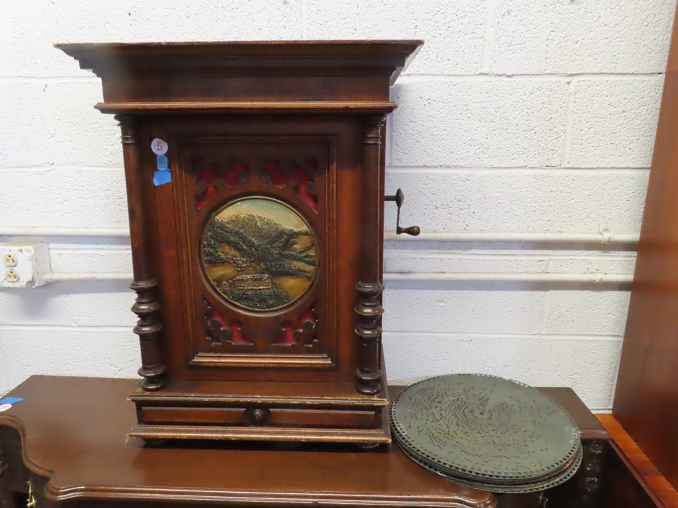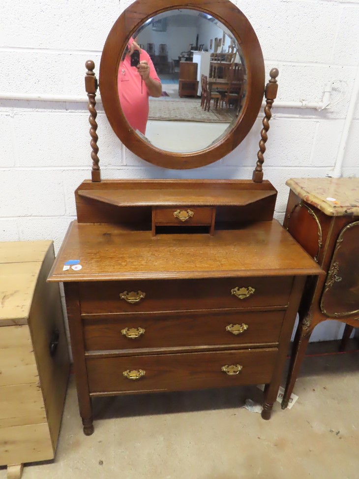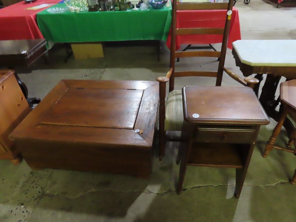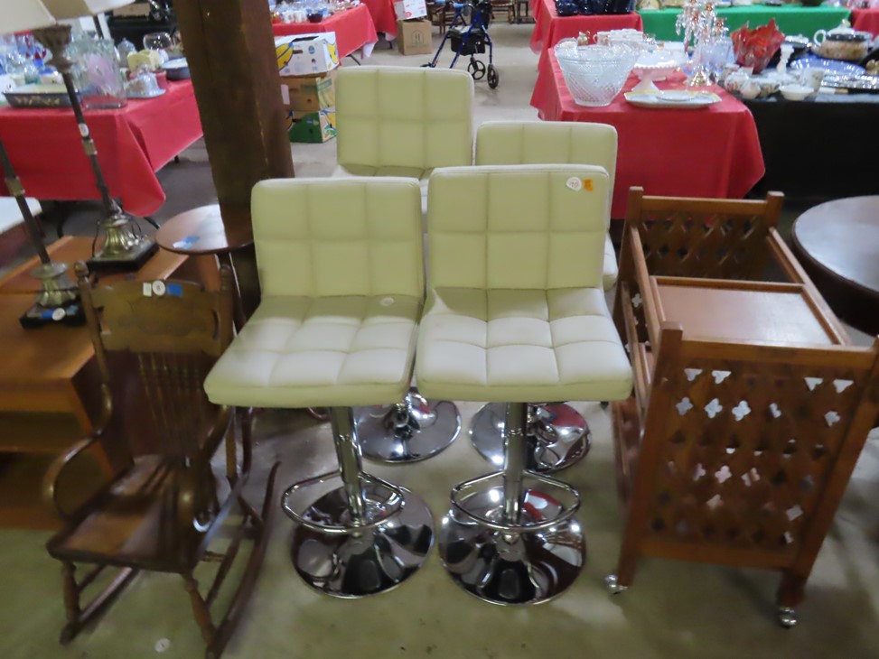 FURNISHINGS: Wonderful map cabinet; 6 drawer Clark’s spool cabinet; Hand crank upright music box with multiple discs; Step-back china cupboard; Dome-top blanket box with drawer; Fantastic dresser with large top and oval mirror in twisted cradle arms; Nice old washstand; Marble top cabinet with painted scene and metal embellishments; Server; Small decorated cabinet; Oak 5 drawer dresser; Nicely decorated buffet; Leather top standing desk; Good old chest on chest; Dining table with 8 Windsor chairs; Marble top table; End table pair; Grandmother rocking chair; Small cabinets; Mirror with tole painted frame; MCM dining table with leaf and 6 chairs; Leather and chrome barstools; Nice Mid-century modern china cabinet with sliding glass doors; Leather easy chairs with nail-head trim; Square dining table with MCM chairs; MCM design chest of drawers and dresser; MCM side tables; Sliding door credenza; MCM file cabinet; Drop front secretary; Grandfather clock with visible pendulums; Server with drop shelf; Nicely decorated & inlaid wooden Geneve music box; Dining table with 8 chairs; Small old desk; Gaming table; Server; 2 drawer spool cabinet; Bedroom set (chest, dresser, nightstand pair); Stained glass panel; Bullseye mirror with eagle topper; Hanging curio box; Old wooden box with dovetail corners; Modern dining table and chairs; Table lamps; Good Oriental rugs; Globe; Hand-painted cabinets; Good old dresser; Large green glass jug; Old radio; Corner cabinet; Painted contemporary server; Pair of white leather chairs; Old child’s trike; Armchair and ottoman; MCM magazine holder; End table pair; Pedestal table; Acoustic guitar with stand; Floor lamps; Rolling cart; Child’s rocking chair; Coffee table; Wall mirror in gilded shaped frame; Lots of occasional tables and chairs; Nice old dough box on legs; Plank bottom chairs; Old drum; Tea cart; Brass tray coffee table; Stressless chair and ottoman; Office chair; Nesting tables; Barstools; Garden seat pair; Wall lighting; Hanging shelf; Birdcage and much much more!