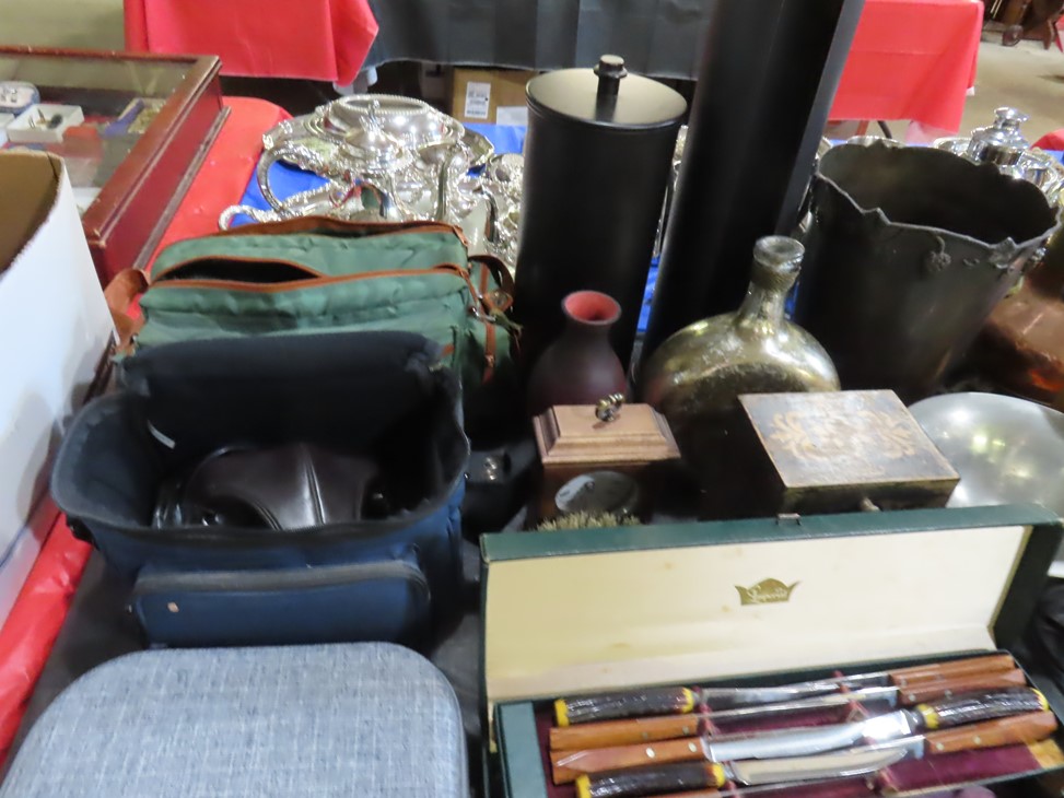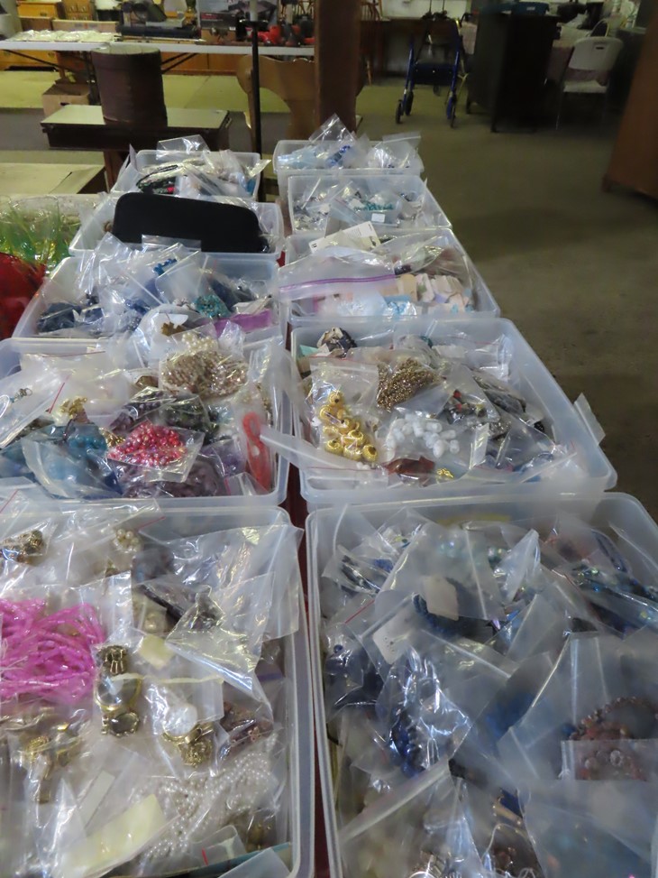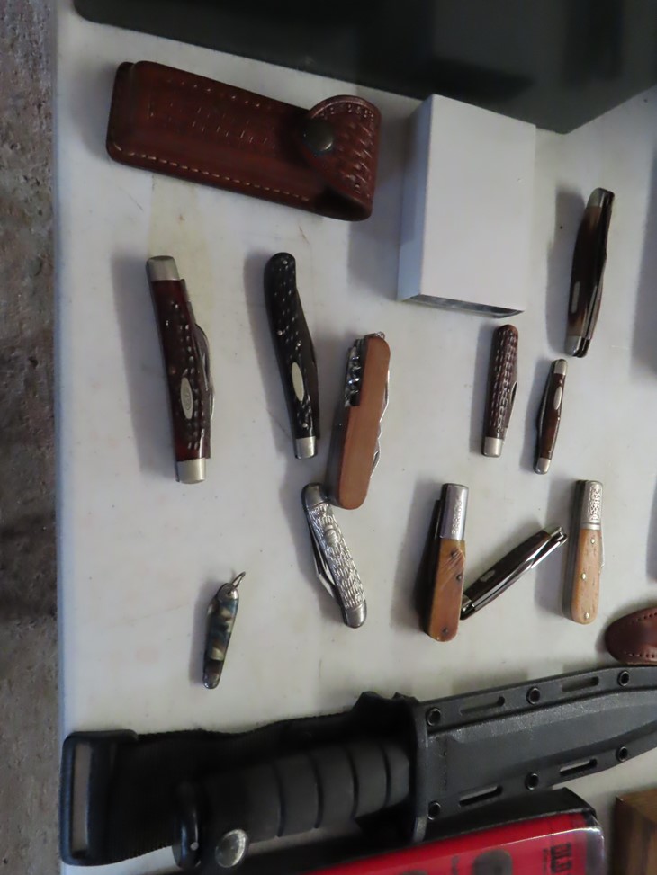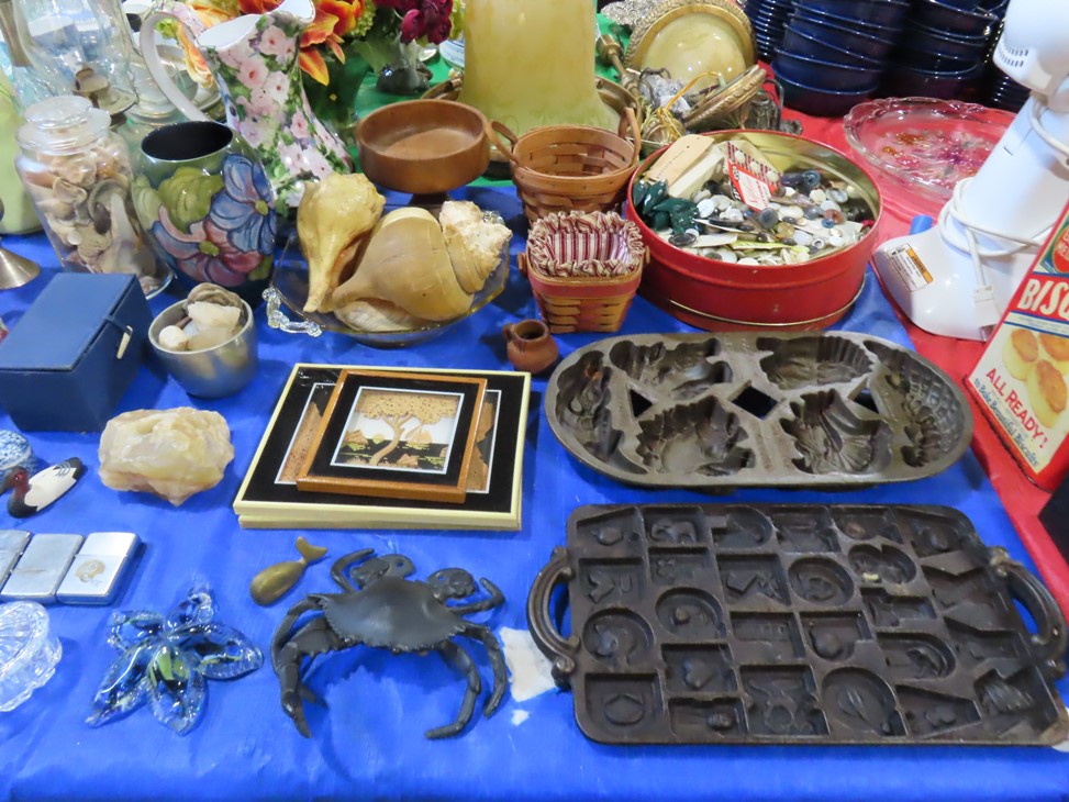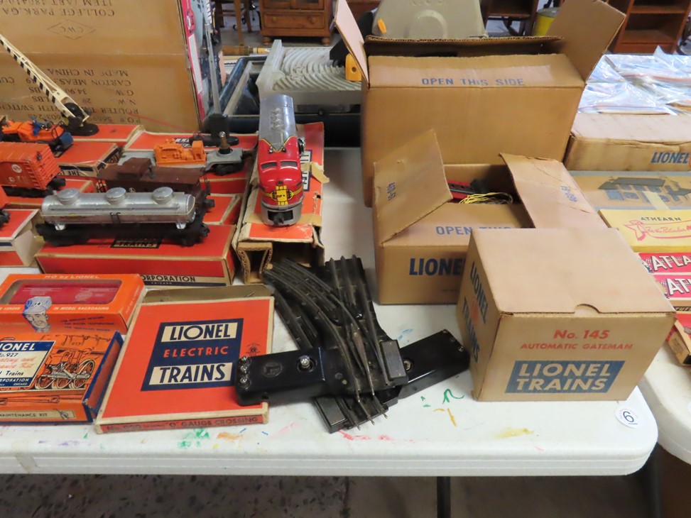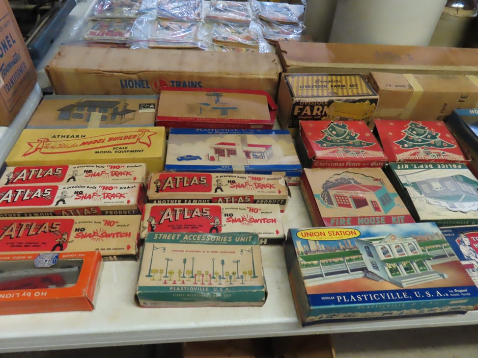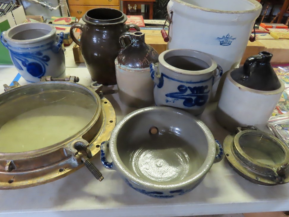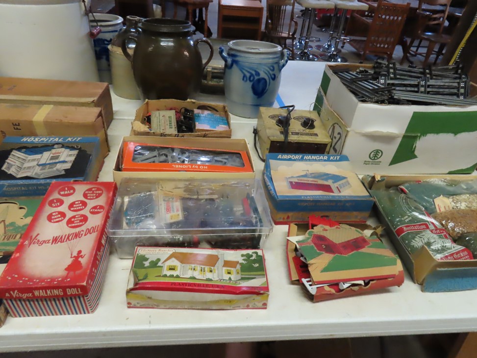 MORE: Brass tricorn candleholder with snuffer cap; More brass candlesticks; Copper chafing dish; Copper urn; Copper utensils; Copper mug; Steak knives with antler handles in case; Decorated wood box; Old spool; Marble mortar & pestle; Grinding bowl & stone; Aluminum ware; Stone boxes; Copper watering can; Metal serving stands; Faux arrangements; Foley food mill; Mincer; Kitchen-Aid mixer; Sifter; Brass whale; Old tools! Hand drill; Wooden planes; Old wrenches; Clamps; Hand auger; New Tools! Mastergrip Benchtop Table Router in box; Hedge trimmers; Grinding stone; Bow saw; Fishing pole; Drum Sanding kit; Ryobi tile cutter; Brass portholes (large & small); Old comic books; Fantastic Four; Rawhide Kid; Captain Action; Terror Tales; Iron Man & more; Old Lionel train cars with boxes; Lionel track & accessories; Locomotive; Automatic Gateman; Atlas “HO” Snap Switches; Ahearn; Plasticville, U.S.A. Union Station, Police Station, Hospital kit, Street Accessories & more; More old train toys; Old Texaco toy truck; Old horse drawn carriage toy; Virga Walking Doll in box; Stoneware crock with handles; Crocks with cobalt decoration; Stoneware jugs; Old cameras & accessories; Clock; Wastebasket; Tins of buttons; Bellows; Bisquick tin; Singer button holer; Cedar jewelry box; Seashells; Cast iron cookie molds; Longaberger; Stone specimens; Pyrex measuring cup; Enameled cooking pots; Bose radio; Fine & costume jewelry; Jewelry by the boxful & Lots More!