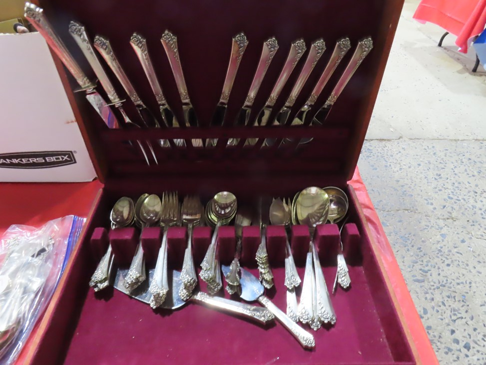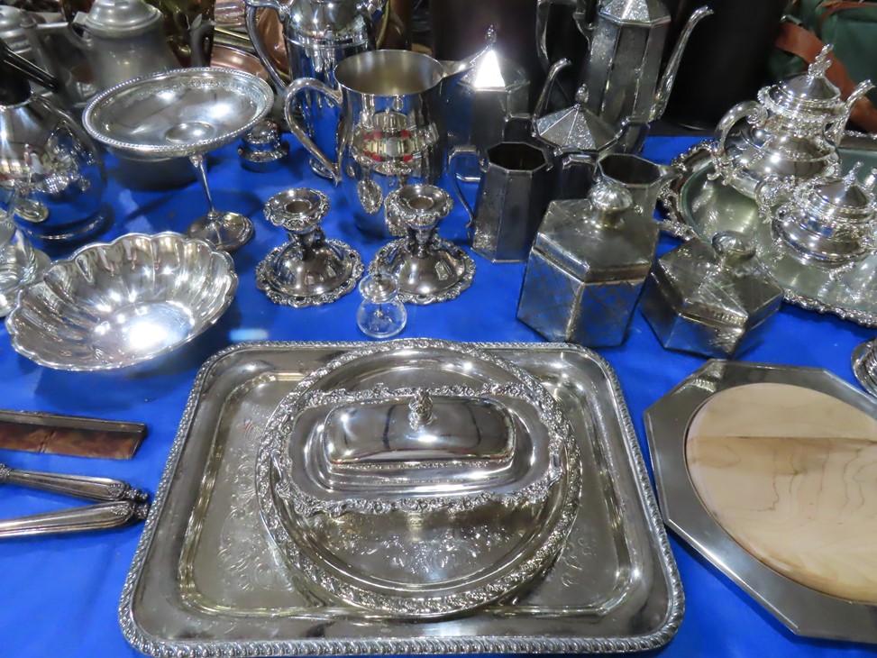 SILVER & ART: STERLING! Sterling tea set on tray; Sterling flatware set; Trays; Coasters; Lidded canisters; Another tea & coffee set; Compote; Candlesticks; Pitcher; Bowl; Dresser set; Lidded butter dish; Marmalade jar; Sugar & creamer set; Utensils; Creamers; More flatware sets; Mug; More silver & silver-plate; Military charge print; Native American print; “Taste of Rappahannock” artwork; Lots more great art & much more!