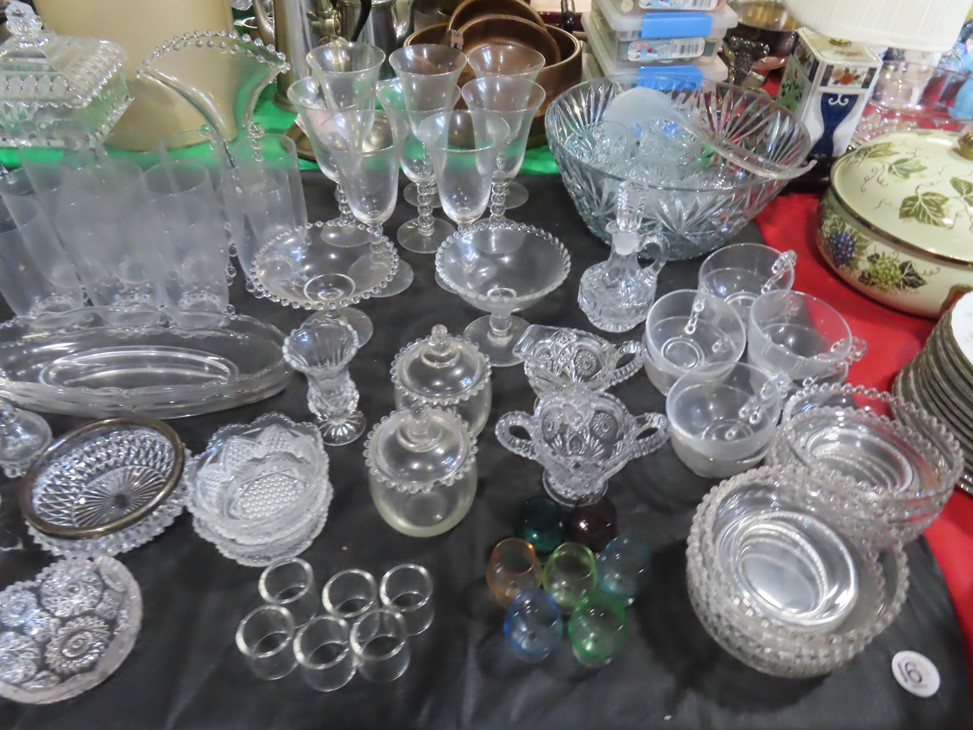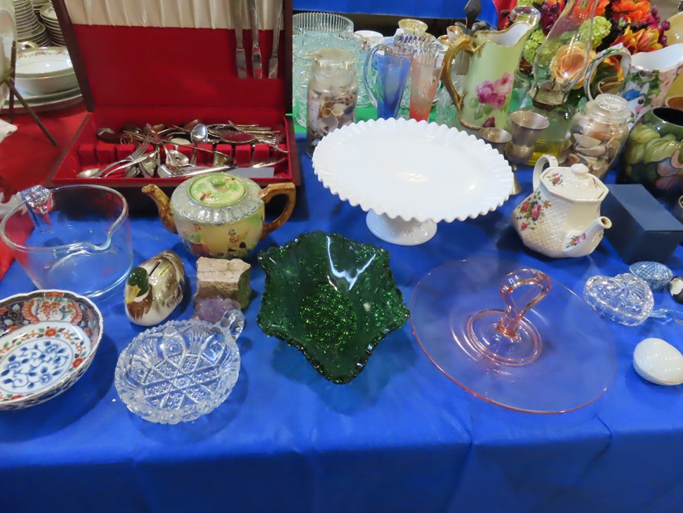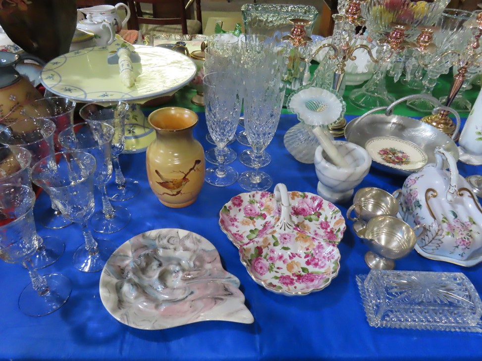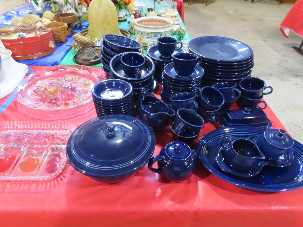 CHINA & GLASS: Moorcroft vase; Limoges; Chocolate pot & cups; Hummels; Blue Danube drink mixing utensils (sieves, muddler & more); Blue Danube rolling pin & salt box; Studio pottery; Mugs with lids & bowls set; Large blue & white lidded tureen; Decorated pitcher; Royal Worcester Evesham tart pan; Hand-painted ceramics; Domed butter dish; Tidbit servers; Footed cake stand with matching server; Covered cheese dish; Tea set with butterflies; Napkin holder with chickens; Pitchers; Trays; Candlesticks; Lenox spice house set; Tea sets; Casseroles in holders; Mixing bowls; Wedgwood; Egg boxes; Collectible teacups & saucers; Dark blue Fiesta dinnerware set; Gravy boat; Demi-tasse set; More Blue Danube & Blue Onion; Ceramic flowers; Silver edged dinnerware set; Ceramic lamps; Fenton compote with ruffled amethyst edge; Fenton Silver Crest large bowls, vases, S&P set, candlesticks, more; Red mottled art glass bowl; Carnival glass bowl; Silvered glass jugs; Candelabras; Sets of crystal stemware; Pale blue sherbet set; Stemware with green base; Carnival glass butter dish; Vases; Hen on Nest; Small cake stand; Decanters; Set of pale yellow stemware; Punch set; Individual salts; Milk glass cake stand; Milk glass hen on nest; Cake stand with glass dome; Egg plate; Chip & dip set; Paperweight; Glass fish; Della Robbia colored fruit trays; Glass starfish; Custard glass miniature sugar & creamer; Candlewick pieces; Lots of good crystal; Divided casserole dishes; Lamp and more!