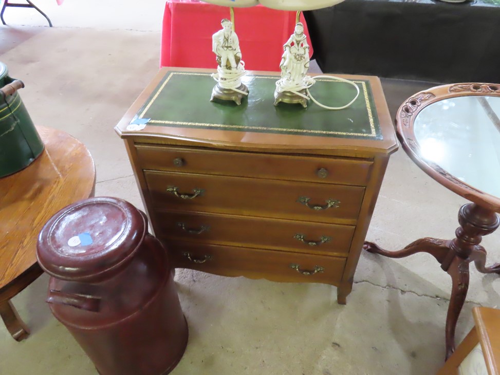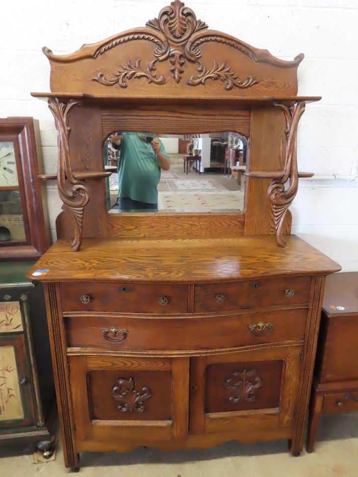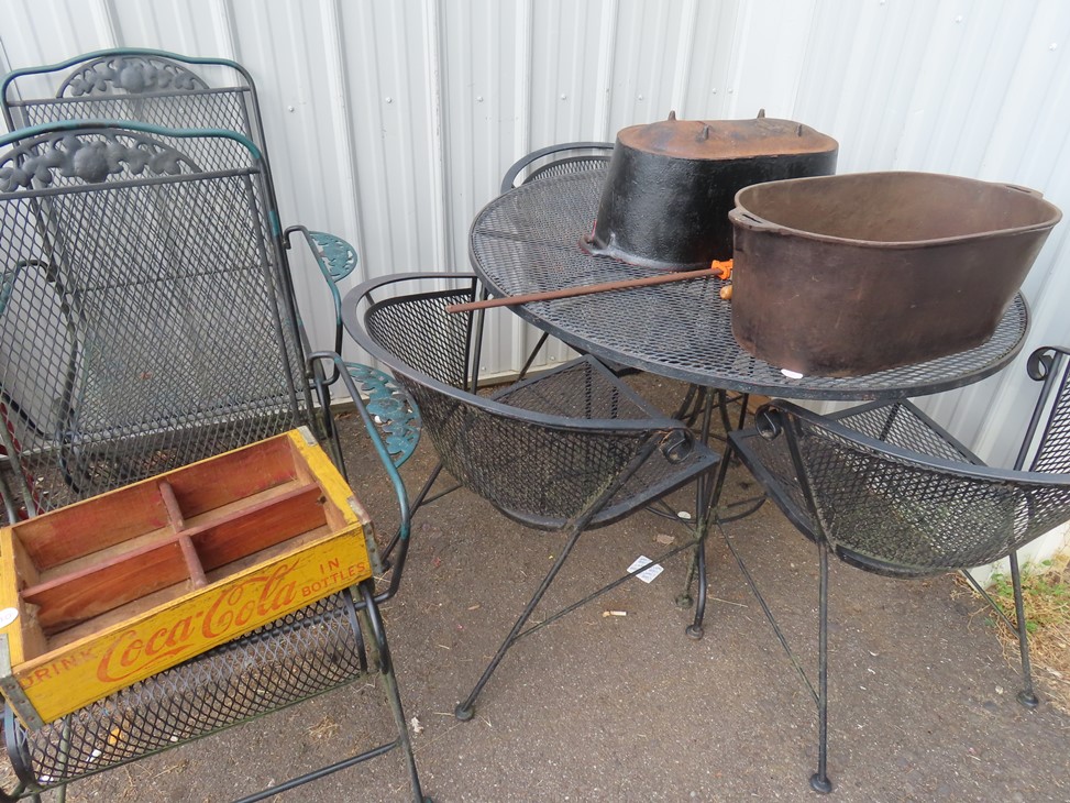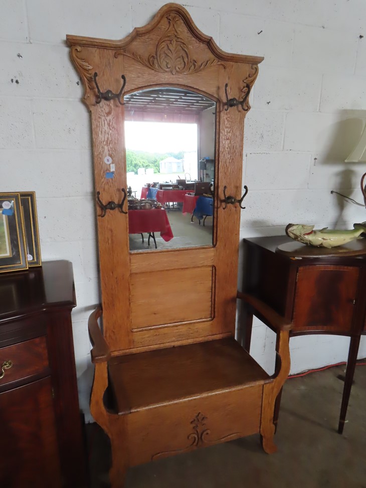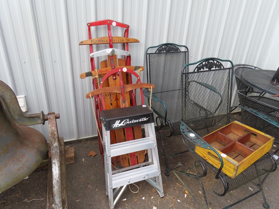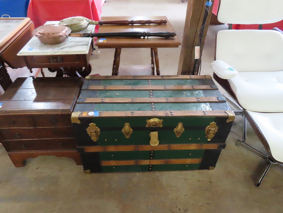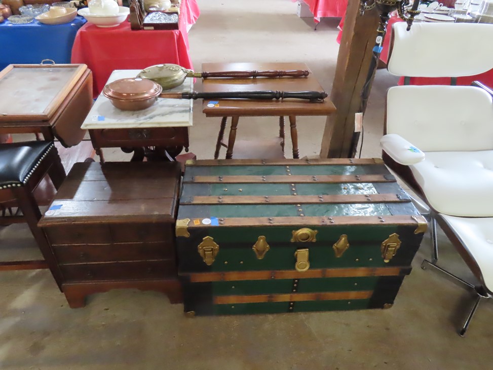 FURNISHINGS: Good old pie safe with punched tins; Bowfront china cabinet; Golden Oak hall tree with lift seat storage; Great desk; Fine small four drawer chest; Good old three drawer chest; Excellent Golden Oak buffet with carvings; Sugar chest with dovetail corners; Tea cart; Bench with unusual spindles; Henkel Harris! Banded edge buffet; Server with pull out shelf; Curio cabinet; Mahogany banded edge table with chairs; Breakfront china cabinet; Three drawer sewing stand; Rocking chairs; Pedestal table; Vanity bench; Smoking stand; Early corner cabinet; Wood bench with old paint; Contemporary modern sculpture metal & glass statement table; MCM leather & chrome seating; Eames style easy chair with ottoman; Padded bench; Round coffee table; Mirror back buffet with wine rack; Double pedestal dining table & chairs; Nice mirror back buffet; Painted cabinet; Drop side end table; Sofa & end table set with woven drawers; Footstool; Leather top chest; Fine old chest of drawers; Grandfather clock; Leather sofa; Special note! A trailer full of decorator items & accents will be sold with the outside box lots! These come from the estate of an interior decorator! Large coffee table; End tables; Cabinets; Child’s chair; Small cabinet; Granny rocker; Ladder back rocker; Nice pair of ceramic urn table lamps with shades; Four drawer chest; Leather top bar stools; Marble top table pair; Flat top trunk; Small chest; Bed warmers; Victorian side table; Floor lamp; Rocking chair; Small bench; Table lamps; Wall mirrors; Good Oriental rugs; Wrought iron patio furniture; Porch rockers; Leaded glass shade lamp with glass stem inserts; Nice old wall clock and much, much more!