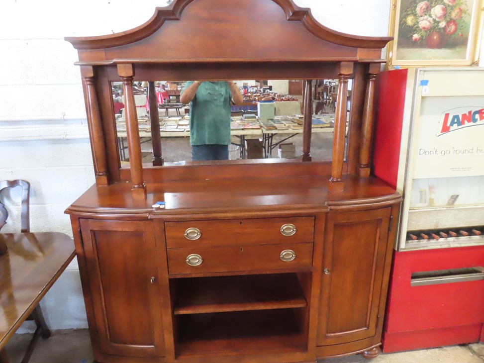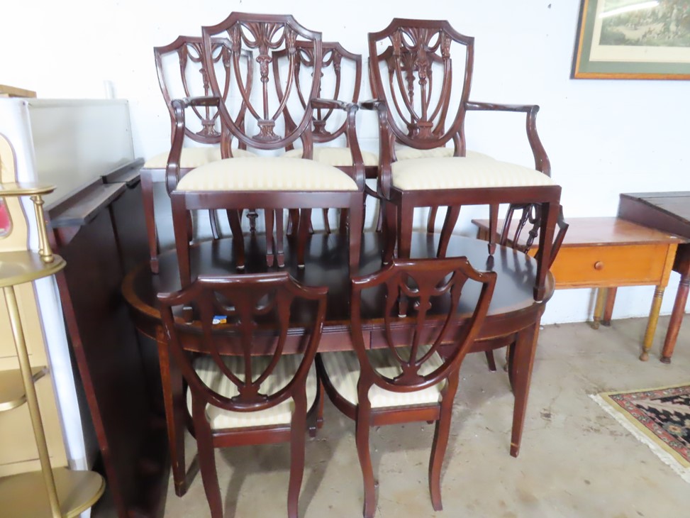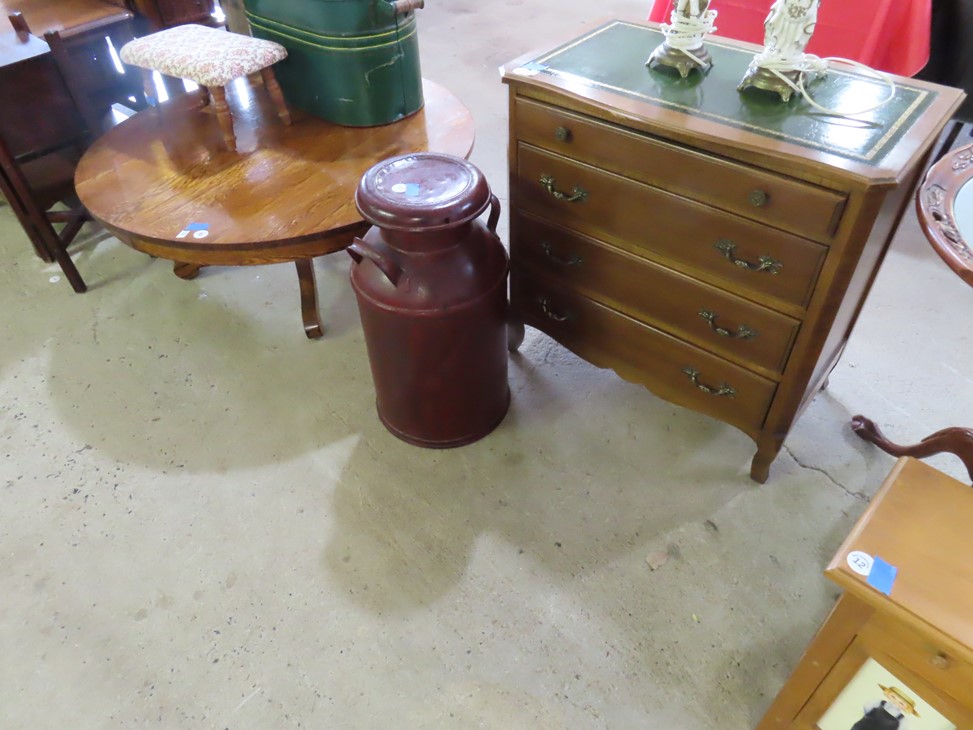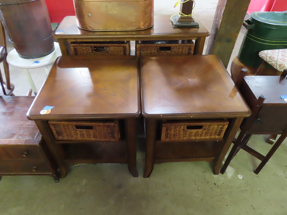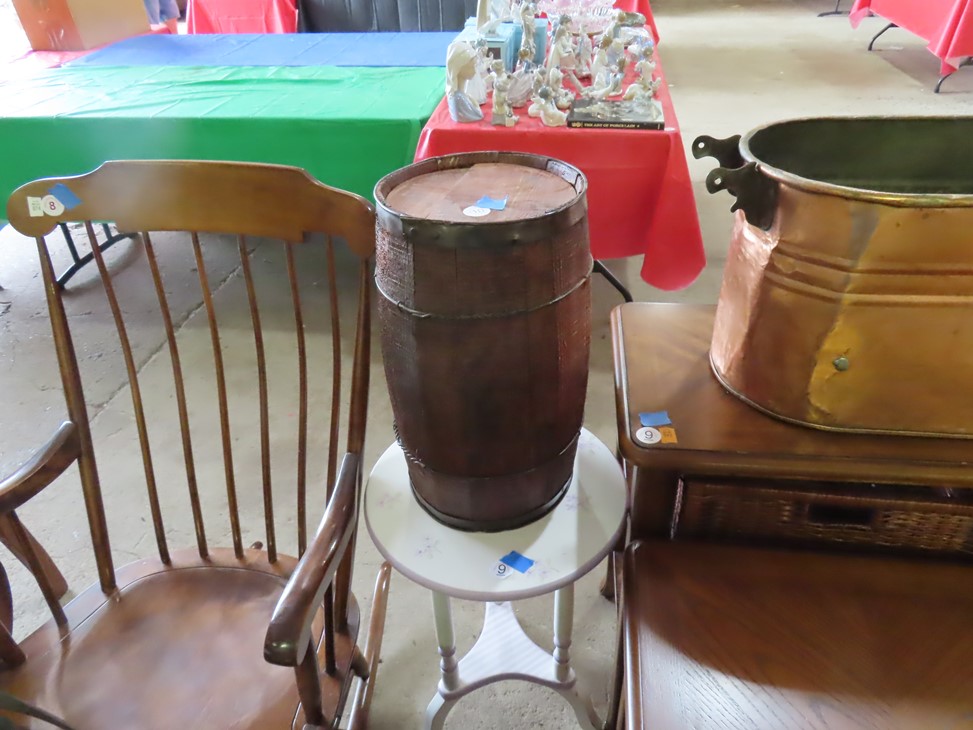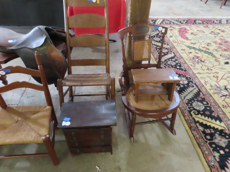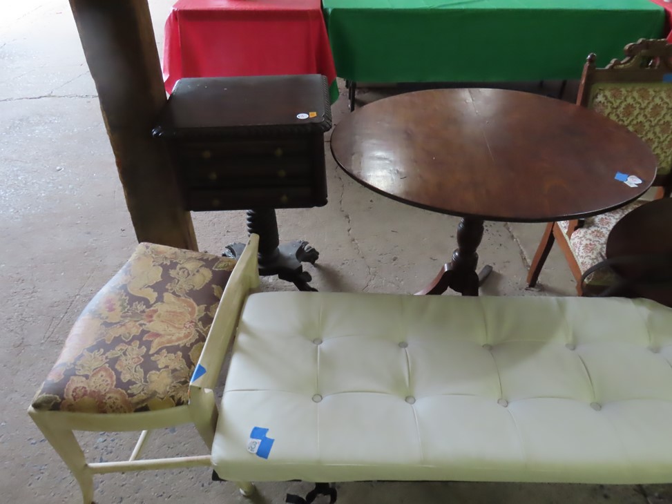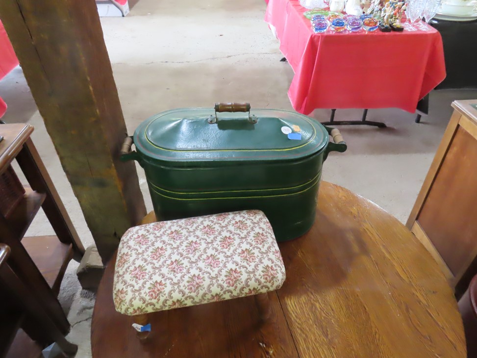 FURNISHINGS: Good old pie safe with punched tins; Bowfront china cabinet; Golden Oak hall tree with lift seat storage; Great desk; Fine small four drawer chest; Good old three drawer chest; Excellent Golden Oak buffet with carvings; Sugar chest with dovetail corners; Tea cart; Bench with unusual spindles; Henkel Harris! Banded edge buffet; Server with pull out shelf; Curio cabinet; Mahogany banded edge table with chairs; Breakfront china cabinet; Three drawer sewing stand; Rocking chairs; Pedestal table; Vanity bench; Smoking stand; Early corner cabinet; Wood bench with old paint; Contemporary modern sculpture metal & glass statement table; MCM leather & chrome seating; Eames style easy chair with ottoman; Padded bench; Round coffee table; Mirror back buffet with wine rack; Double pedestal dining table & chairs; Nice mirror back buffet; Painted cabinet; Drop side end table; Sofa & end table set with woven drawers; Footstool; Leather top chest; Fine old chest of drawers; Grandfather clock; Leather sofa; Special note! A trailer full of decorator items & accents will be sold with the outside box lots! These come from the estate of an interior decorator! Large coffee table; End tables; Cabinets; Child’s chair; Small cabinet; Granny rocker; Ladder back rocker; Nice pair of ceramic urn table lamps with shades; Four drawer chest; Leather top bar stools; Marble top table pair; Flat top trunk; Small chest; Bed warmers; Victorian side table; Floor lamp; Rocking chair; Small bench; Table lamps; Wall mirrors; Good Oriental rugs; Wrought iron patio furniture; Porch rockers; Leaded glass shade lamp with glass stem inserts; Nice old wall clock and much, much more!